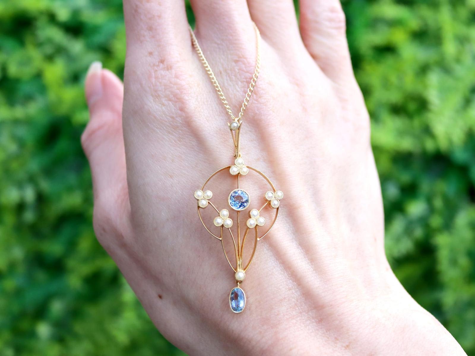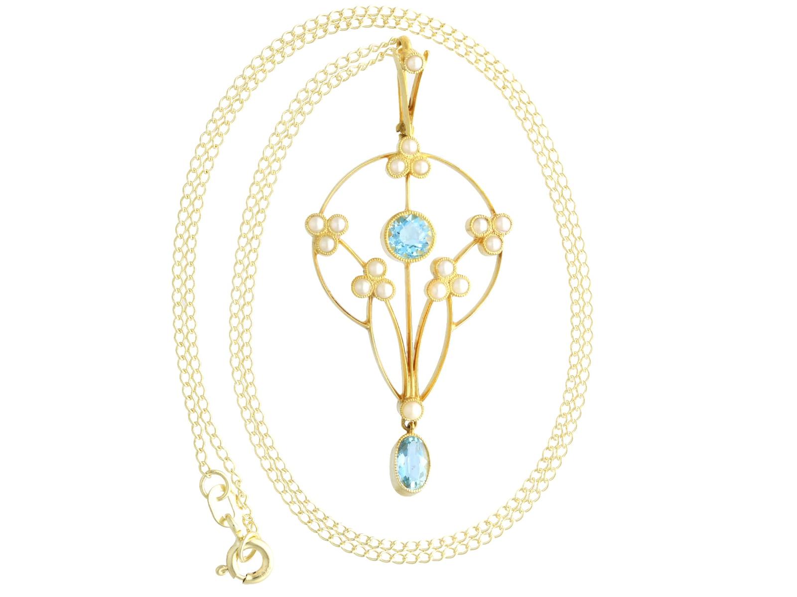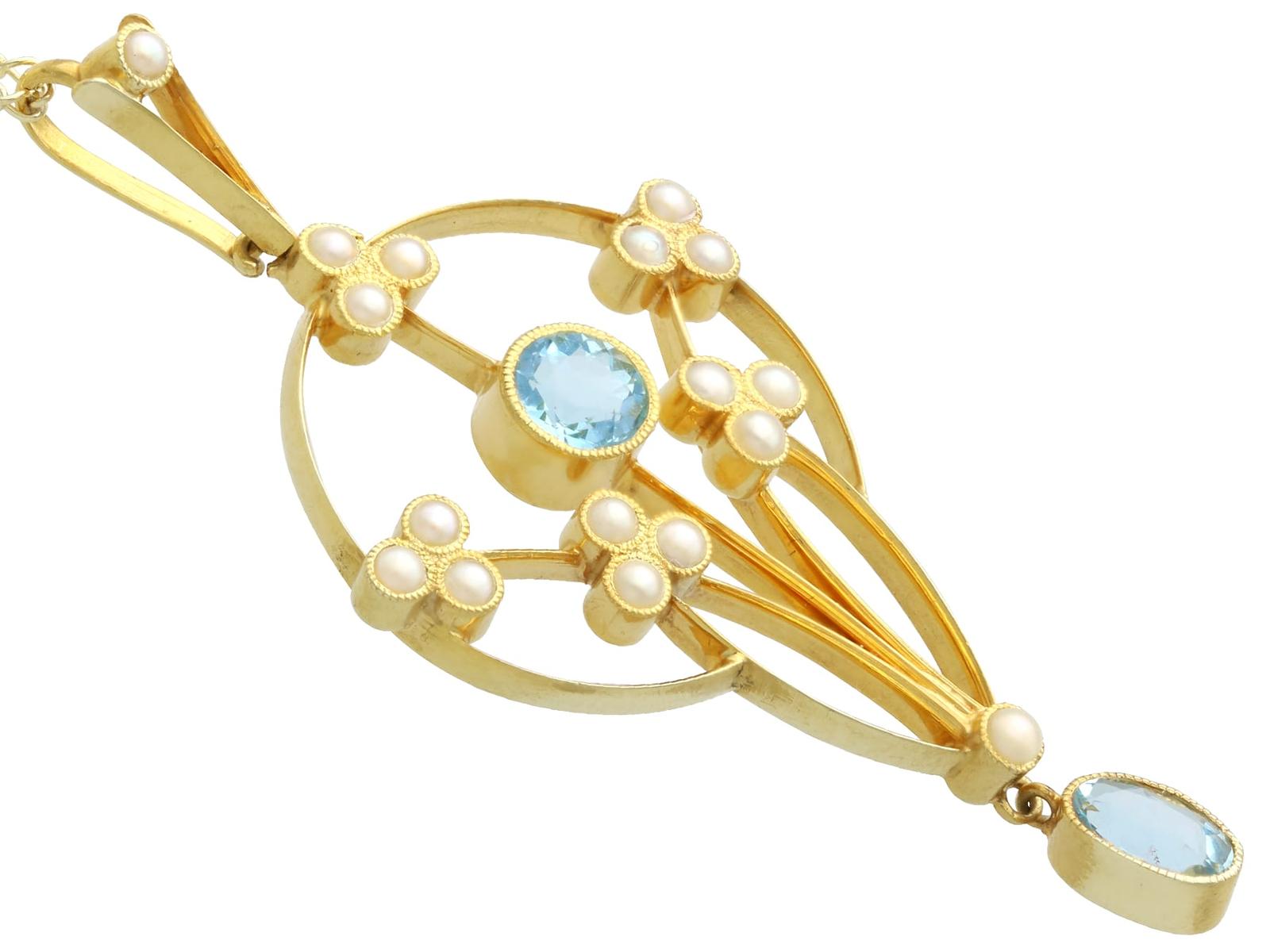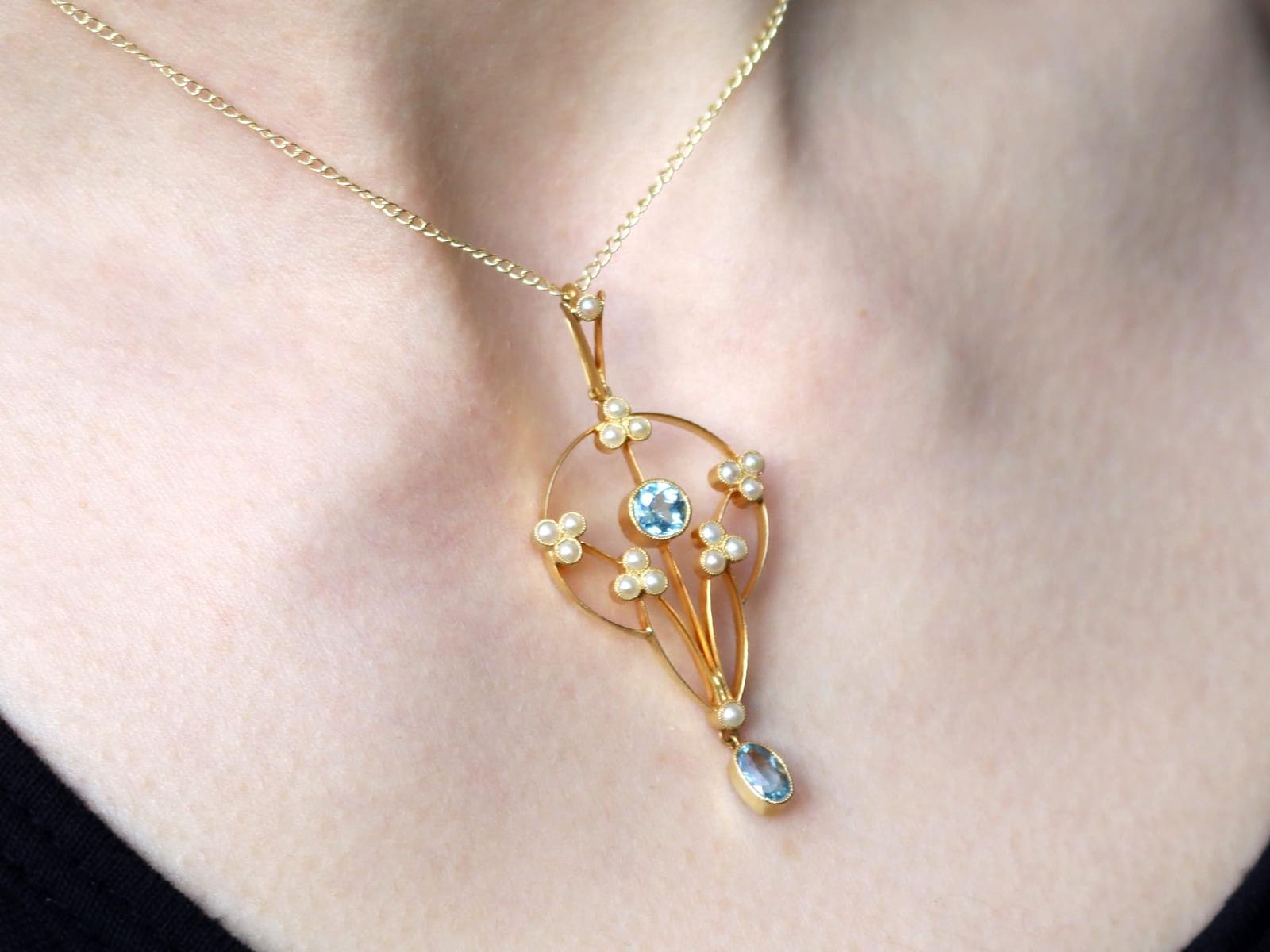 Fine and impressive antique Art Nouveau style 0.96 carat aquamarine and pearl, 15 carat yellow gold pendant; part of our diverse antique aquamarine jewellery collectionsnnThis fine and impressive antique aquamarine pendant has been crafted in 15ct yellow gold.nnThe Art Nouveau pendant displays an impressive central collet set round faceted cut aquamarine.nnThis frame is further ornamented with fifteen impressive seed pearls arranged in five stemmed trefoil designs.nnThe lower portion of the Art Nouveau frame is embellished with a further seed pearl and terminates with an impressive collet set oval faceted cut aquamarine.nnThis impressive antique pendant is suspended from an 18 inch 9ct yellow gold curb chain via a tapering bale, embellished with a single seed pearl.nnThe chain secures to the reverse with a conventional spring-loaded bolt ring fastening.nnThis necklace is hallmarked to the reverse of the setting with the 15ct gold fineness mark (15C) and has been independently tested using state of the art technology (Niton Xl2 Analyzer) and verified as 15 carat gold.nnThis impressive Art Nouveau style aquamarine and pearl pendant is supplied with an Idgl gemstone grading report card.nnImages do not always reflect the true colour and brilliance of gemstones and diamonds. The video however provides a truer representation of the actual colour and showcases each stone.nnReflections in photographs may detract from the true representation of this fine example of antique jewellery.nnAquamarine QualitynCut Round/Oval FacetednContent 0.96 caratnnItem Ref. Sku: C8338nA video is available upon request