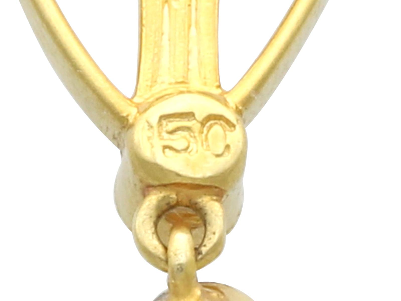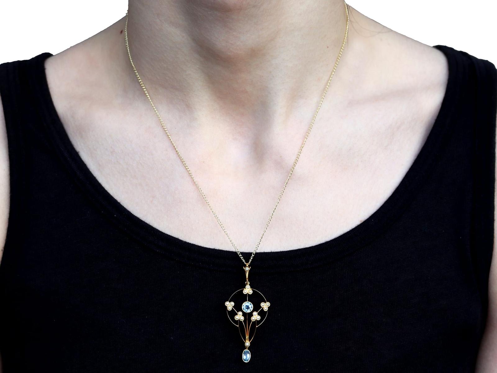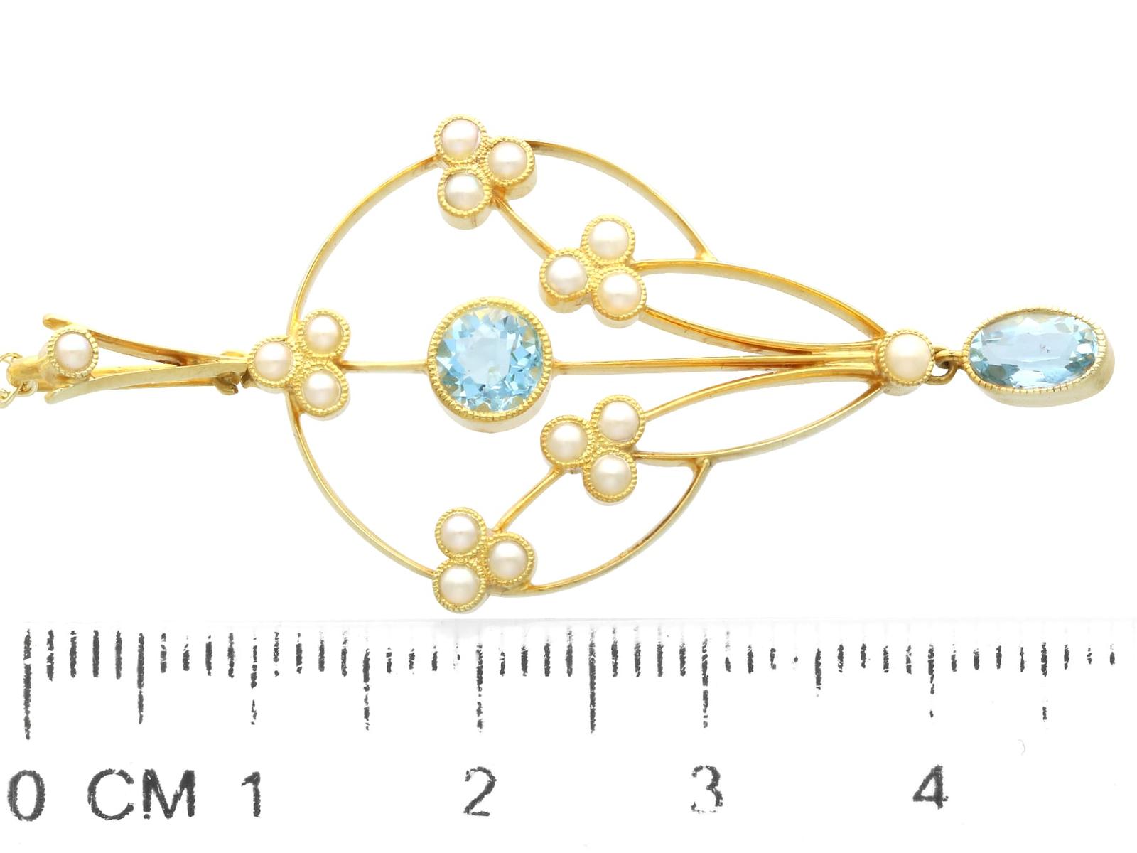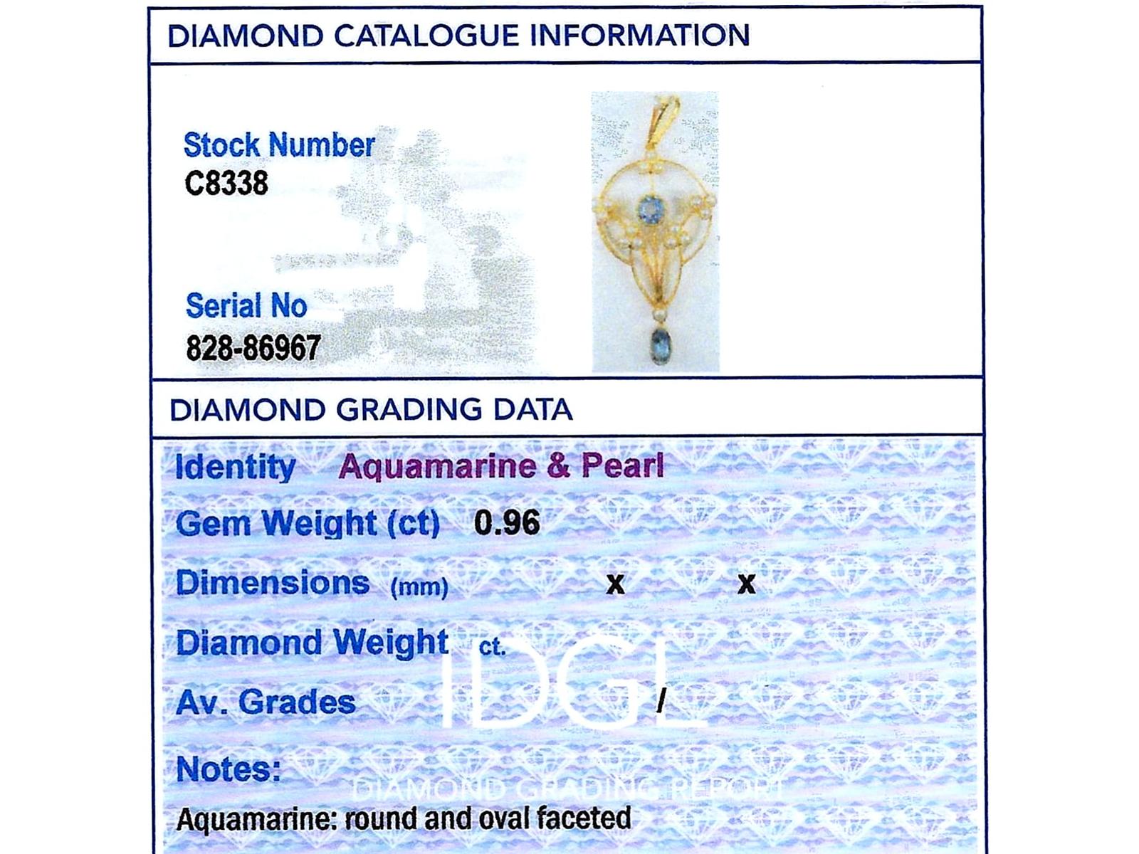 Fine and impressive antique Art Nouveau style 0.96 carat aquamarine and pearl, 15 carat yellow gold pendant; part of our diverse antique aquamarine jewellery collectionsnnThis fine and impressive antique aquamarine pendant has been crafted in 15ct yellow gold.nnThe Art Nouveau pendant displays an impressive central collet set round faceted cut aquamarine.nnThis frame is further ornamented with fifteen impressive seed pearls arranged in five stemmed trefoil designs.nnThe lower portion of the Art Nouveau frame is embellished with a further seed pearl and terminates with an impressive collet set oval faceted cut aquamarine.nnThis impressive antique pendant is suspended from an 18 inch 9ct yellow gold curb chain via a tapering bale, embellished with a single seed pearl.nnThe chain secures to the reverse with a conventional spring-loaded bolt ring fastening.nnThis necklace is hallmarked to the reverse of the setting with the 15ct gold fineness mark (15C) and has been independently tested using state of the art technology (Niton Xl2 Analyzer) and verified as 15 carat gold.nnThis impressive Art Nouveau style aquamarine and pearl pendant is supplied with an Idgl gemstone grading report card.nnImages do not always reflect the true colour and brilliance of gemstones and diamonds. The video however provides a truer representation of the actual colour and showcases each stone.nnReflections in photographs may detract from the true representation of this fine example of antique jewellery.nnAquamarine QualitynCut Round/Oval FacetednContent 0.96 caratnnItem Ref. Sku: C8338nA video is available upon request