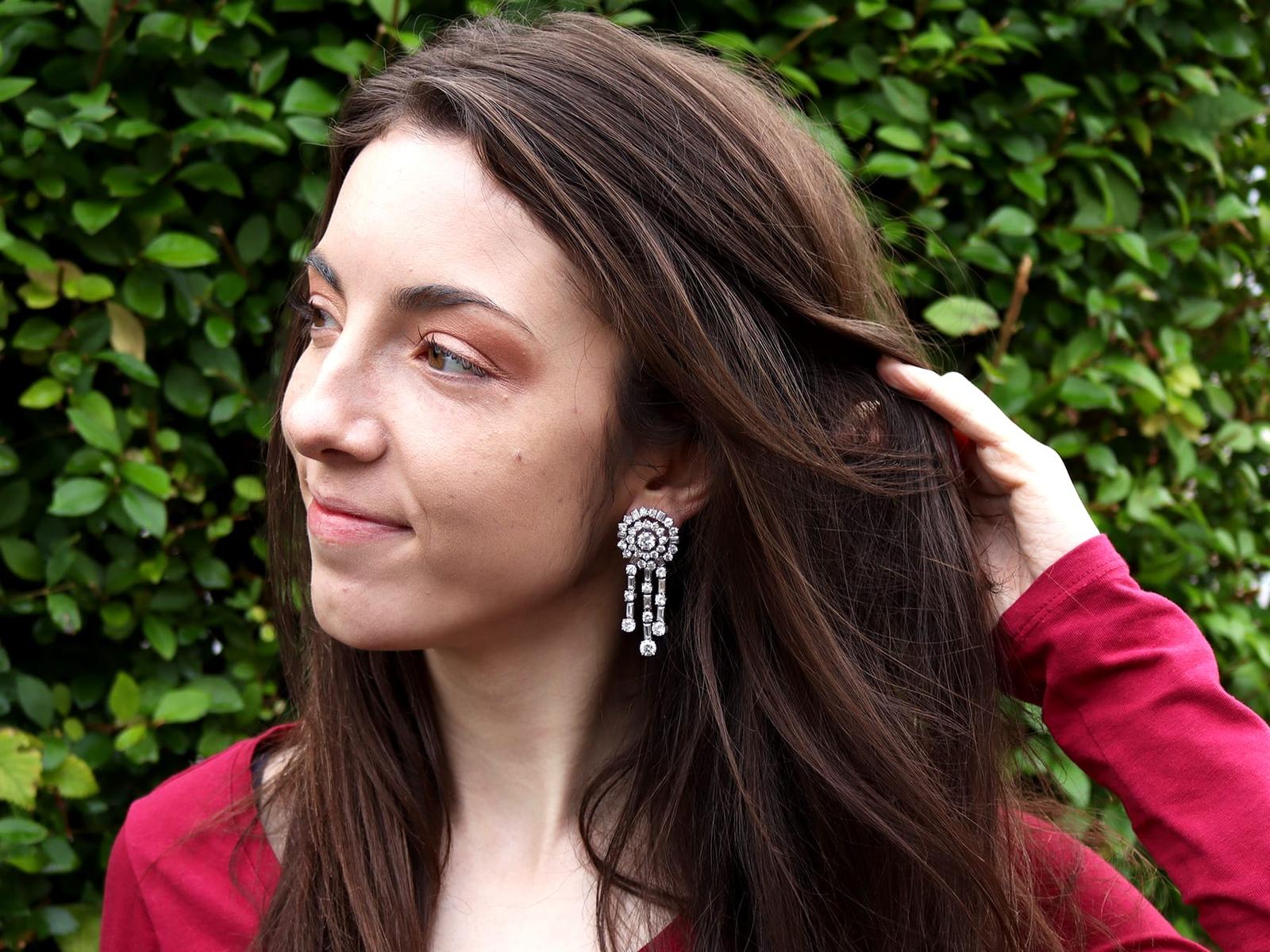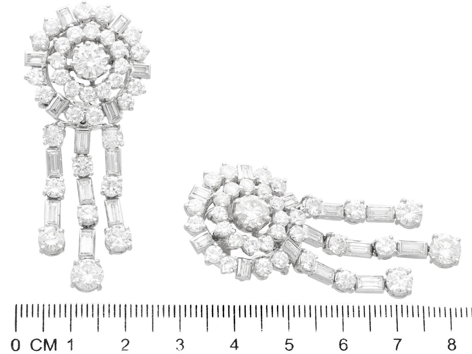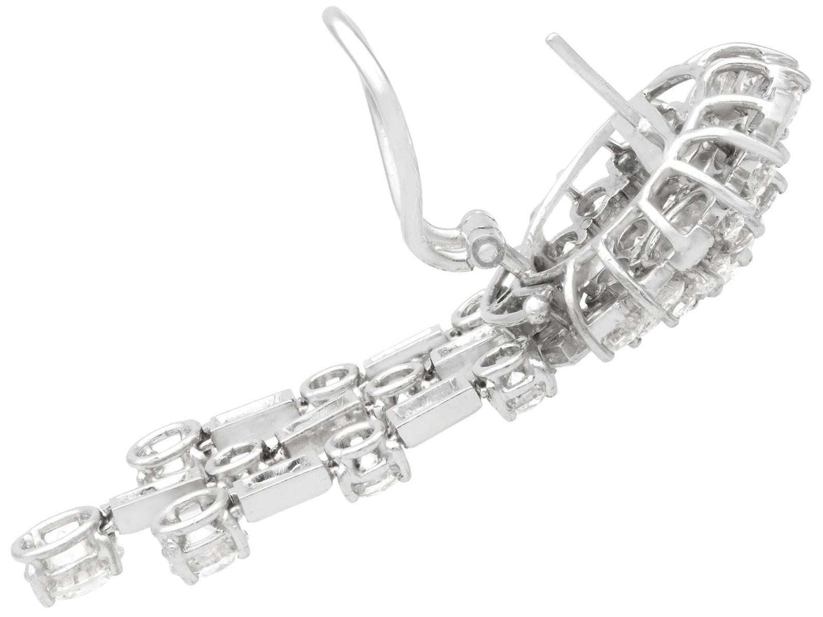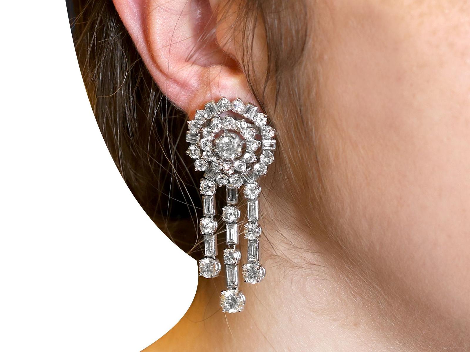 A stunning, fine and impressive pair of vintage 13.96 carat diamond and 18 carat white gold drop earrings; part of our diverse jewellery collections.nnThese stunning, fine and impressive vintage diamond earrings have been crafted in 18ct white gold with 9ct white gold fittings.nnThe circular, halo style settings are ornamented with a stunning eight-claw set feature transitional modern brilliant round cut diamond to the centre.nnEach feature diamond is encompassed with a circular array of twelve individually claw set transitional modern brilliant round cut diamonds.nnThe outer circumference of each halo setting is framed with eighteen further individually set diamonds, in a combination of transitional modern brilliant round and baguette.nnEach earring is further embellished with three stunning articulated strand tassel linear drops, suspended from the lower border of the imposing cluster setting.nnThe tassel design of each earring is embellished with six four-claw transitional modern brilliant round cut diamonds alternating with seven collet set baguette cut diamonds, to the segmented linear arrangements.nnEach of the three articulated strands terminate with a stunning transitional modern brilliant round cut diamond, graduating in size and completing the design.nnThese vintage earrings for pierced ears secure with a 9ct white gold post and hinged latch fastening.nnThese stunning diamond earrings have been independently tested using state of the art technology (Niton Xl2 Analyzer) and verified as 9 and 18 carat gold.nnThese stunning earrings are supplied with eight Idgl diamond grading report certificates for the feature stones, in addition to an Idgl diamond grading report card for the supporting stones.nnSuch vintage drop earrings earrings with this large diamond content are becoming increasingly difficult to locate.nnImages do not always reflect the true colour and brilliance of gemstones and diamonds. The video however provides a truer representation of the actual colour and showcases each stone in these stunning examples of vintage jewellery.nnDiamond QualitynFeature Diamond OnenColour InClarity Vvs1nCut Round BrilliantnContent 0.96 caratnDimensions 6.35mm (average diameter) x 3.81mm (depth)nnFeature Diamond TwonColour JnClarity Si2nCut Round BrilliantnContent 0.94 caratnDimensions 6.30mm (average diameter) x 3.78mm (depth)nnFeature Diamond ThreenColour HnClarity Vs2nCut Round BrilliantnContent 0.76 caratnDimensions 5.77mm (average diameter) x 3.63mm (depth)nnFeature Diamond FournColour GnClarity Vs2nCut Round BrilliantnContent 0.75 caratnDimensions 5.86mm (average diameter) x 3.48mm (depth)nnFeature Diamond FivenColour GnClarity Vvs2nCut Round BrilliantnContent 0.46 caratnDimensions 5.02mm (average diameter) x 2.95mm (depth)nnFeature Diamond SixnColour HnClarity Vvs2nCut Round BrilliantnContent 0.44 caratnDimensions 4.89mm (average diameter) x 2.91mm (depth)nnFeature Diamond SevennColour HnClarity Si1nCut Round BrilliantnContent 0.42 caratnDimensions 4.86mm (average diameter) x 2.80mm (depth)nnFeature Diamond EightnColour FnClarity Si2nCut Round BrilliantnContent 0.40 caratnDimensions 4.84mm (average diameter) x 2.73mm (depth)nnSupporting DiamondsnColour (average grades) G/HnClarity (average grades) Vs2/Si1nCut Transitional Modern Brilliant Round/BaguettenContent 8.83 caratsnnTotal Diamond Contentn13.96 caratsnnNumber of Diamondsn94nnDimensionsnLength of drop 5.6cm/2.2’nWidth of setting 2.35cm/0.93’nHeight of setting 1.01cm/0.4’nnWeightn25.95 gramsnnFastening: Hinged Latch Clasp