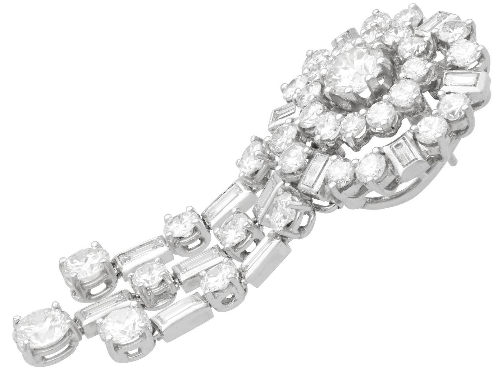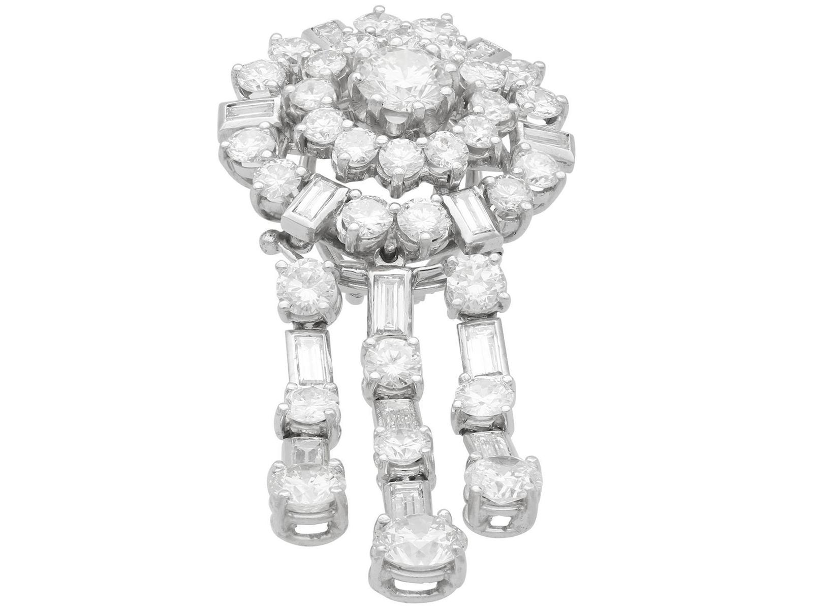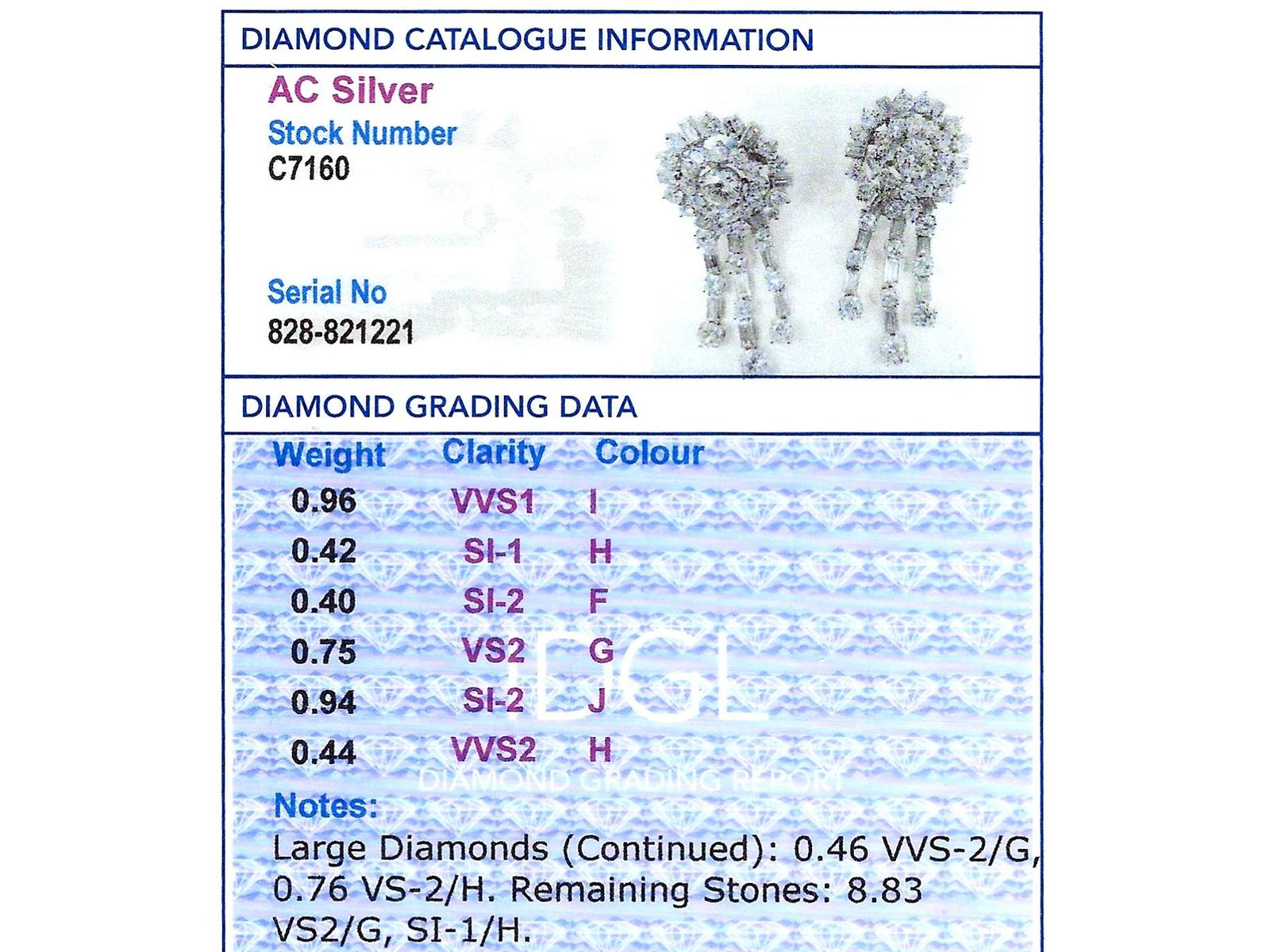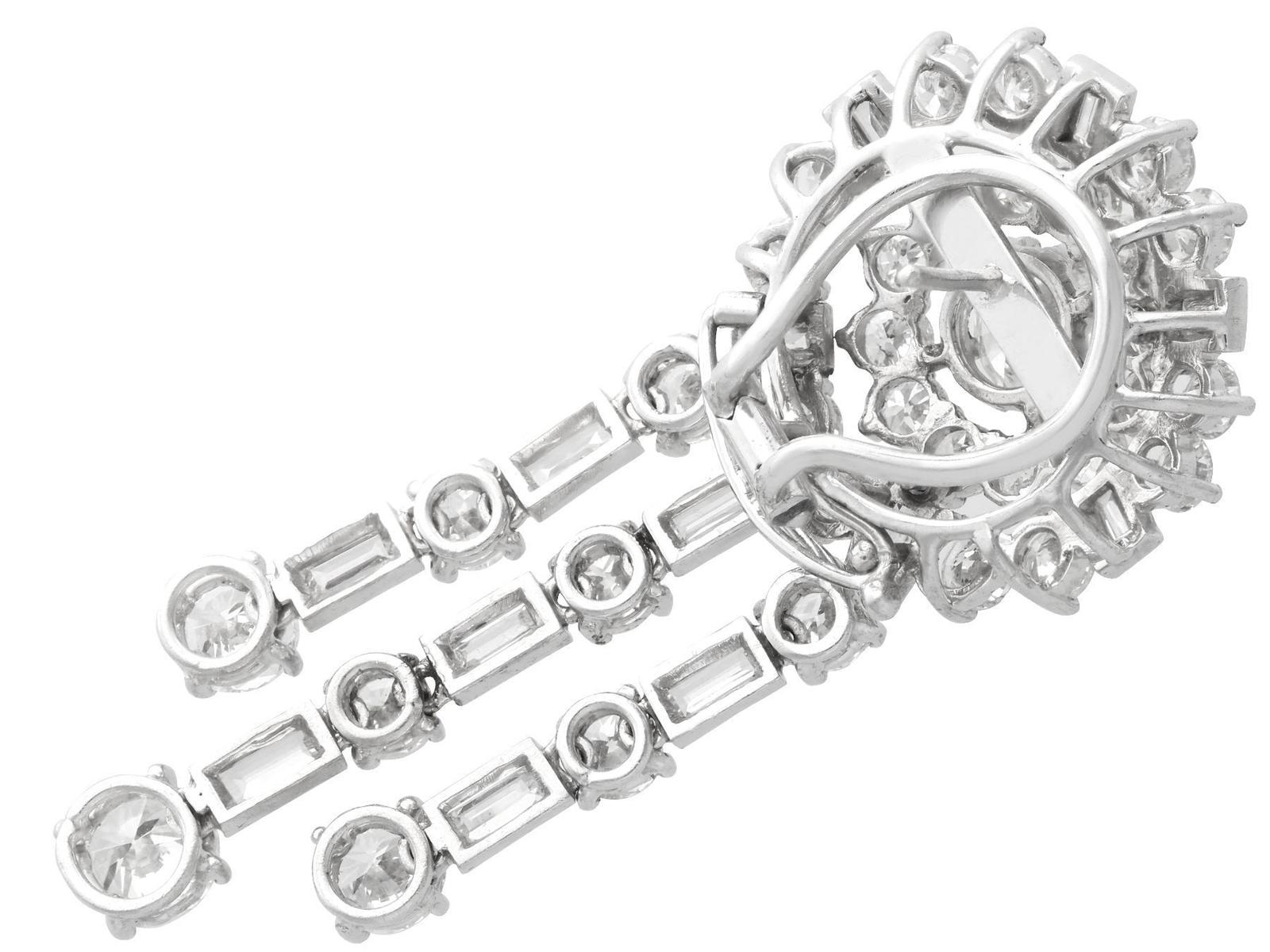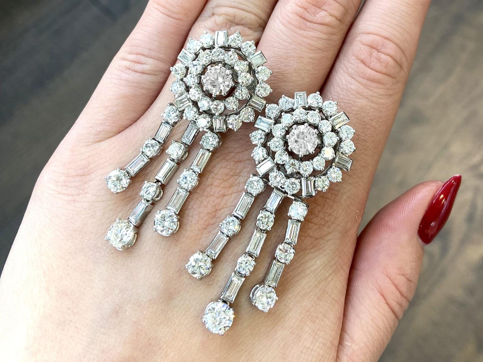 A stunning, fine and impressive pair of vintage 13.96 carat diamond and 18 carat white gold drop earrings; part of our diverse jewellery collections.nnThese stunning, fine and impressive vintage diamond earrings have been crafted in 18ct white gold with 9ct white gold fittings.nnThe circular, halo style settings are ornamented with a stunning eight-claw set feature transitional modern brilliant round cut diamond to the centre.nnEach feature diamond is encompassed with a circular array of twelve individually claw set transitional modern brilliant round cut diamonds.nnThe outer circumference of each halo setting is framed with eighteen further individually set diamonds, in a combination of transitional modern brilliant round and baguette.nnEach earring is further embellished with three stunning articulated strand tassel linear drops, suspended from the lower border of the imposing cluster setting.nnThe tassel design of each earring is embellished with six four-claw transitional modern brilliant round cut diamonds alternating with seven collet set baguette cut diamonds, to the segmented linear arrangements.nnEach of the three articulated strands terminate with a stunning transitional modern brilliant round cut diamond, graduating in size and completing the design.nnThese vintage earrings for pierced ears secure with a 9ct white gold post and hinged latch fastening.nnThese stunning diamond earrings have been independently tested using state of the art technology (Niton Xl2 Analyzer) and verified as 9 and 18 carat gold.nnThese stunning earrings are supplied with eight Idgl diamond grading report certificates for the feature stones, in addition to an Idgl diamond grading report card for the supporting stones.nnSuch vintage drop earrings earrings with this large diamond content are becoming increasingly difficult to locate.nnImages do not always reflect the true colour and brilliance of gemstones and diamonds. The video however provides a truer representation of the actual colour and showcases each stone in these stunning examples of vintage jewellery.nnDiamond QualitynFeature Diamond OnenColour InClarity Vvs1nCut Round BrilliantnContent 0.96 caratnDimensions 6.35mm (average diameter) x 3.81mm (depth)nnFeature Diamond TwonColour JnClarity Si2nCut Round BrilliantnContent 0.94 caratnDimensions 6.30mm (average diameter) x 3.78mm (depth)nnFeature Diamond ThreenColour HnClarity Vs2nCut Round BrilliantnContent 0.76 caratnDimensions 5.77mm (average diameter) x 3.63mm (depth)nnFeature Diamond FournColour GnClarity Vs2nCut Round BrilliantnContent 0.75 caratnDimensions 5.86mm (average diameter) x 3.48mm (depth)nnFeature Diamond FivenColour GnClarity Vvs2nCut Round BrilliantnContent 0.46 caratnDimensions 5.02mm (average diameter) x 2.95mm (depth)nnFeature Diamond SixnColour HnClarity Vvs2nCut Round BrilliantnContent 0.44 caratnDimensions 4.89mm (average diameter) x 2.91mm (depth)nnFeature Diamond SevennColour HnClarity Si1nCut Round BrilliantnContent 0.42 caratnDimensions 4.86mm (average diameter) x 2.80mm (depth)nnFeature Diamond EightnColour FnClarity Si2nCut Round BrilliantnContent 0.40 caratnDimensions 4.84mm (average diameter) x 2.73mm (depth)nnSupporting DiamondsnColour (average grades) G/HnClarity (average grades) Vs2/Si1nCut Transitional Modern Brilliant Round/BaguettenContent 8.83 caratsnnTotal Diamond Contentn13.96 caratsnnNumber of Diamondsn94nnDimensionsnLength of drop 5.6cm/2.2’nWidth of setting 2.35cm/0.93’nHeight of setting 1.01cm/0.4’nnWeightn25.95 gramsnnFastening: Hinged Latch Clasp