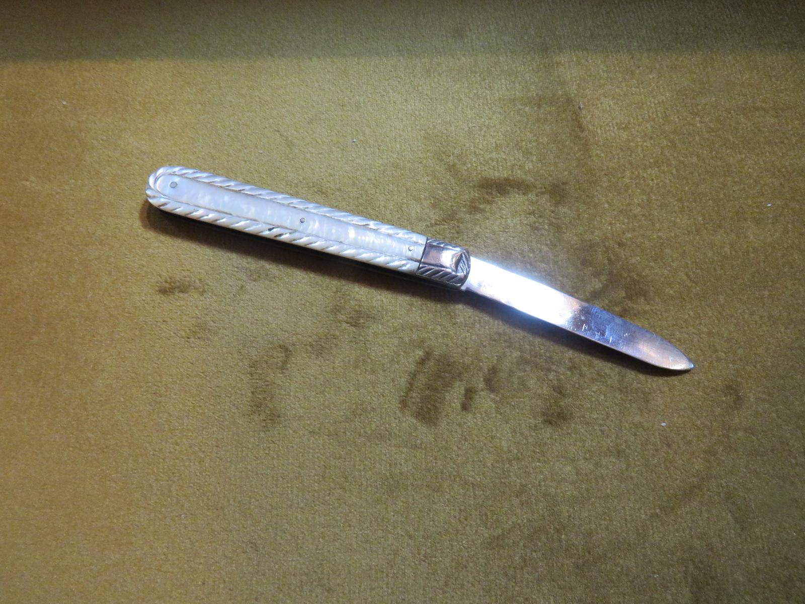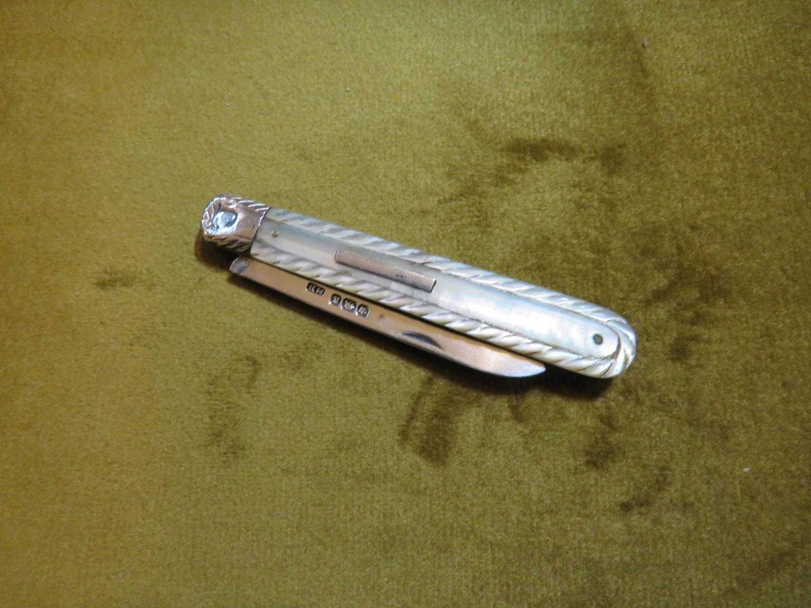 * An impressive and desirable Gentlemans accessoryn* Silver hallmarked penknife with mother of pearl handlen* Inset into one side of mother of pearl handle The handle a narrow silver barn* Manufactured by well known Artisan Mathew Boltonn* Hallmarked for Sheffield 1893