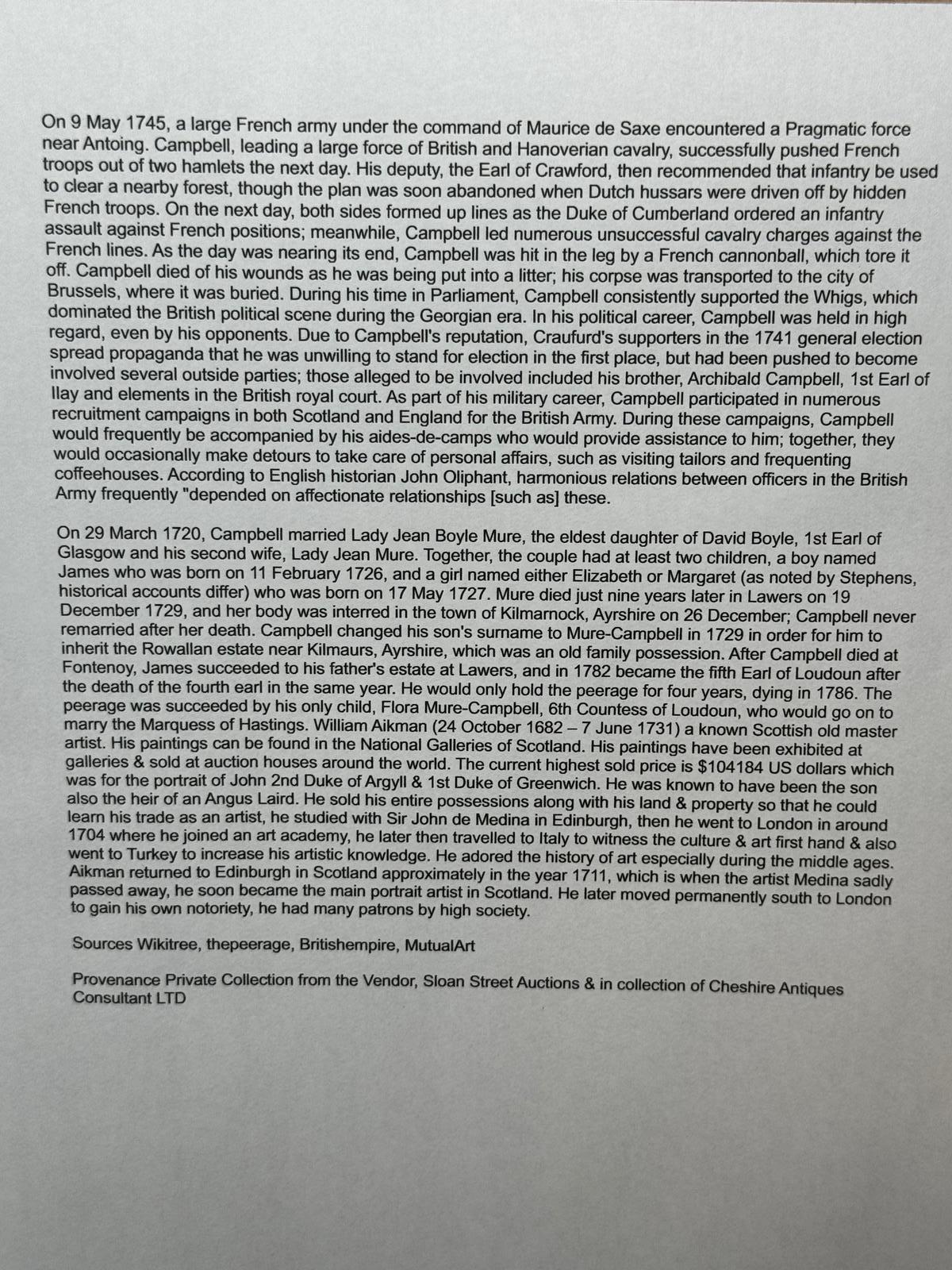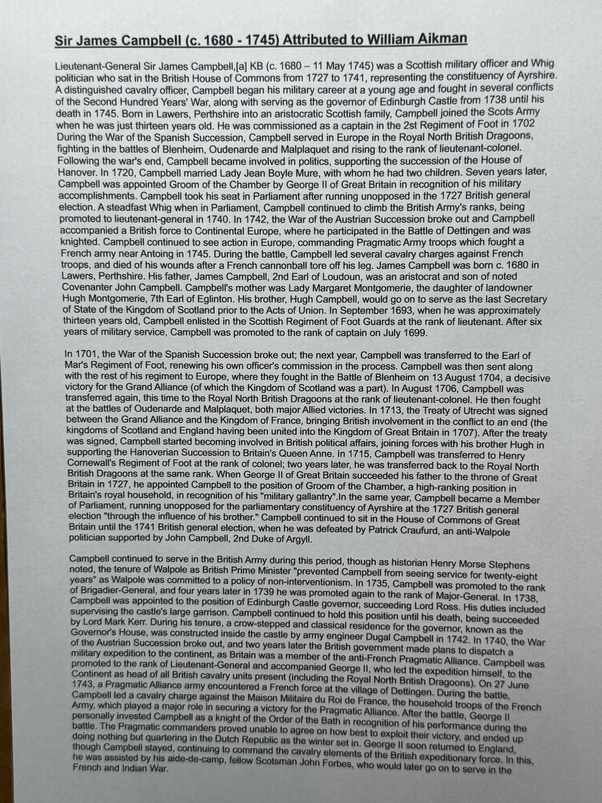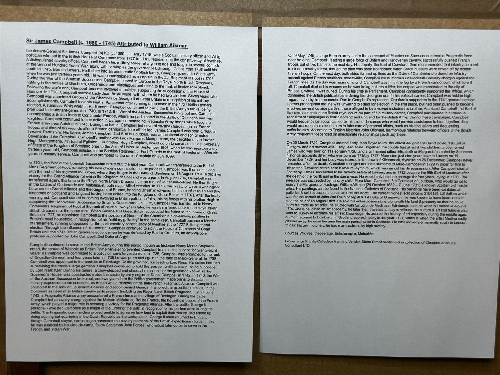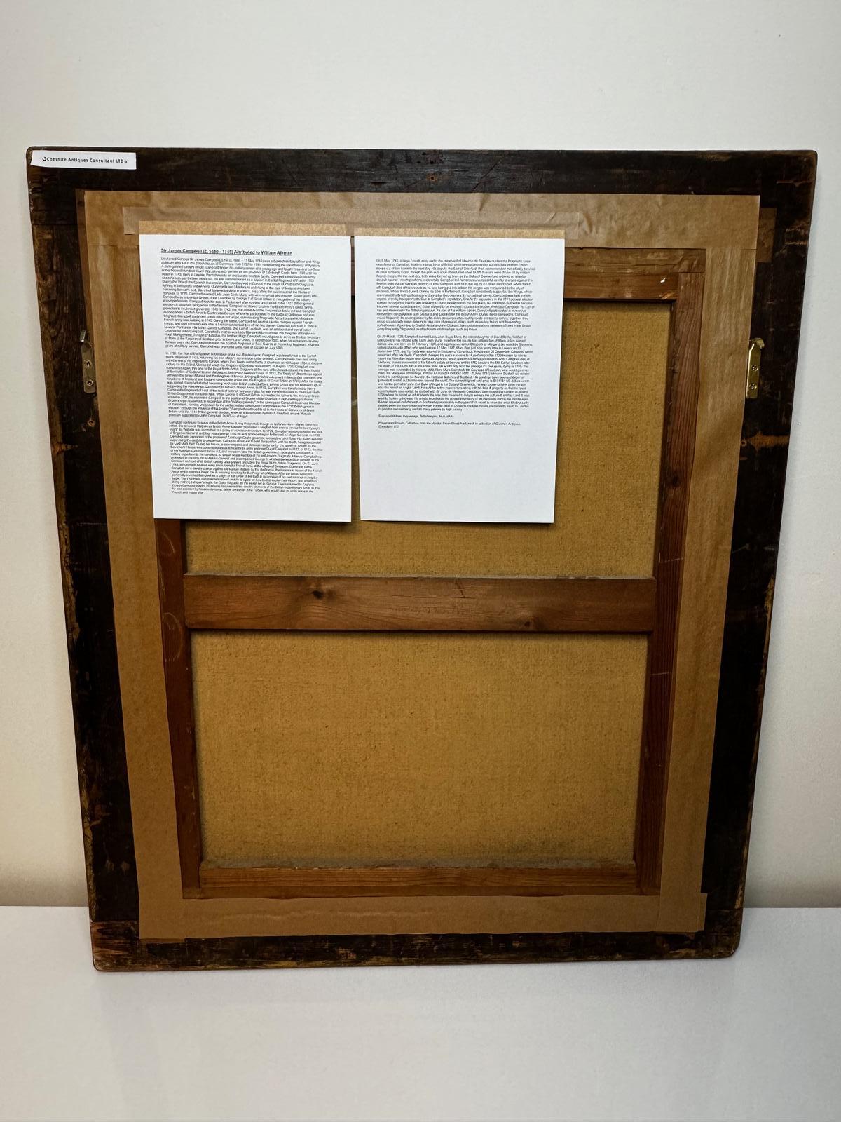 Large important historic Scottish fine art 18th Century oil painting on canvas Military portrait of Lieutenant General Sir James Campbell (c.1680-1745) attributed William Aikman.nnTitle “Portrait of Sir James Campbell