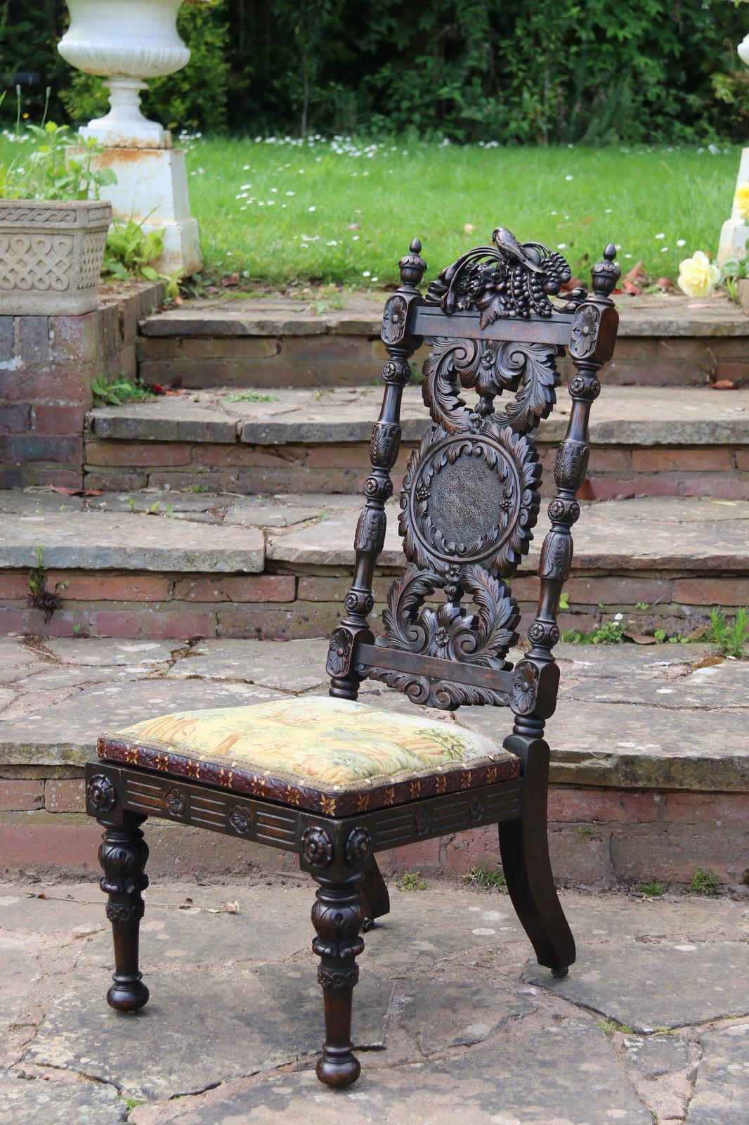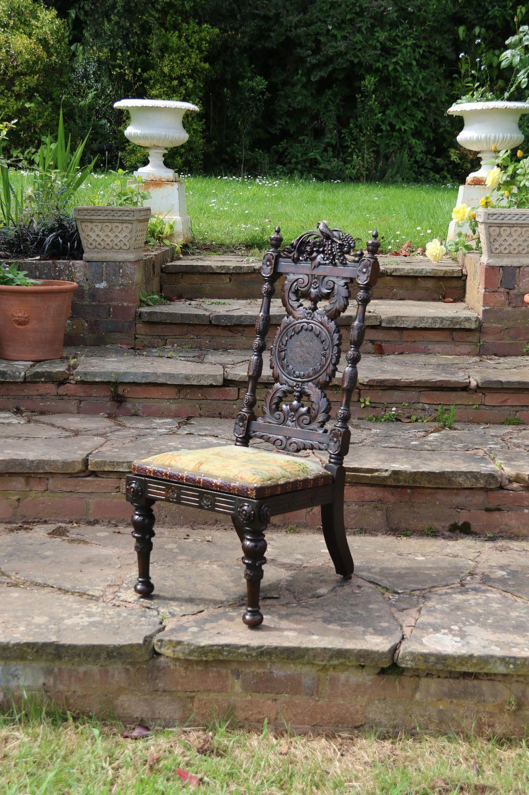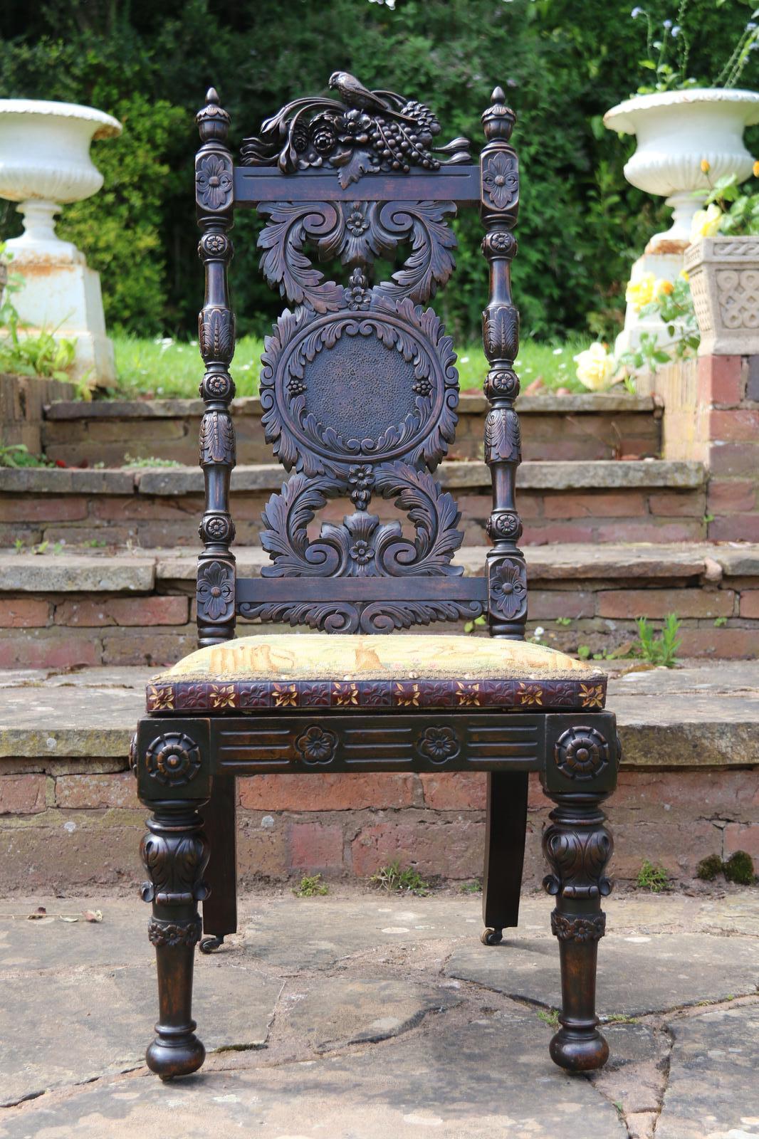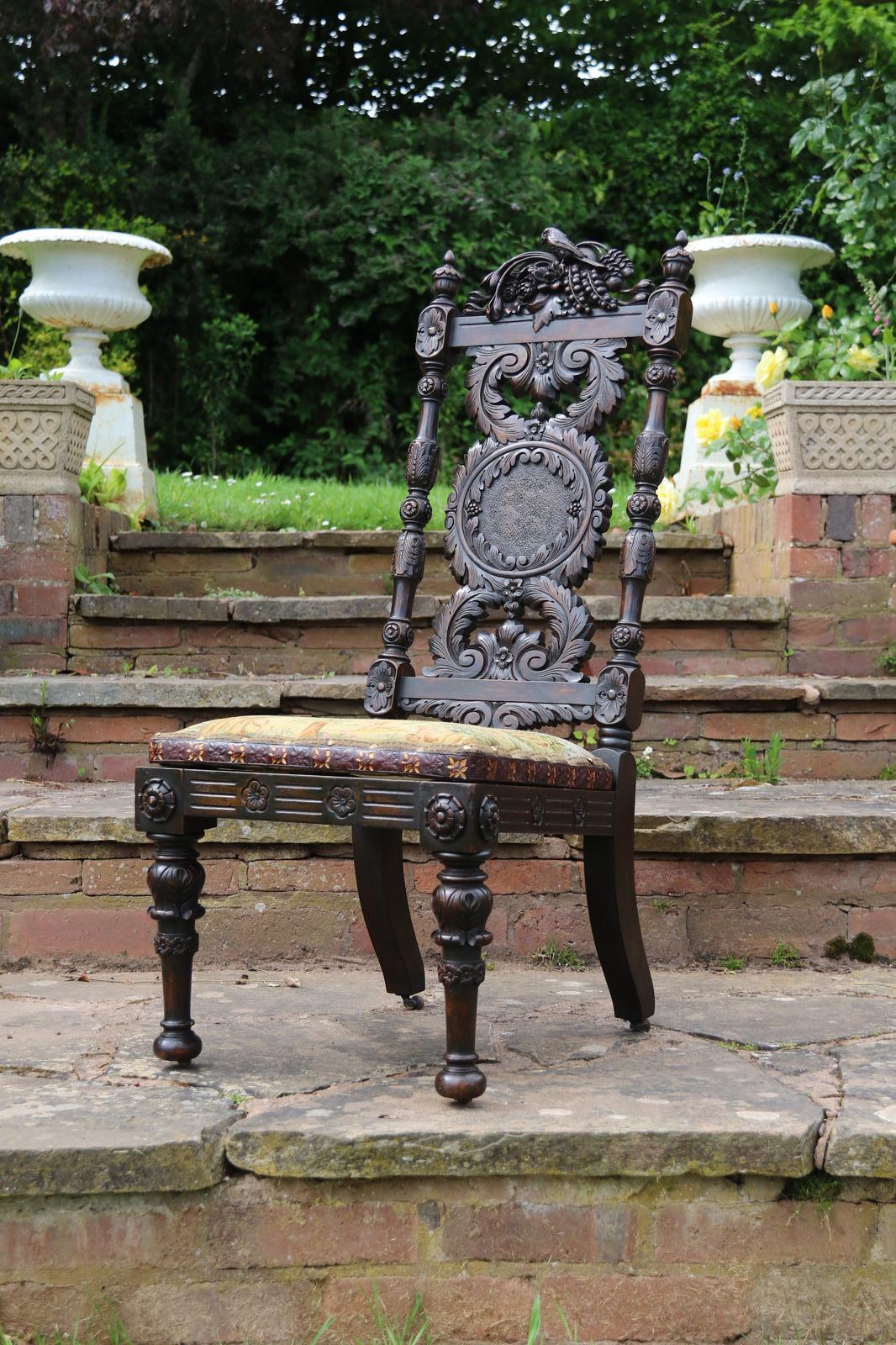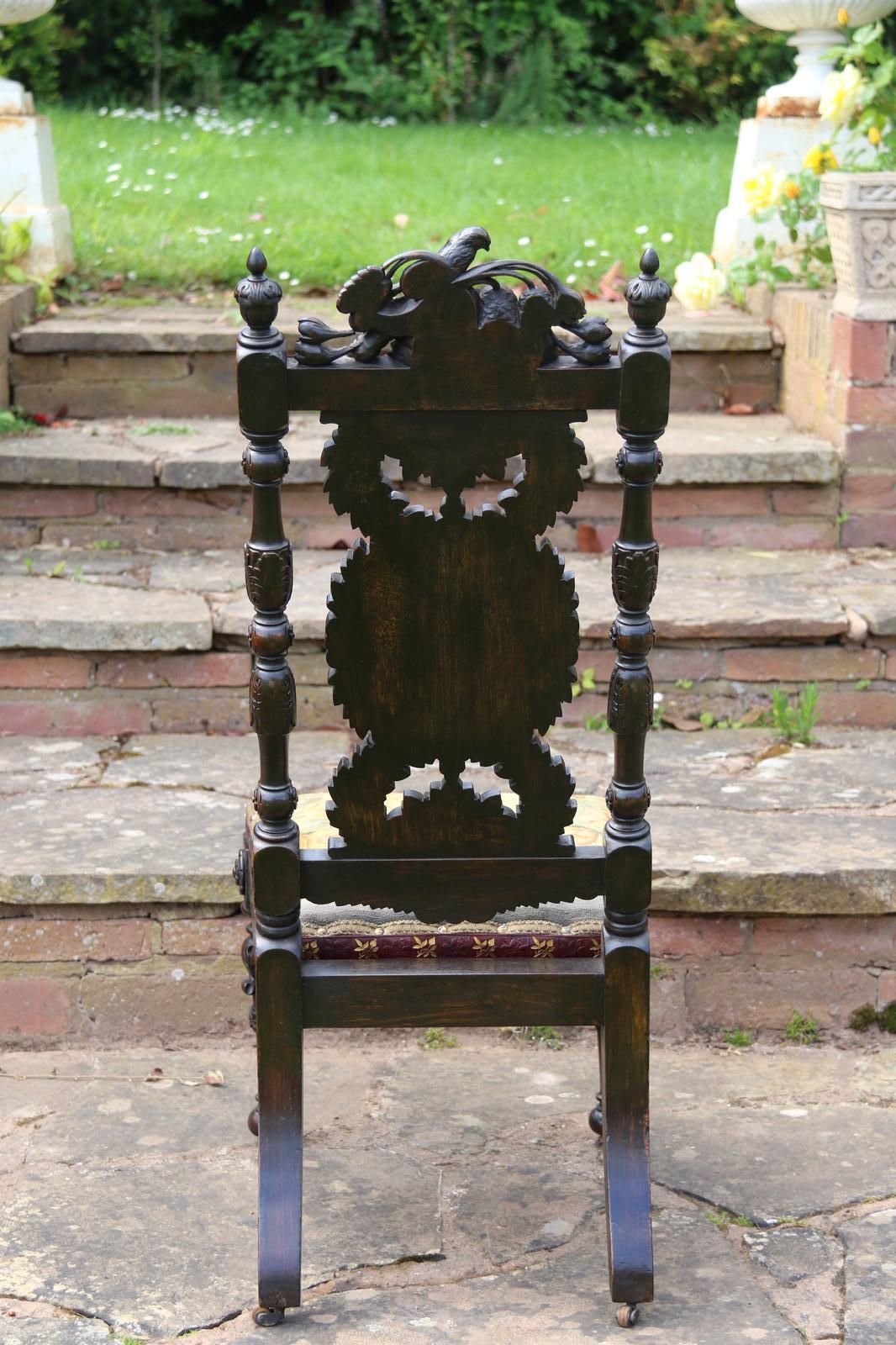 This fine country house chair is highly decorative and would suit many positions. It is made from walnut and has an ornate high back with an elaborate central panel with a superb carved naturalistic crest rail which has a very detailed bird amongst flowers, berries and fir cones. nnBelow, there are continuous entwined foliate wreaths which are flanked with ornately turned and carved columns with finial tops.nnThe chair stands on turned and carved front legs which are fitted with sunken brass and leather castors.nnThe seat is supported with substantial carved rails with flower head rosettes on the front corners.nnThis beautiful country house chair has an ornately upholstered seat edged with a tooled leather boarder and a central panel of hand worked tapestry decorated with an amusing assortment of rabbits in different positions in a wooded landscape. The tapestry is edged with a braided boarder with brass studs.nnThis most eye catching chair is in very good original condition with a dark wax polished finish.