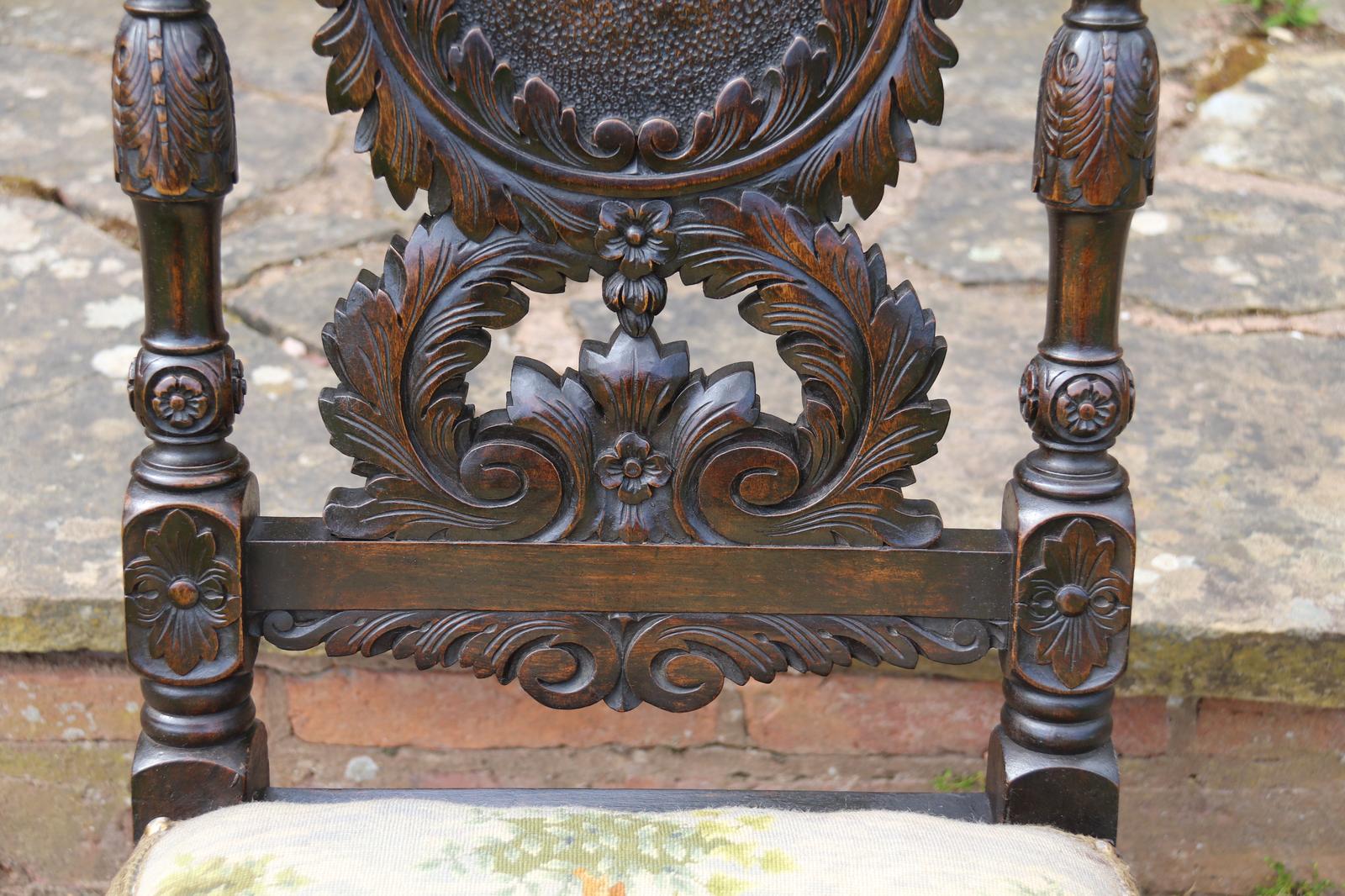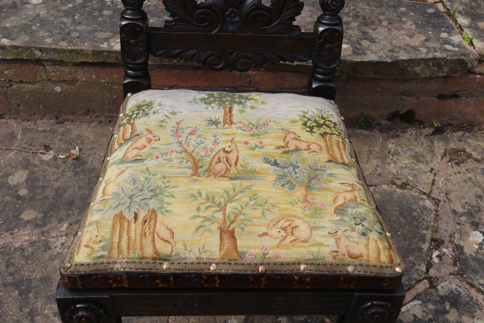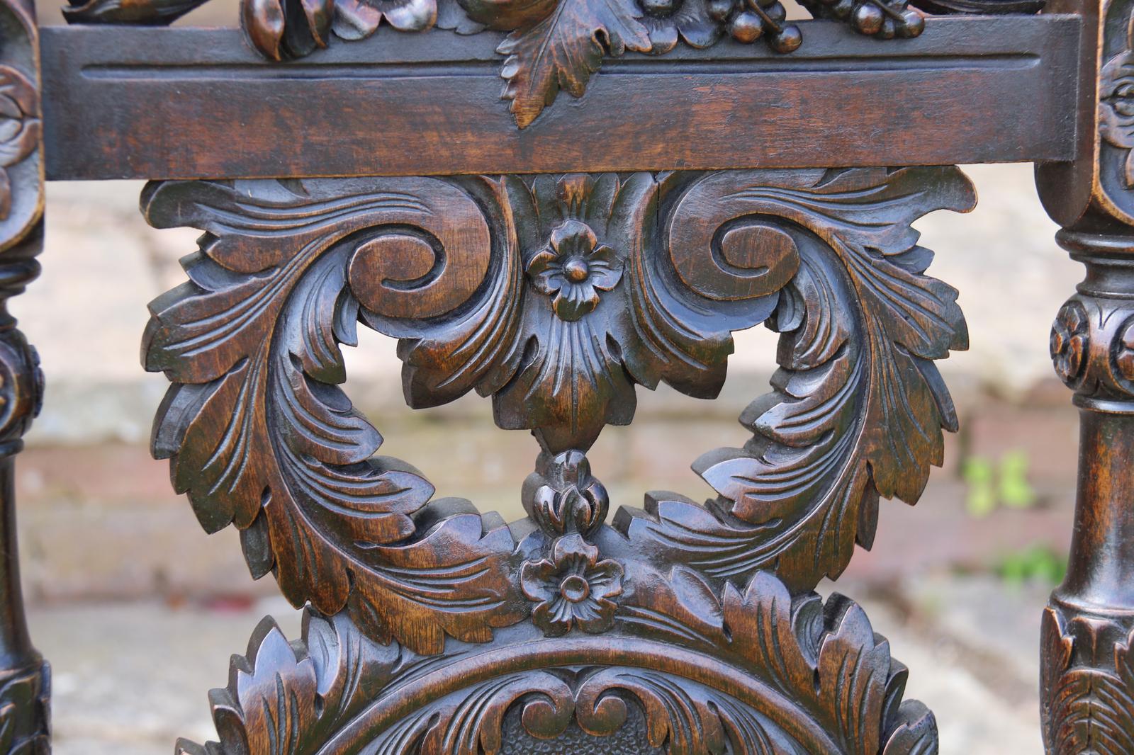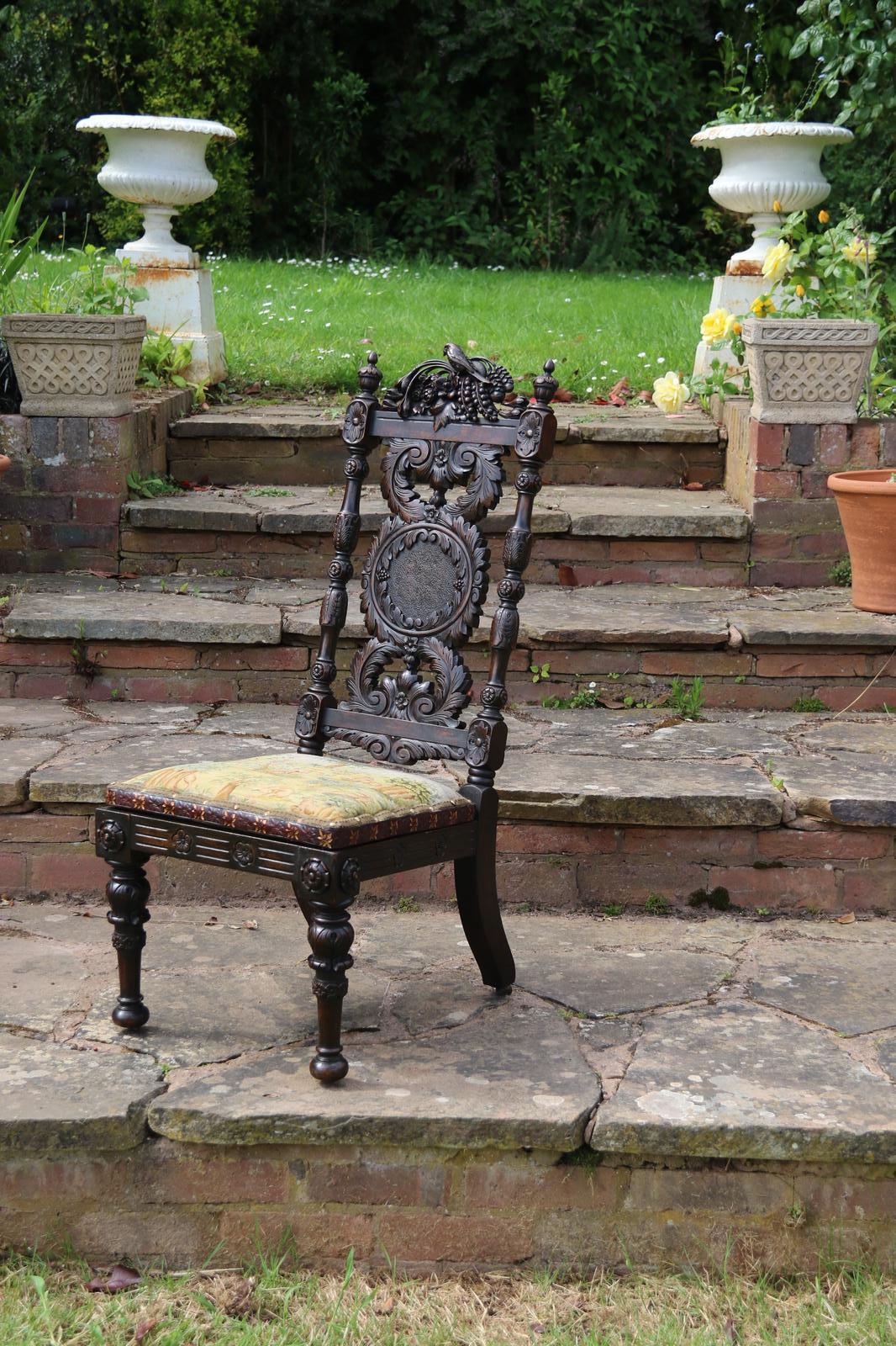 This fine country house chair is highly decorative and would suit many positions. It is made from walnut and has an ornate high back with an elaborate central panel with a superb carved naturalistic crest rail which has a very detailed bird amongst flowers, berries and fir cones. nnBelow, there are continuous entwined foliate wreaths which are flanked with ornately turned and carved columns with finial tops.nnThe chair stands on turned and carved front legs which are fitted with sunken brass and leather castors.nnThe seat is supported with substantial carved rails with flower head rosettes on the front corners.nnThis beautiful country house chair has an ornately upholstered seat edged with a tooled leather boarder and a central panel of hand worked tapestry decorated with an amusing assortment of rabbits in different positions in a wooded landscape. The tapestry is edged with a braided boarder with brass studs.nnThis most eye catching chair is in very good original condition with a dark wax polished finish.
