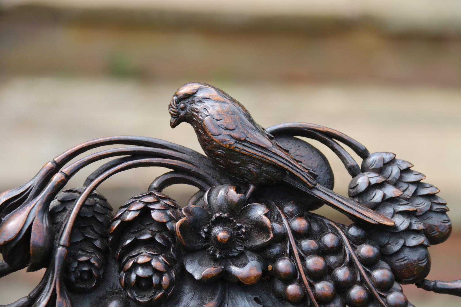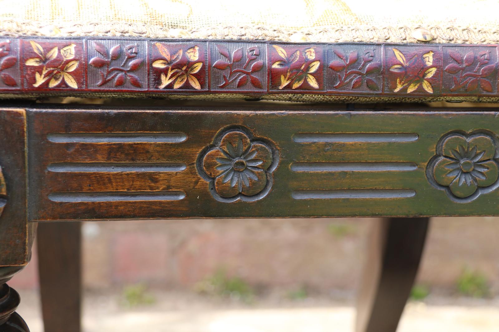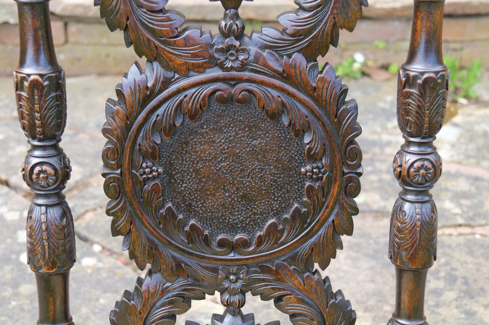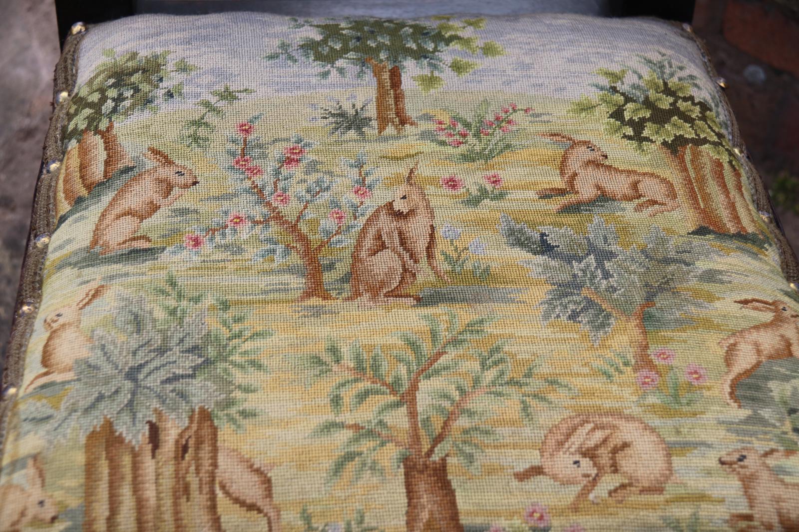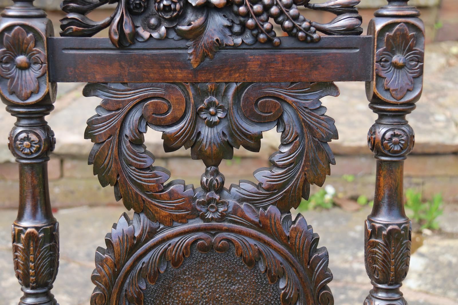 This fine country house chair is highly decorative and would suit many positions. It is made from walnut and has an ornate high back with an elaborate central panel with a superb carved naturalistic crest rail which has a very detailed bird amongst flowers, berries and fir cones. nnBelow, there are continuous entwined foliate wreaths which are flanked with ornately turned and carved columns with finial tops.nnThe chair stands on turned and carved front legs which are fitted with sunken brass and leather castors.nnThe seat is supported with substantial carved rails with flower head rosettes on the front corners.nnThis beautiful country house chair has an ornately upholstered seat edged with a tooled leather boarder and a central panel of hand worked tapestry decorated with an amusing assortment of rabbits in different positions in a wooded landscape. The tapestry is edged with a braided boarder with brass studs.nnThis most eye catching chair is in very good original condition with a dark wax polished finish.