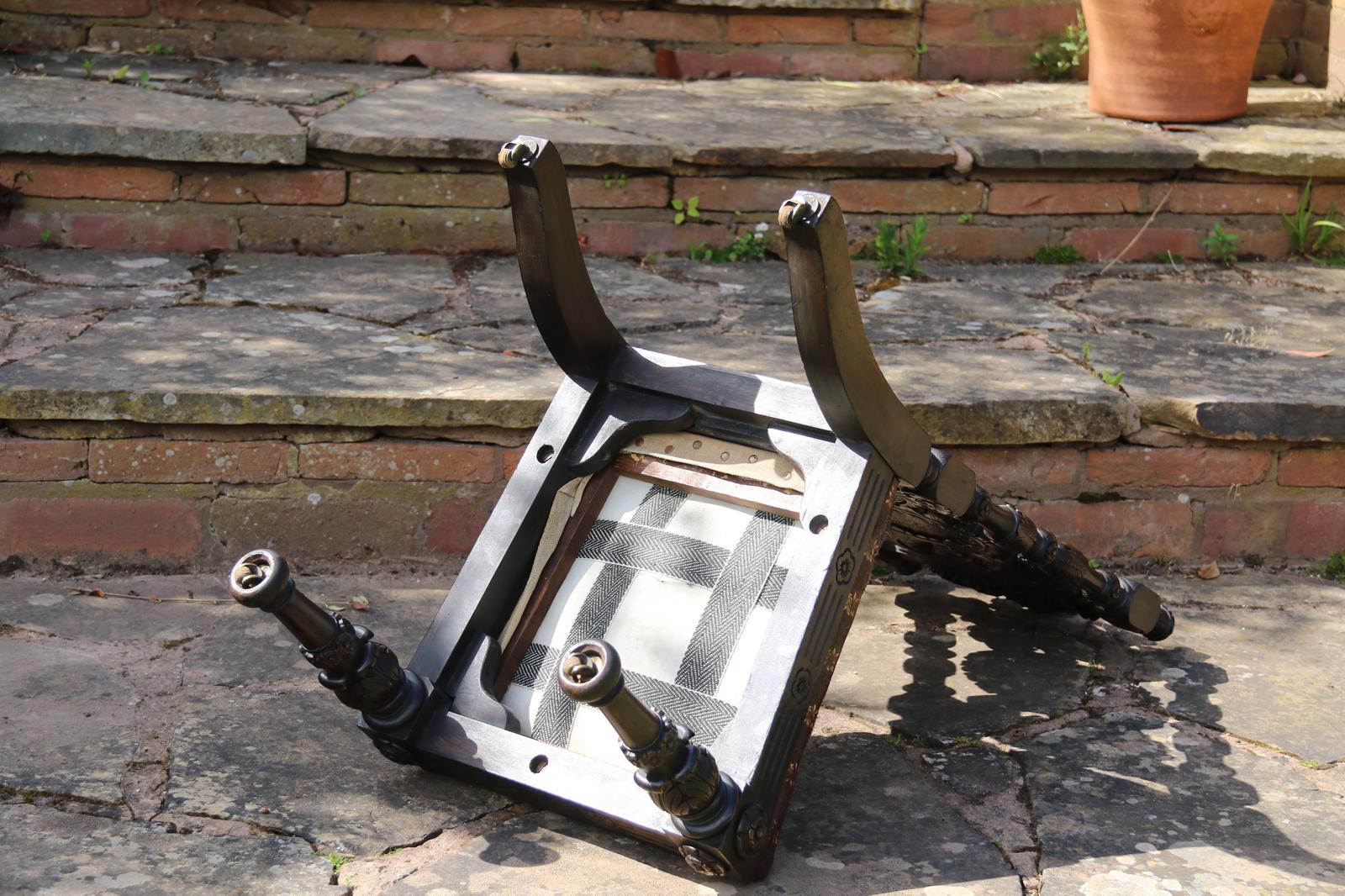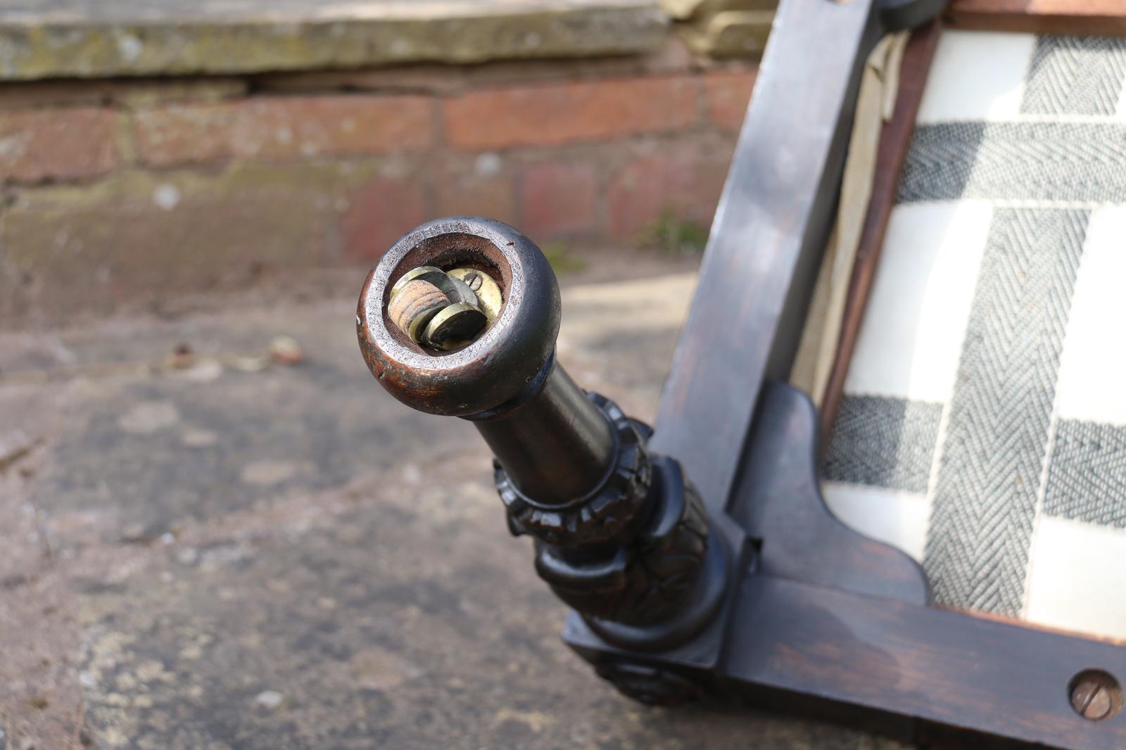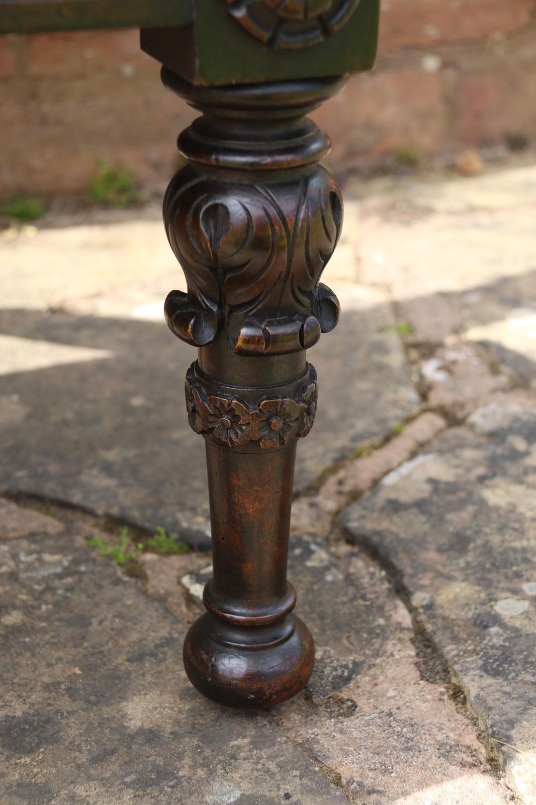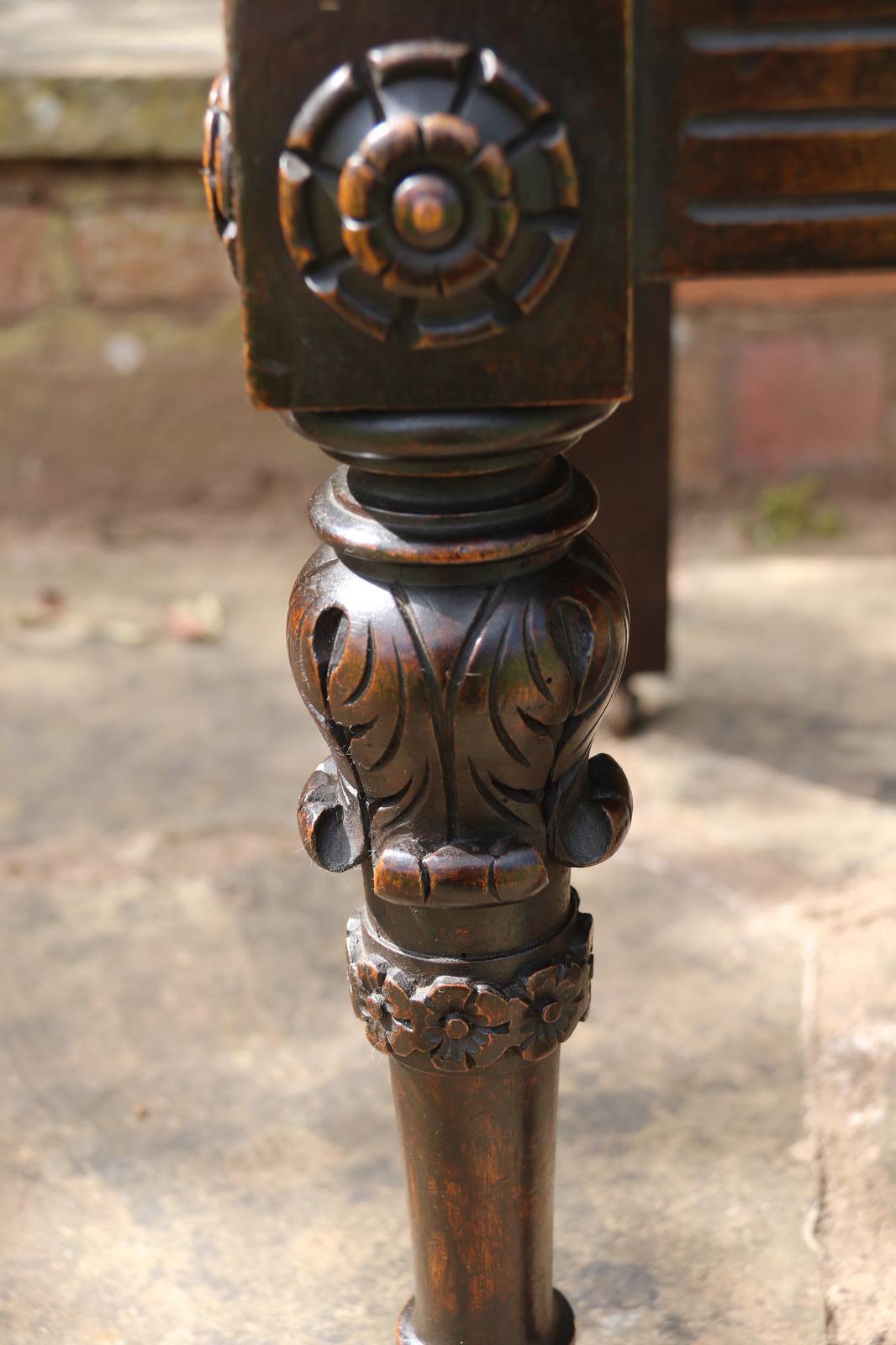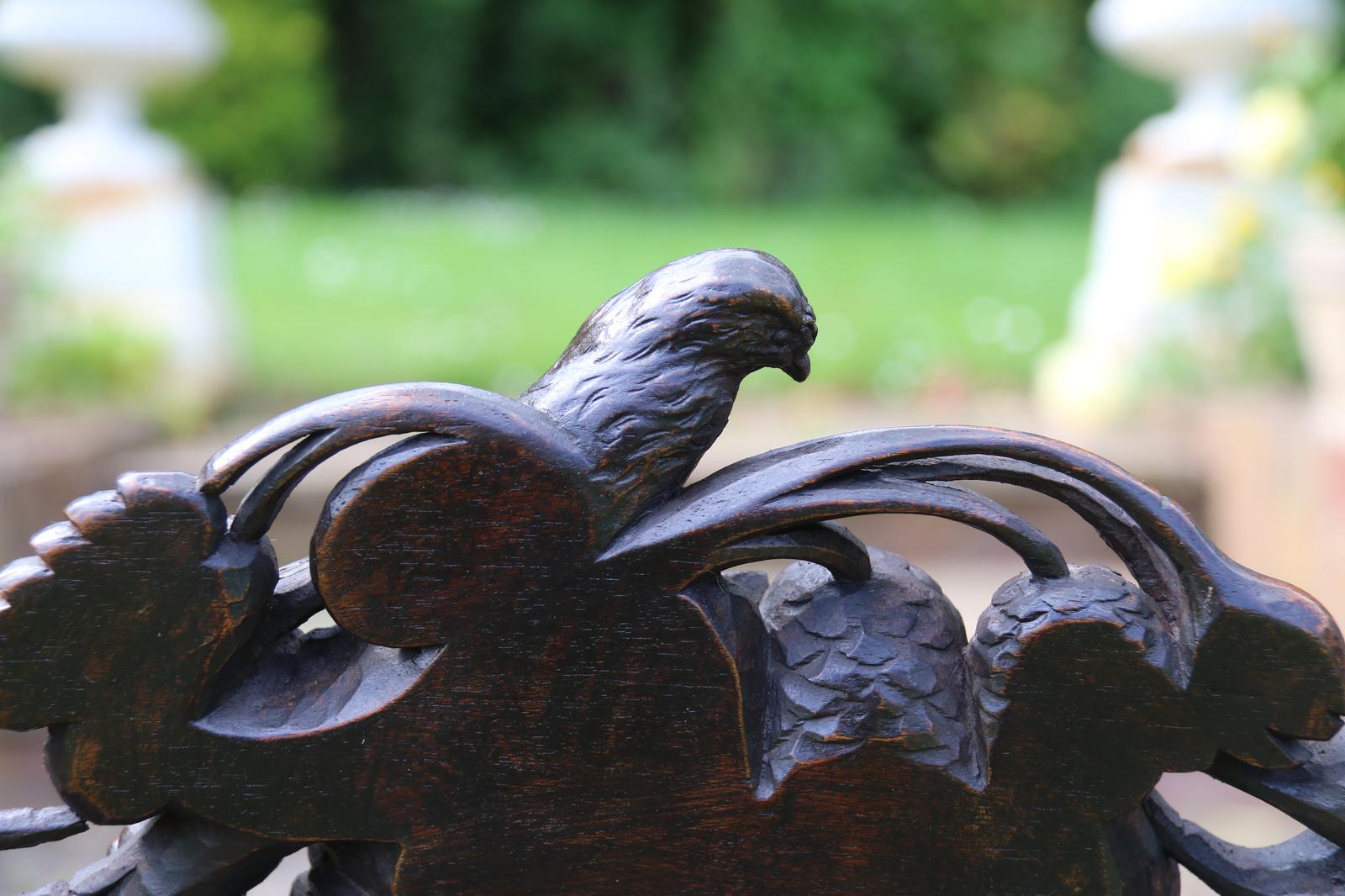 This fine country house chair is highly decorative and would suit many positions. It is made from walnut and has an ornate high back with an elaborate central panel with a superb carved naturalistic crest rail which has a very detailed bird amongst flowers, berries and fir cones. nnBelow, there are continuous entwined foliate wreaths which are flanked with ornately turned and carved columns with finial tops.nnThe chair stands on turned and carved front legs which are fitted with sunken brass and leather castors.nnThe seat is supported with substantial carved rails with flower head rosettes on the front corners.nnThis beautiful country house chair has an ornately upholstered seat edged with a tooled leather boarder and a central panel of hand worked tapestry decorated with an amusing assortment of rabbits in different positions in a wooded landscape. The tapestry is edged with a braided boarder with brass studs.nnThis most eye catching chair is in very good original condition with a dark wax polished finish.