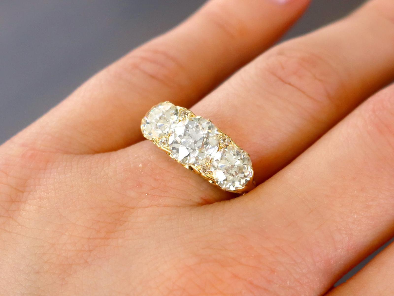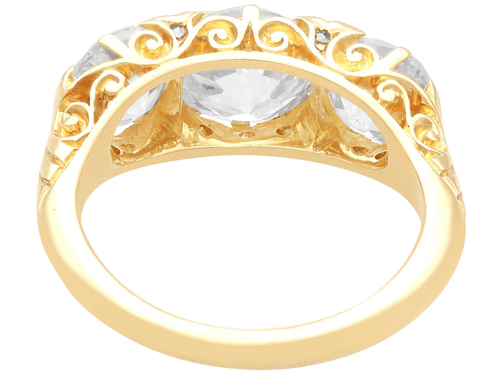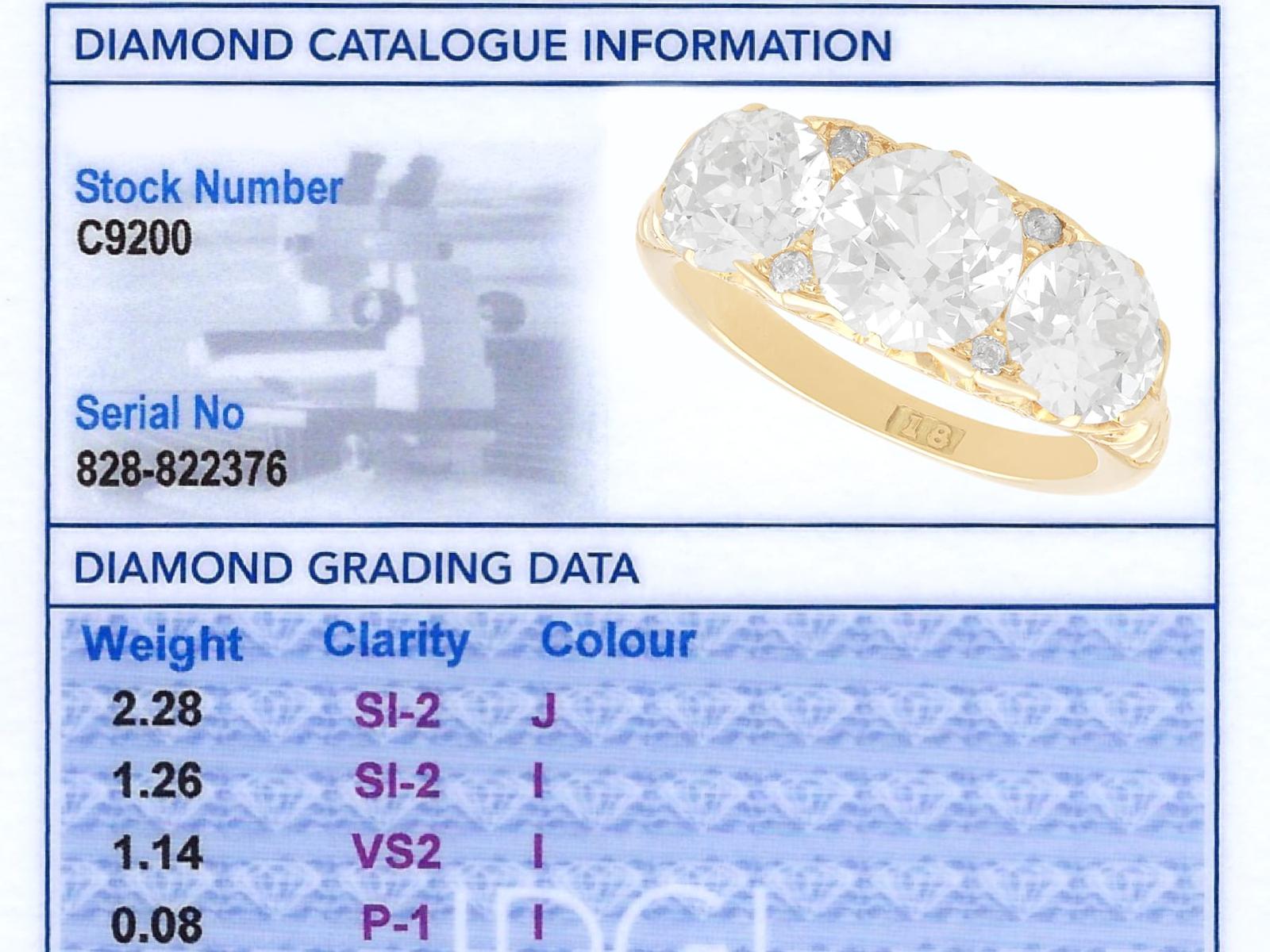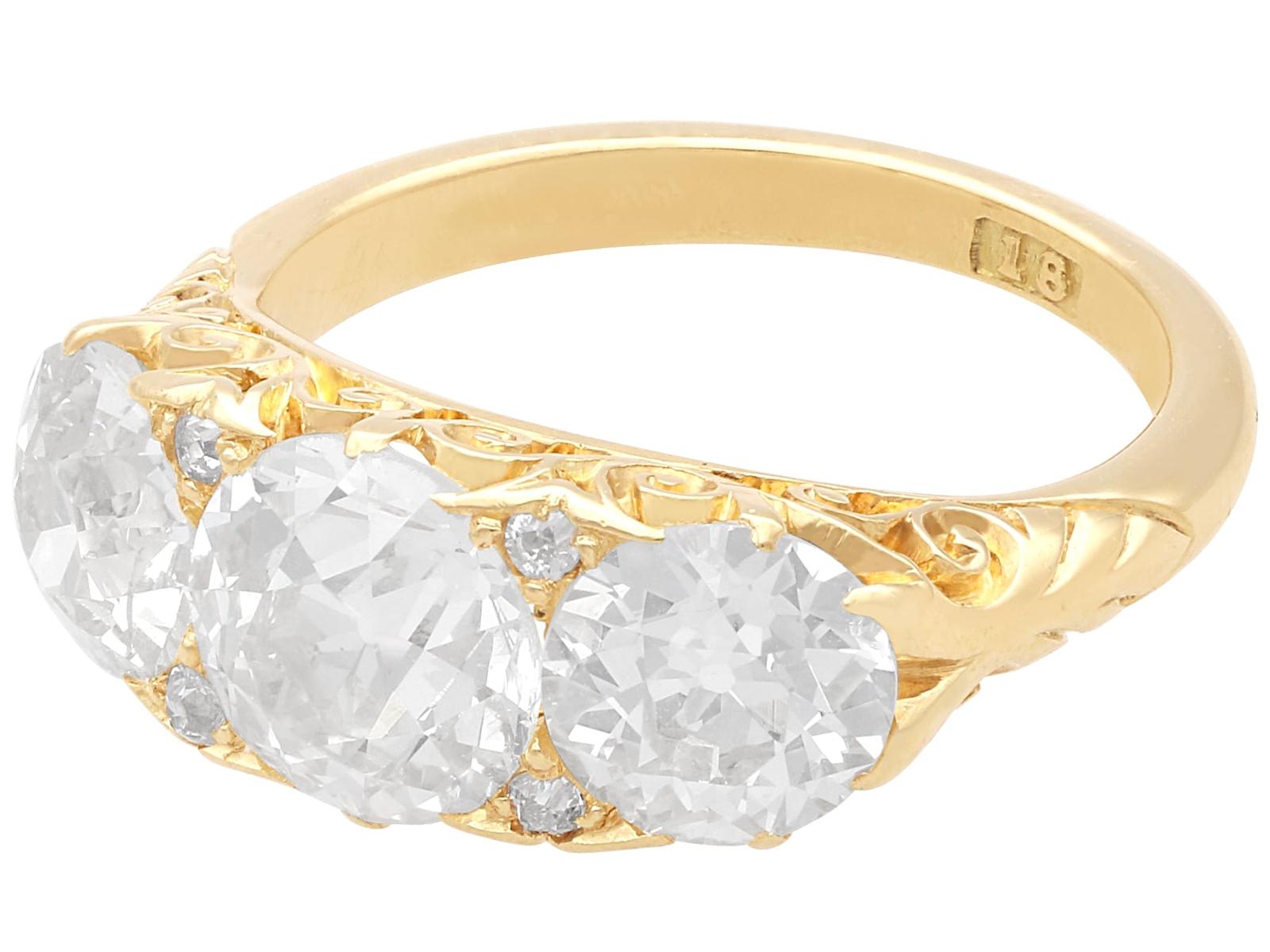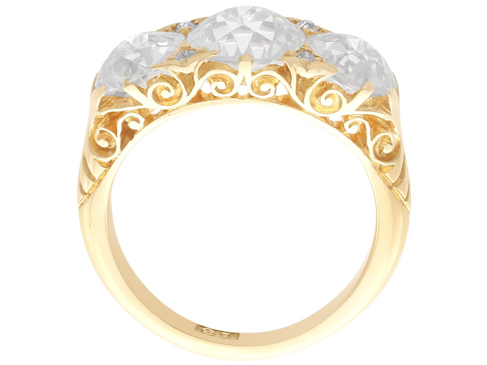 A magnificent, fine and impressive antique 4.76 carat diamond and 18 karat yellow gold three stone ring; part of our antique jewelry/estate jewelry collections.nnThis magnificent, fine and impressive antique trilogy ring has been crafted in 18k yellow gold.nnThe pierced and scroll decorated setting displays a stunning and large central claw set 2.28ct Old European cut diamond flanked by a 1.26ct and 1.14ct Old European round cut diamond.nnThe main setting is further embellished with four Dutch cut diamonds, set in sequence with the main gemstones.nnThe elevated ring shoulders are ornamented with further scrolling ornamentation and meld with the plain 18k yellow gold ring shank.nnThis stunning diamond ring is hallmarked to the interior of the ring shank with the 18k mark (18).nnThis impressive antique ring is supplied with three IDGL diamond grading report certificates for the feature stones, in addition to an IDGL diamond grading report card for the supporting stones.nnSuch examples set with large Old European round cut diamonds of nearly 5ct, in this high quality are becoming increasingly difficult to locate; this ring is the finest of its type you can hope to acquire.nnThis 4.76 carat gold trilogy ring is an opulent and meaningful gift. Its three stone design symbolising past, present and future – ideal for anniversaries, engagements or vow renewals.nnImages do not always reflect the true color and brilliance of gemstones and diamonds. The video however provides a truer representation of the actual color and showcases each stone.nnDiamond QualitynFeature Diamond OnenColor JnClarity SI2nCut Old EuropeannContent 2.28 caratsnDimensions 8.30mm (length) x 8.25mm (width) x 5.30mm (depth)nnFeature Diamond TwonColor InClarity SI2nCut Old EuropeannContent 1.26 caratsnDimensions 6.87mm (length) x 6.69mm (width) x 4.35mm (depth)nnFeature Diamond ThreenColor InClarity VS2nCut Old EuropeannContent 1.14 caratsnDimensions 6.79mm (length) x 6.70mm (width) x 4.44mm (depth)nnSupporting DiamondsnColor (average grades) InClarity (average grades) P1nCut DutchnContent 0.08 caratnnTotal Diamond Contentn4.76 caratsnnNumber of Diamondsn7nnDimensionsnWidth of setting 8.5mm/0.33’nHeight of setting 5.51mm/0.22’nnRing SizenUK Size OnUSA Size 7nnThe ring size may be professionally adjusted in size on request to meet your personal requirements.nnWeightn6.35 grams