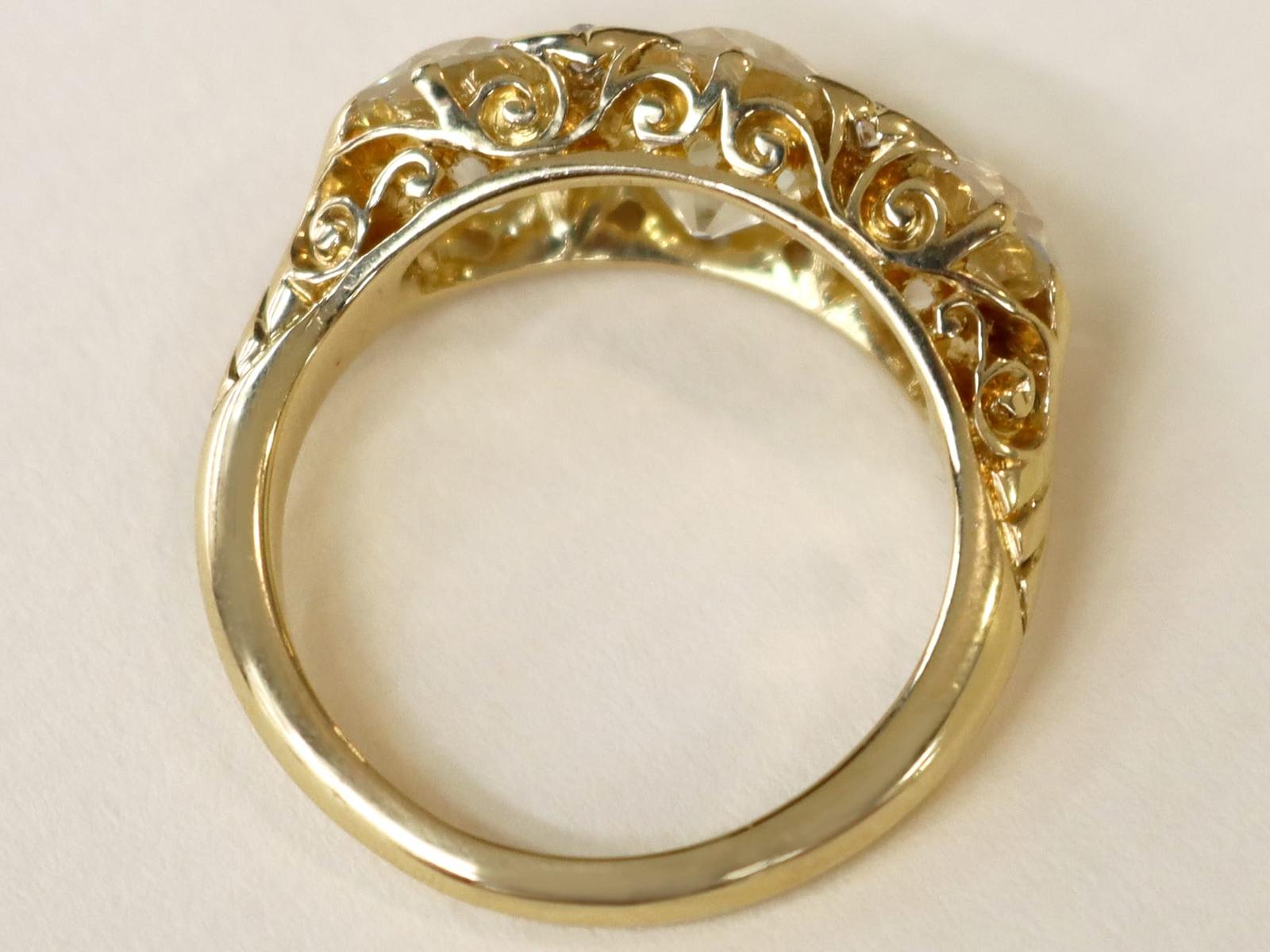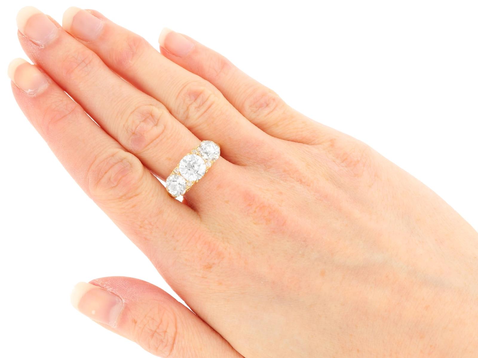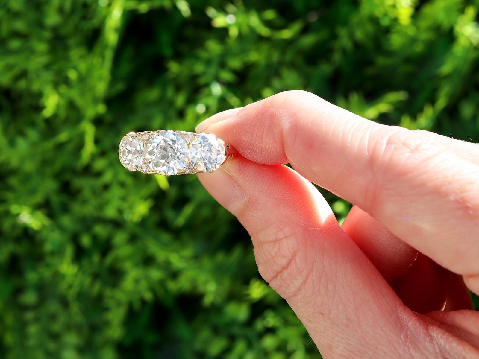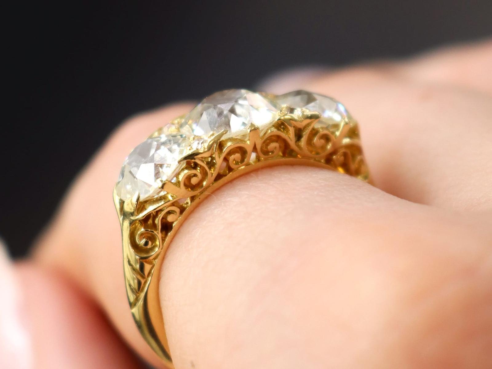 A magnificent, fine and impressive antique 4.76 carat diamond and 18 karat yellow gold three stone ring; part of our antique jewelry/estate jewelry collections.nnThis magnificent, fine and impressive antique trilogy ring has been crafted in 18k yellow gold.nnThe pierced and scroll decorated setting displays a stunning and large central claw set 2.28ct Old European cut diamond flanked by a 1.26ct and 1.14ct Old European round cut diamond.nnThe main setting is further embellished with four Dutch cut diamonds, set in sequence with the main gemstones.nnThe elevated ring shoulders are ornamented with further scrolling ornamentation and meld with the plain 18k yellow gold ring shank.nnThis stunning diamond ring is hallmarked to the interior of the ring shank with the 18k mark (18).nnThis impressive antique ring is supplied with three IDGL diamond grading report certificates for the feature stones, in addition to an IDGL diamond grading report card for the supporting stones.nnSuch examples set with large Old European round cut diamonds of nearly 5ct, in this high quality are becoming increasingly difficult to locate; this ring is the finest of its type you can hope to acquire.nnThis 4.76 carat gold trilogy ring is an opulent and meaningful gift. Its three stone design symbolising past, present and future – ideal for anniversaries, engagements or vow renewals.nnImages do not always reflect the true color and brilliance of gemstones and diamonds. The video however provides a truer representation of the actual color and showcases each stone.nnDiamond QualitynFeature Diamond OnenColor JnClarity SI2nCut Old EuropeannContent 2.28 caratsnDimensions 8.30mm (length) x 8.25mm (width) x 5.30mm (depth)nnFeature Diamond TwonColor InClarity SI2nCut Old EuropeannContent 1.26 caratsnDimensions 6.87mm (length) x 6.69mm (width) x 4.35mm (depth)nnFeature Diamond ThreenColor InClarity VS2nCut Old EuropeannContent 1.14 caratsnDimensions 6.79mm (length) x 6.70mm (width) x 4.44mm (depth)nnSupporting DiamondsnColor (average grades) InClarity (average grades) P1nCut DutchnContent 0.08 caratnnTotal Diamond Contentn4.76 caratsnnNumber of Diamondsn7nnDimensionsnWidth of setting 8.5mm/0.33’nHeight of setting 5.51mm/0.22’nnRing SizenUK Size OnUSA Size 7nnThe ring size may be professionally adjusted in size on request to meet your personal requirements.nnWeightn6.35 grams