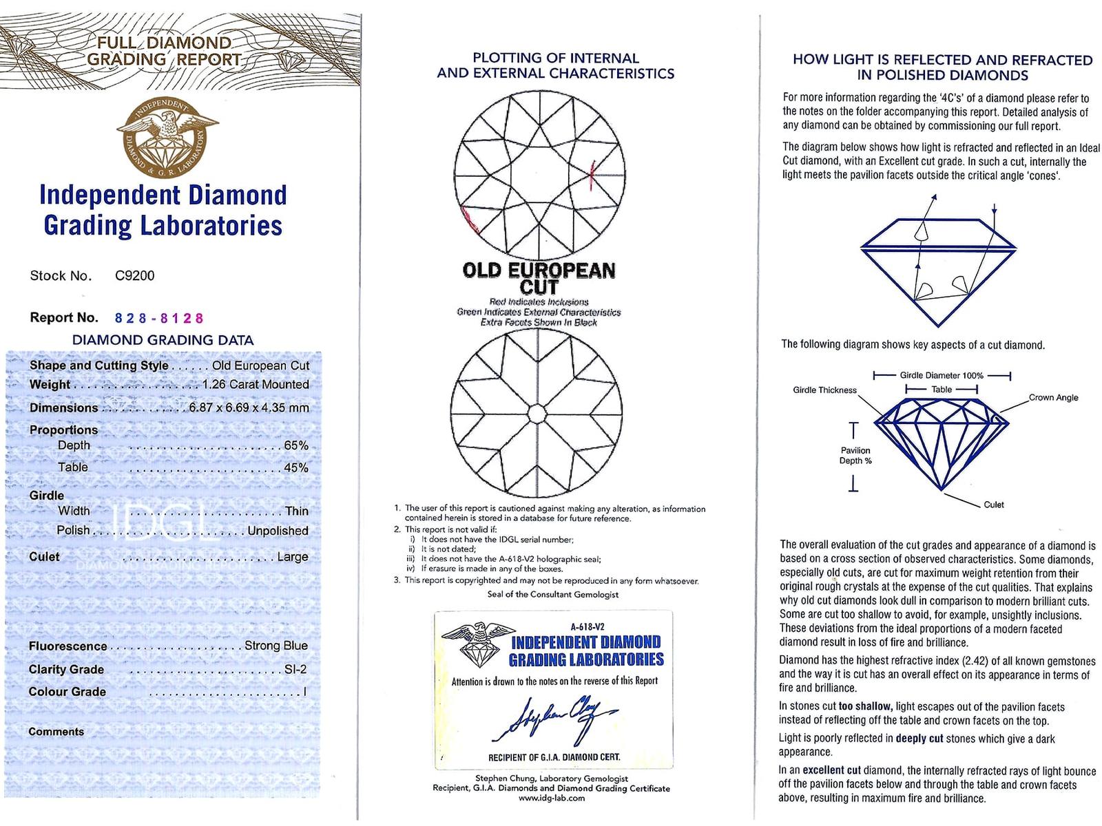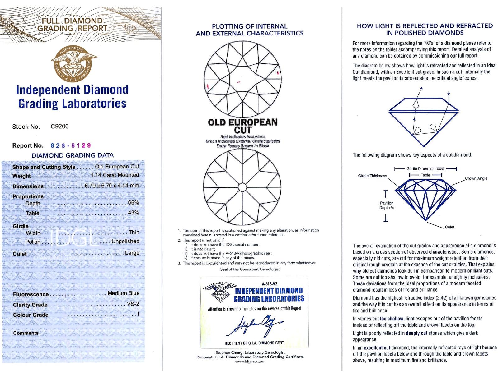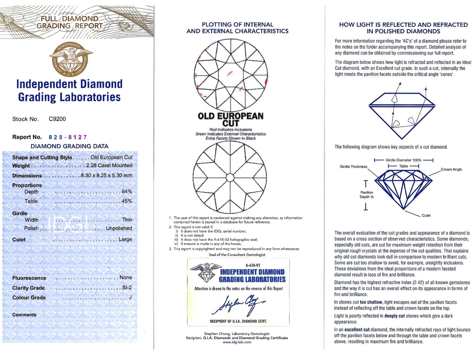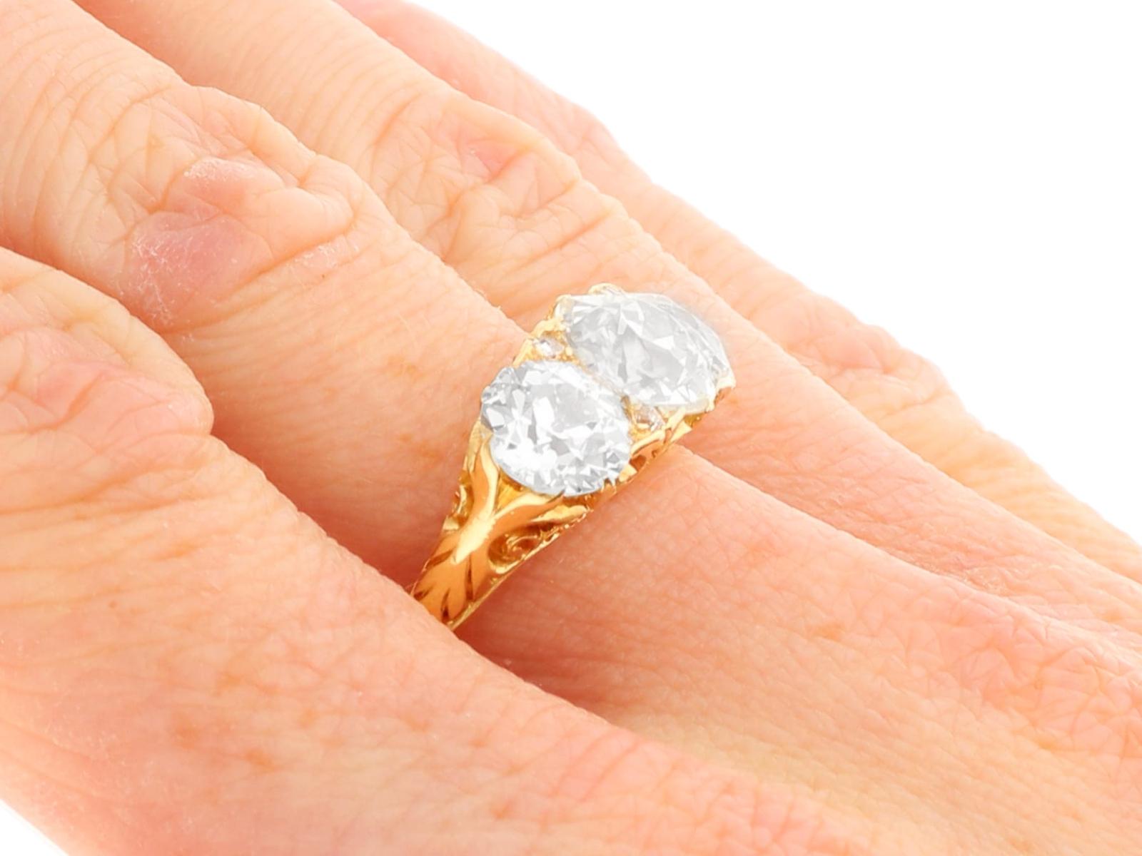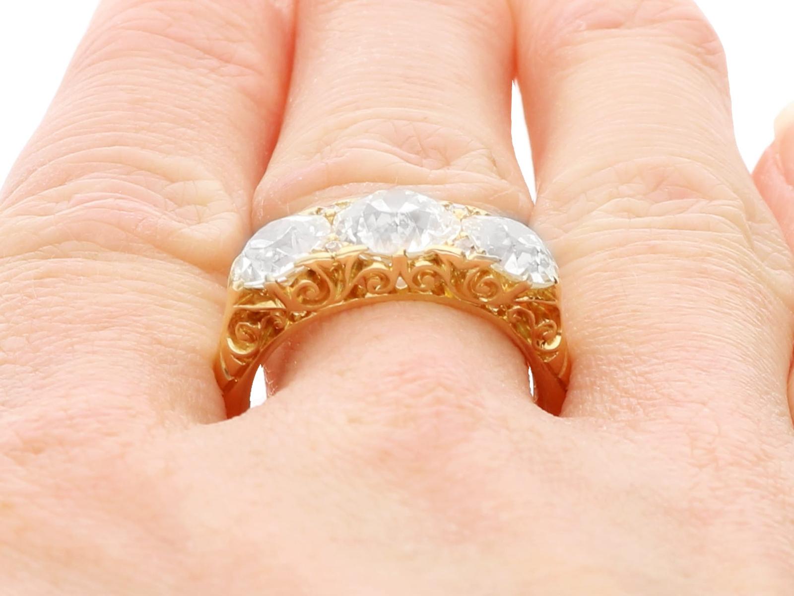 A magnificent, fine and impressive antique 4.76 carat diamond and 18 karat yellow gold three stone ring; part of our antique jewelry/estate jewelry collections.nnThis magnificent, fine and impressive antique trilogy ring has been crafted in 18k yellow gold.nnThe pierced and scroll decorated setting displays a stunning and large central claw set 2.28ct Old European cut diamond flanked by a 1.26ct and 1.14ct Old European round cut diamond.nnThe main setting is further embellished with four Dutch cut diamonds, set in sequence with the main gemstones.nnThe elevated ring shoulders are ornamented with further scrolling ornamentation and meld with the plain 18k yellow gold ring shank.nnThis stunning diamond ring is hallmarked to the interior of the ring shank with the 18k mark (18).nnThis impressive antique ring is supplied with three IDGL diamond grading report certificates for the feature stones, in addition to an IDGL diamond grading report card for the supporting stones.nnSuch examples set with large Old European round cut diamonds of nearly 5ct, in this high quality are becoming increasingly difficult to locate; this ring is the finest of its type you can hope to acquire.nnThis 4.76 carat gold trilogy ring is an opulent and meaningful gift. Its three stone design symbolising past, present and future – ideal for anniversaries, engagements or vow renewals.nnImages do not always reflect the true color and brilliance of gemstones and diamonds. The video however provides a truer representation of the actual color and showcases each stone.nnDiamond QualitynFeature Diamond OnenColor JnClarity SI2nCut Old EuropeannContent 2.28 caratsnDimensions 8.30mm (length) x 8.25mm (width) x 5.30mm (depth)nnFeature Diamond TwonColor InClarity SI2nCut Old EuropeannContent 1.26 caratsnDimensions 6.87mm (length) x 6.69mm (width) x 4.35mm (depth)nnFeature Diamond ThreenColor InClarity VS2nCut Old EuropeannContent 1.14 caratsnDimensions 6.79mm (length) x 6.70mm (width) x 4.44mm (depth)nnSupporting DiamondsnColor (average grades) InClarity (average grades) P1nCut DutchnContent 0.08 caratnnTotal Diamond Contentn4.76 caratsnnNumber of Diamondsn7nnDimensionsnWidth of setting 8.5mm/0.33’nHeight of setting 5.51mm/0.22’nnRing SizenUK Size OnUSA Size 7nnThe ring size may be professionally adjusted in size on request to meet your personal requirements.nnWeightn6.35 grams