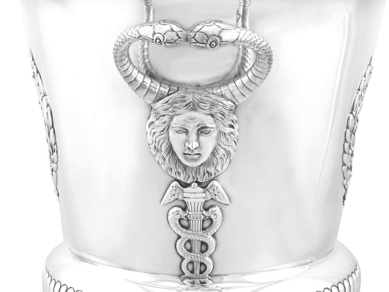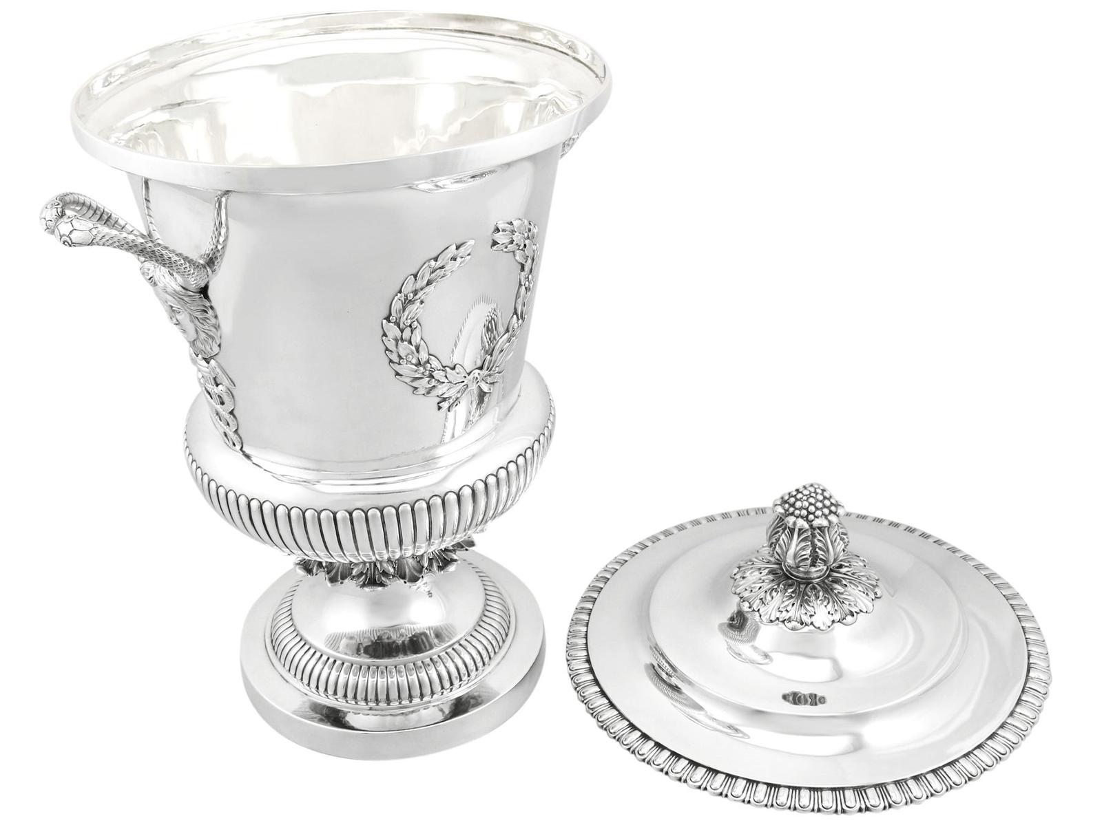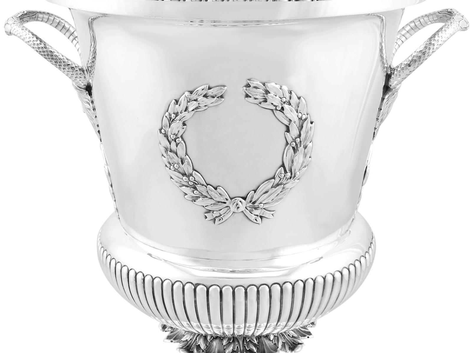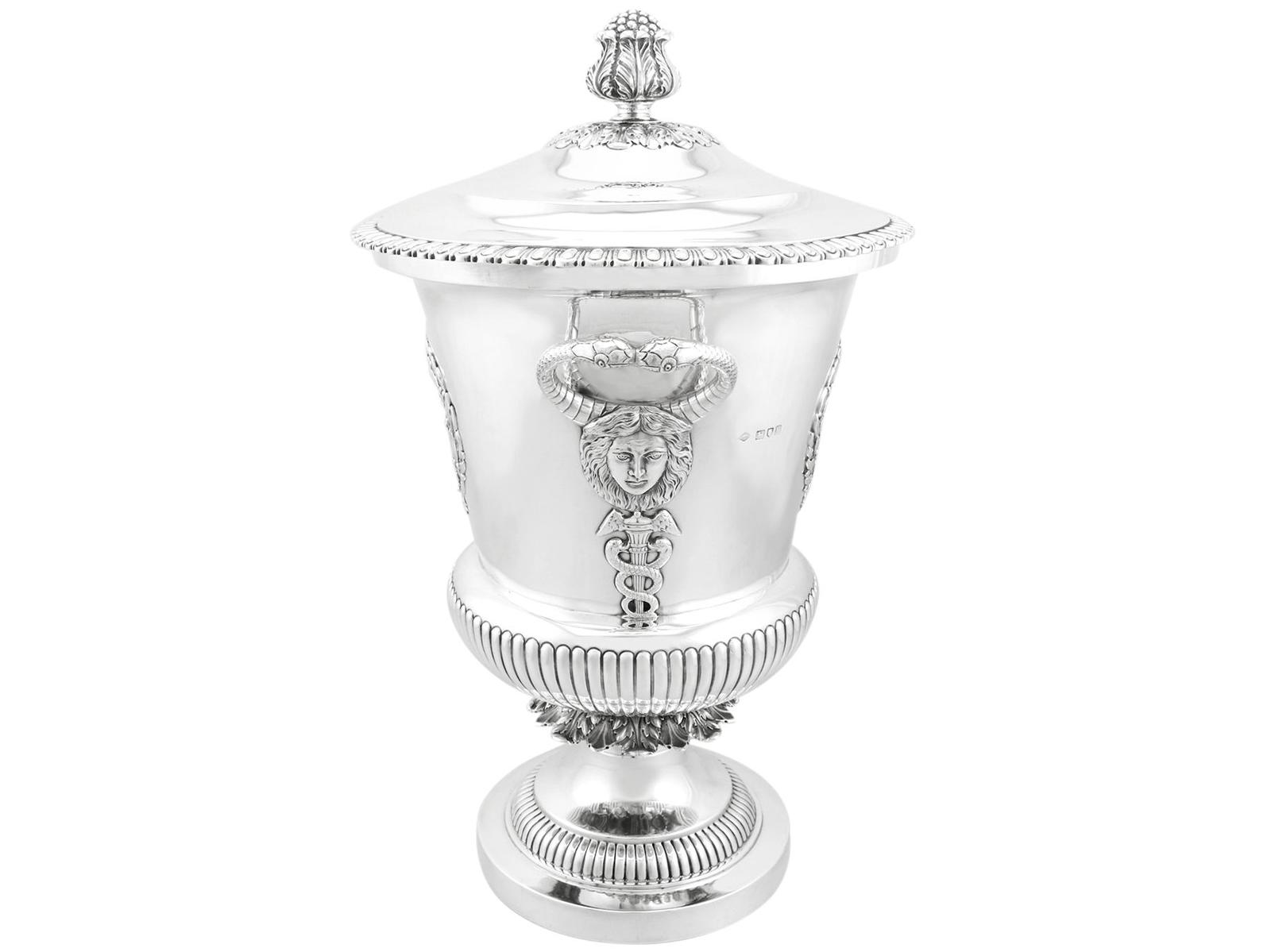 Magnificent, fine and impressive, large antique Edwardian English sterling silver cup & cover; an addition to our antique presentation silverware collection.nnThis magnificent and large antique Edwardian sterling silver presentation cup & cover has a campania shaped form onto a circular spreading pedestal foot.nnThe lower bulbous portion of the silver cup is encircled with chased fluted ornamentation.nnEither side of the plain upper portion of the body is embellished with an exceptional and large applied ribbon tied laurel branch wreath, replicating the border of a classic cartouche.nnThis impressive Edwardian presentation cup retains the impressive, original hallmarked push fit cover surmounted with an exceptional, fine and impressive cast sterling silver overlapping leaf and bud style finial.nnThe rim of this substantial cover is encompassed with an impressive applied egg and dart decorated border.nnThis antique cup and cover is fitted with two very impressive cast sterling silver handles modelled in the form of conjoined snakes, above a figural mask and Caduceus*.nnThe pedestal is encompassed with a shaped alternating leaf decorated knop to the upper portion in junction with the body.nnThe circular domed spreading foot is encircled with a further band of chased fluted ornamentation.nnSuch large examples are becoming increasingly difficult to locate.nn* Caduceus (otherwise known as herald’s staff) is a staff entwined with two serpents and surmounted by a pair of wings. This staff is carried by Hermes in Greek mythology and Mercury in Roman iconography; each figure is known for being a messenger. This classic symbol is a modern day depiction of commerce and is used as a symbol across the medical field in the United States of America.nnMaker: Johnson, Walker & Tolhurst LtdnOrigin: London, England