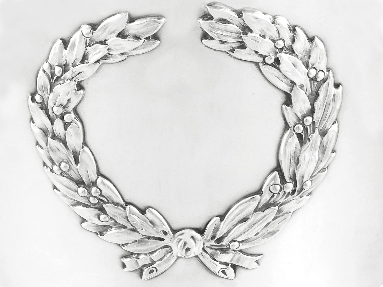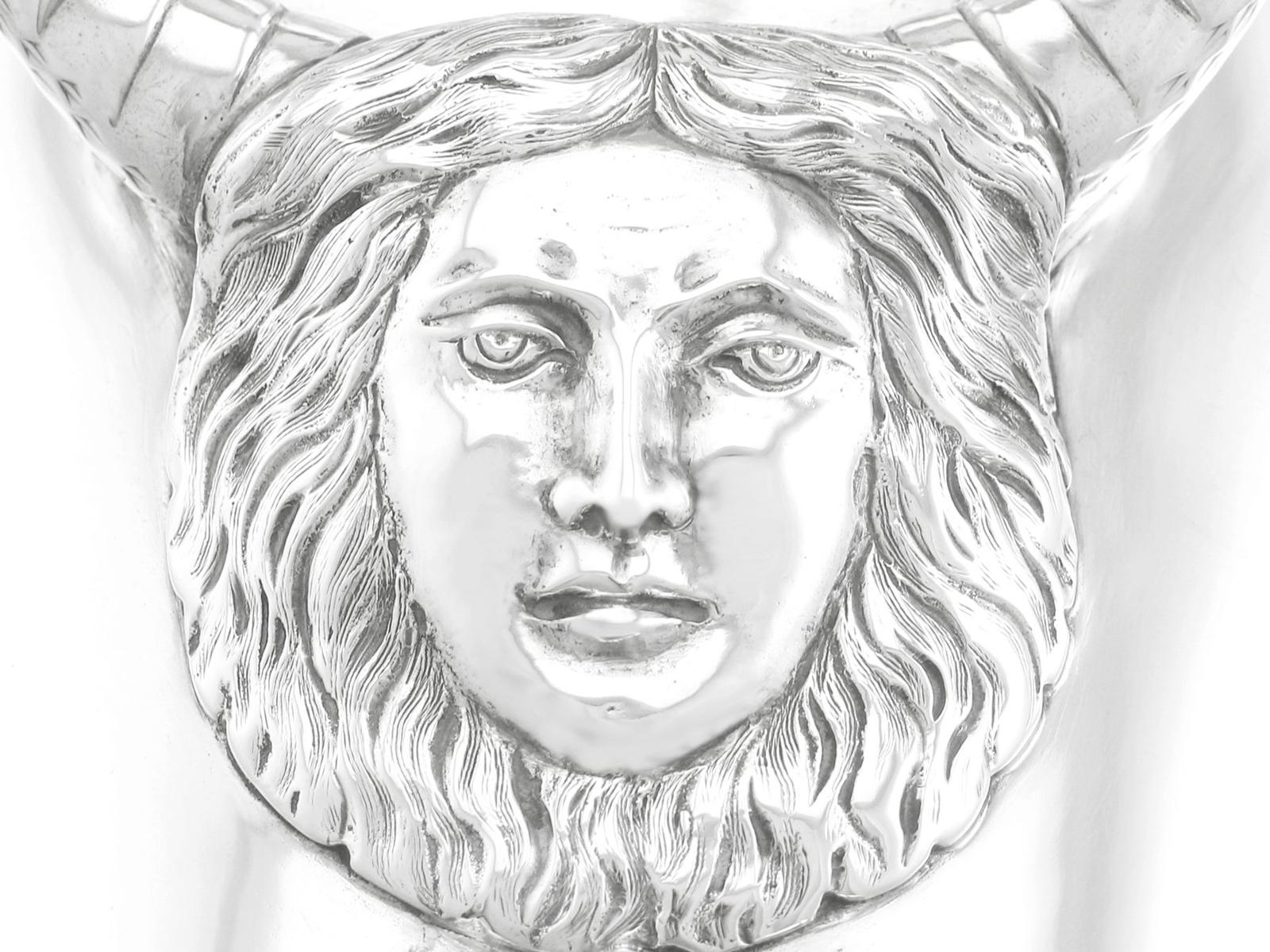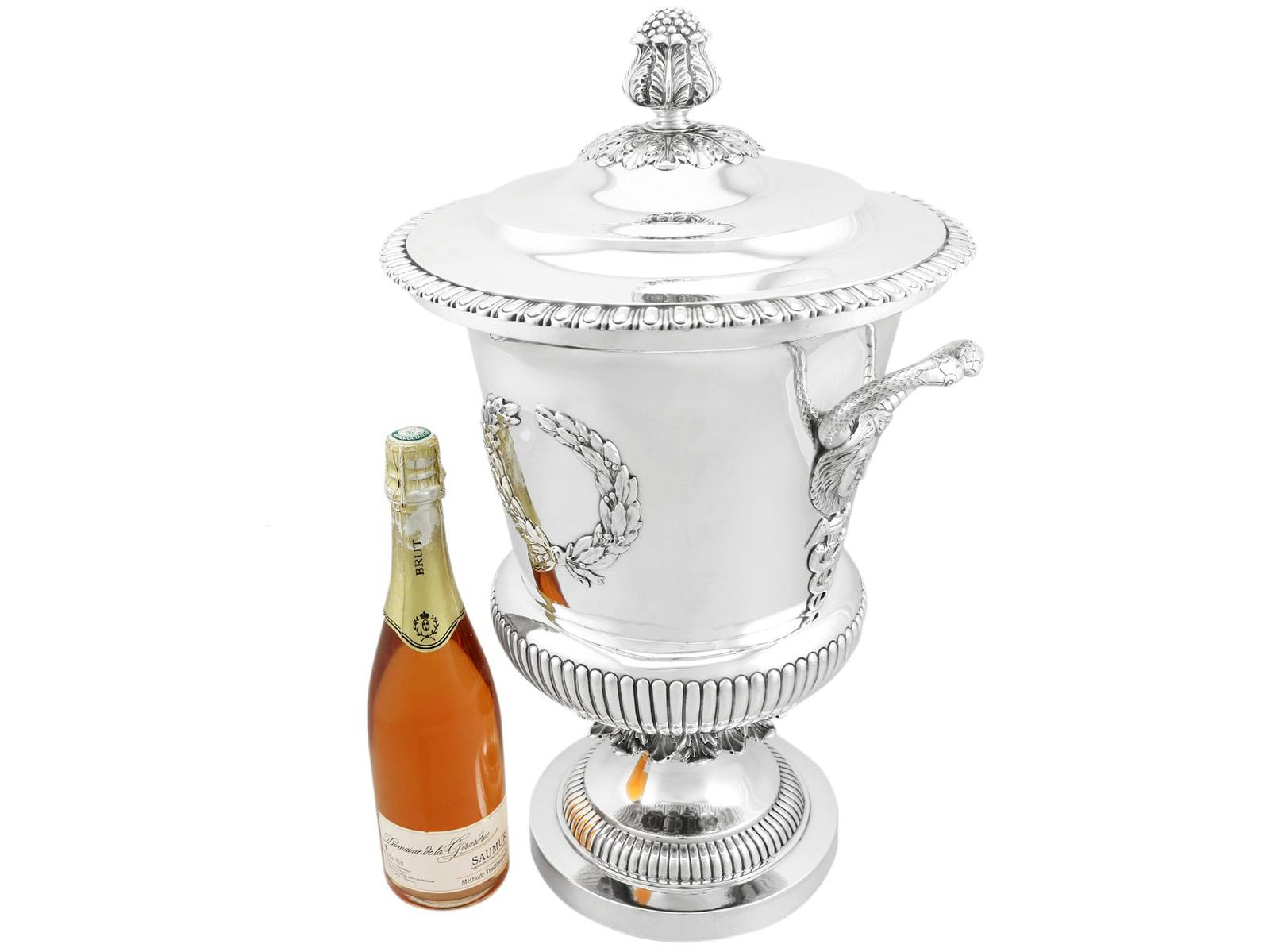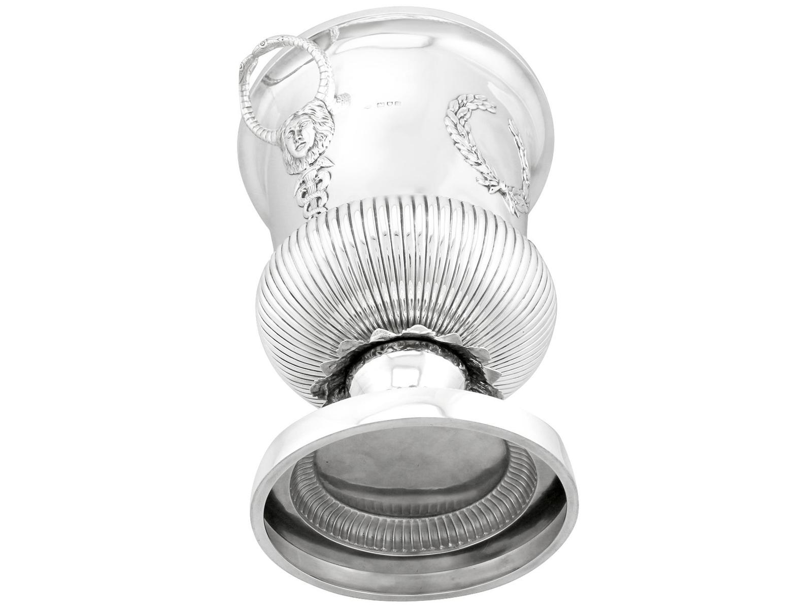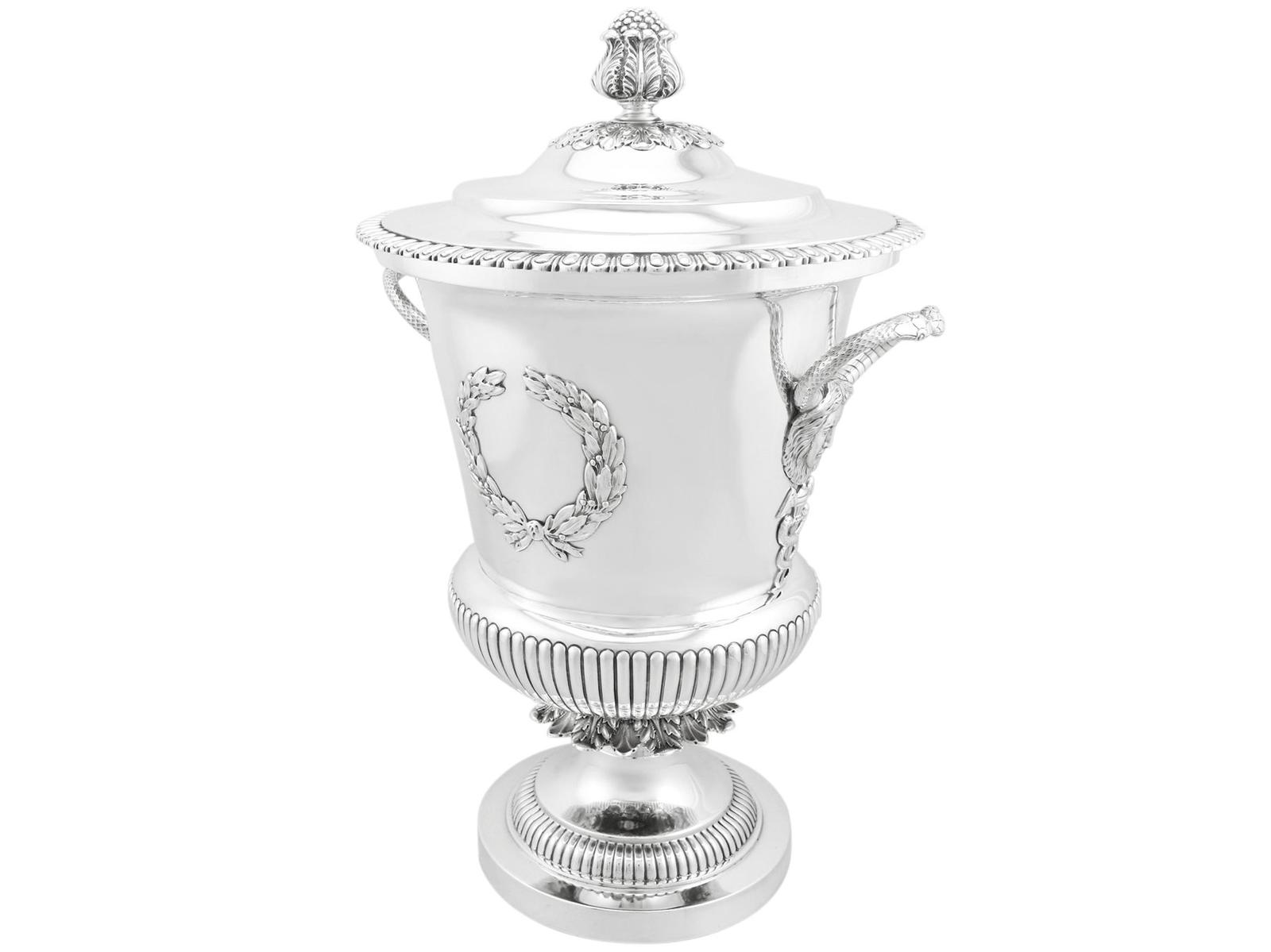 Magnificent, fine and impressive, large antique Edwardian English sterling silver cup & cover; an addition to our antique presentation silverware collection.nnThis magnificent and large antique Edwardian sterling silver presentation cup & cover has a campania shaped form onto a circular spreading pedestal foot.nnThe lower bulbous portion of the silver cup is encircled with chased fluted ornamentation.nnEither side of the plain upper portion of the body is embellished with an exceptional and large applied ribbon tied laurel branch wreath, replicating the border of a classic cartouche.nnThis impressive Edwardian presentation cup retains the impressive, original hallmarked push fit cover surmounted with an exceptional, fine and impressive cast sterling silver overlapping leaf and bud style finial.nnThe rim of this substantial cover is encompassed with an impressive applied egg and dart decorated border.nnThis antique cup and cover is fitted with two very impressive cast sterling silver handles modelled in the form of conjoined snakes, above a figural mask and Caduceus*.nnThe pedestal is encompassed with a shaped alternating leaf decorated knop to the upper portion in junction with the body.nnThe circular domed spreading foot is encircled with a further band of chased fluted ornamentation.nnSuch large examples are becoming increasingly difficult to locate.nn* Caduceus (otherwise known as herald’s staff) is a staff entwined with two serpents and surmounted by a pair of wings. This staff is carried by Hermes in Greek mythology and Mercury in Roman iconography; each figure is known for being a messenger. This classic symbol is a modern day depiction of commerce and is used as a symbol across the medical field in the United States of America.nnMaker: Johnson, Walker & Tolhurst LtdnOrigin: London, England