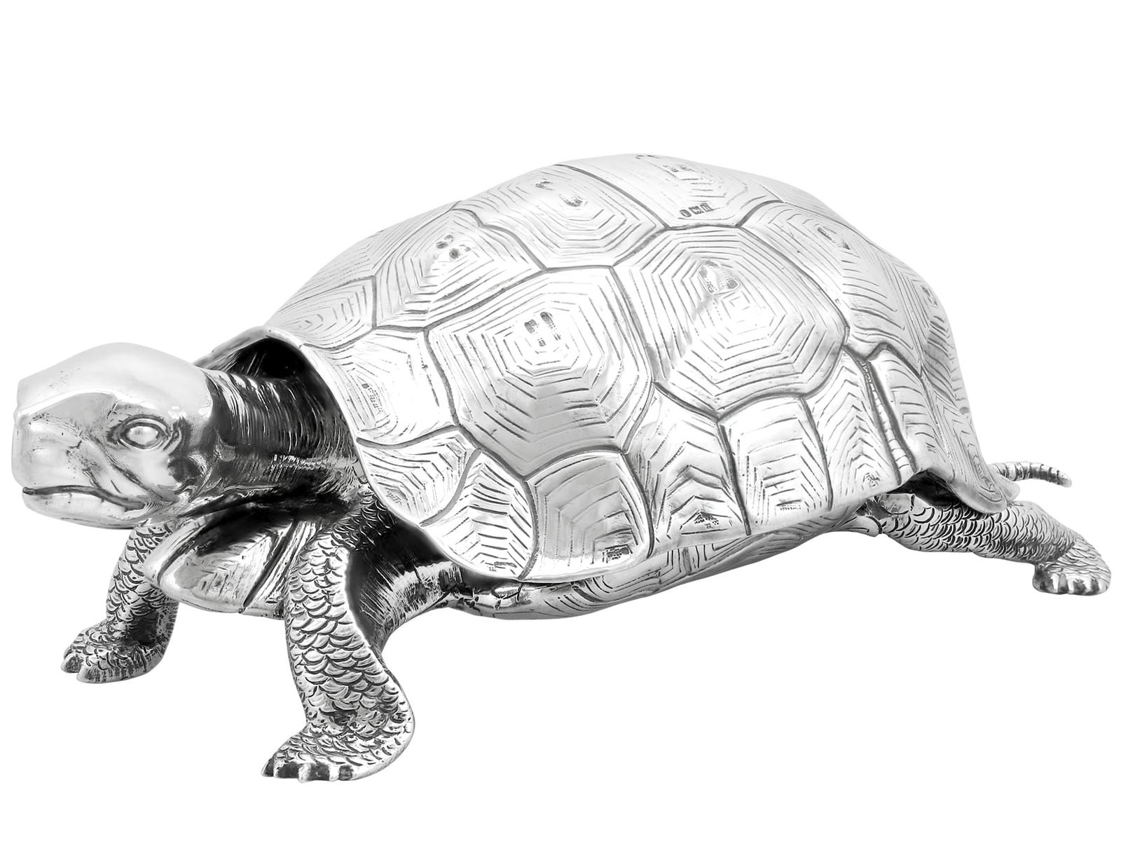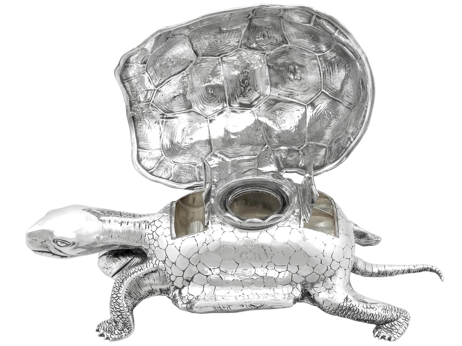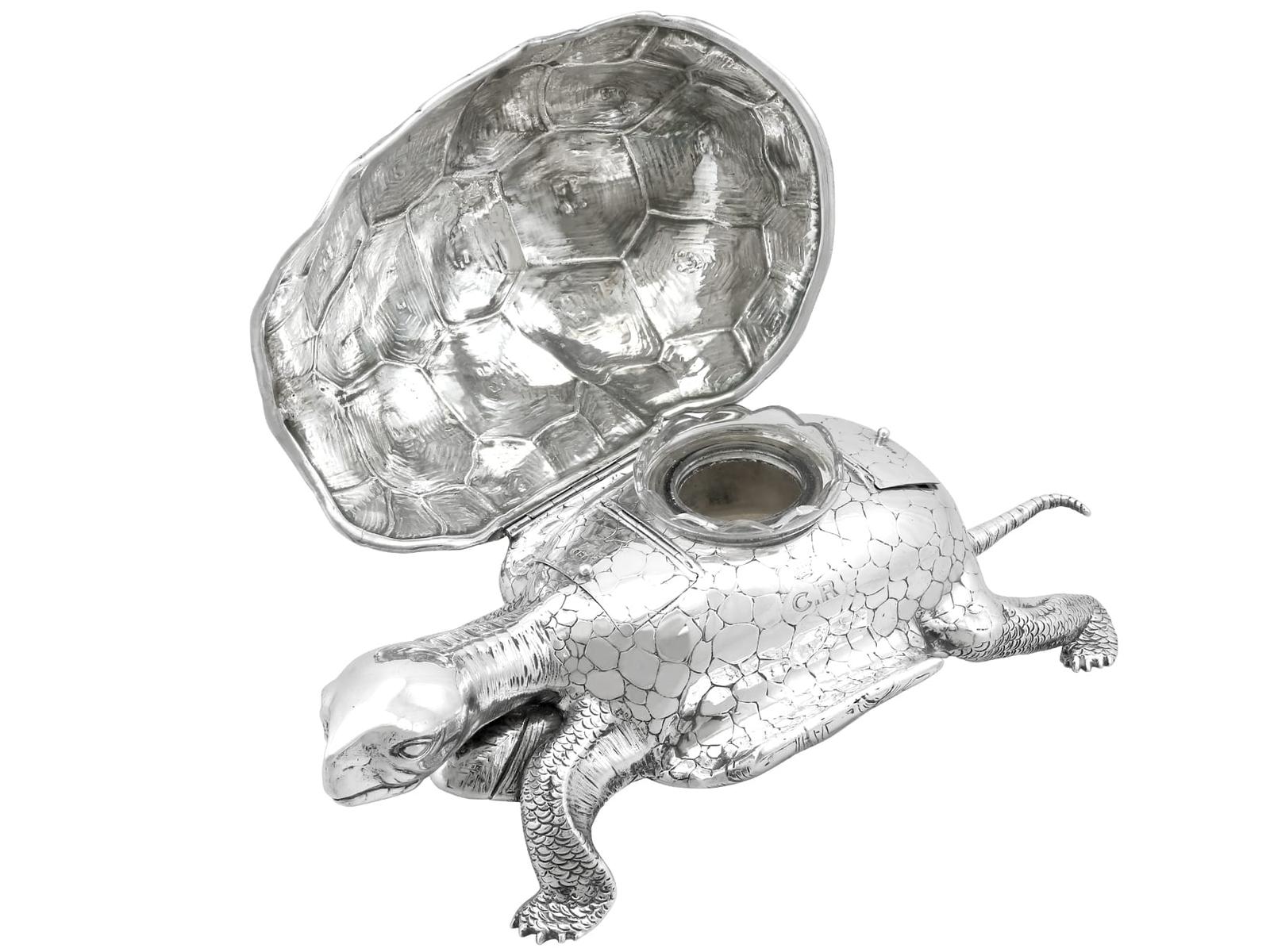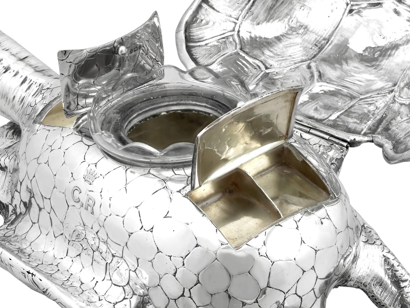 A magnificent, fine and impressive, large and rare antique Edwardian English cast sterling silver tortoise ink stand; part of our diverse collection of antique inkwells.nnThis magnificent and rare antique Edwardian English cast sterling silver ink stand has been realistically modelled in the form of a tortoise.nnThe large body of the ink stand has been embellished with fine details reproducing the tortoise’s skin and anatomical features.nnThis magnificent antique inkwell is fitted with an impressive hinged hallmarked sterling silver cover reflecting the shape of the tortoise’s shell.nnThe surface of the body and shell are embellished with engraved details enhancing the naturalistic components of the reptile.nnThe cover opens to reveal a sunken well and removable glass ink liner, above the contemporary engraved initials ‘C.R’ and coronet; the coronet indicates the importance of the piece.nnThe interior of the inkstand further incorporates an inset silver receptacle and a stamp box, each bearing secondary hinged covers.nnThese versatile compartments retain the original gilding to the interior.nnSuch large examples are rare to the market and this is the finest of its type you could hope to acquire.nn*Due to the nature of the reptiles features it has been determined this example replicates a tortoise; however, there are other reptile variants which may be applicable, including turtle and terrapin.nnMaker: B Muller & Son (Berthold Muller)nOrigin: London, England