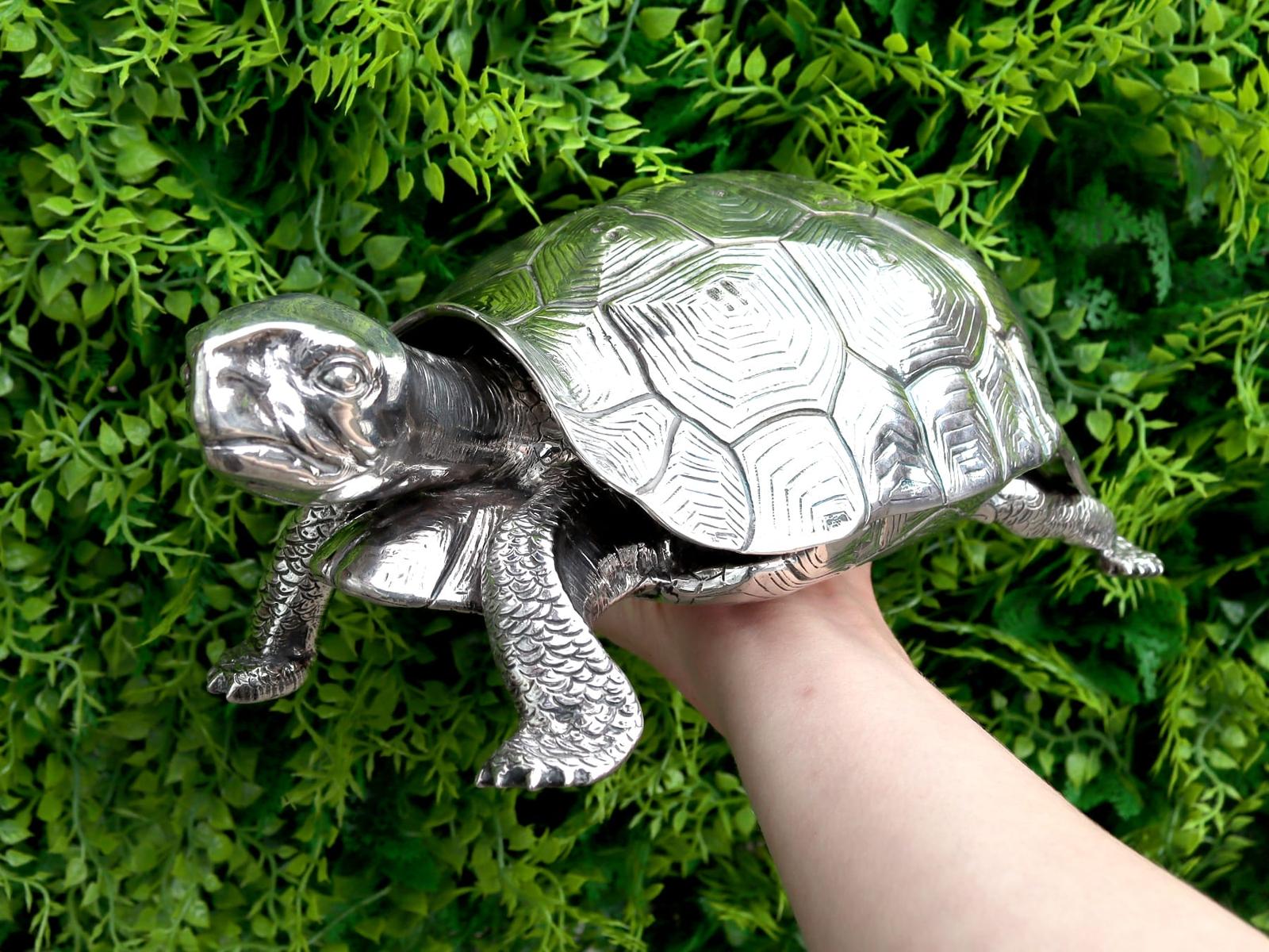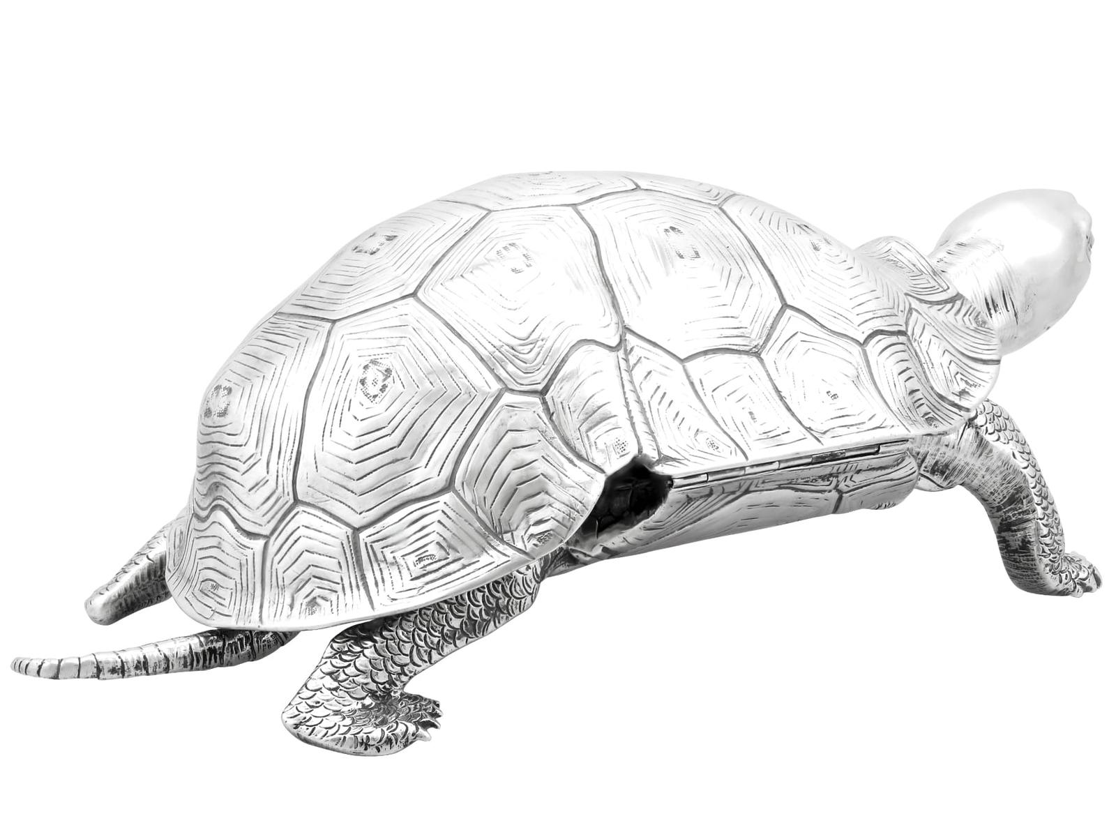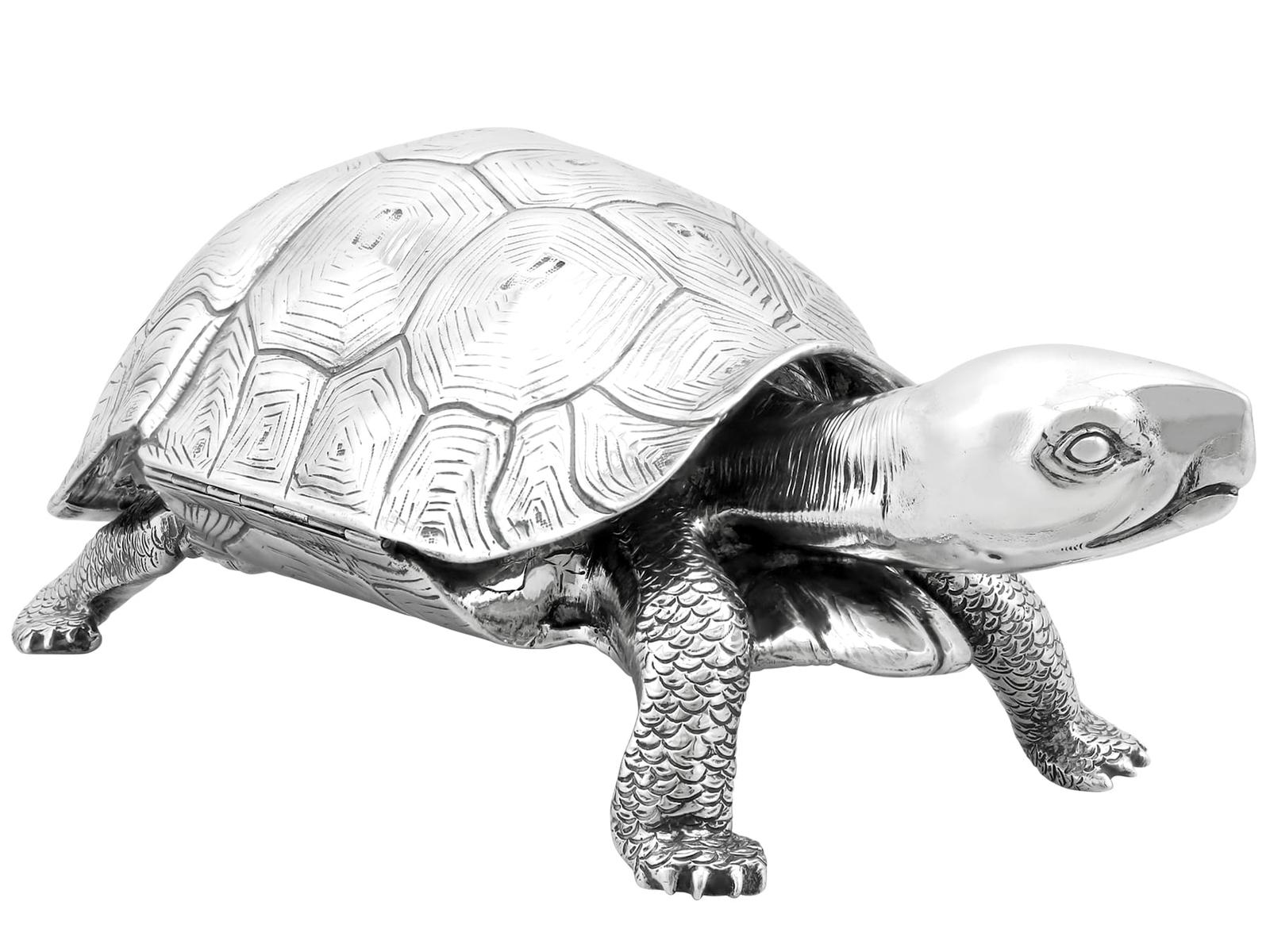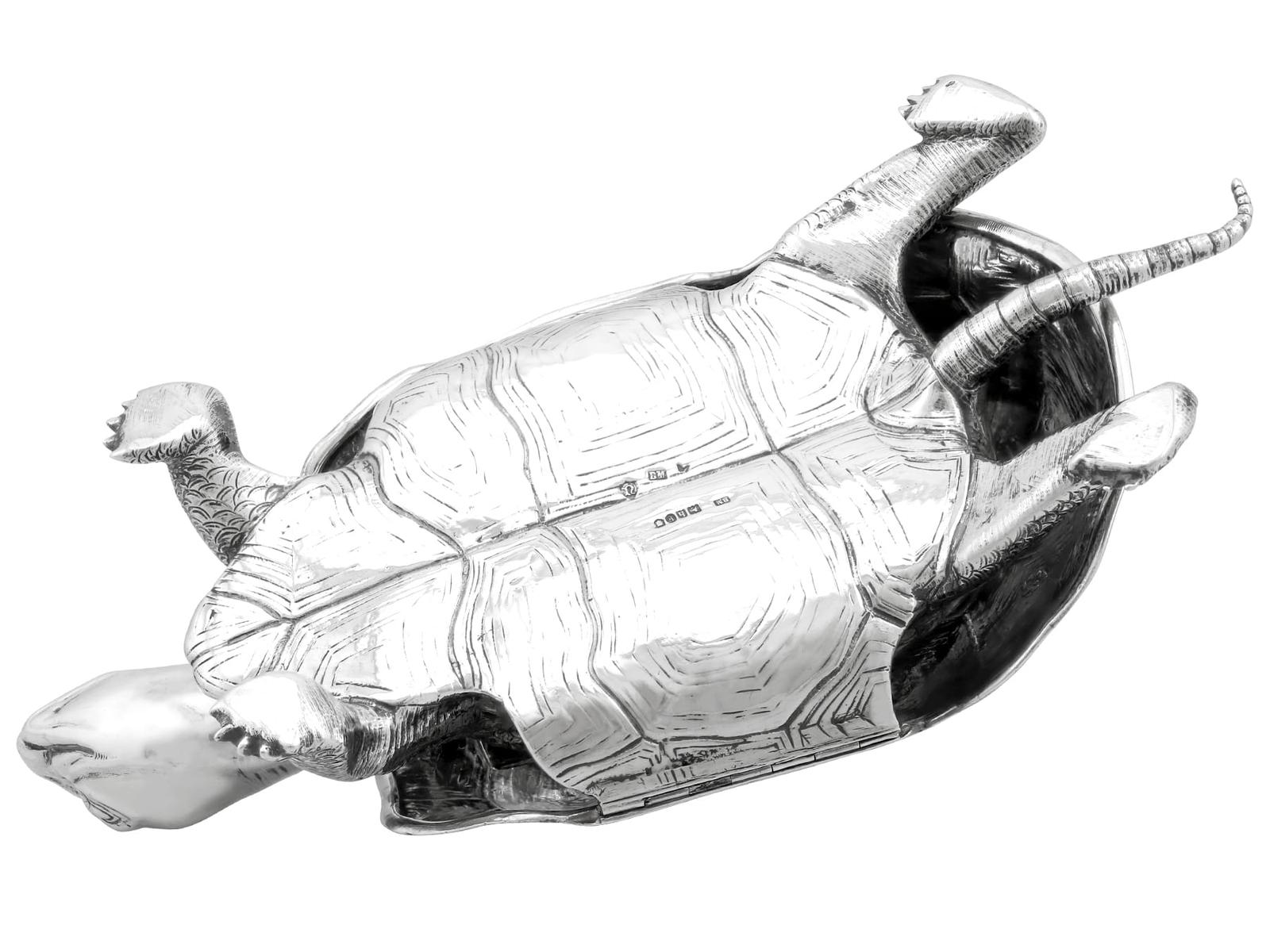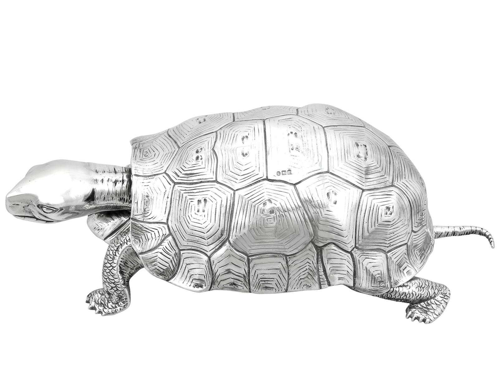 A magnificent, fine and impressive, large and rare antique Edwardian English cast sterling silver tortoise ink stand; part of our diverse collection of antique inkwells.nnThis magnificent and rare antique Edwardian English cast sterling silver ink stand has been realistically modelled in the form of a tortoise.nnThe large body of the ink stand has been embellished with fine details reproducing the tortoise’s skin and anatomical features.nnThis magnificent antique inkwell is fitted with an impressive hinged hallmarked sterling silver cover reflecting the shape of the tortoise’s shell.nnThe surface of the body and shell are embellished with engraved details enhancing the naturalistic components of the reptile.nnThe cover opens to reveal a sunken well and removable glass ink liner, above the contemporary engraved initials ‘C.R’ and coronet; the coronet indicates the importance of the piece.nnThe interior of the inkstand further incorporates an inset silver receptacle and a stamp box, each bearing secondary hinged covers.nnThese versatile compartments retain the original gilding to the interior.nnSuch large examples are rare to the market and this is the finest of its type you could hope to acquire.nn*Due to the nature of the reptiles features it has been determined this example replicates a tortoise; however, there are other reptile variants which may be applicable, including turtle and terrapin.nnMaker: B Muller & Son (Berthold Muller)nOrigin: London, England