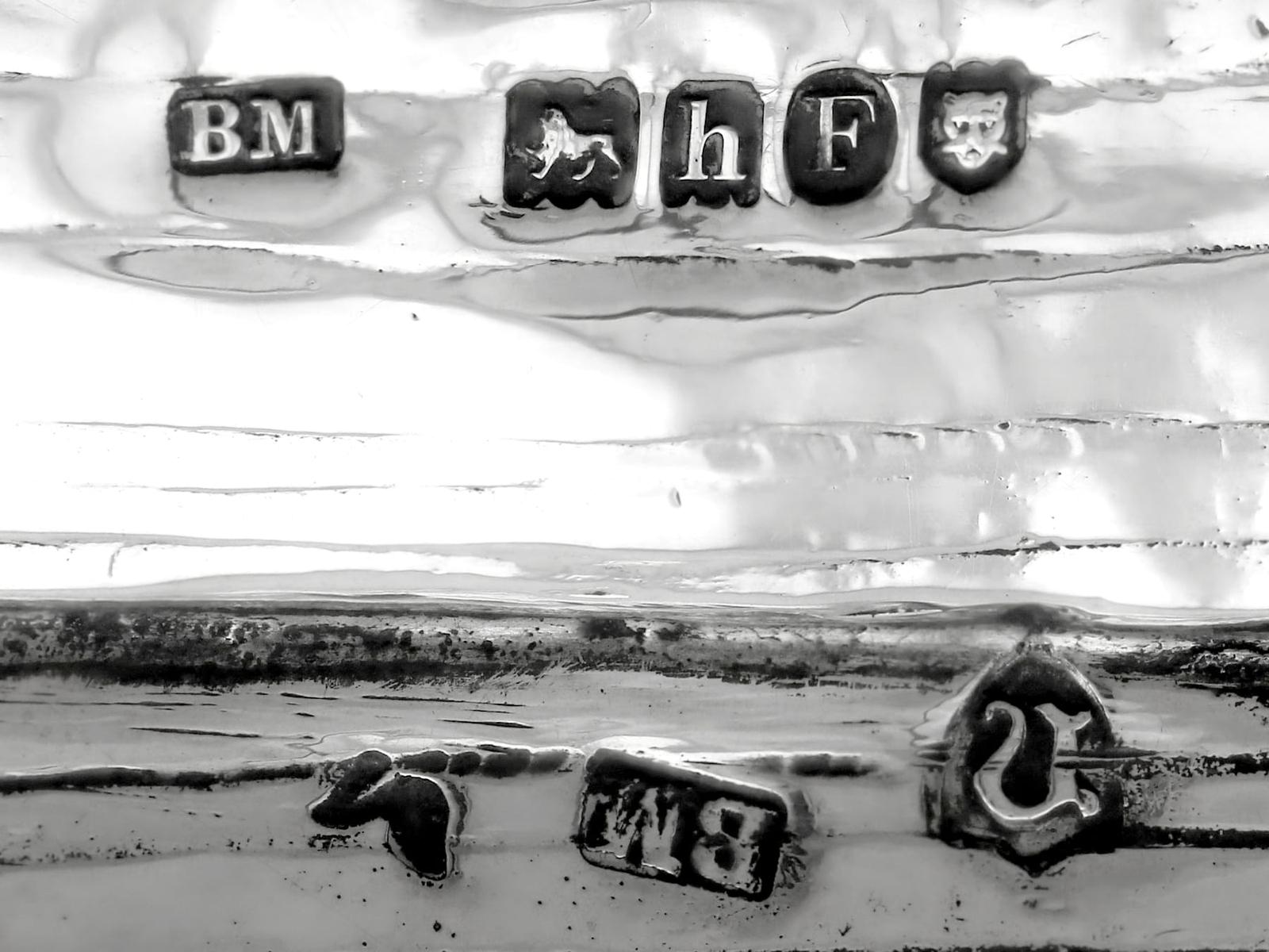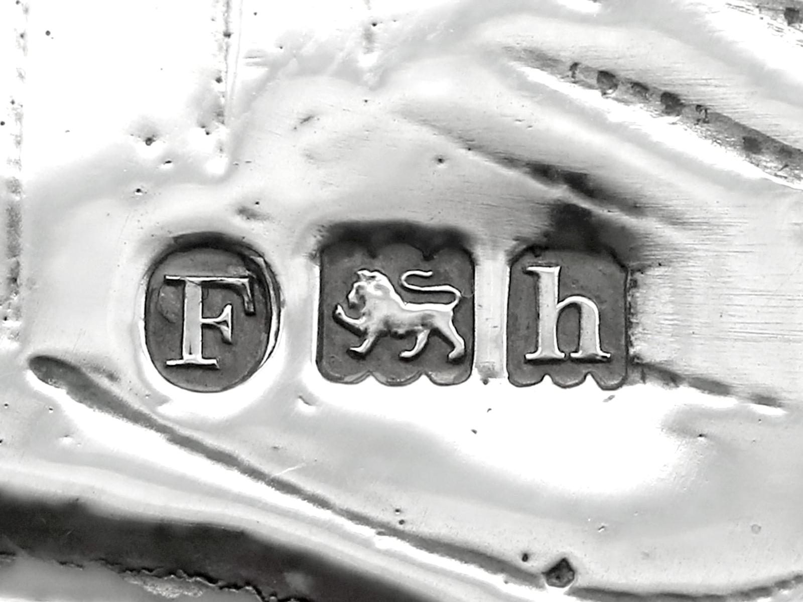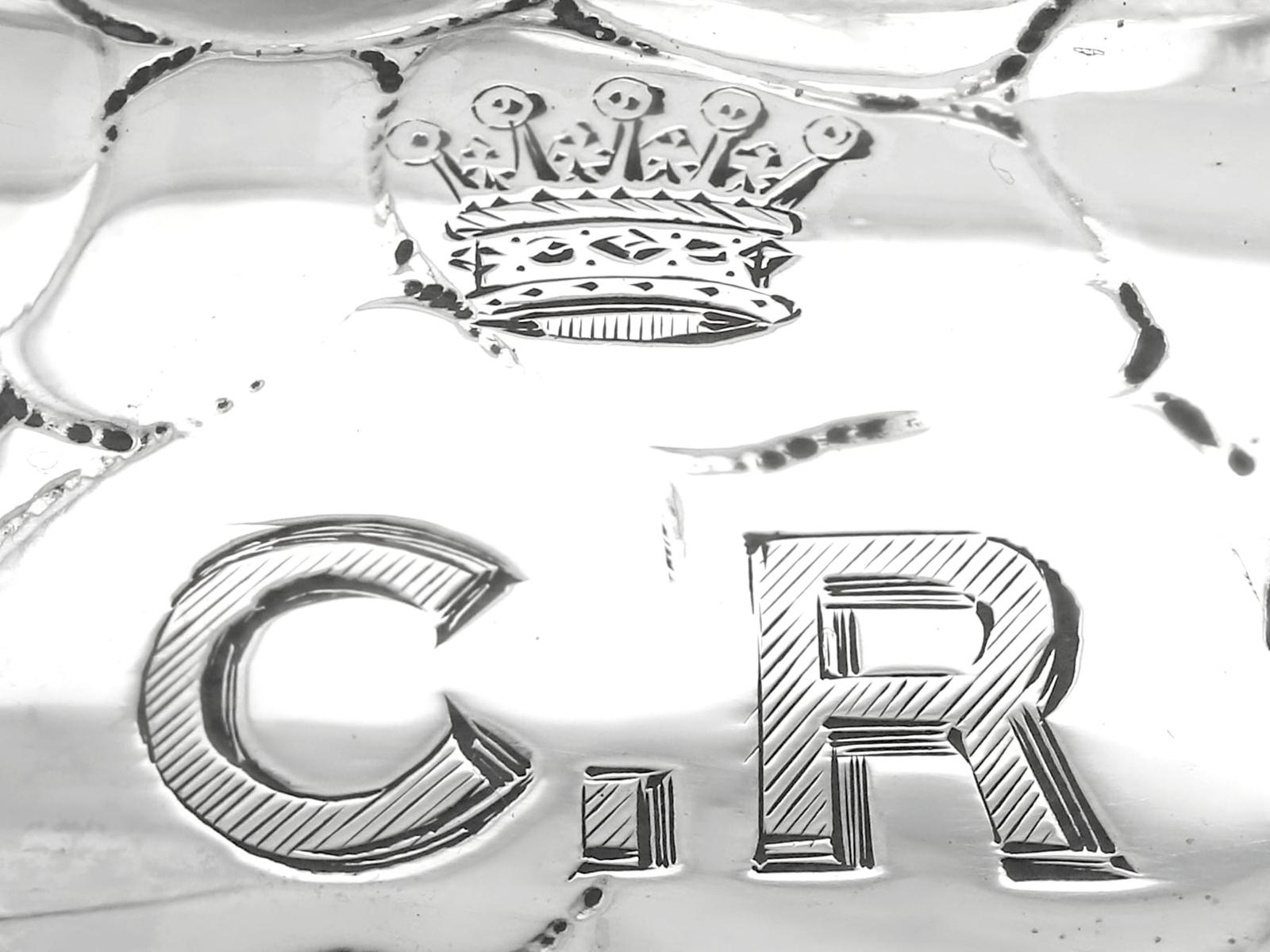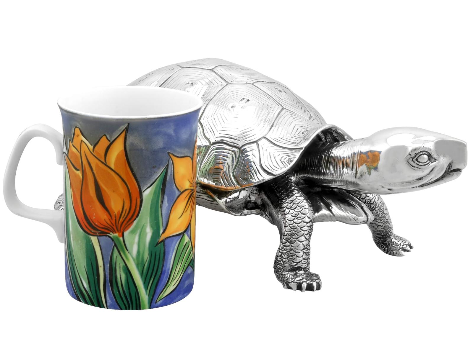 A magnificent, fine and impressive, large and rare antique Edwardian English cast sterling silver tortoise ink stand; part of our diverse collection of antique inkwells.nnThis magnificent and rare antique Edwardian English cast sterling silver ink stand has been realistically modelled in the form of a tortoise.nnThe large body of the ink stand has been embellished with fine details reproducing the tortoise’s skin and anatomical features.nnThis magnificent antique inkwell is fitted with an impressive hinged hallmarked sterling silver cover reflecting the shape of the tortoise’s shell.nnThe surface of the body and shell are embellished with engraved details enhancing the naturalistic components of the reptile.nnThe cover opens to reveal a sunken well and removable glass ink liner, above the contemporary engraved initials ‘C.R’ and coronet; the coronet indicates the importance of the piece.nnThe interior of the inkstand further incorporates an inset silver receptacle and a stamp box, each bearing secondary hinged covers.nnThese versatile compartments retain the original gilding to the interior.nnSuch large examples are rare to the market and this is the finest of its type you could hope to acquire.nn*Due to the nature of the reptiles features it has been determined this example replicates a tortoise; however, there are other reptile variants which may be applicable, including turtle and terrapin.nnMaker: B Muller & Son (Berthold Muller)nOrigin: London, England