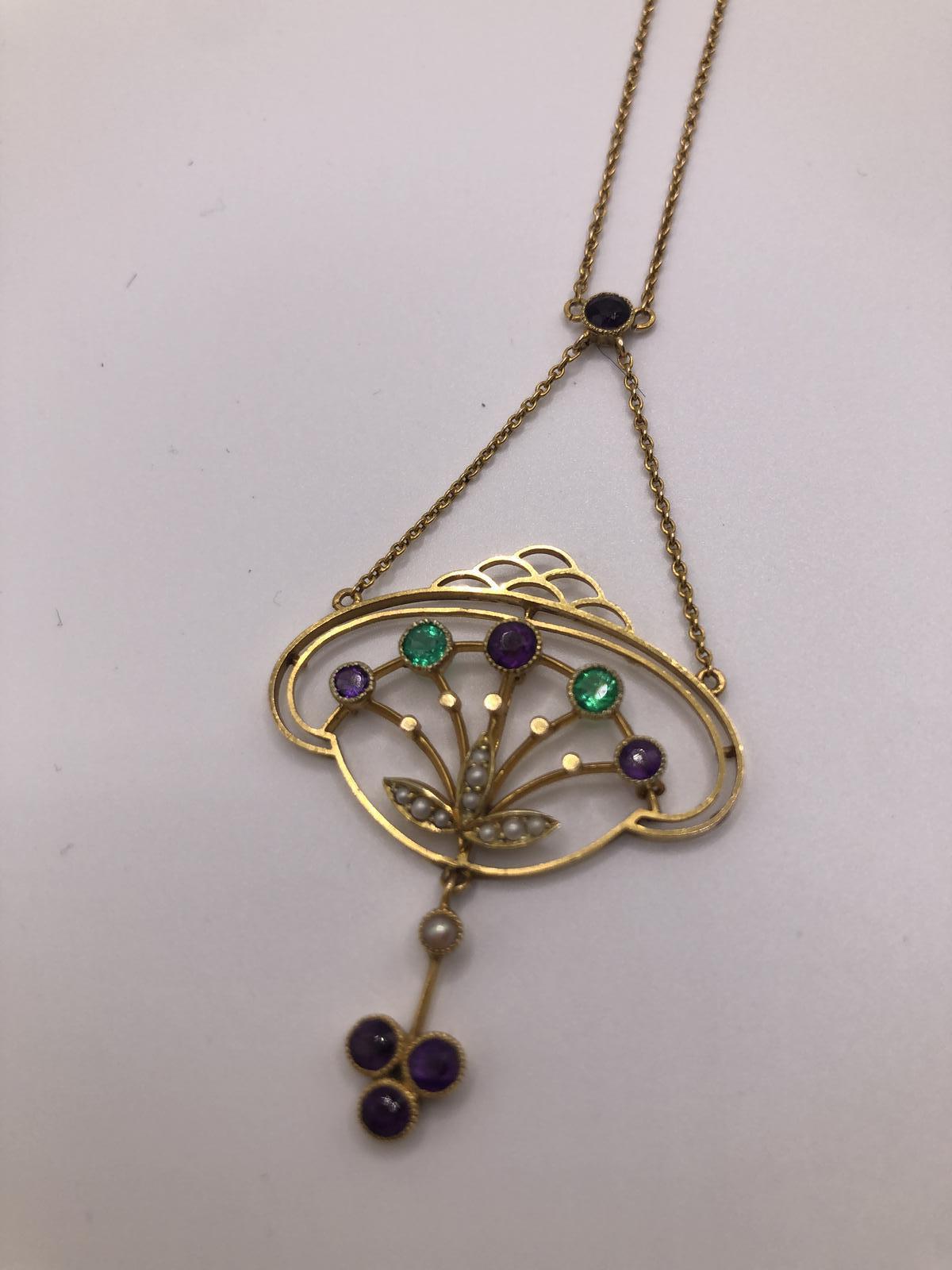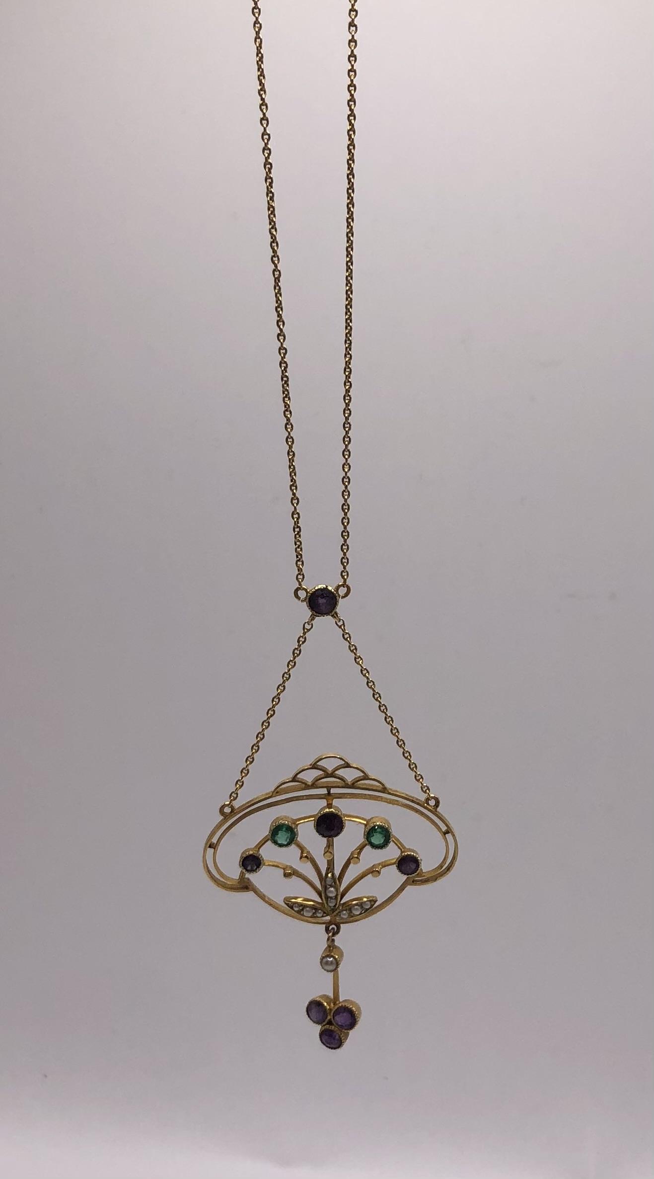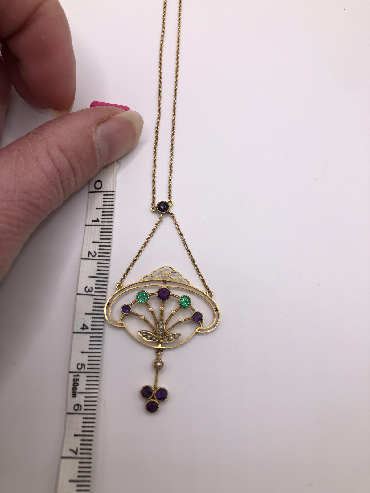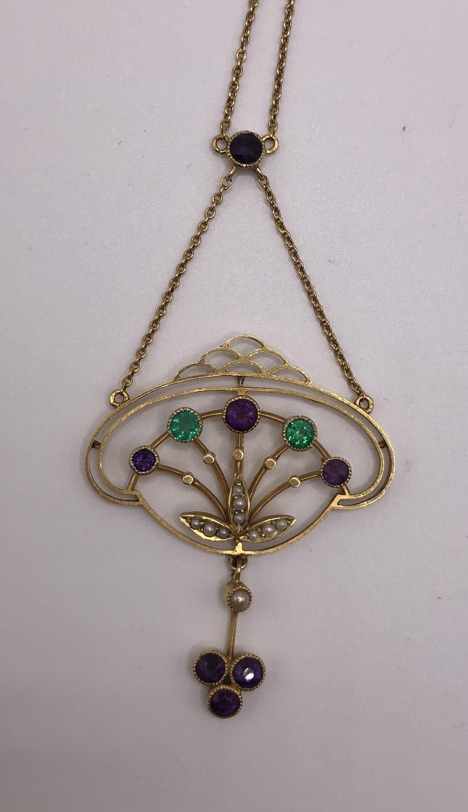 This is an exquisite antique necklace/necklet fashioned in 15ct gold in the colours of the Suffragette movement. nnThis is a very unusual piece that includes Emeralds rather than the more typical peridot (representing the Green for hope in the Suffragette movement).The deign is also particularly striking taking influence from both the fluidity of the Art Nouveau period but also has something of the burgeoning Deco movement about it.nnThe main body of the necklace contains two Emeralds of good colour and three amethyst in a flower spray design with the white seed pearls forming leaves.A dropper of a seed pearl and three amethysts adds more interest to this very elegant piece.The main chain is suspended from a single amethyst.nnThis will absolutely become an heirloom piece for generations, the quality and skill of the craftsmanship being absolutely superb. nnNote: This is worn very close to the neck in a necklet style.See photos for a measure of the chain. Marked 15ct.nnJewellery displaying the colours green, violet and white were often worn in support of the Women’s Social and Political Union (Wspu) which was at the forefront of the UK suffrage movement in the early 1900s. They adopted these three colours to highlight their key virtues: Violet for Royalty, White for Purity and Green for Hope, and also formed the phrase “Give Women Votes!