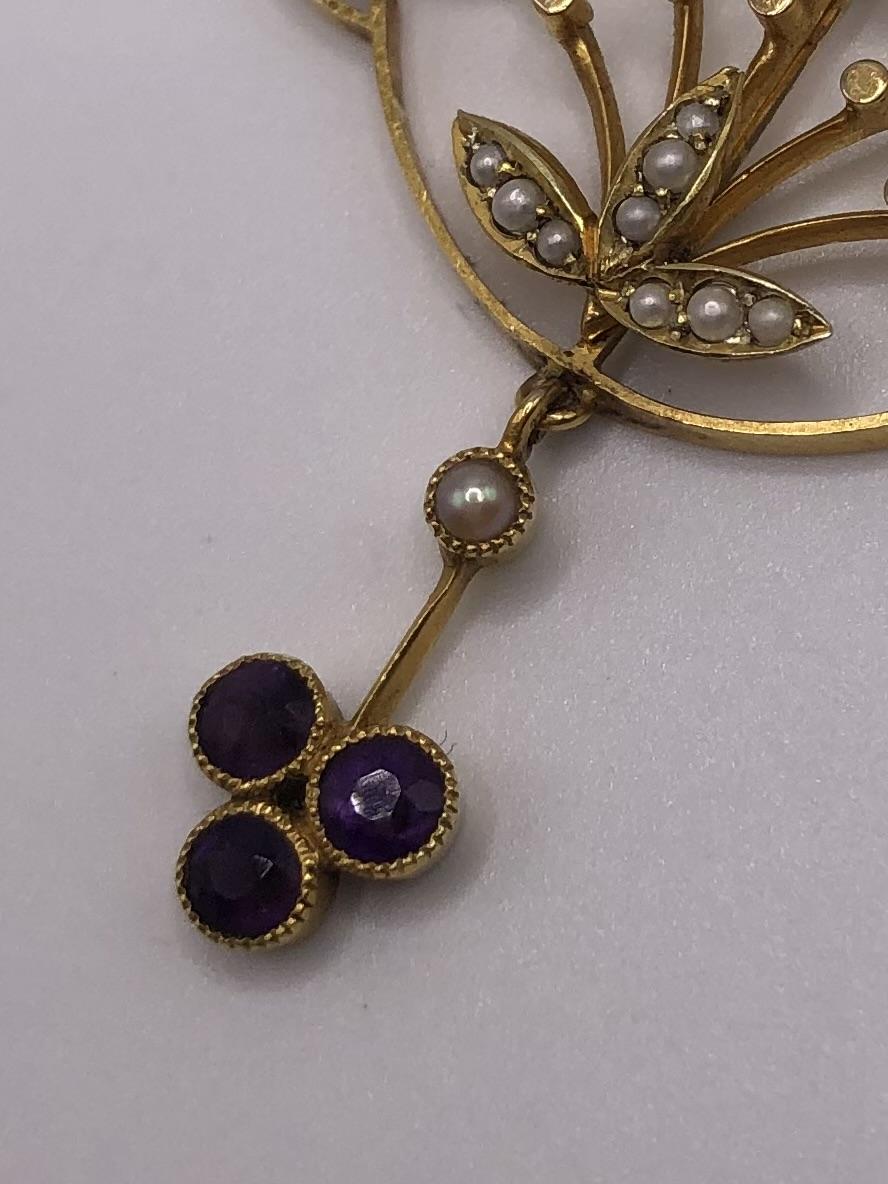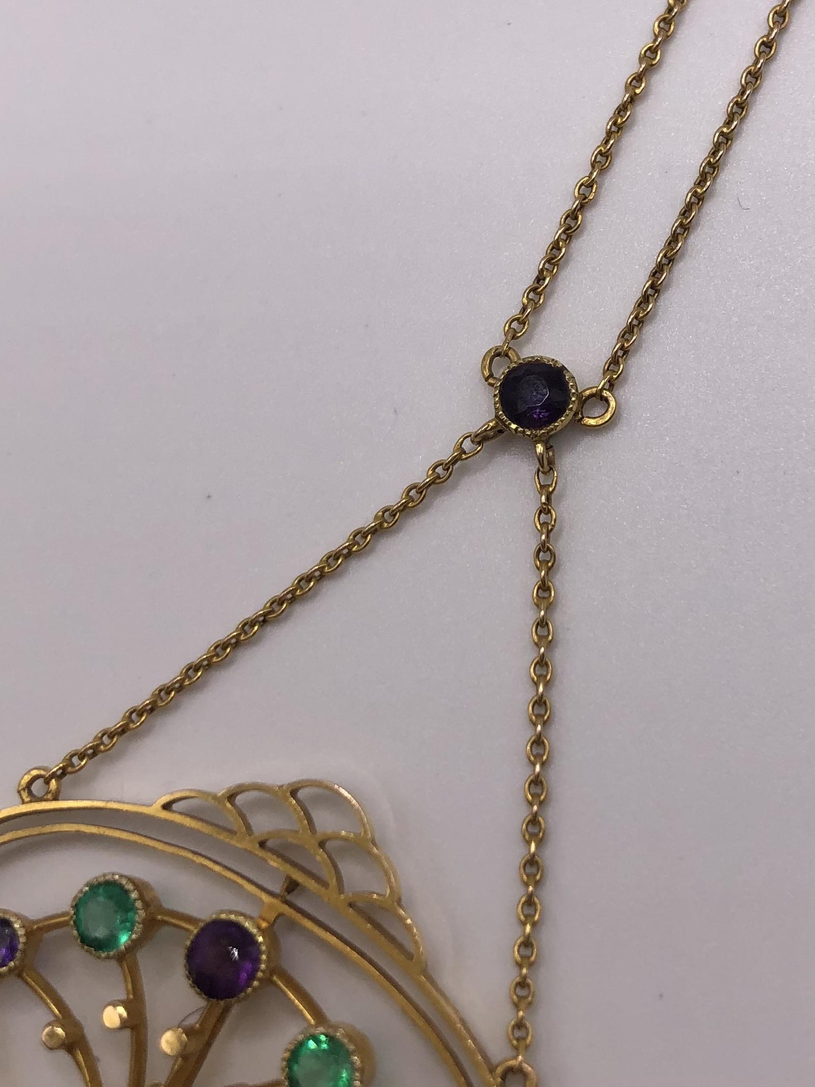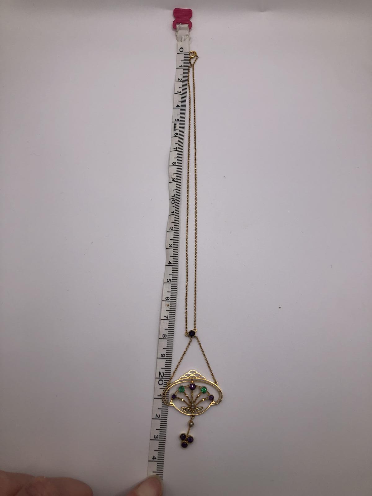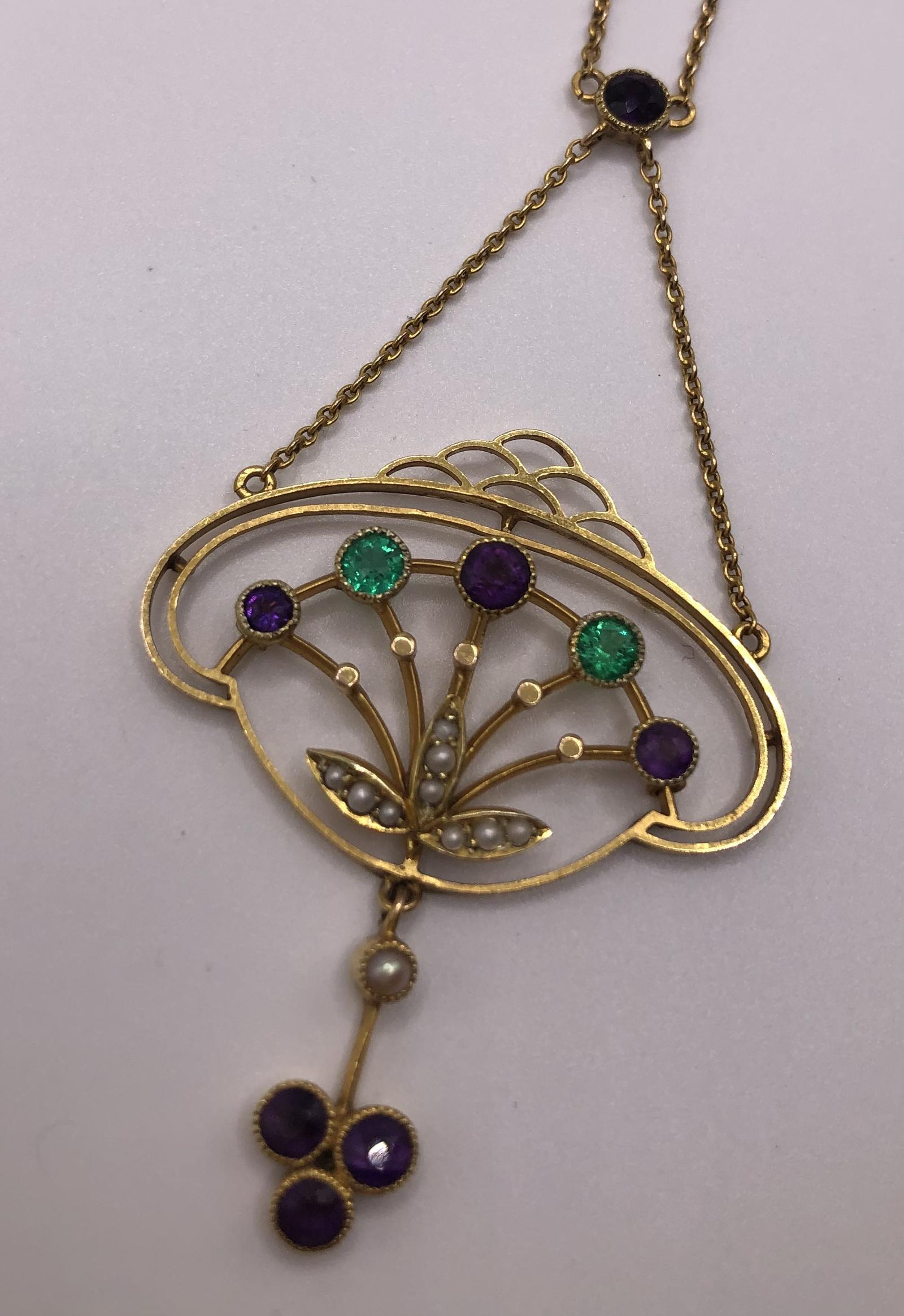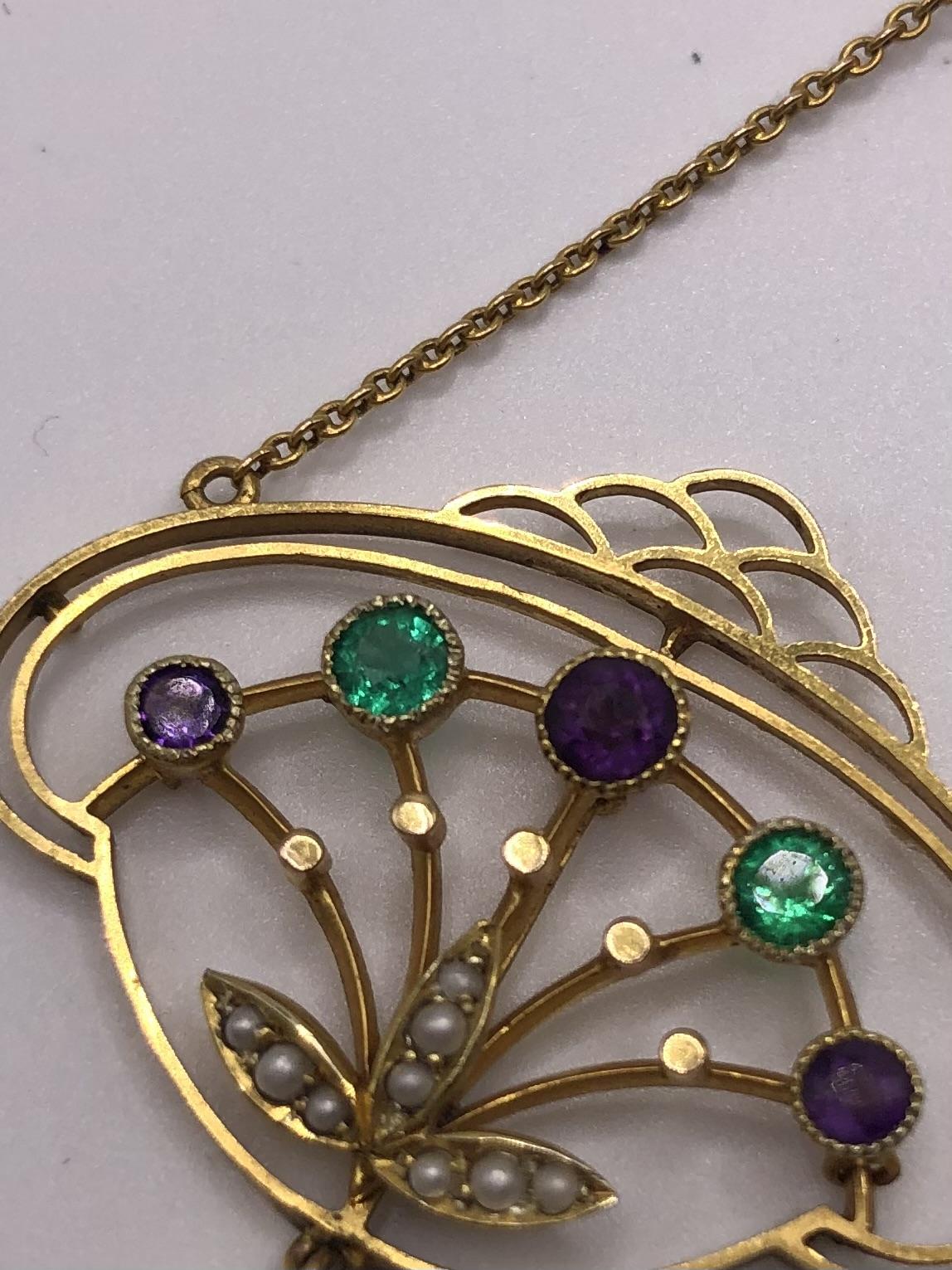 This is an exquisite antique necklace/necklet fashioned in 15ct gold in the colours of the Suffragette movement. nnThis is a very unusual piece that includes Emeralds rather than the more typical peridot (representing the Green for hope in the Suffragette movement).The deign is also particularly striking taking influence from both the fluidity of the Art Nouveau period but also has something of the burgeoning Deco movement about it.nnThe main body of the necklace contains two Emeralds of good colour and three amethyst in a flower spray design with the white seed pearls forming leaves.A dropper of a seed pearl and three amethysts adds more interest to this very elegant piece.The main chain is suspended from a single amethyst.nnThis will absolutely become an heirloom piece for generations, the quality and skill of the craftsmanship being absolutely superb. nnNote: This is worn very close to the neck in a necklet style.See photos for a measure of the chain. Marked 15ct.nnJewellery displaying the colours green, violet and white were often worn in support of the Women’s Social and Political Union (Wspu) which was at the forefront of the UK suffrage movement in the early 1900s. They adopted these three colours to highlight their key virtues: Violet for Royalty, White for Purity and Green for Hope, and also formed the phrase “Give Women Votes!