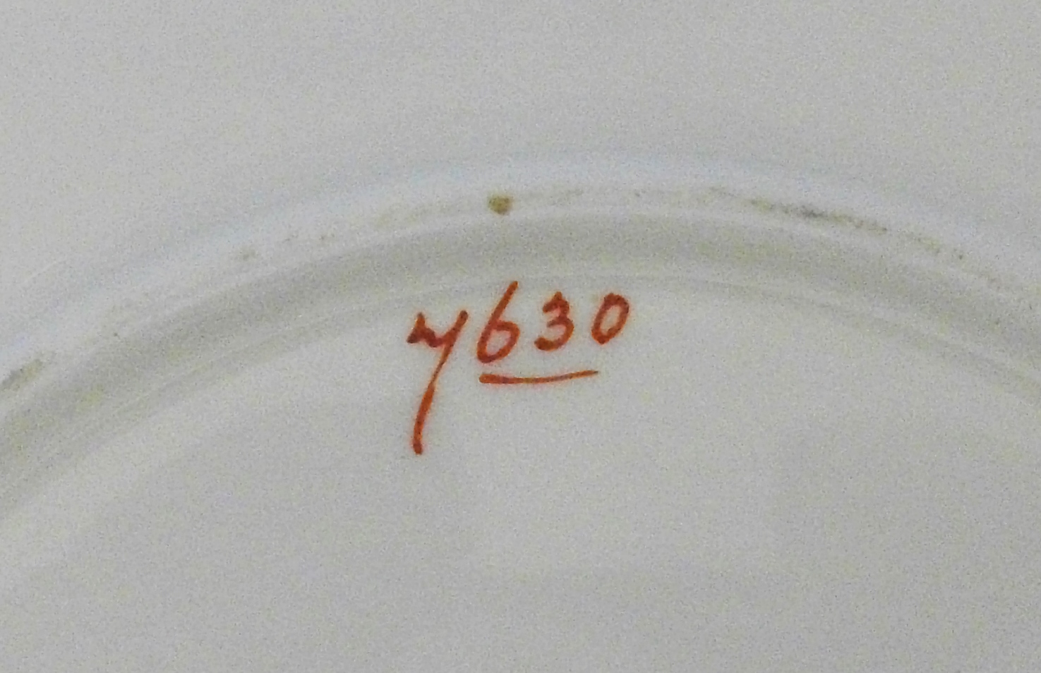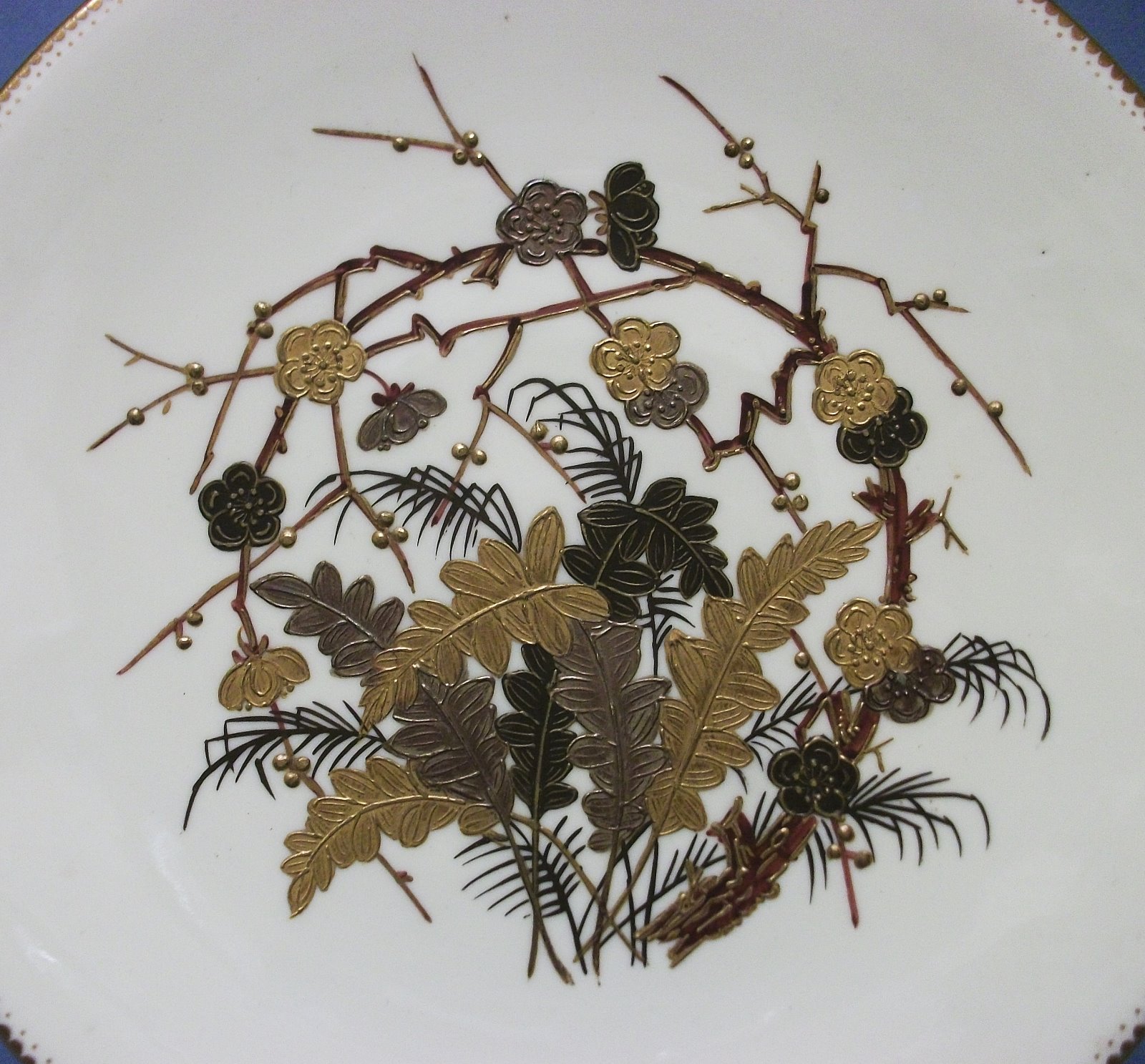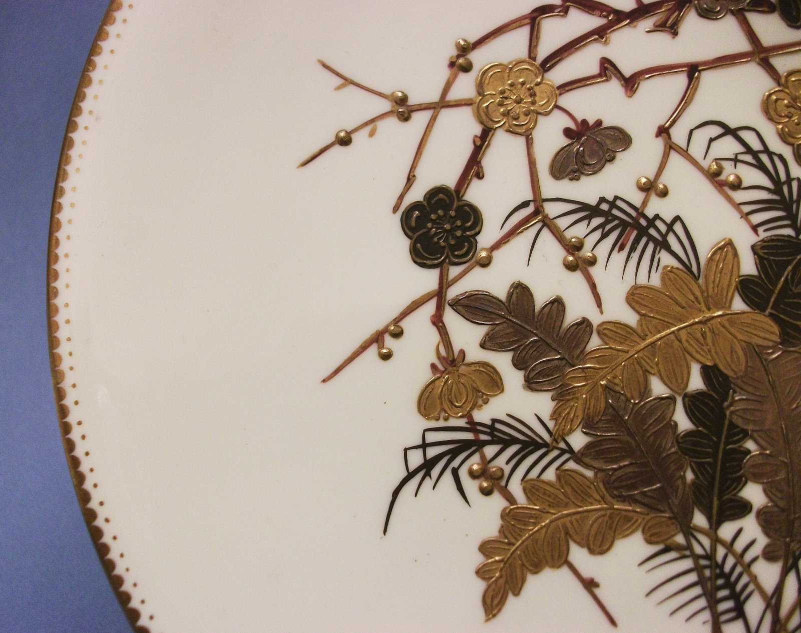 This is a striking bone china cabinet plate made at the Collingwood Brothers factory at Longton in Staffordshire, around 1890. Decorated with a pale cream ground overlaid with a design of stems, flowers and leaves in bronze, gilt and platinum, executed in the ‘raised gold’ technique. The base bears the hand-written pattern number, 7630, in red.