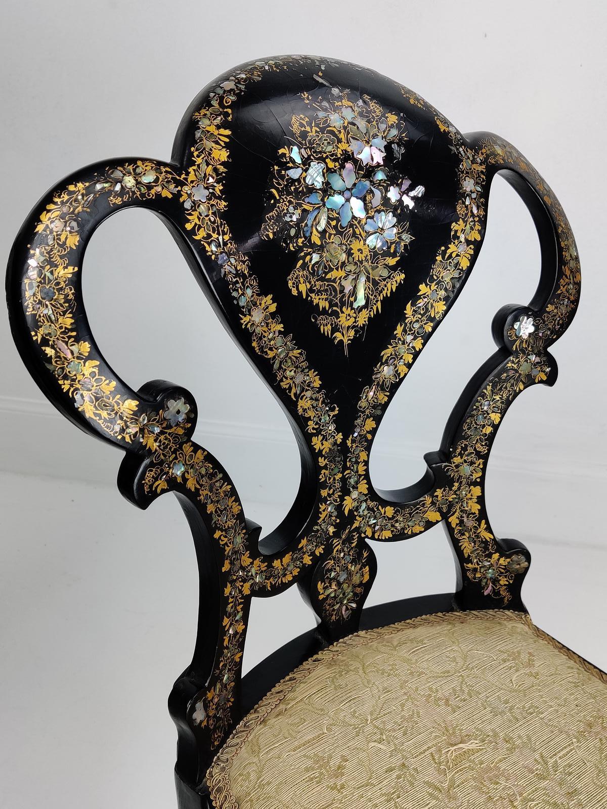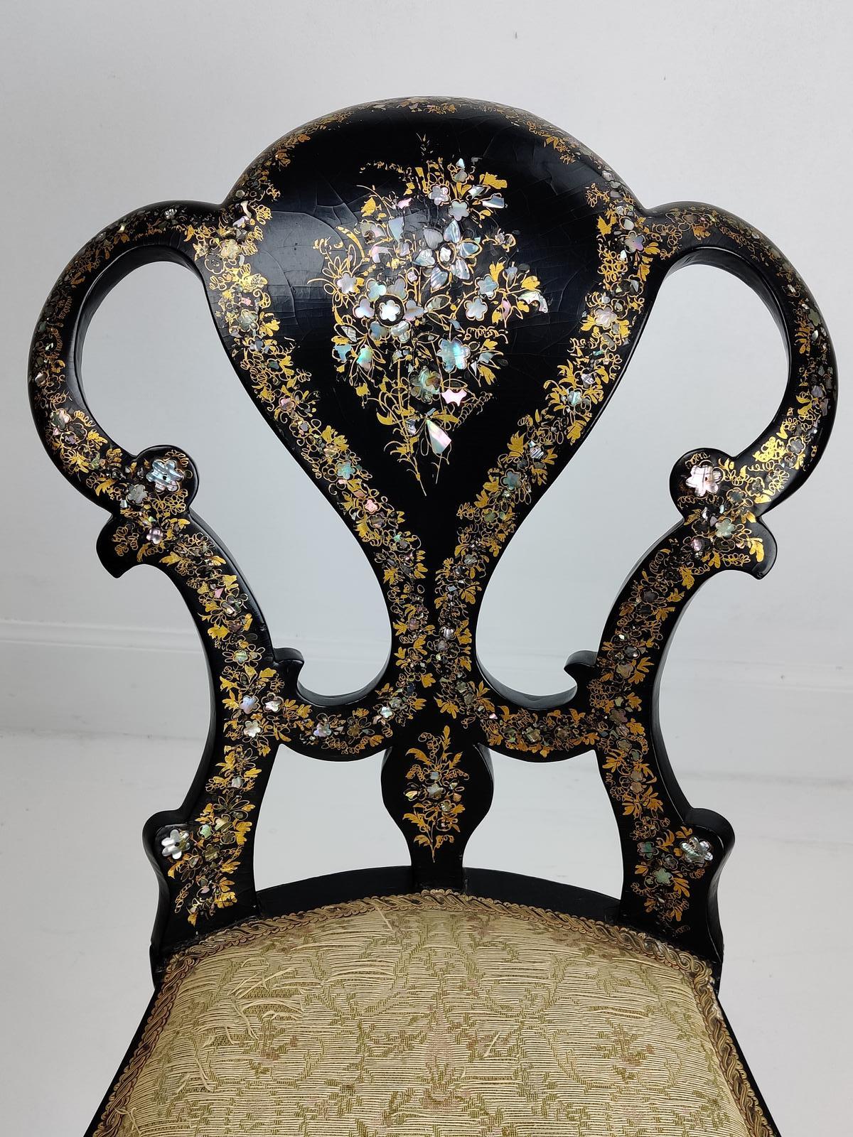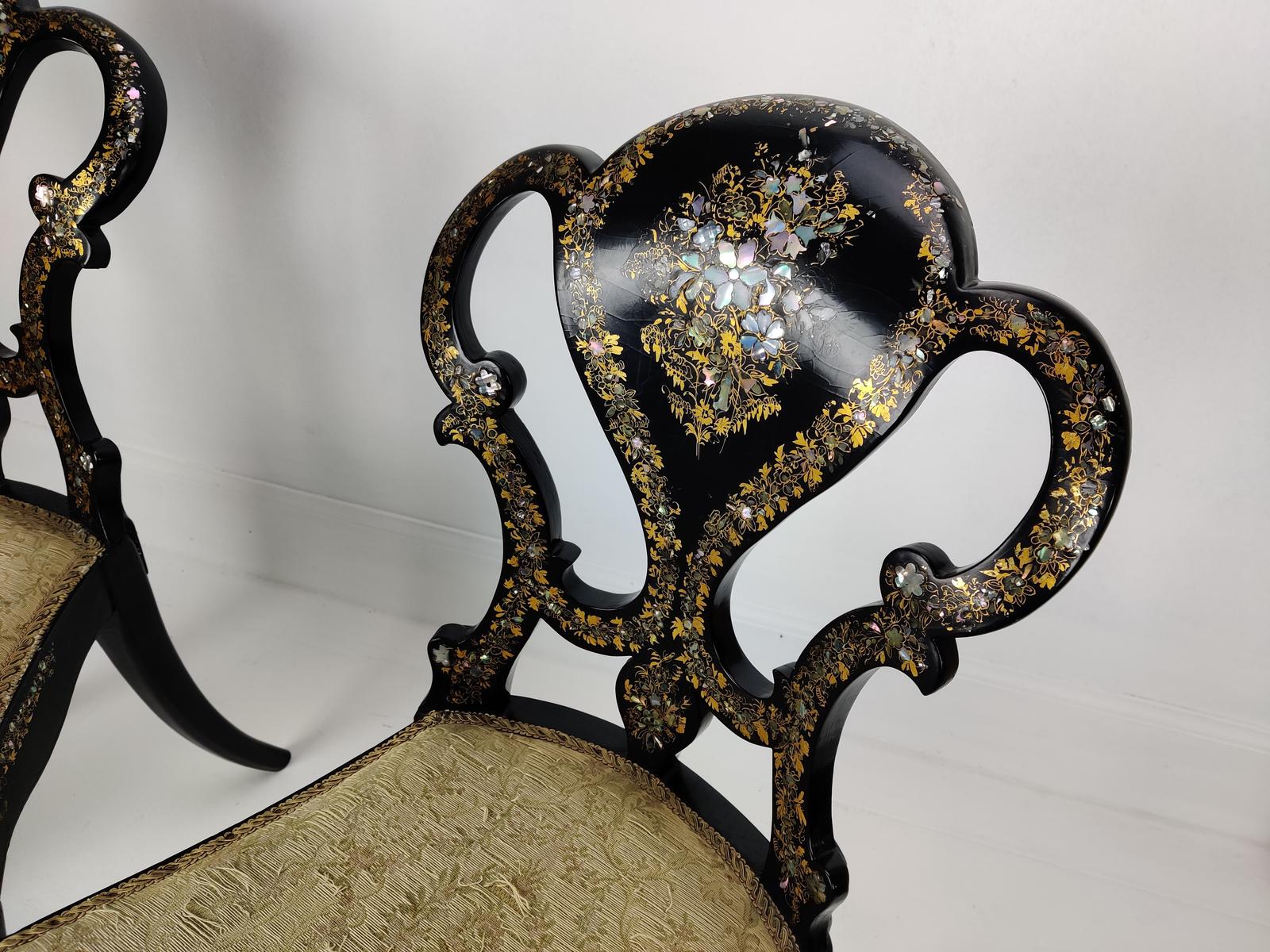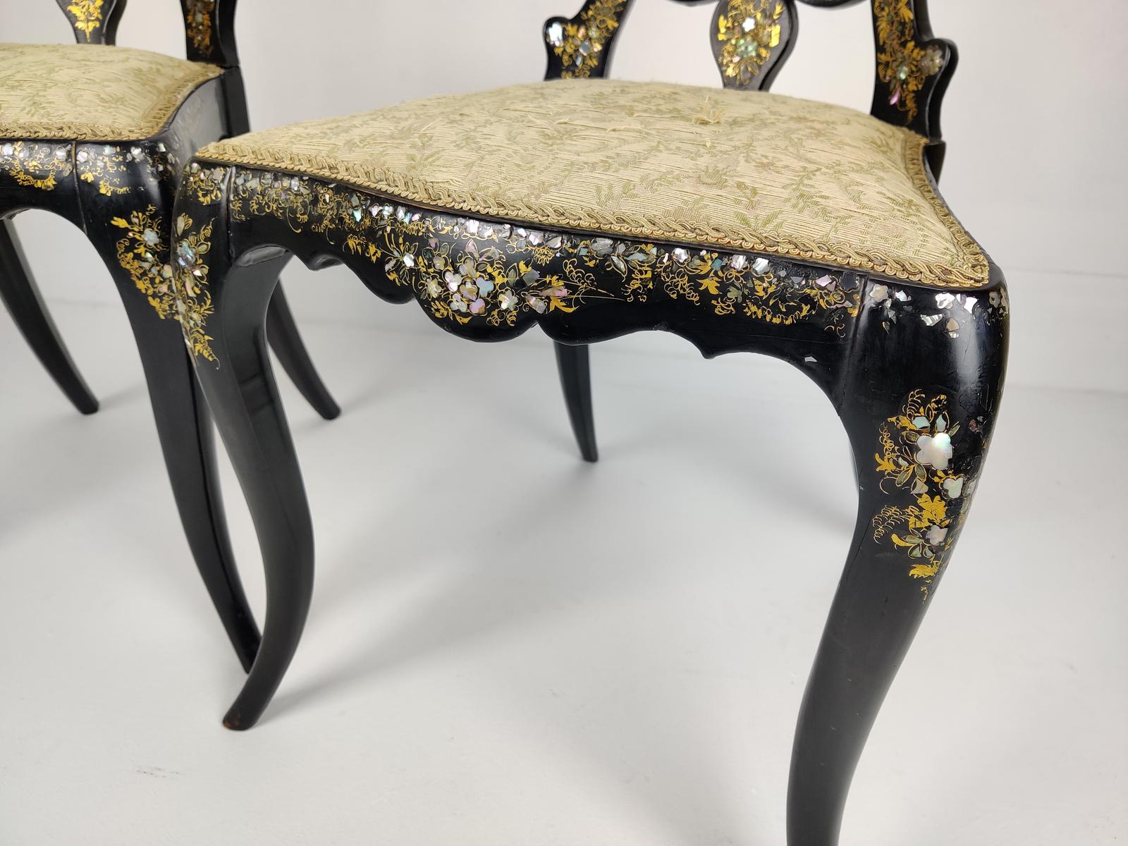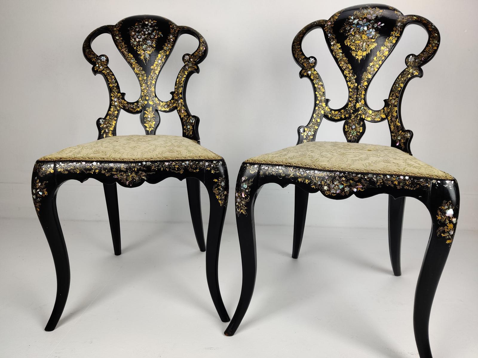 A truly stunning pair of 19th century ebonised chairs with abalone and gilt detailing. These chairs are remarkable in their detail and condition. Originally these would have been bergere cane which has been changed to upholstery. The back of each chair has iron blacksmith strengthening mounts. These chairs are sound and stable and can still be used but they would be better suited for display and for their artistic merit being delicate by design. They certainly make a statement.nnDimensions:nnHeight to top of back: 30.5