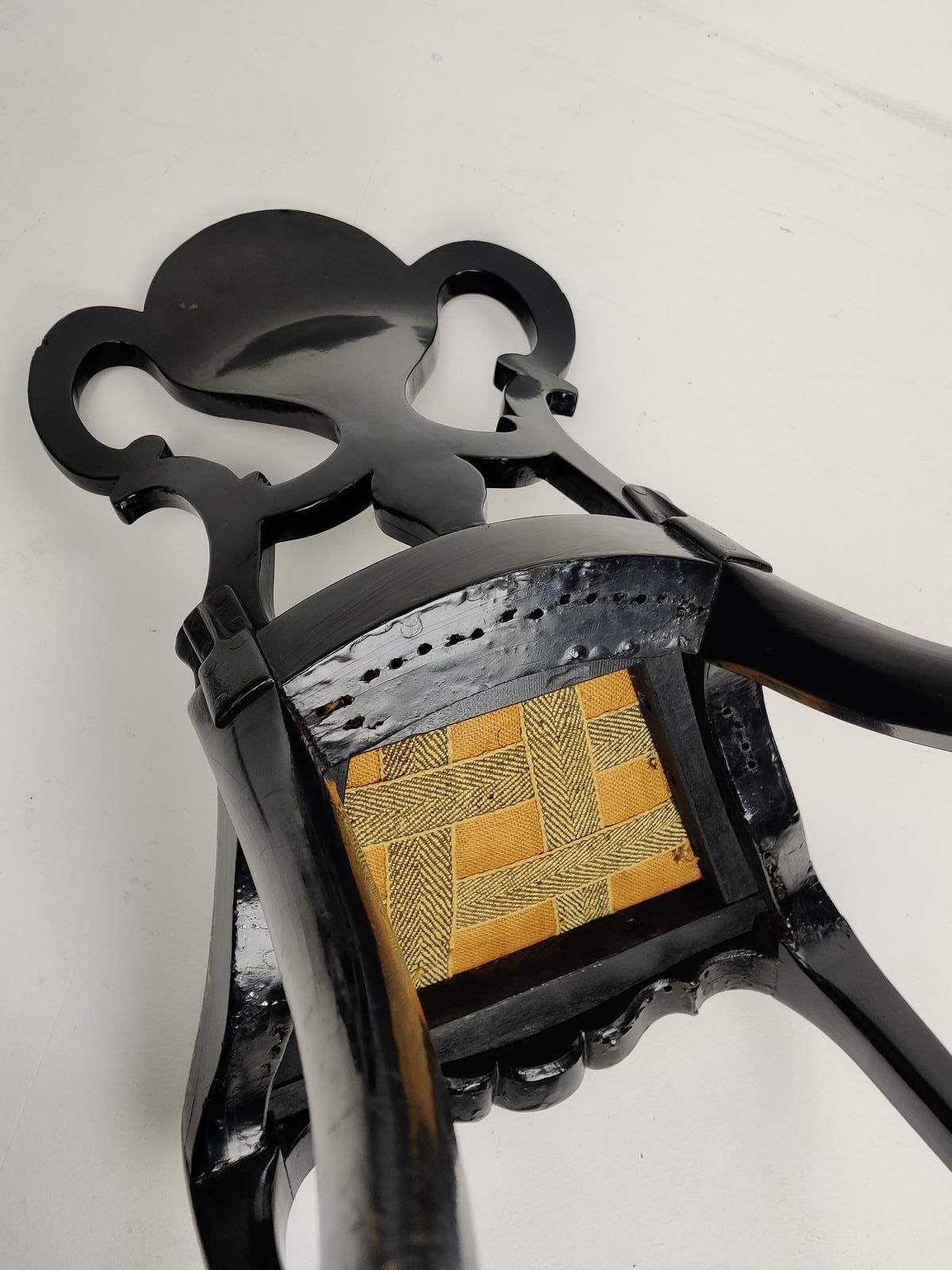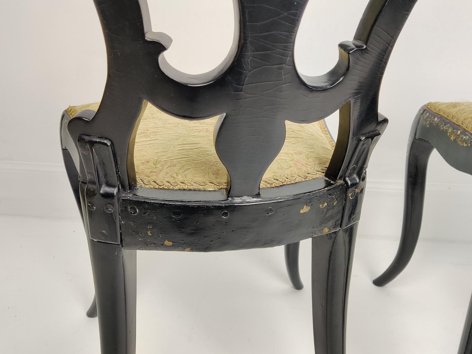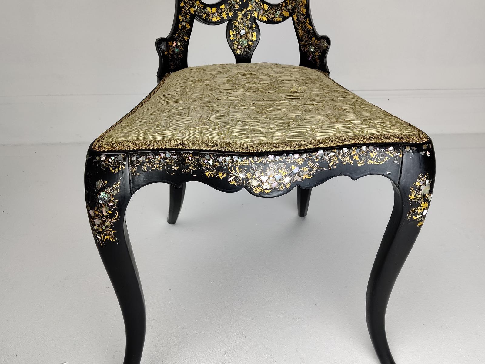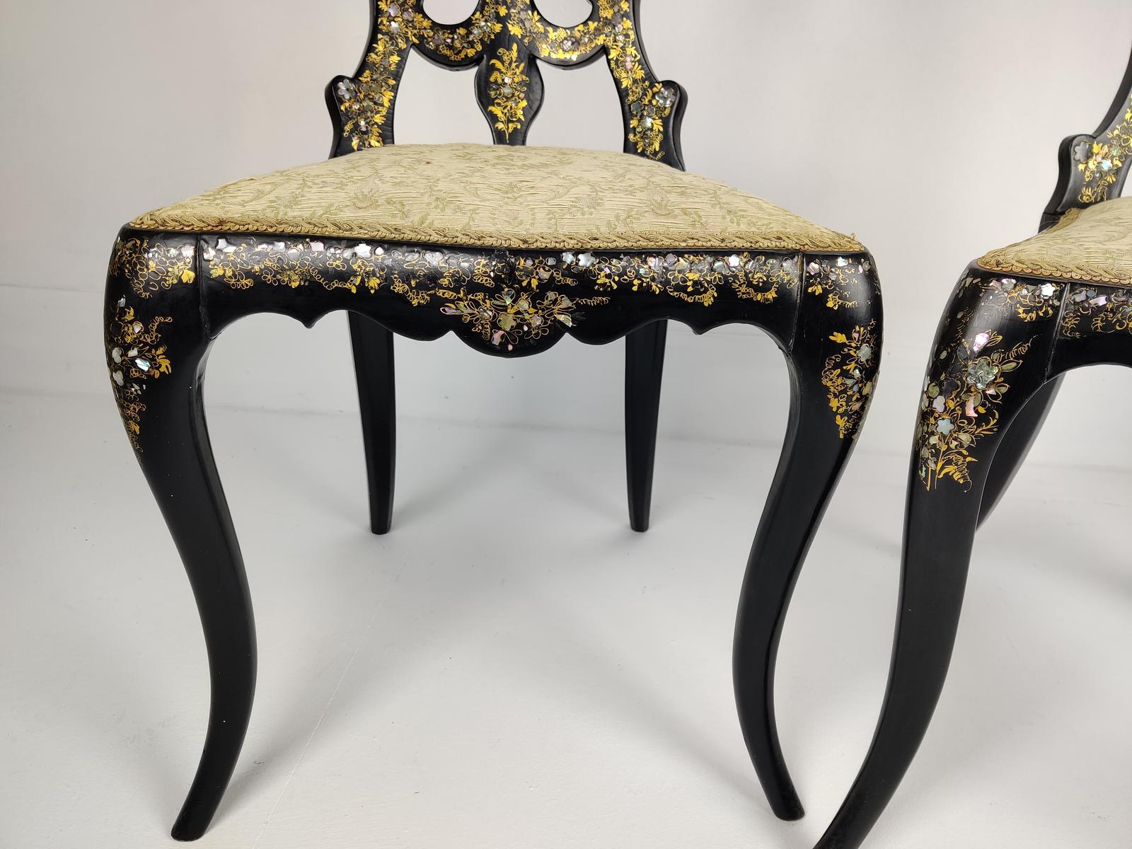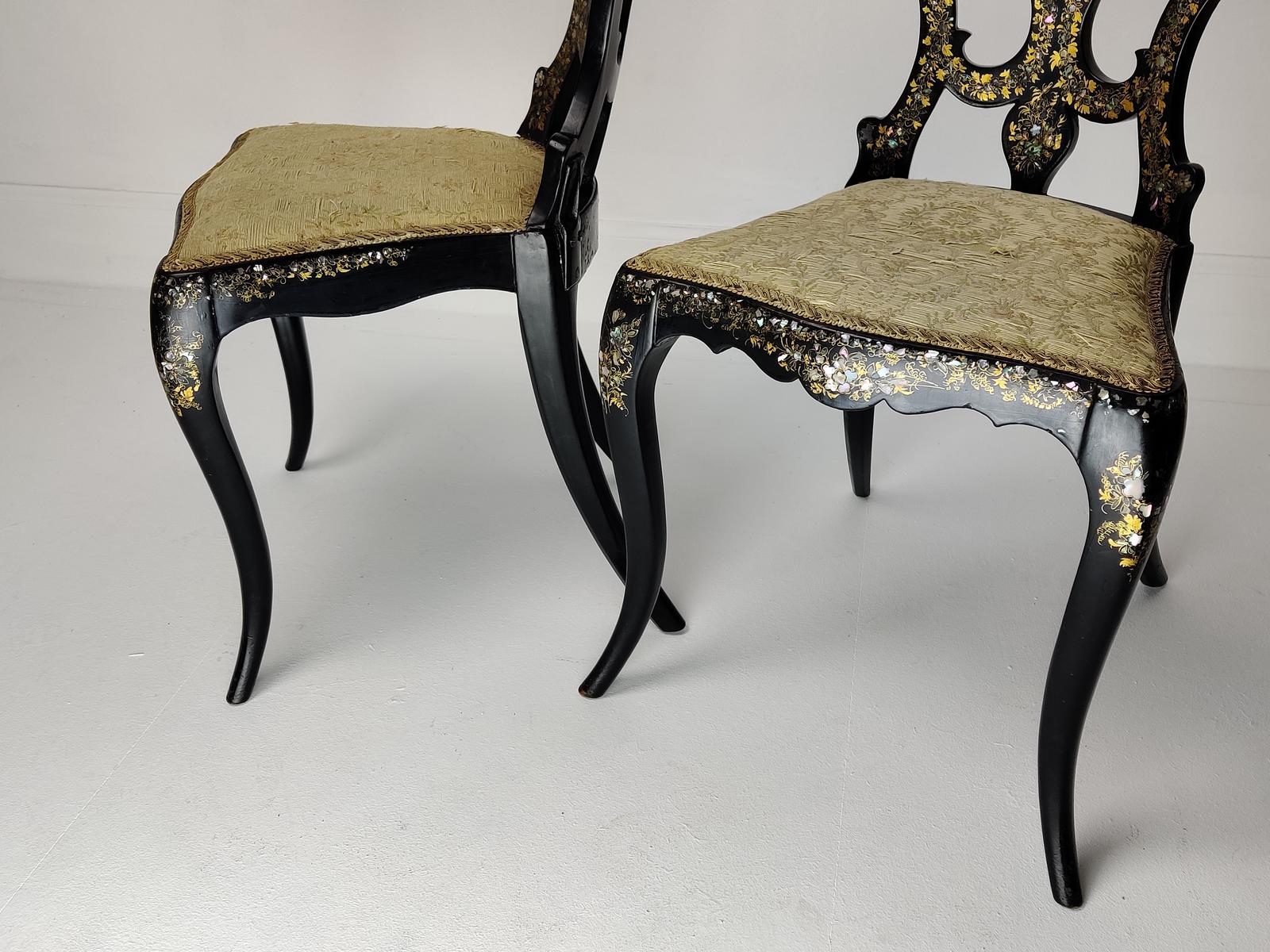 A truly stunning pair of 19th century ebonised chairs with abalone and gilt detailing. These chairs are remarkable in their detail and condition. Originally these would have been bergere cane which has been changed to upholstery. The back of each chair has iron blacksmith strengthening mounts. These chairs are sound and stable and can still be used but they would be better suited for display and for their artistic merit being delicate by design. They certainly make a statement.nnDimensions:nnHeight to top of back: 30.5