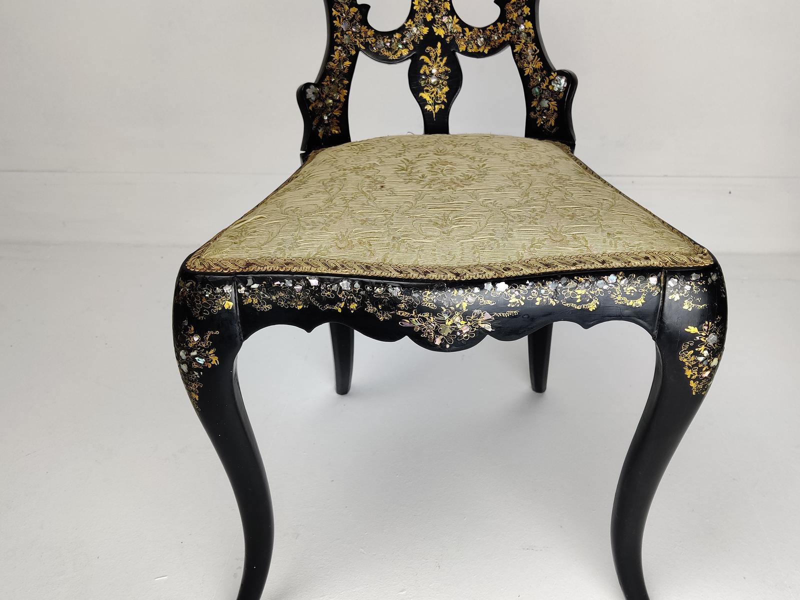 Sunnyside Antiques has clarified that the Decorative Ebonised Abalone & Gilt Chairs (LA397121) is genuinely of the period declared with the date/period of manufacture being 19th Century