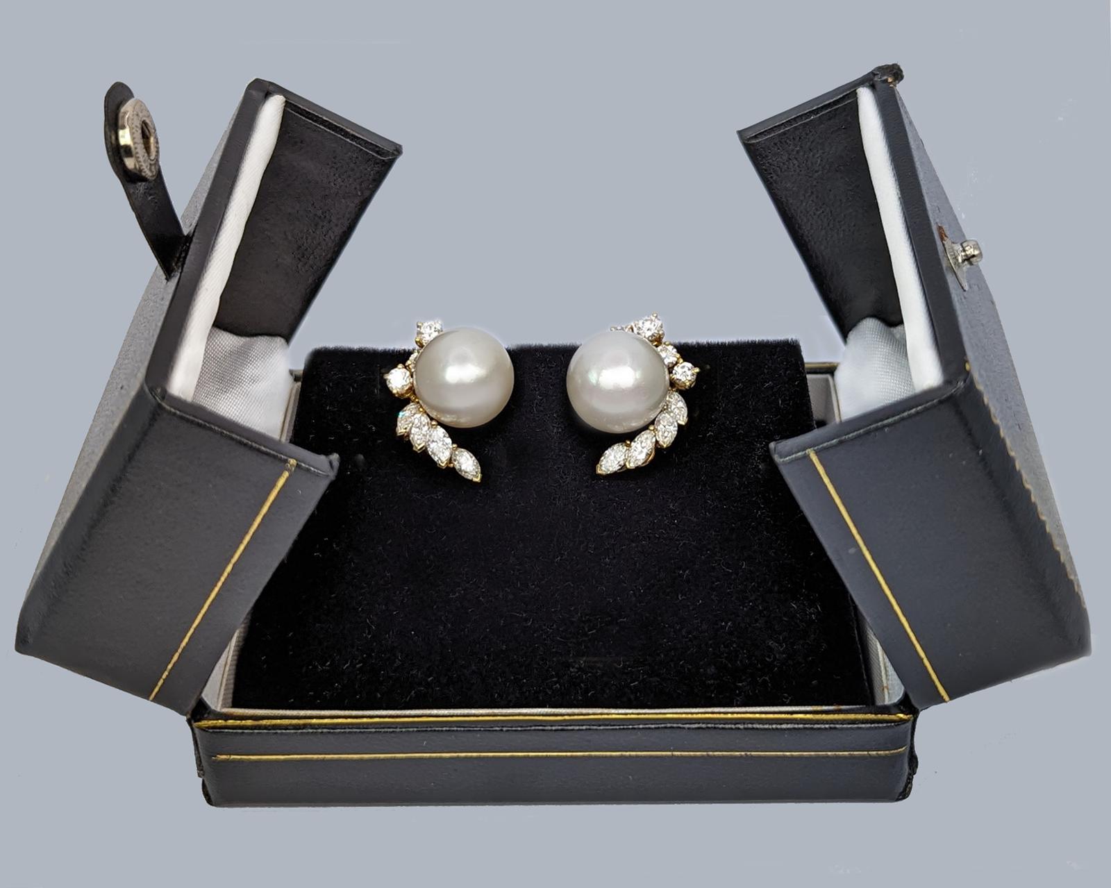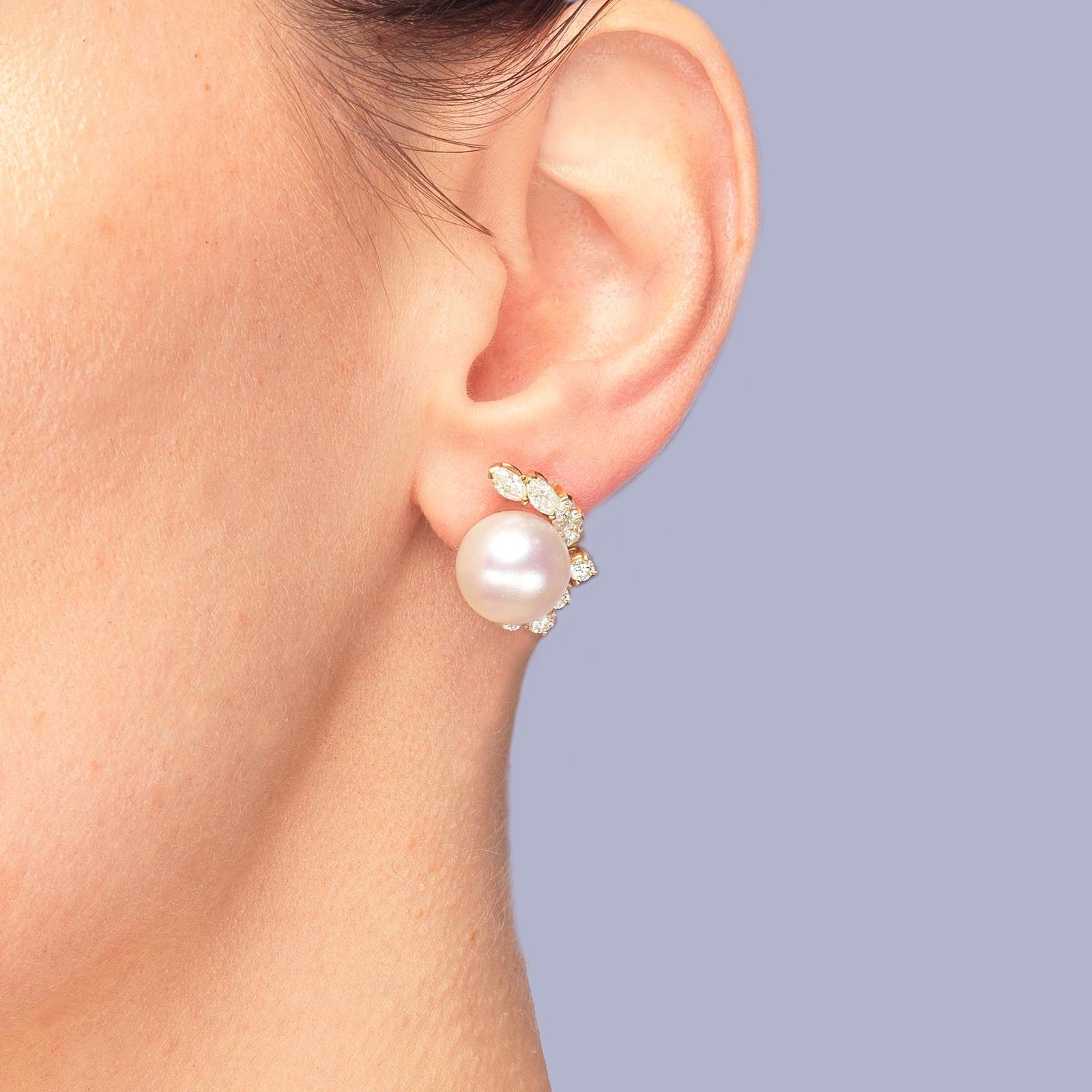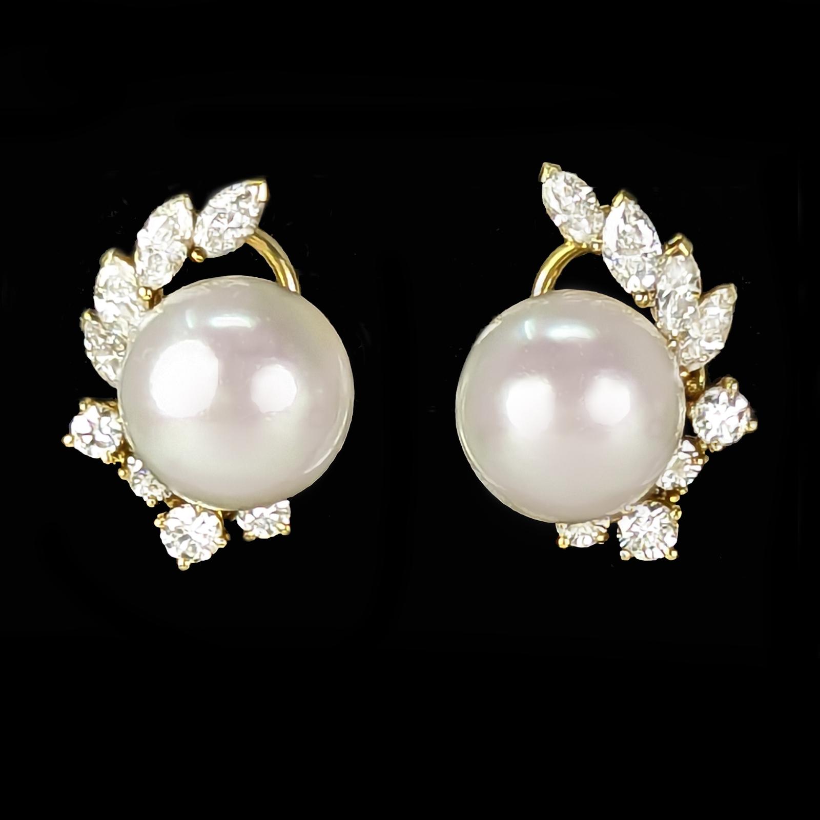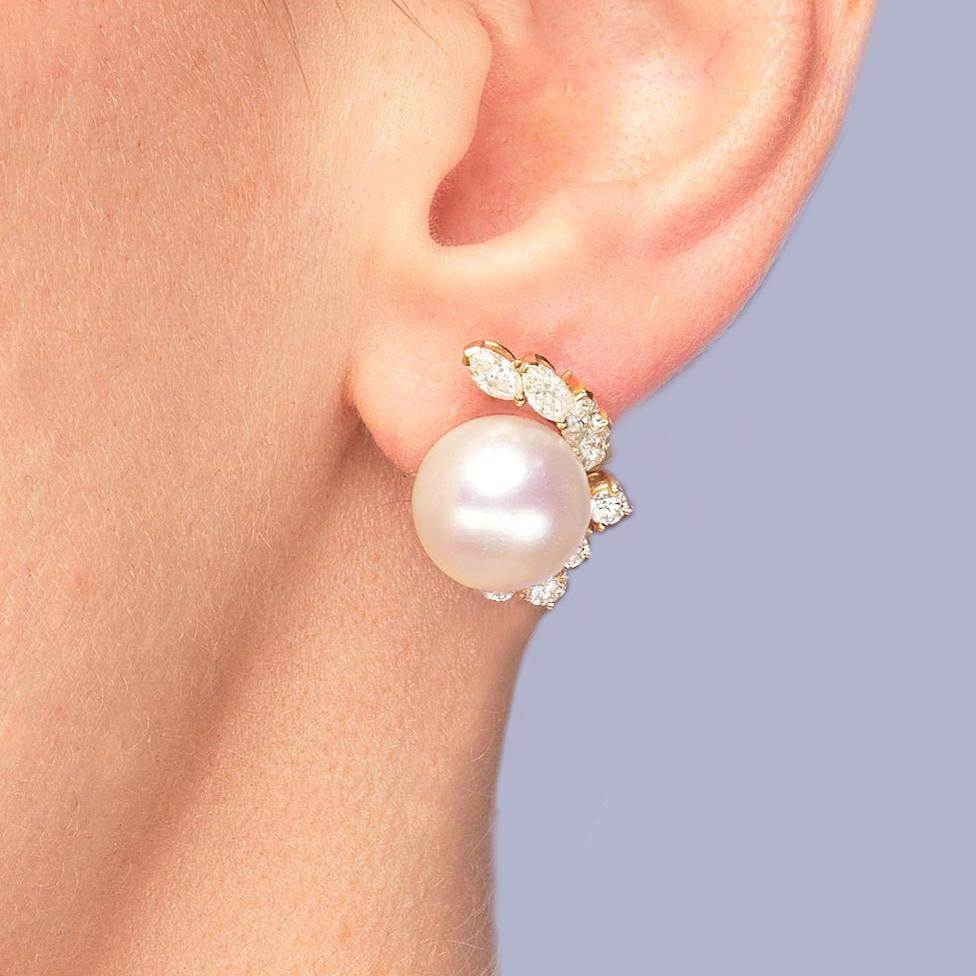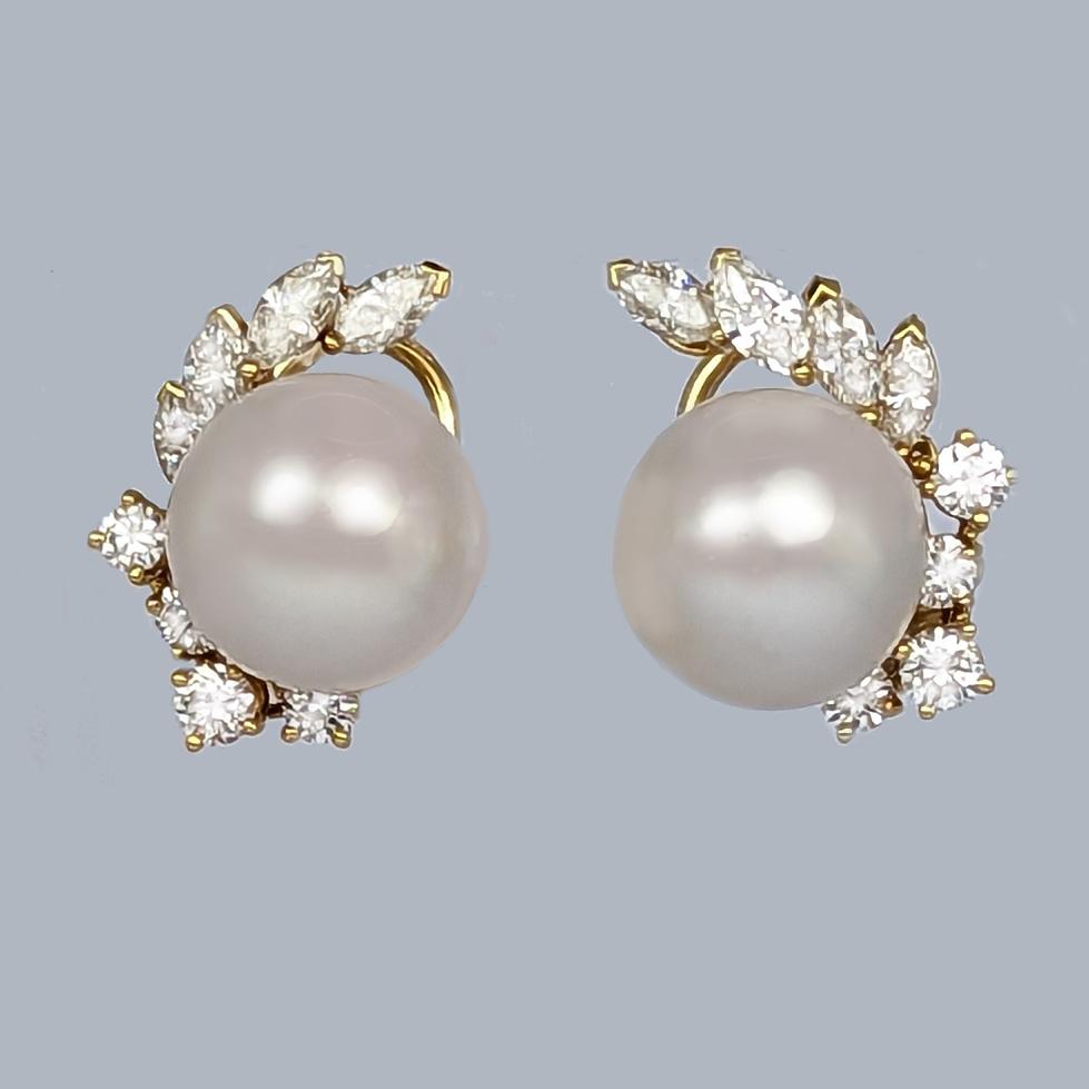 Crafted in 18ct yellow gold with splendid marquise and round brilliant cut diamonds Set with a beautiful silver rose pearl that is bordered by the sparkling diamonds in an elegant floral designnnFitted with clips and post fittings for pierced ears so they sit comfortable and securely on the earnnThese fabulous diamond pearl post earrings earrings look stunning when wornnnEarrings 21 cm (0.8″) longnEach earring with 4 marquise diamonds 4.5m – 4.2mm and 4 round brilliant cut diamonds 3mm – 2.5mmnTotal diamond weight circa 1.50 caratnColour H/ I clarity VSI / SInCultured Pearls 11.8 mmnPearls smooth and even coloured with a little typical minor pittingnFully hallmarked 18 ct Gold London 1981 and with makers mark CLdnThey weigh 11.8 gramsnClips and posts for pieced earsnExcellent conditionnThese diamond pearl post earrings come in the presentation box illustratednour ref: 23251nnPlease visit our website to view our full collection:nnhttps://www.the-chelsea-bijouterie.comn nShipping:n nWe post worldwide free of chargen nAll items are sent fully insured, tracked and signed for.n nTerms of Sale:n nWe are totally committed to customer satisfaction. We take great care to give accurate and detailed descriptions accompanied by high definition photos. If you are not entirely happy with your purchase we will gladly offer you a full refund. Please return within 14 days of receipt of your purchase.n nAbout Us:n nWe have years of knowledge and experience in dealing in antiques and antique & designer jewellery. We are committed to giving exceptional customer service. The Chelsea Bijouterie aims to offer beautiful and interesting items at affordable prices.