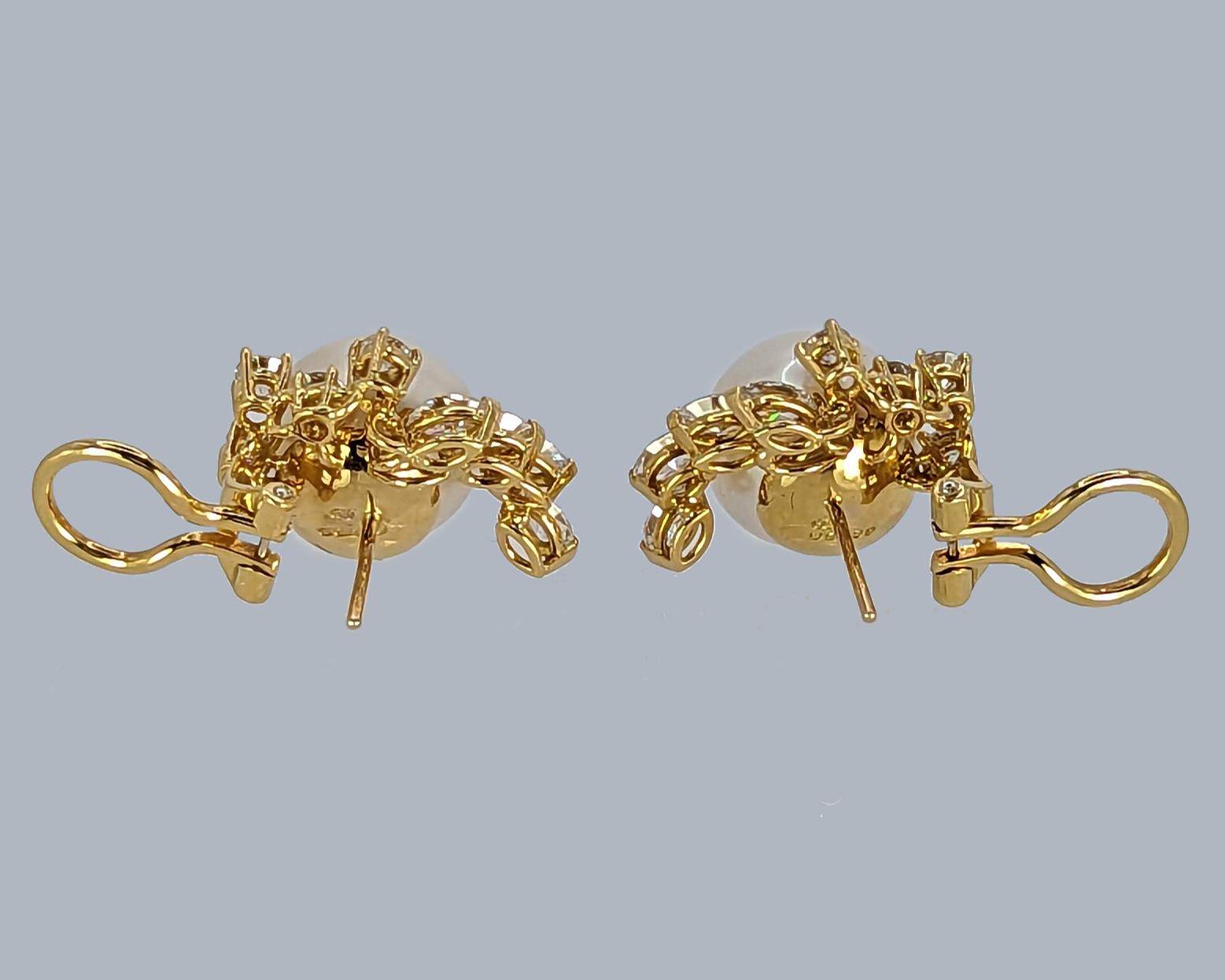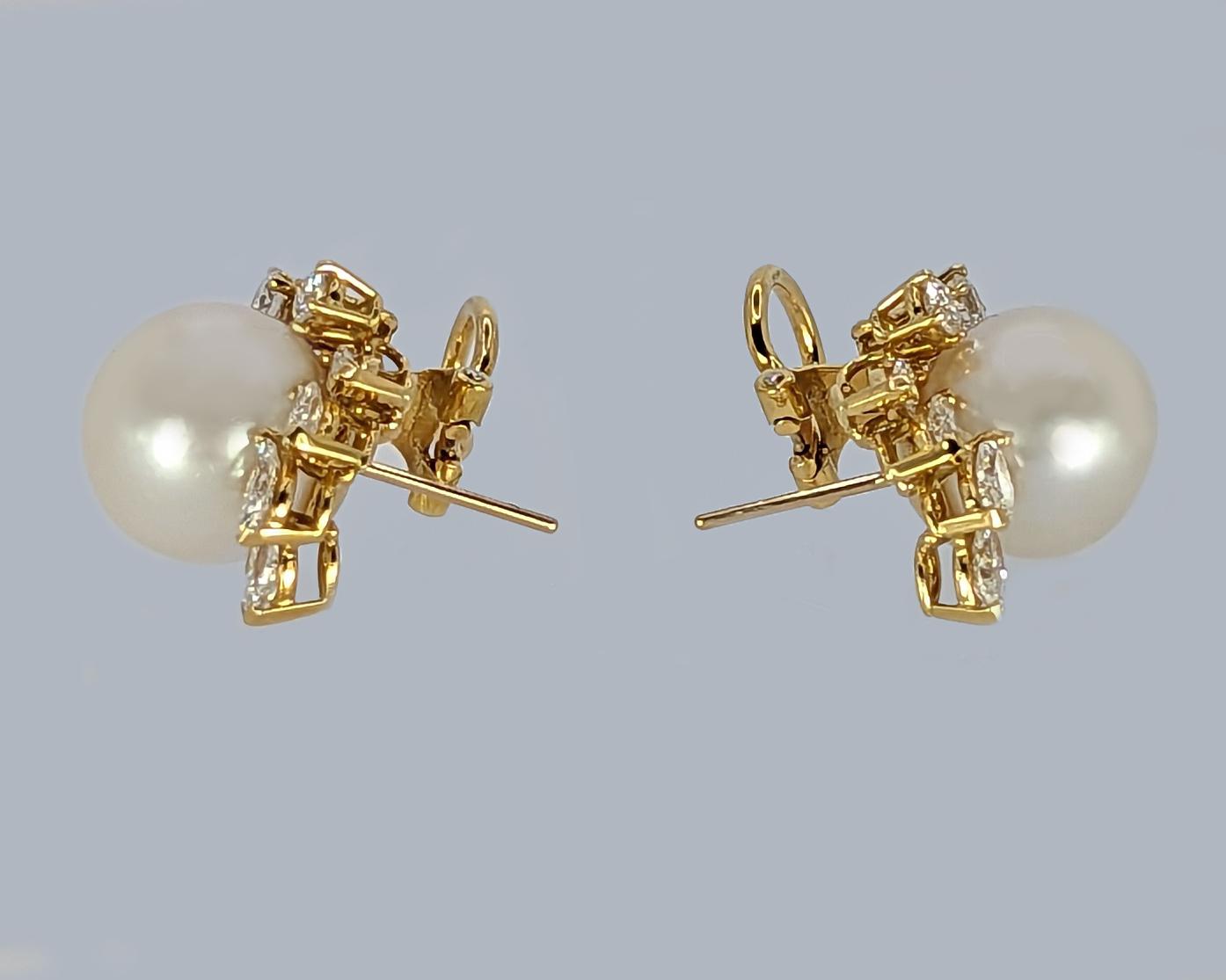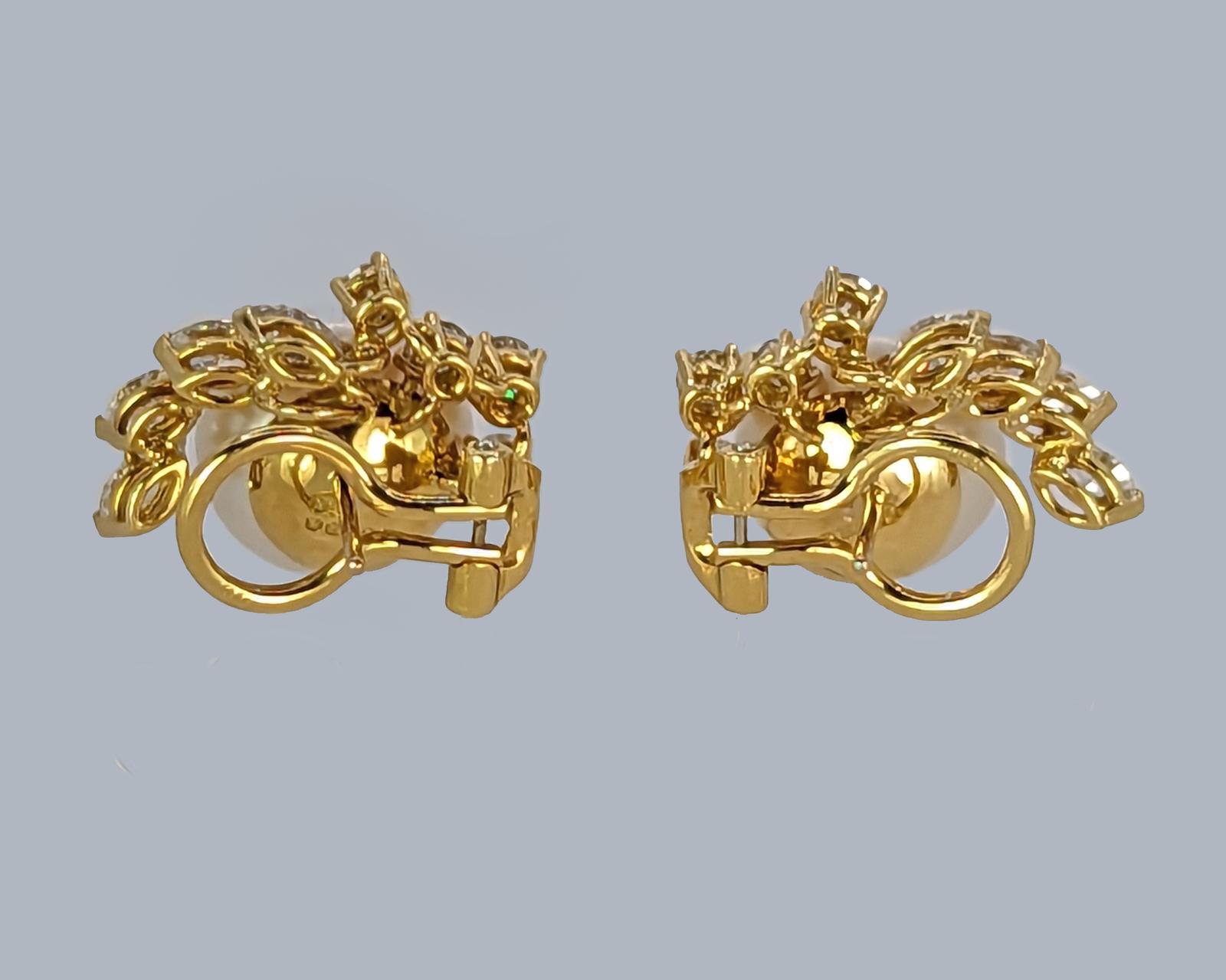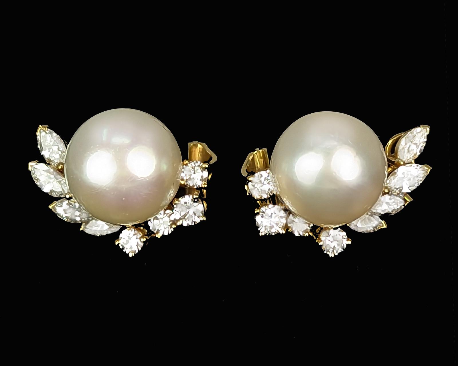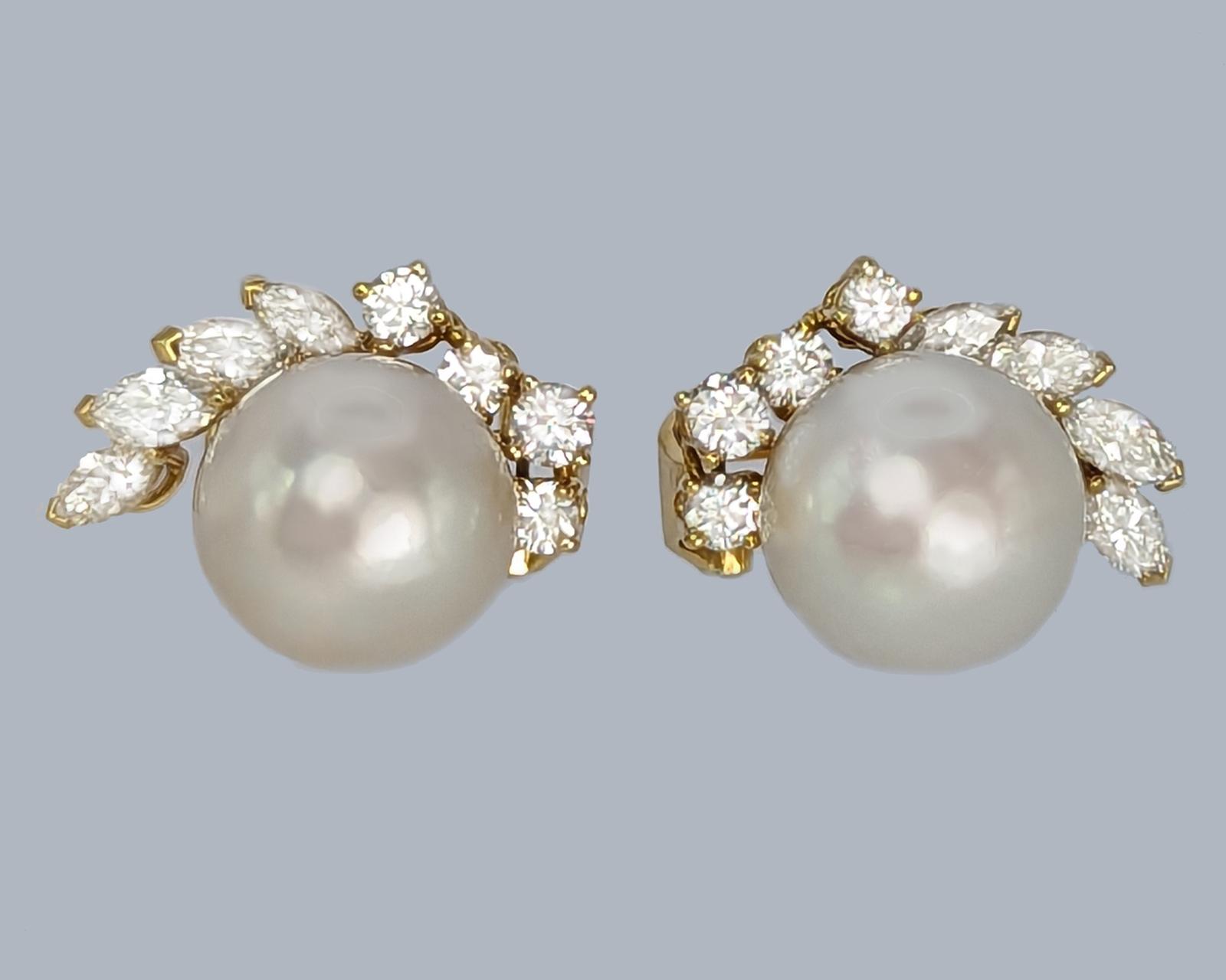 Crafted in 18ct yellow gold with splendid marquise and round brilliant cut diamonds Set with a beautiful silver rose pearl that is bordered by the sparkling diamonds in an elegant floral designnnFitted with clips and post fittings for pierced ears so they sit comfortable and securely on the earnnThese fabulous diamond pearl post earrings earrings look stunning when wornnnEarrings 21 cm (0.8″) longnEach earring with 4 marquise diamonds 4.5m – 4.2mm and 4 round brilliant cut diamonds 3mm – 2.5mmnTotal diamond weight circa 1.50 caratnColour H/ I clarity VSI / SInCultured Pearls 11.8 mmnPearls smooth and even coloured with a little typical minor pittingnFully hallmarked 18 ct Gold London 1981 and with makers mark CLdnThey weigh 11.8 gramsnClips and posts for pieced earsnExcellent conditionnThese diamond pearl post earrings come in the presentation box illustratednour ref: 23251nnPlease visit our website to view our full collection:nnhttps://www.the-chelsea-bijouterie.comn nShipping:n nWe post worldwide free of chargen nAll items are sent fully insured, tracked and signed for.n nTerms of Sale:n nWe are totally committed to customer satisfaction. We take great care to give accurate and detailed descriptions accompanied by high definition photos. If you are not entirely happy with your purchase we will gladly offer you a full refund. Please return within 14 days of receipt of your purchase.n nAbout Us:n nWe have years of knowledge and experience in dealing in antiques and antique & designer jewellery. We are committed to giving exceptional customer service. The Chelsea Bijouterie aims to offer beautiful and interesting items at affordable prices.