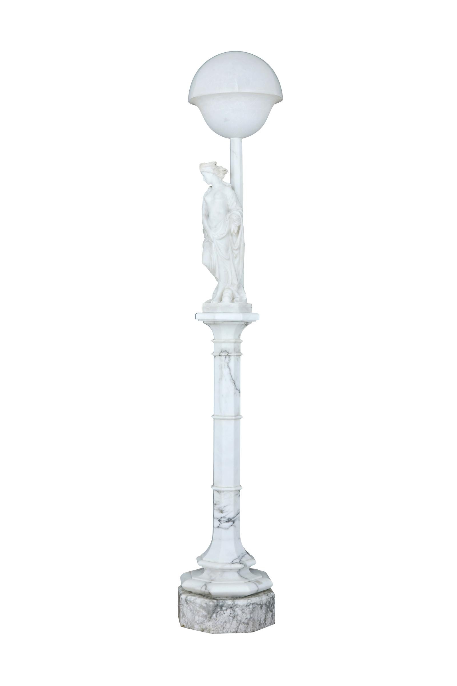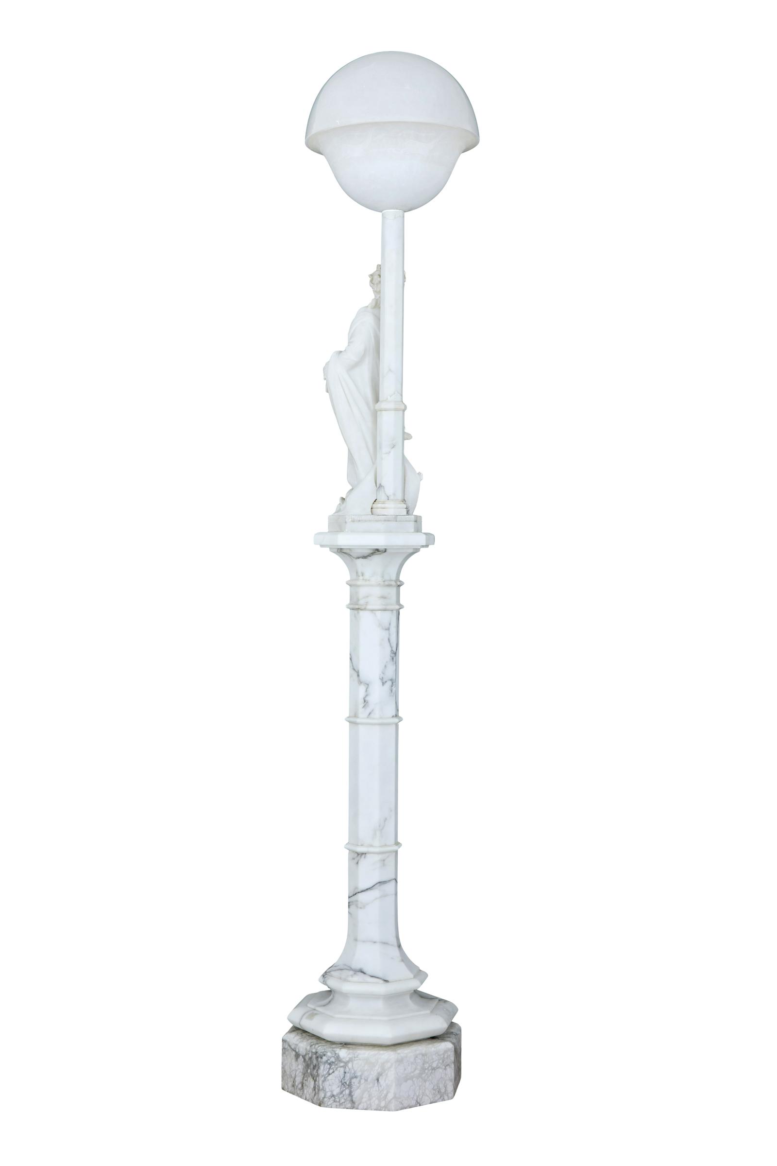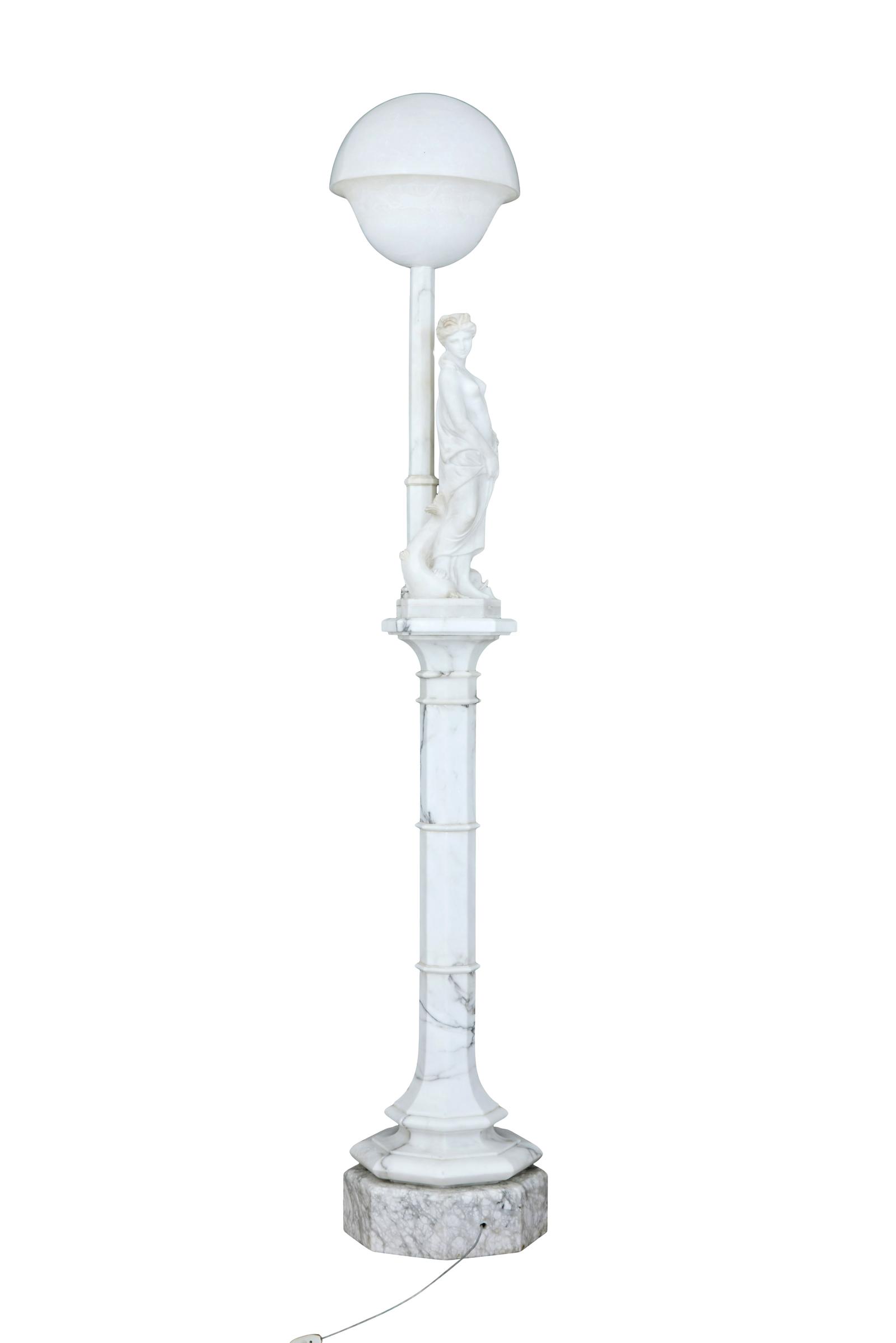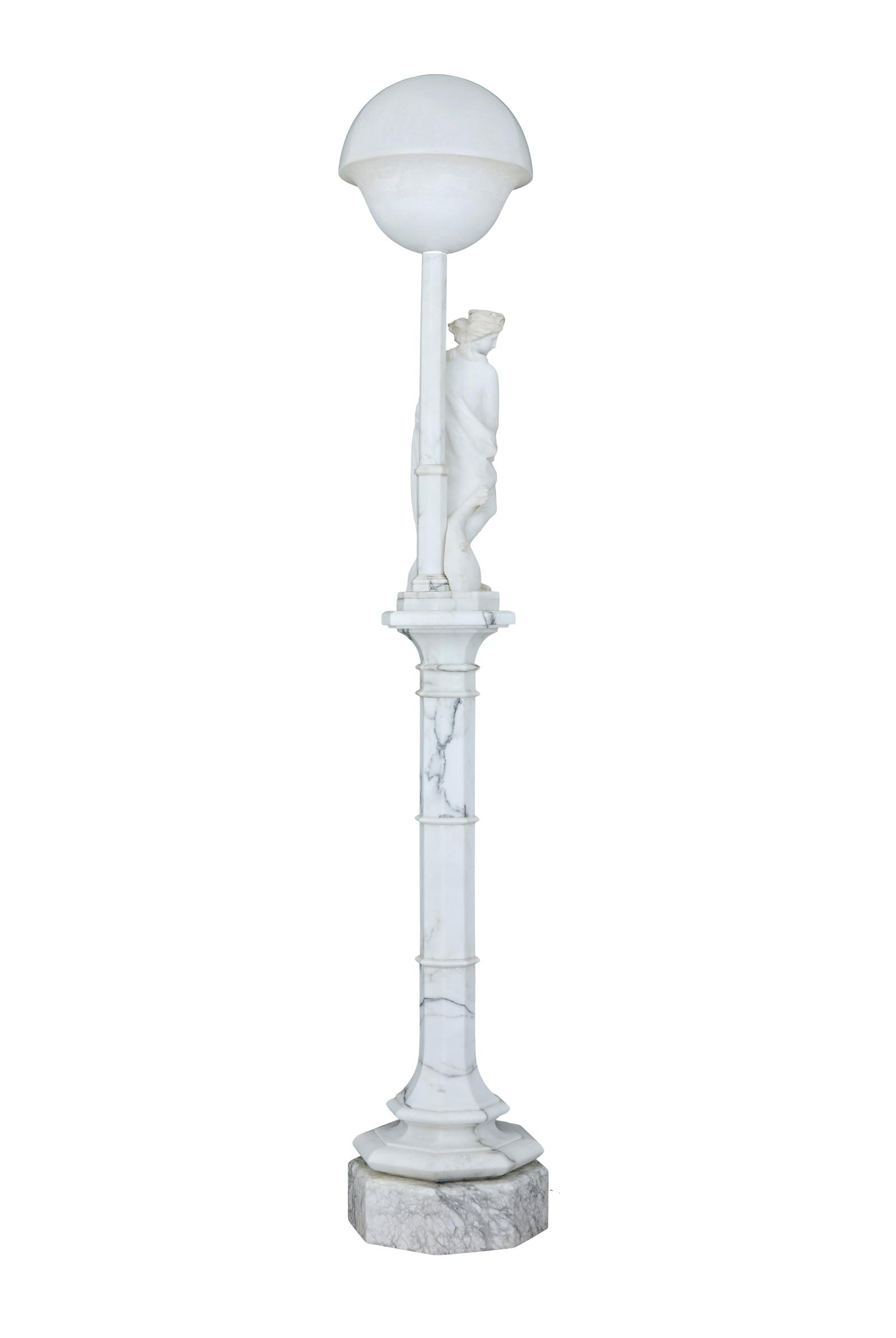 This is a highly decorative early 20th Century Swedish alabaster figural lamp, a gowned female figure with a mythical sea creature at her feet and a large domed light above her, supported on a very ornate octagon shaped column terminating on a deep platform base. In excellent condition and the electrics have been refitted.