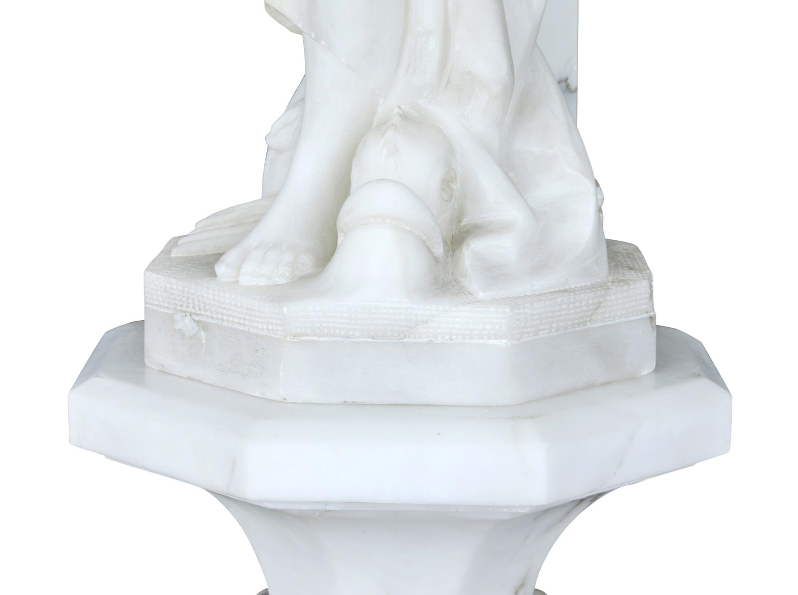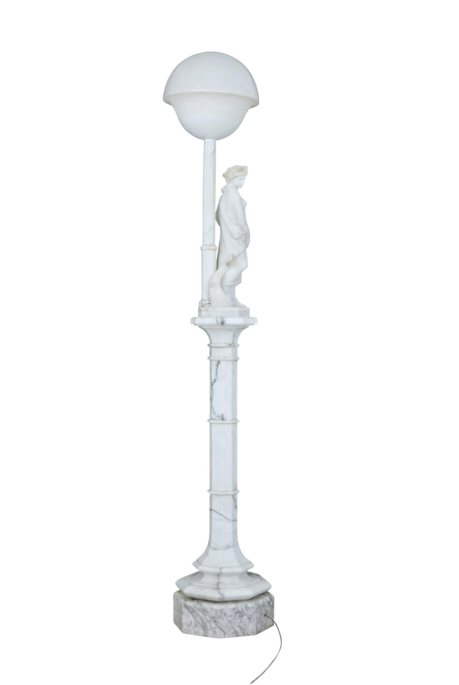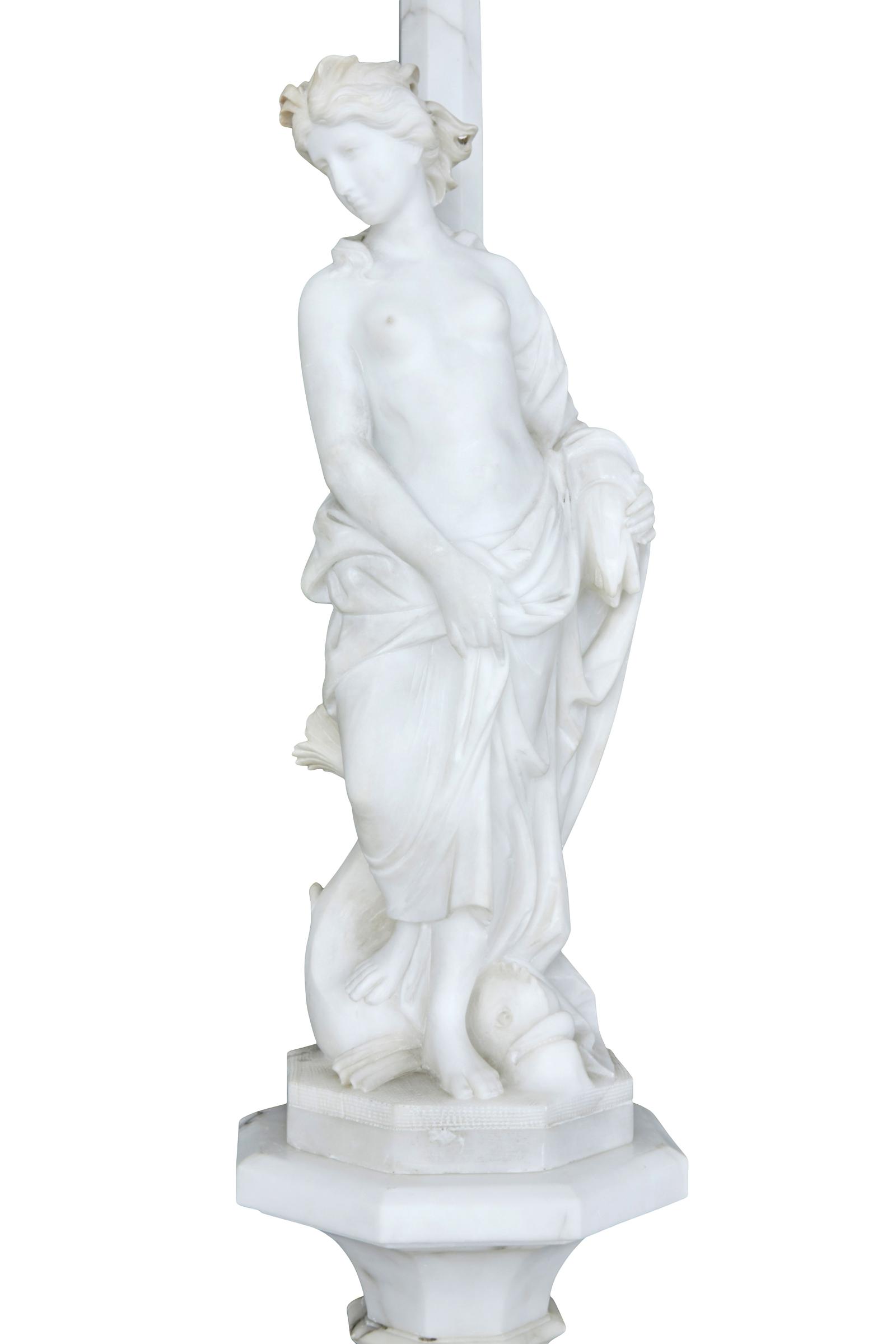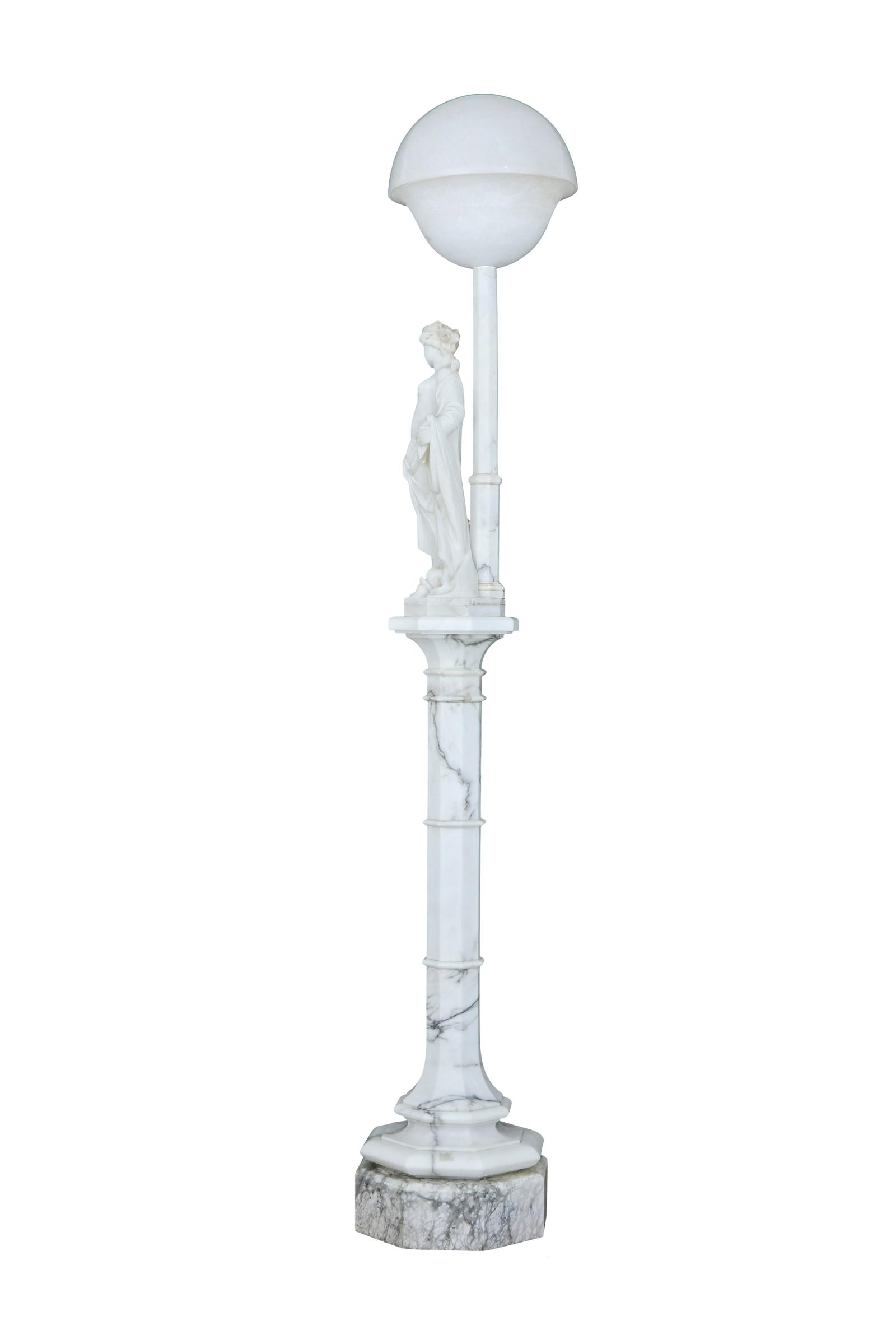 This is a highly decorative early 20th Century Swedish alabaster figural lamp, a gowned female figure with a mythical sea creature at her feet and a large domed light above her, supported on a very ornate octagon shaped column terminating on a deep platform base. In excellent condition and the electrics have been refitted.
