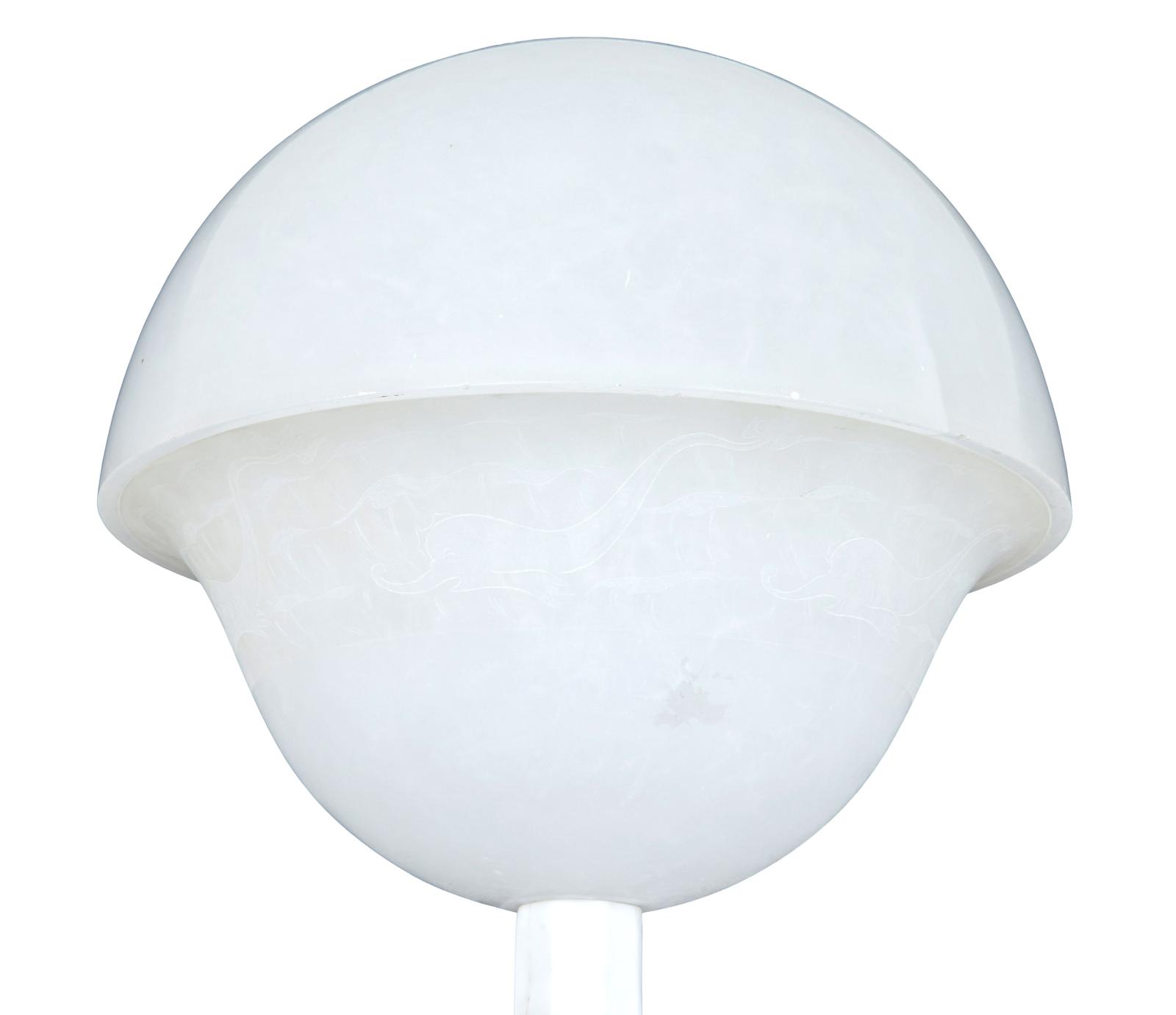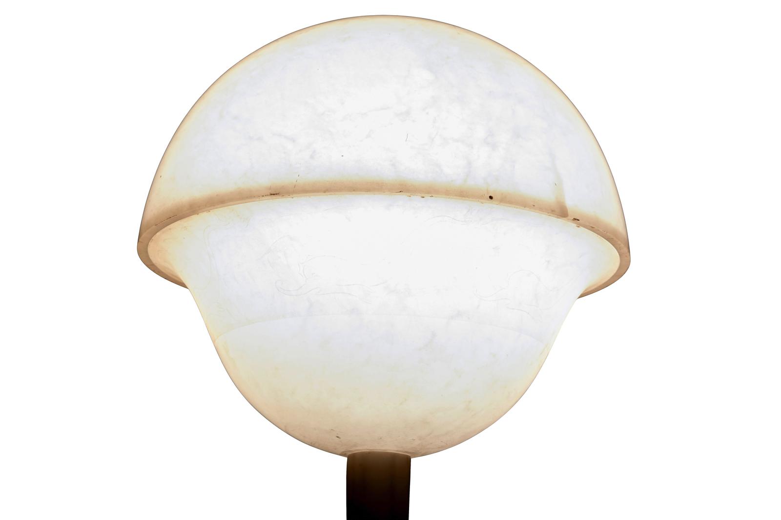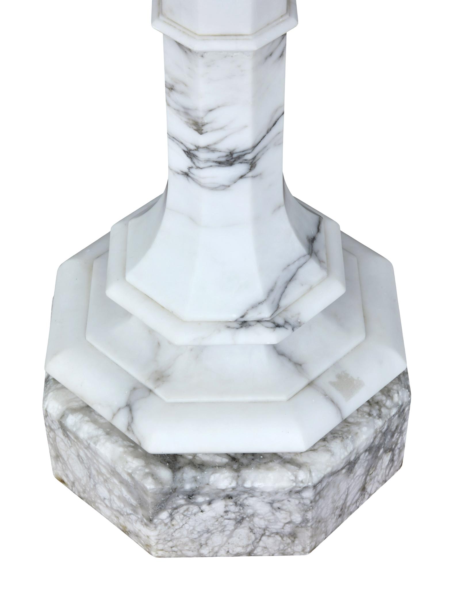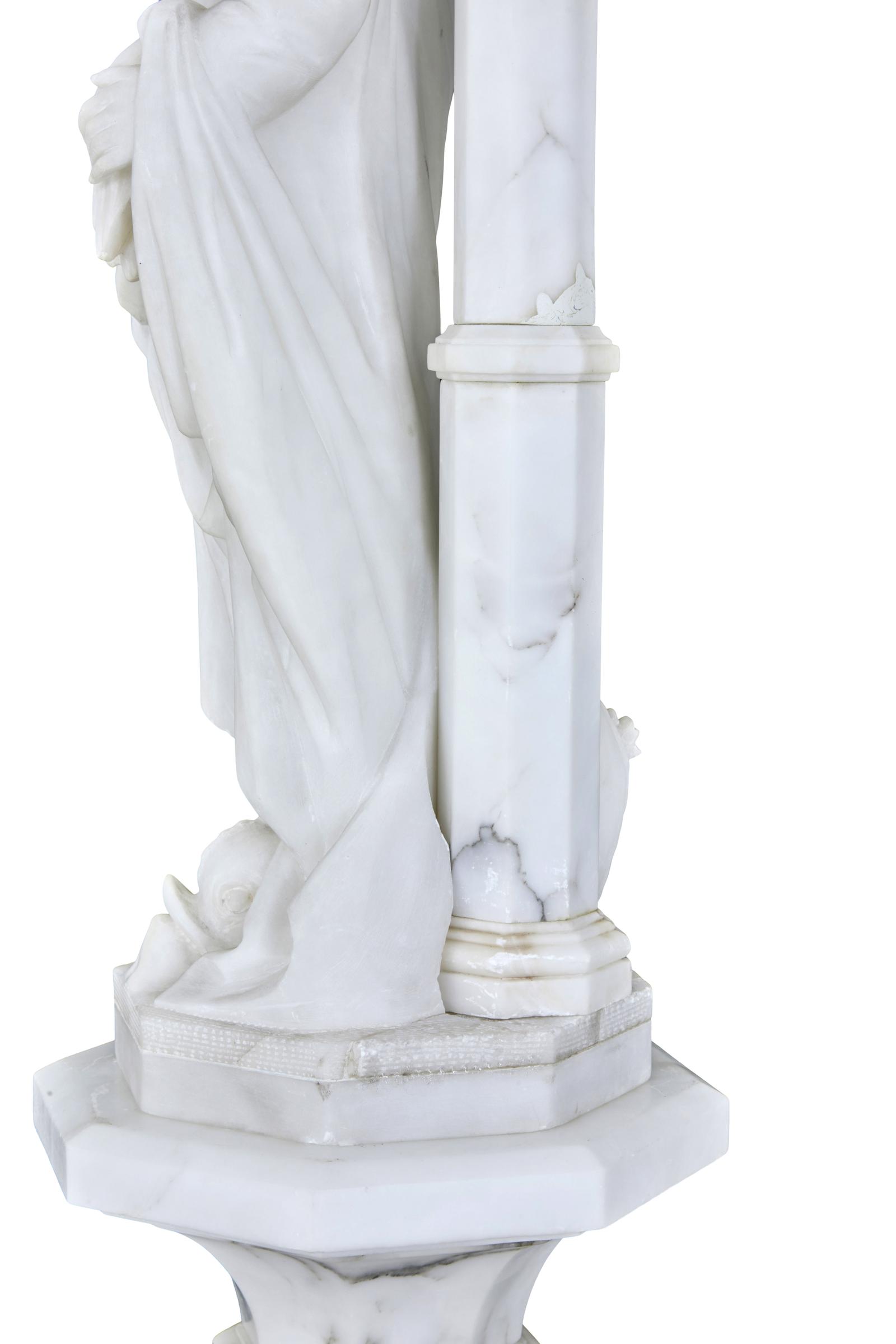 This is a highly decorative early 20th Century Swedish alabaster figural lamp, a gowned female figure with a mythical sea creature at her feet and a large domed light above her, supported on a very ornate octagon shaped column terminating on a deep platform base. In excellent condition and the electrics have been refitted.