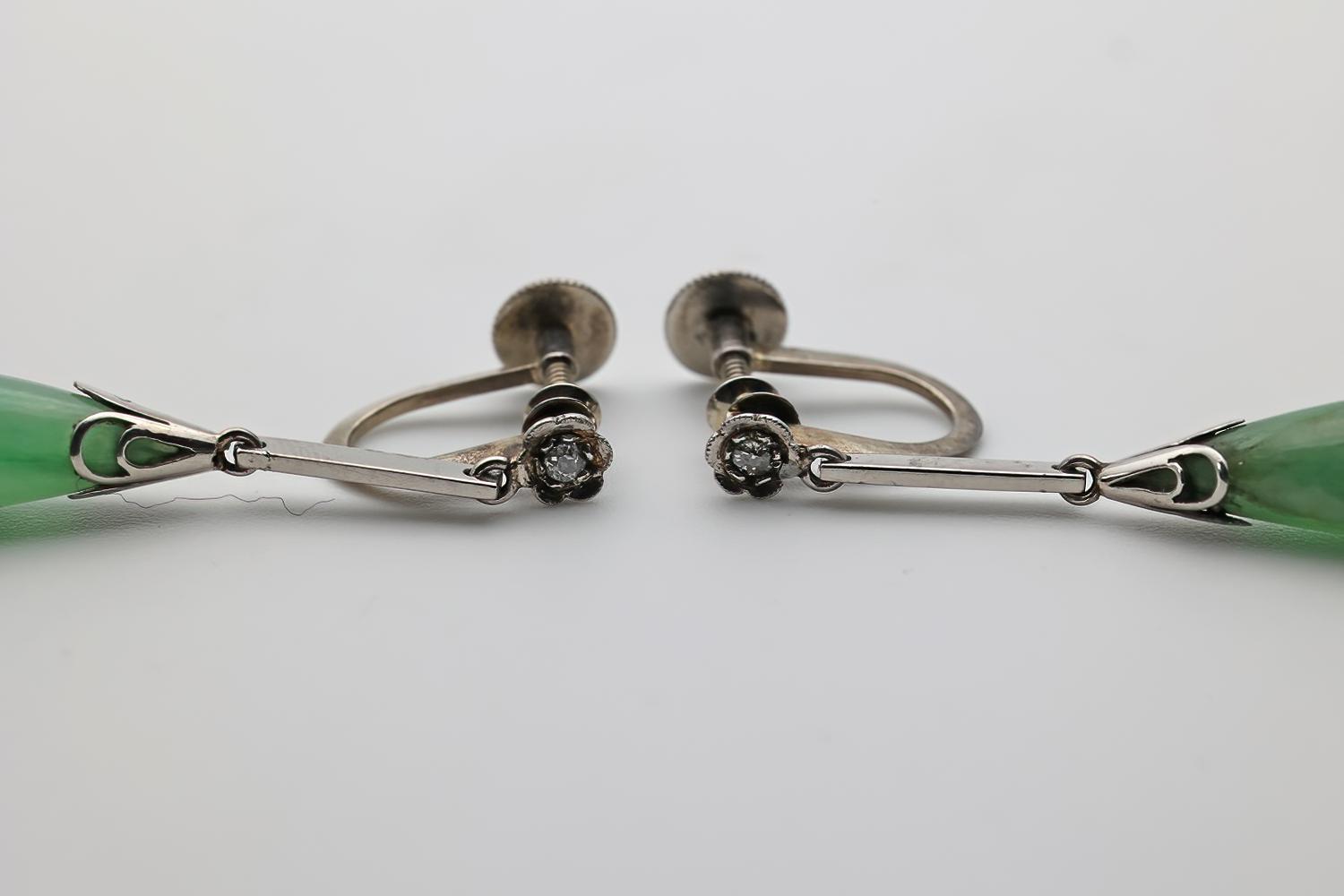 Edwardian jadeite and platinum drop earrings set in platinum with jadeite elongated drops suspended from platinum with a diamond set in a flower shape. Screw backs.nnLength 4.7cmn8.5gm
