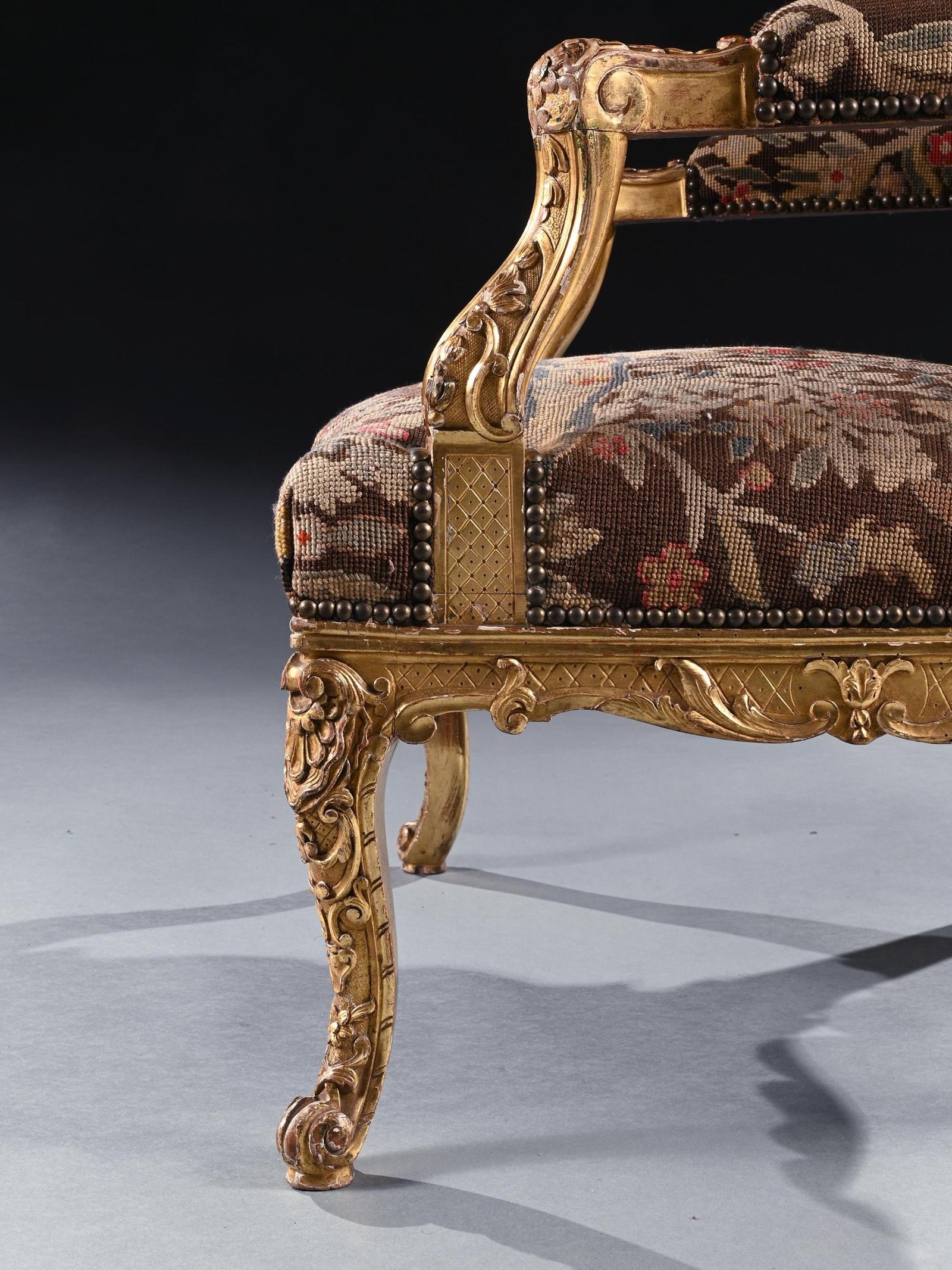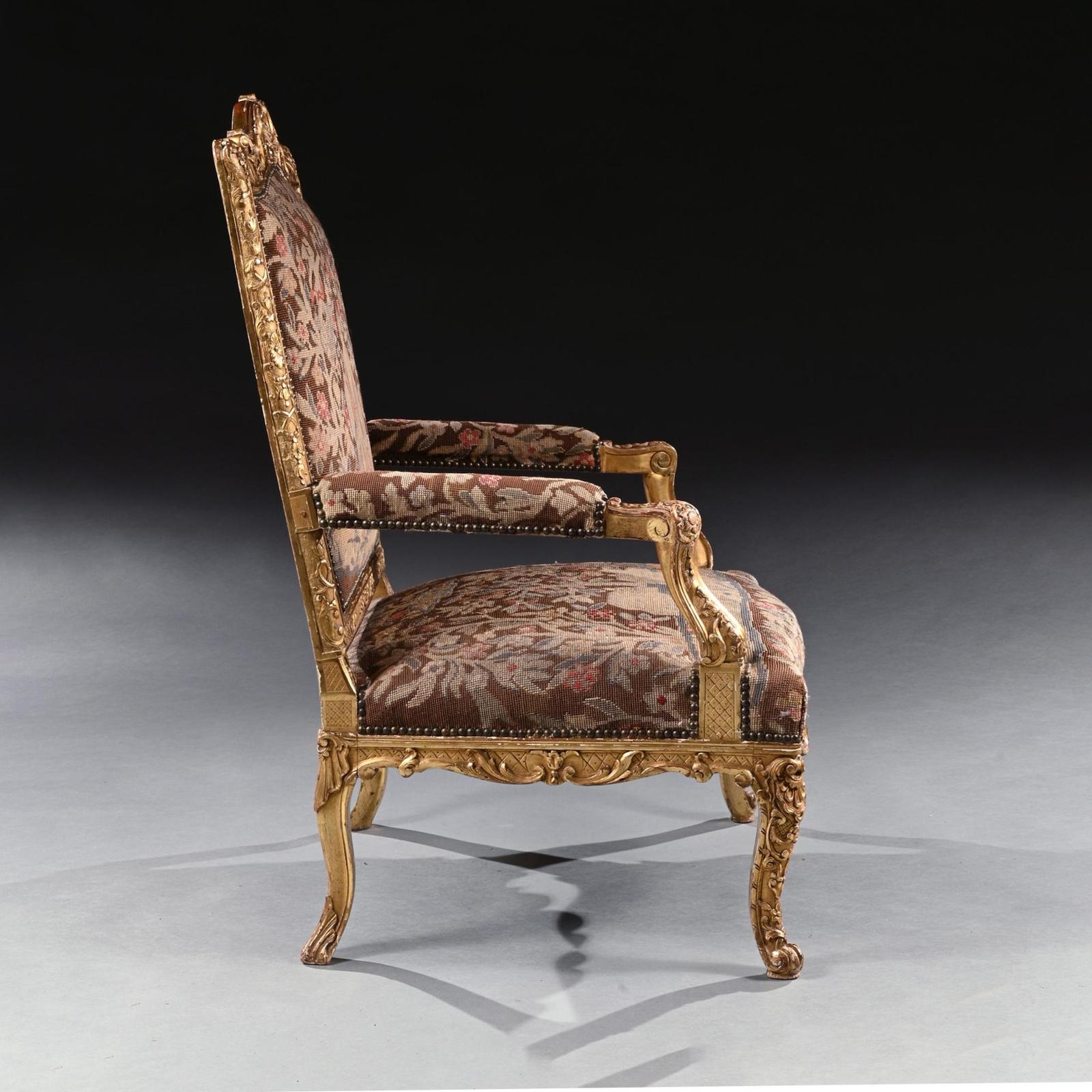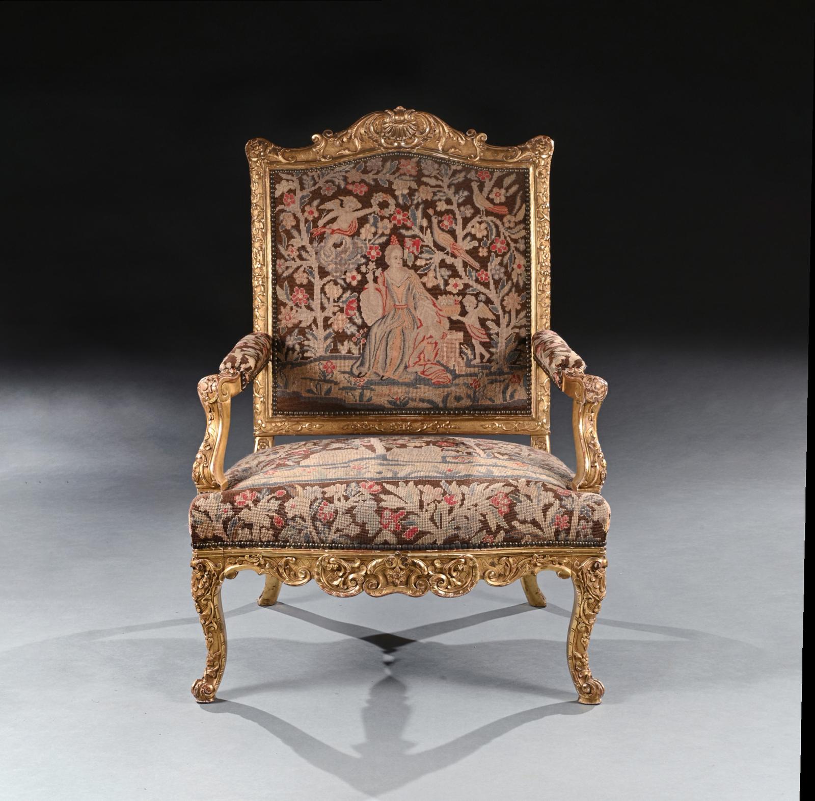 A highly impressive rare French carved Régence period giltwood fauteuil / armchair of imposing proportions with needlework upholstery.nnIt is of grand scale, this wonderfully drawn armchair has a shaped and arched carved cresting rail with central acanthus leaf and shell motif, with a moulded and carved surround. The stuffed back covered in a later nailed floral needlework with birds, cherubs, a seated figure and architectural details over a padded upholstered bow front seat flanked by padded arms. The carved apron with an incised trellis ground on delicately carved cabriole legs.nnThe bold proportions and fine carving of this rare fauteuil make it worthy of any connoisseur collector. nnThe Regence period was a transitional era in French history between 1715 and 1723 when King Louis Xv was considered a minor therefore too young to govern the country and was instead ruled by Philippe d’Orleans ( a nephew of Louis Xiv of France) as the prince regent. nnAs with our fauteuil, you can see the early transition of design from Louis Xiv to Louis Xv…. whilst still retaining elements of Louis Xiv…..Being of large proportions with the high rectangular shaped back, but having the armrest supports set back, cabriole legs with the absence of a stretcher, shell decoration and ‘C’ and ’S’ scrolls which followed onto the Rococo designs of Louis Xv reign.
