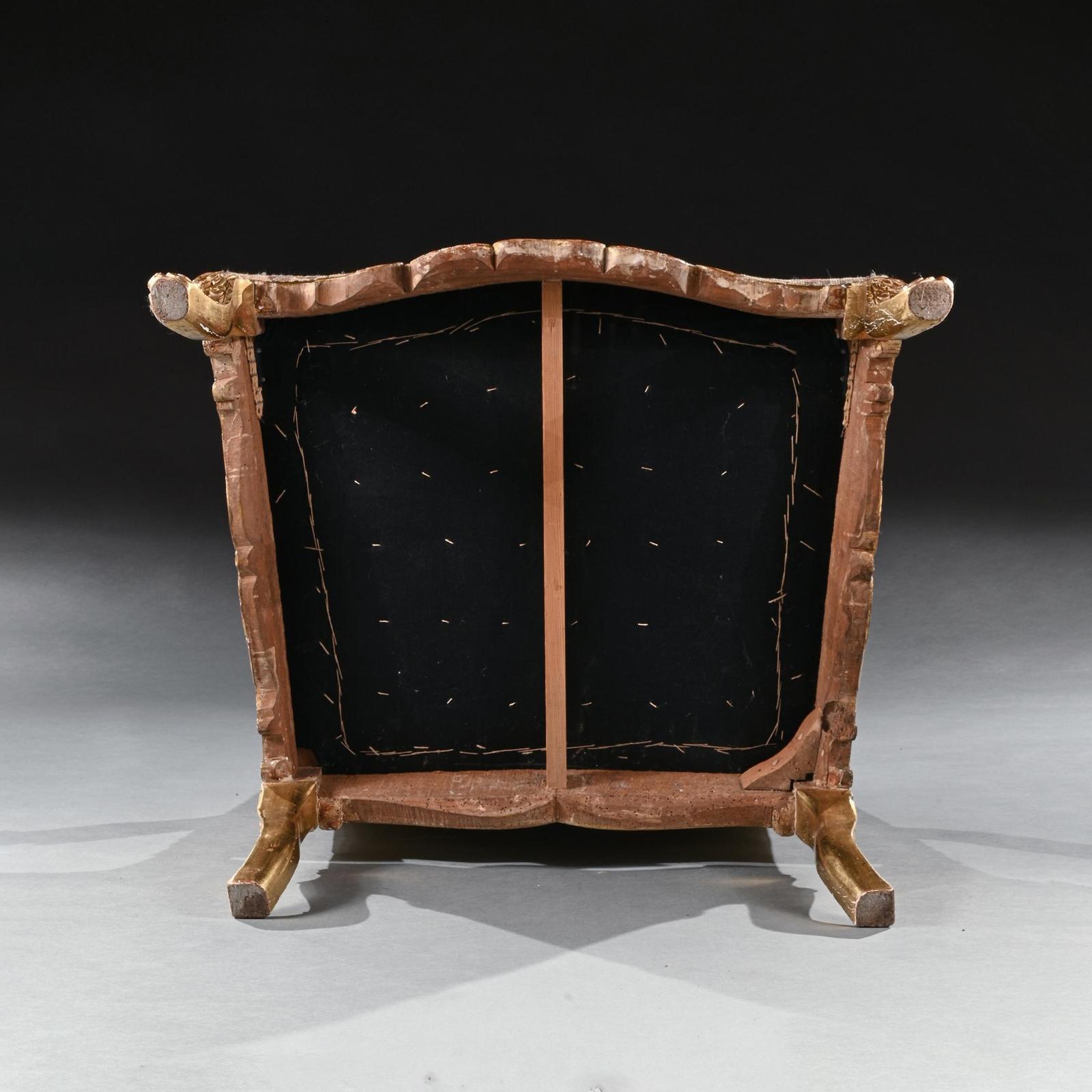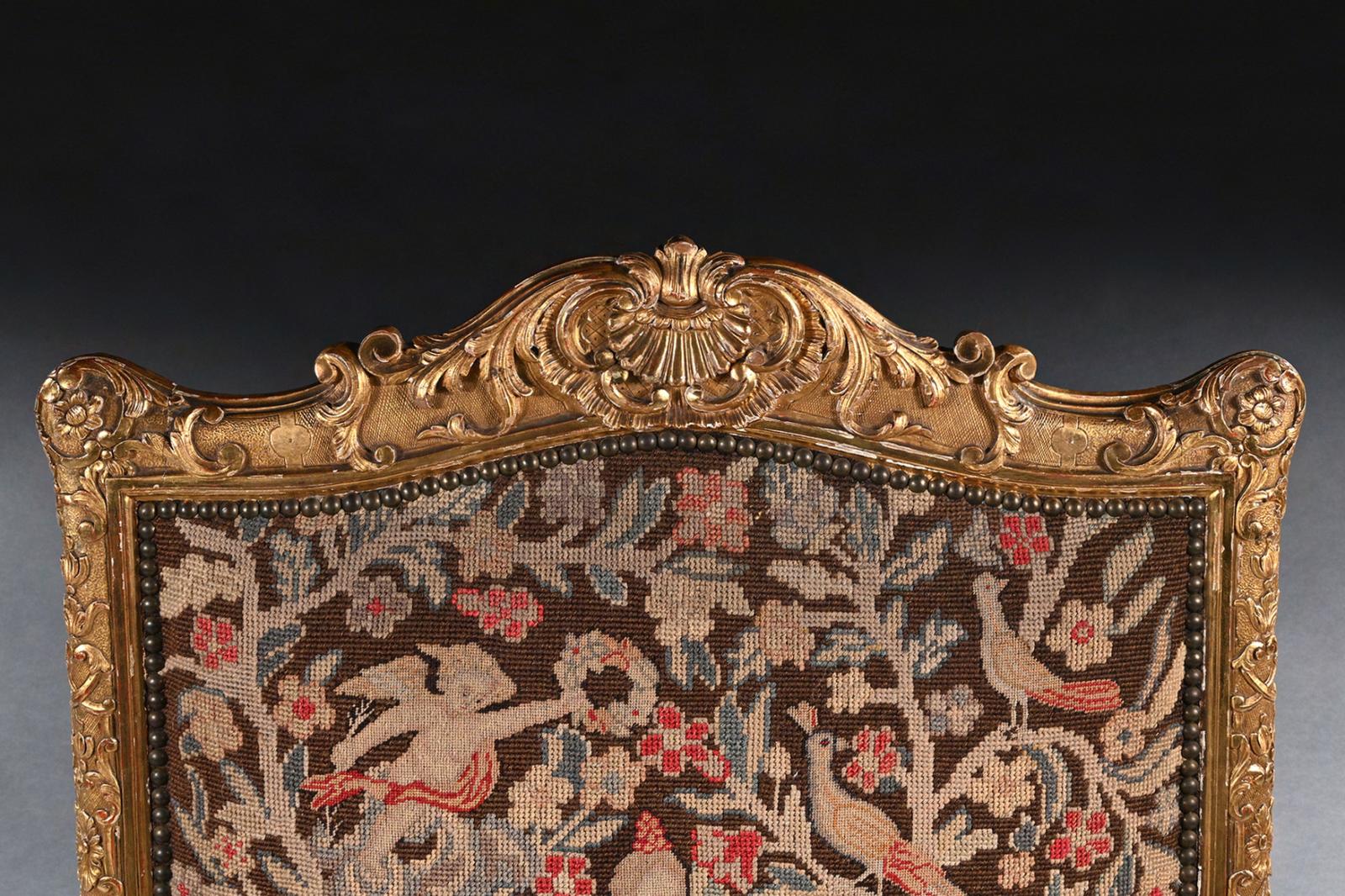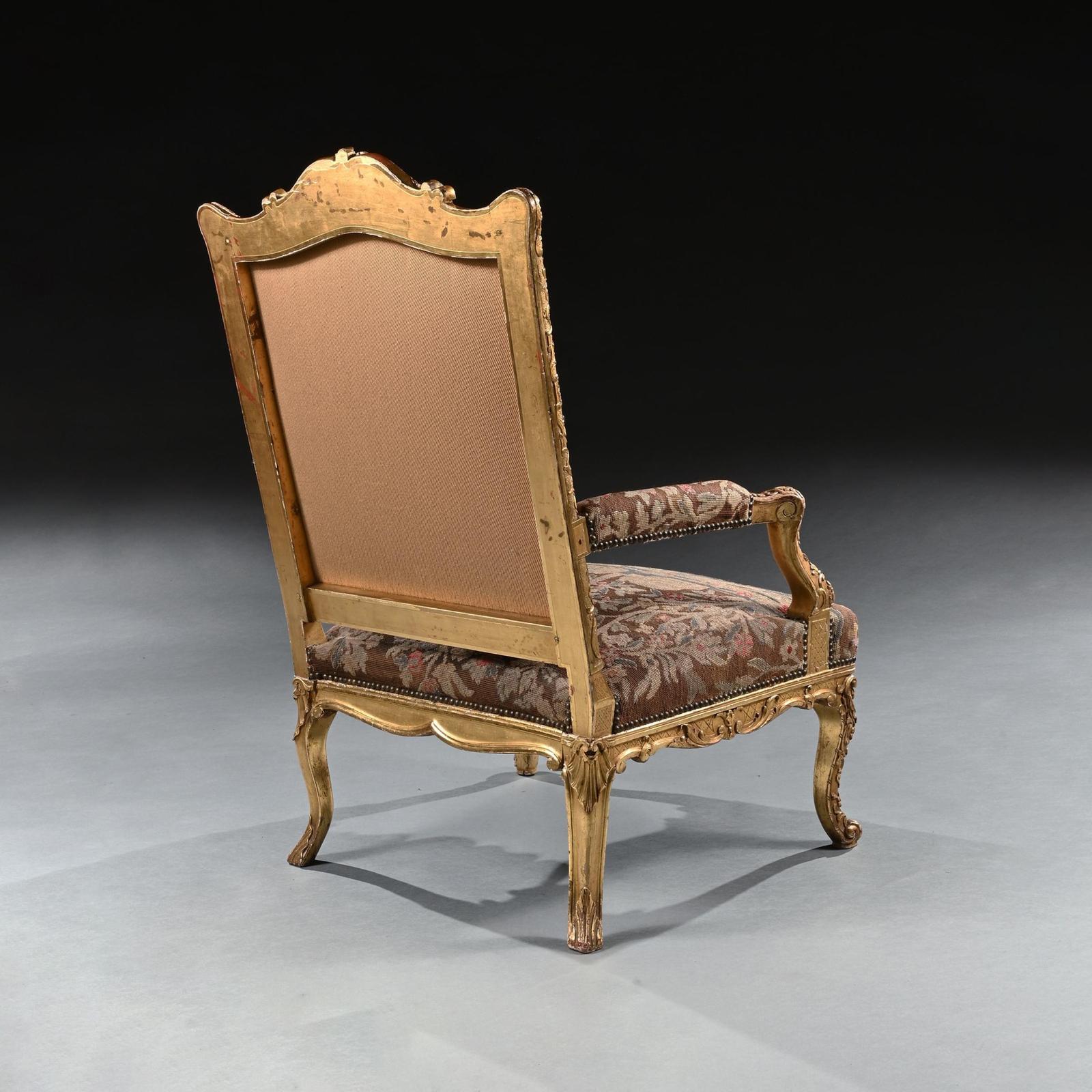 A highly impressive rare French carved Régence period giltwood fauteuil / armchair of imposing proportions with needlework upholstery.nnIt is of grand scale, this wonderfully drawn armchair has a shaped and arched carved cresting rail with central acanthus leaf and shell motif, with a moulded and carved surround. The stuffed back covered in a later nailed floral needlework with birds, cherubs, a seated figure and architectural details over a padded upholstered bow front seat flanked by padded arms. The carved apron with an incised trellis ground on delicately carved cabriole legs.nnThe bold proportions and fine carving of this rare fauteuil make it worthy of any connoisseur collector. nnThe Regence period was a transitional era in French history between 1715 and 1723 when King Louis Xv was considered a minor therefore too young to govern the country and was instead ruled by Philippe d’Orleans ( a nephew of Louis Xiv of France) as the prince regent. nnAs with our fauteuil, you can see the early transition of design from Louis Xiv to Louis Xv…. whilst still retaining elements of Louis Xiv…..Being of large proportions with the high rectangular shaped back, but having the armrest supports set back, cabriole legs with the absence of a stretcher, shell decoration and ‘C’ and ’S’ scrolls which followed onto the Rococo designs of Louis Xv reign.