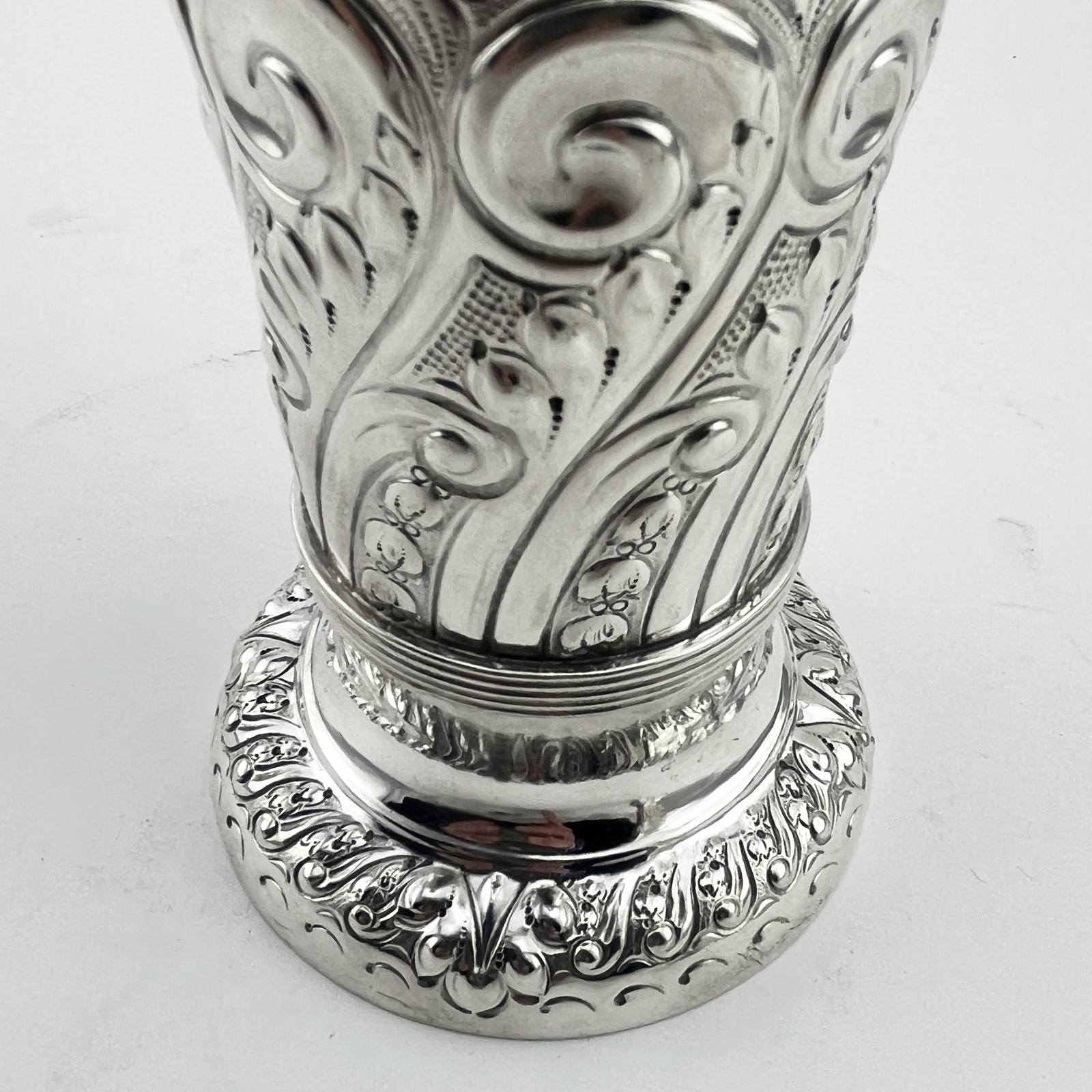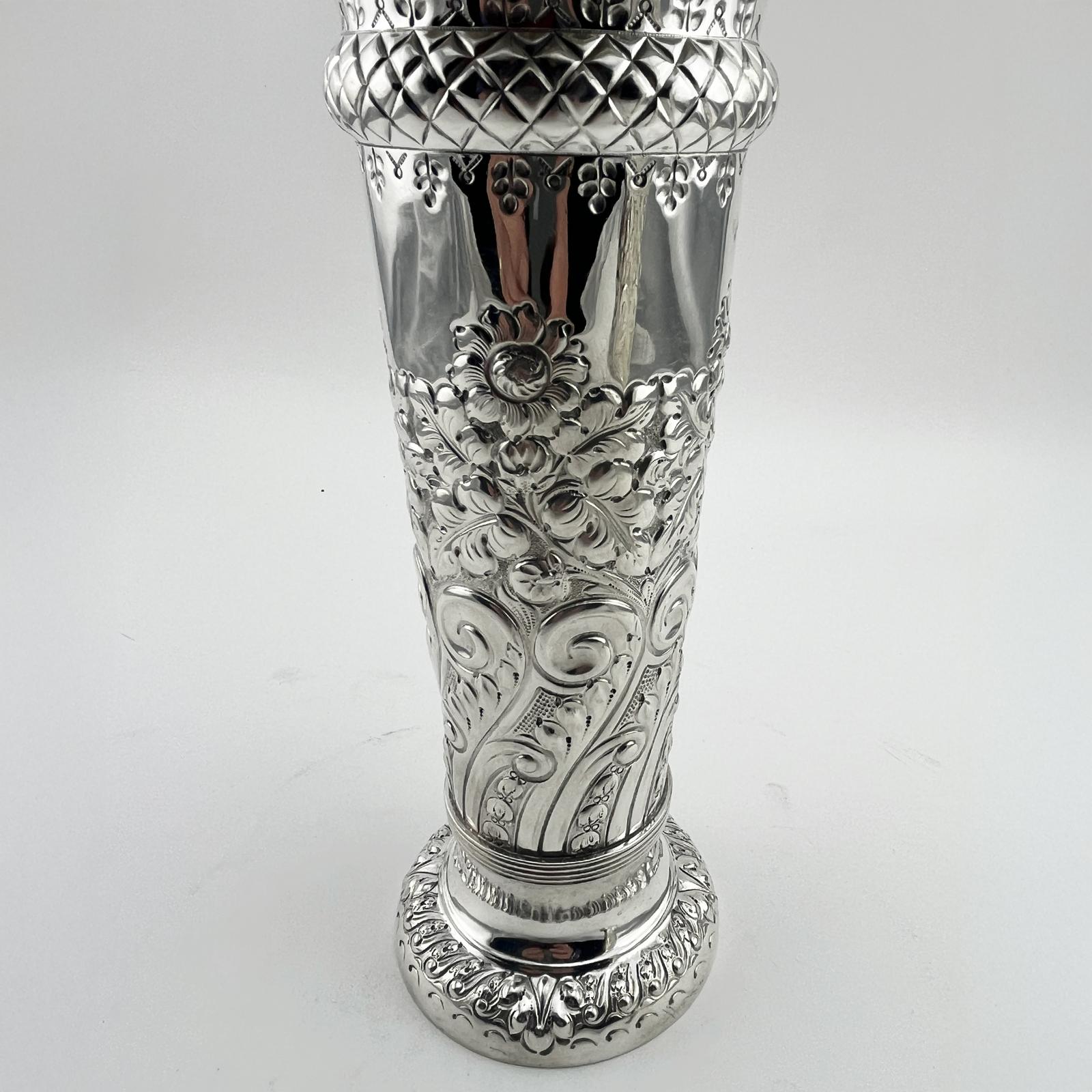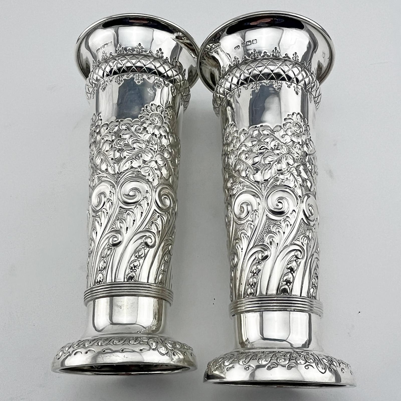 Impressive large pair of Edwardian (1904) sterling silver vases. Cylindrical trumpet shape the bodies are chased with floral and scroll decoration and stand on a scroll chased domed foot. Very good original condition without any inscriptions.