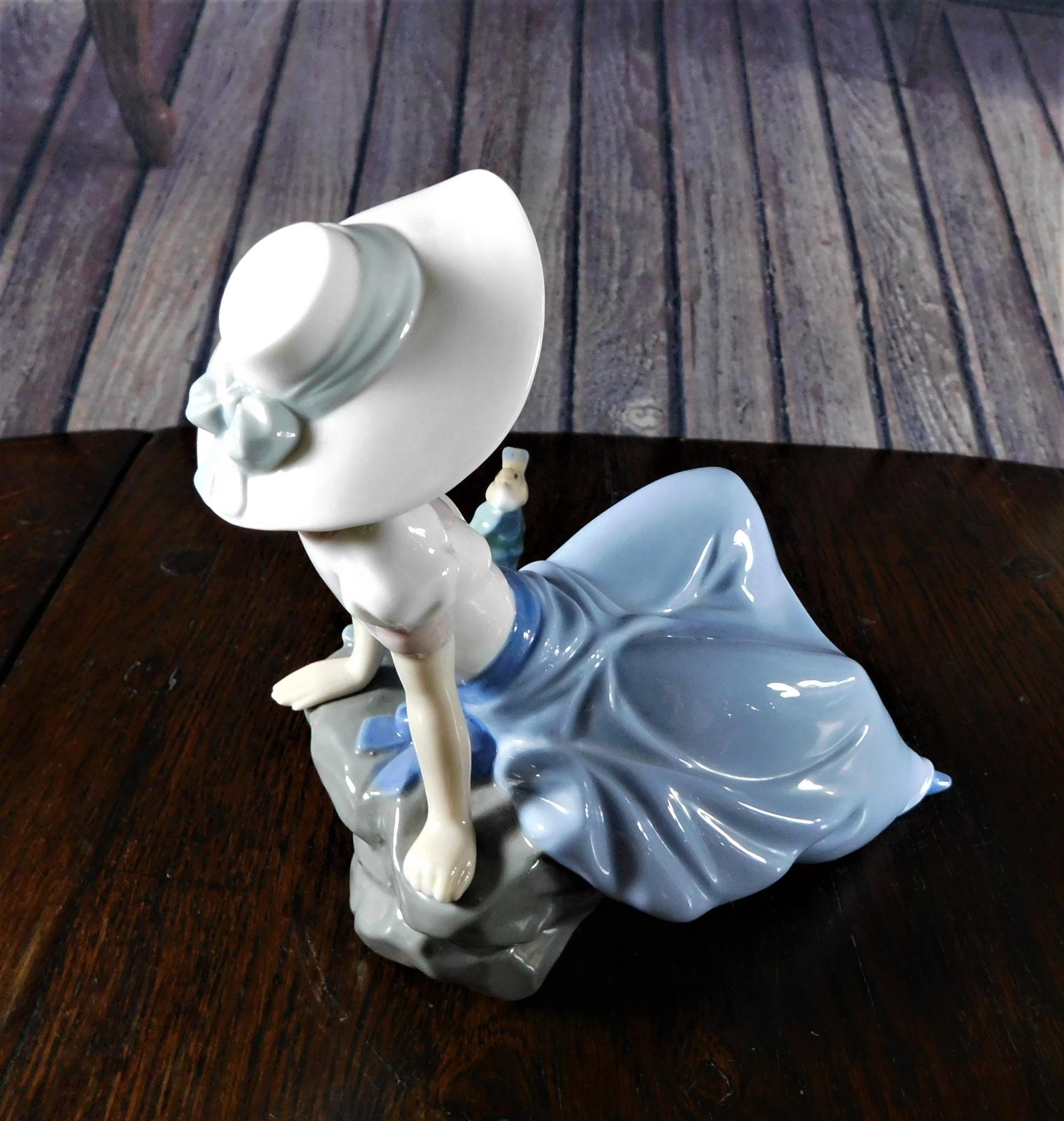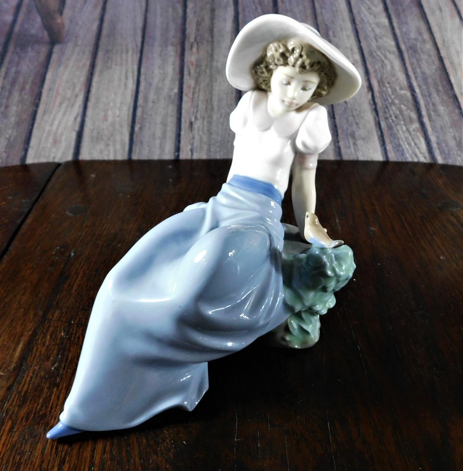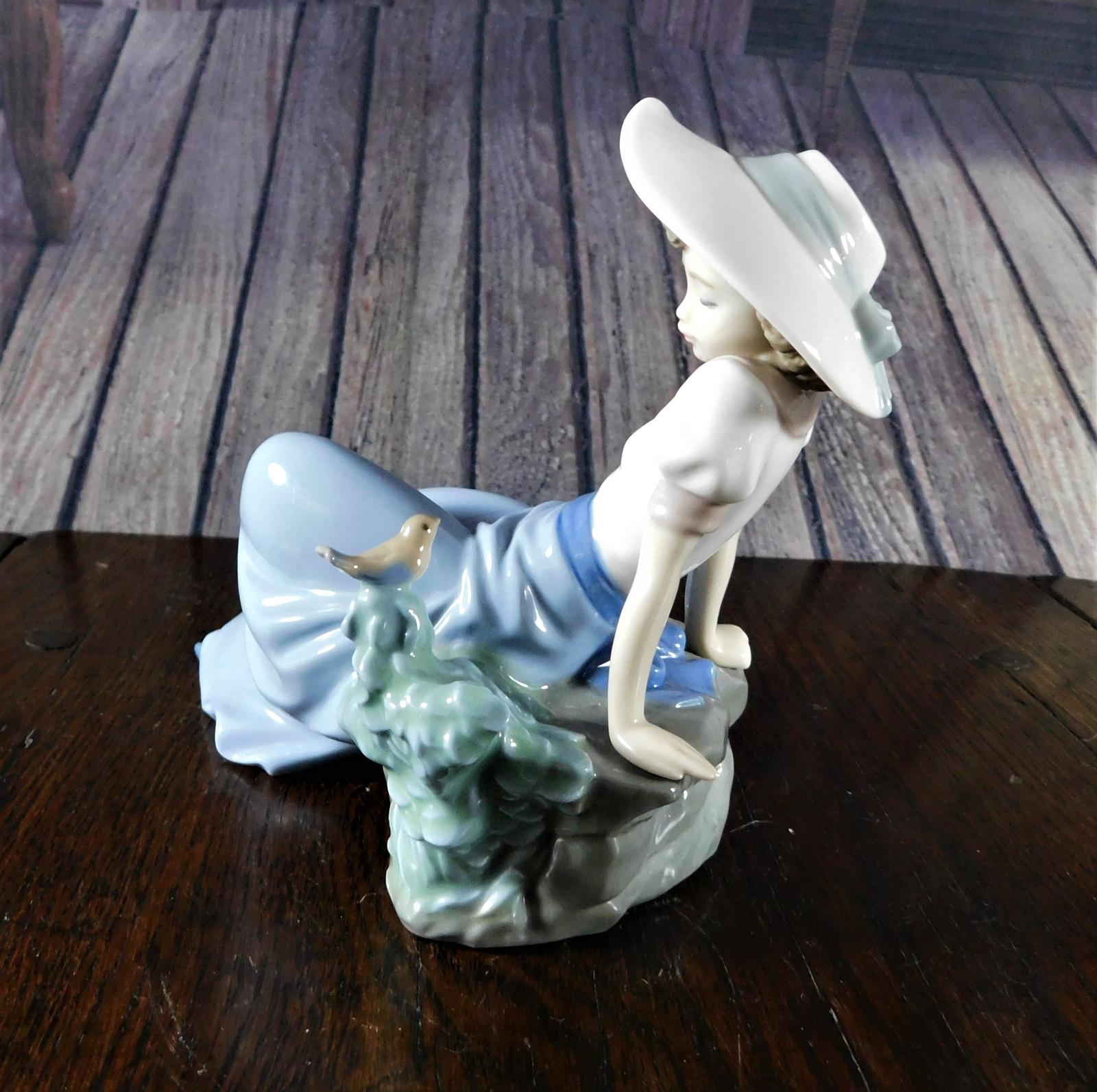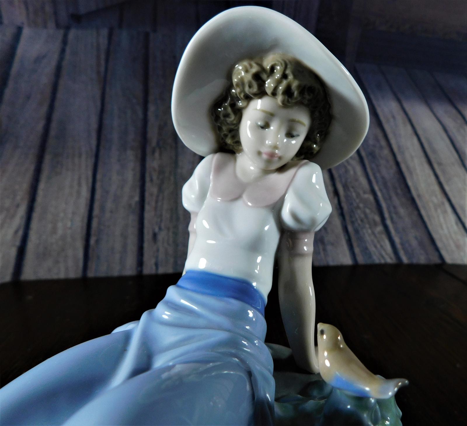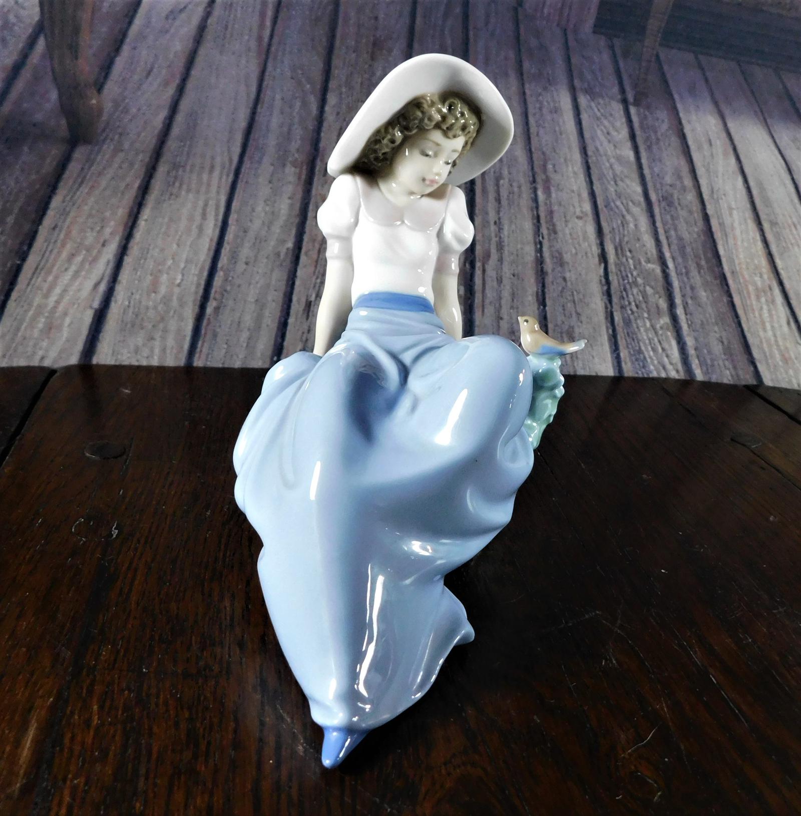 Offered for sale is a lovely figure issued by Nao of a young girl sitting on a rock listening to a little bird singing. She wears a long blue skirt and a white puffed sleeved blouse edged in pink and topped of with a lovely wide brimmed floppy hat. nShe was designed and sculpted by Regino Torrijos and as with all porcelain from Nao or their parent company Lladro, the attention to detail in this piece is superb and the use of a limited pastel colour palette gives it that signature look .nUnless otherwise stated on item descriptionnFree delivery included to UK Mainland & Ni. nEu Delivery £20.nUSA & Worldwide Delivery £35.
