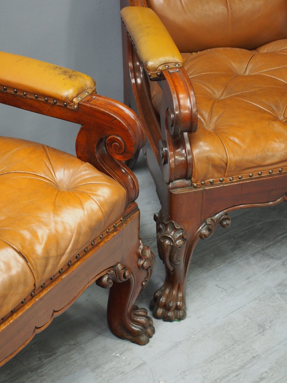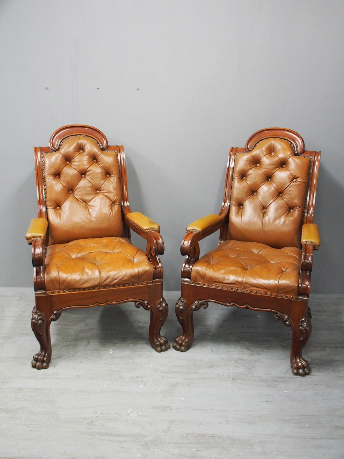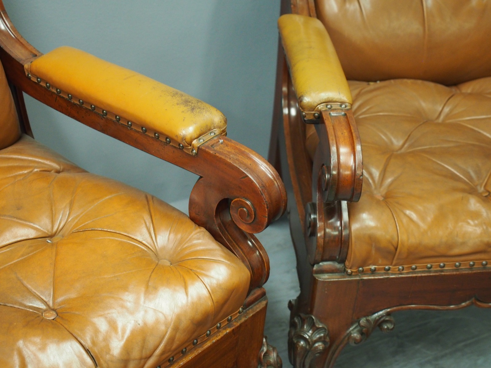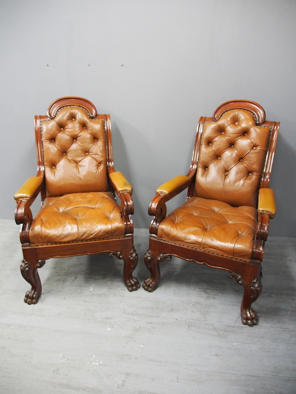 Pair of mahogany and leather upholstered club armchairs, in the manner of Thomas Colquhoun of Glasgow, with arched tops finishing with a C scroll, the generous moulded frame has a deep buttoned back and seat upholstered in a light brown/tan leather. The arms are upholstered in matching leather and held in place by scrolling supports, with a carved apron beneath the seat and sides, simulating a beaded edge. With outswept back legs finishing on scrolling metal feet (allowing the chairs to move with ease). The front legs are well carved with foliate designs, c-scrolling and finish on a hairy paw foot. nnIn the manner of Thomas Colquhoun, cabinetmakers and upholsterers (listed at St Vincent St, Glasgow from 1847).