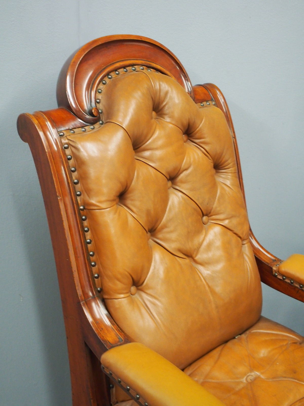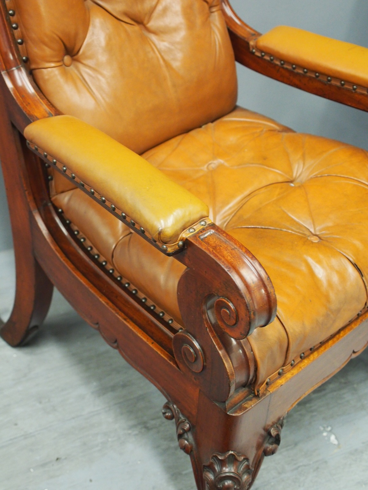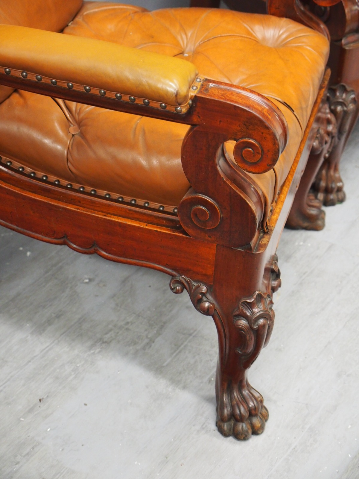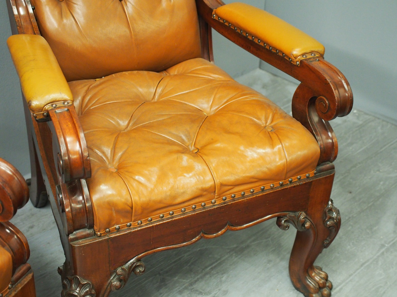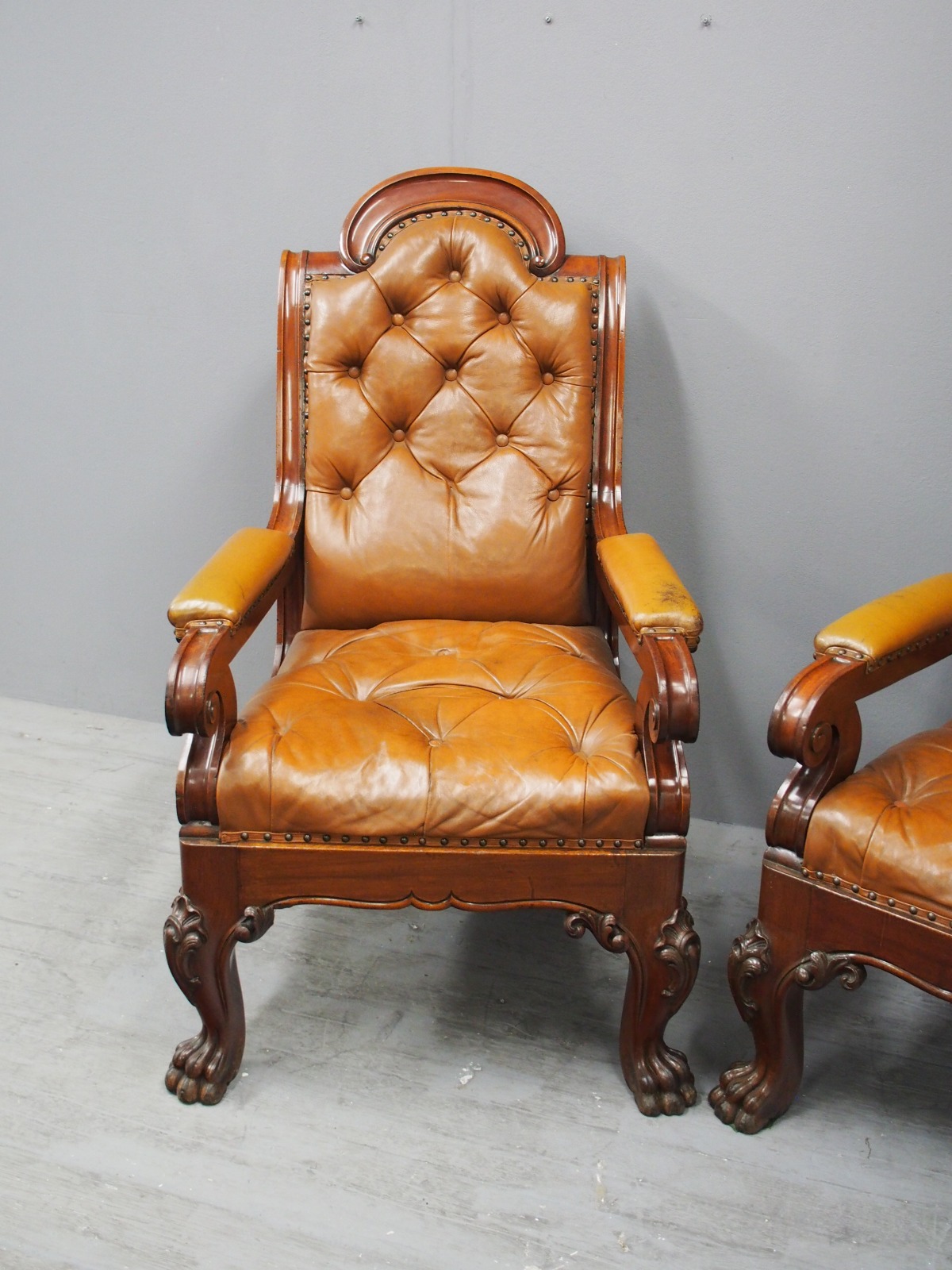 Pair of mahogany and leather upholstered club armchairs, in the manner of Thomas Colquhoun of Glasgow, with arched tops finishing with a C scroll, the generous moulded frame has a deep buttoned back and seat upholstered in a light brown/tan leather. The arms are upholstered in matching leather and held in place by scrolling supports, with a carved apron beneath the seat and sides, simulating a beaded edge. With outswept back legs finishing on scrolling metal feet (allowing the chairs to move with ease). The front legs are well carved with foliate designs, c-scrolling and finish on a hairy paw foot. nnIn the manner of Thomas Colquhoun, cabinetmakers and upholsterers (listed at St Vincent St, Glasgow from 1847).