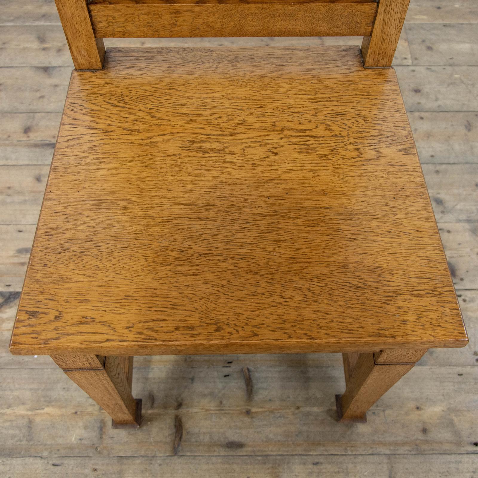 A gorgeous pair of vintage oak hall chairs. The vintage oak hall chairs feature a nicely designed panelled backrest, with a solid square shaped seat. Raised on traditional spade feet with H stretcher supports. A particularly pleasing pair, with a lovely golden colour throughout.nnItem Ref; M-4023n.