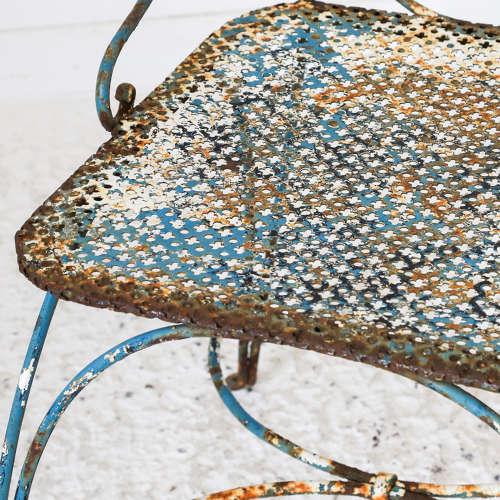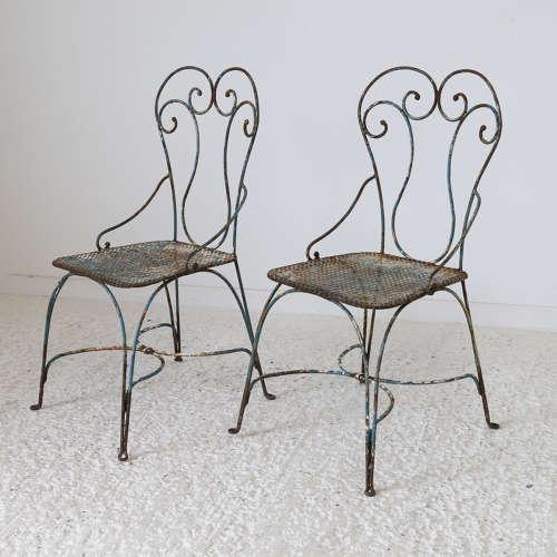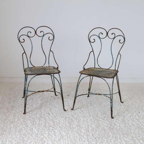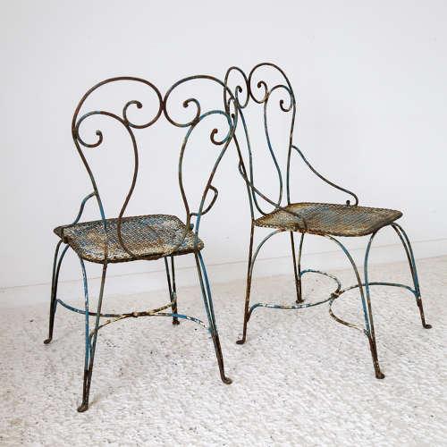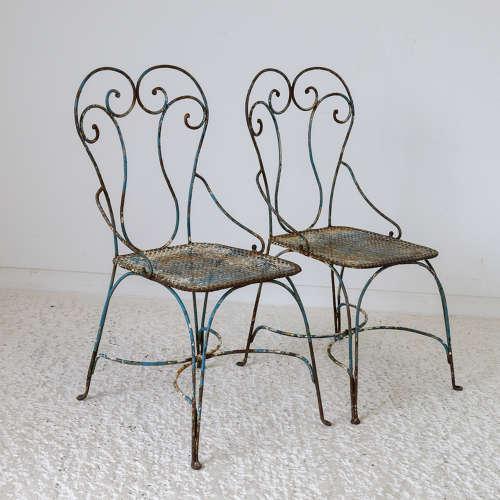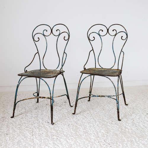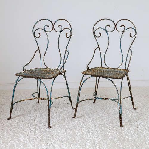 Pair of Early 20th Century Iron Garden ChairsnnEarly 20th CenturynWrought IronnLayers of worn old blue and white paintnSeats have a geometric pierced designnGently sweeping arms and heart shaped backsnVery pretty looknBoth are in very good conditionnFree of any damagenSolid, sturdy frames and seatsnWould work well in the garden or patio or in the homennA charming and decorative pair of wrought iron early 20th century garden chairs, with layers of worn old blue and white paint decoration to each. With gently sweeping arms and heart shaped backs.nnThe seats have a geometric pierced design and are free of any damage and remain both comfortable and useable.Both are in very good condition, with solid, sturdy frames and seats.Would work well in both the garden, on the patio or in the home.nnA very pretty look, use these with a small iron table for a couple to enjoy breakfast on the terrace in the morning or mix them in with other styled chairs to create a larger garden dining set for when friends and family visit.
