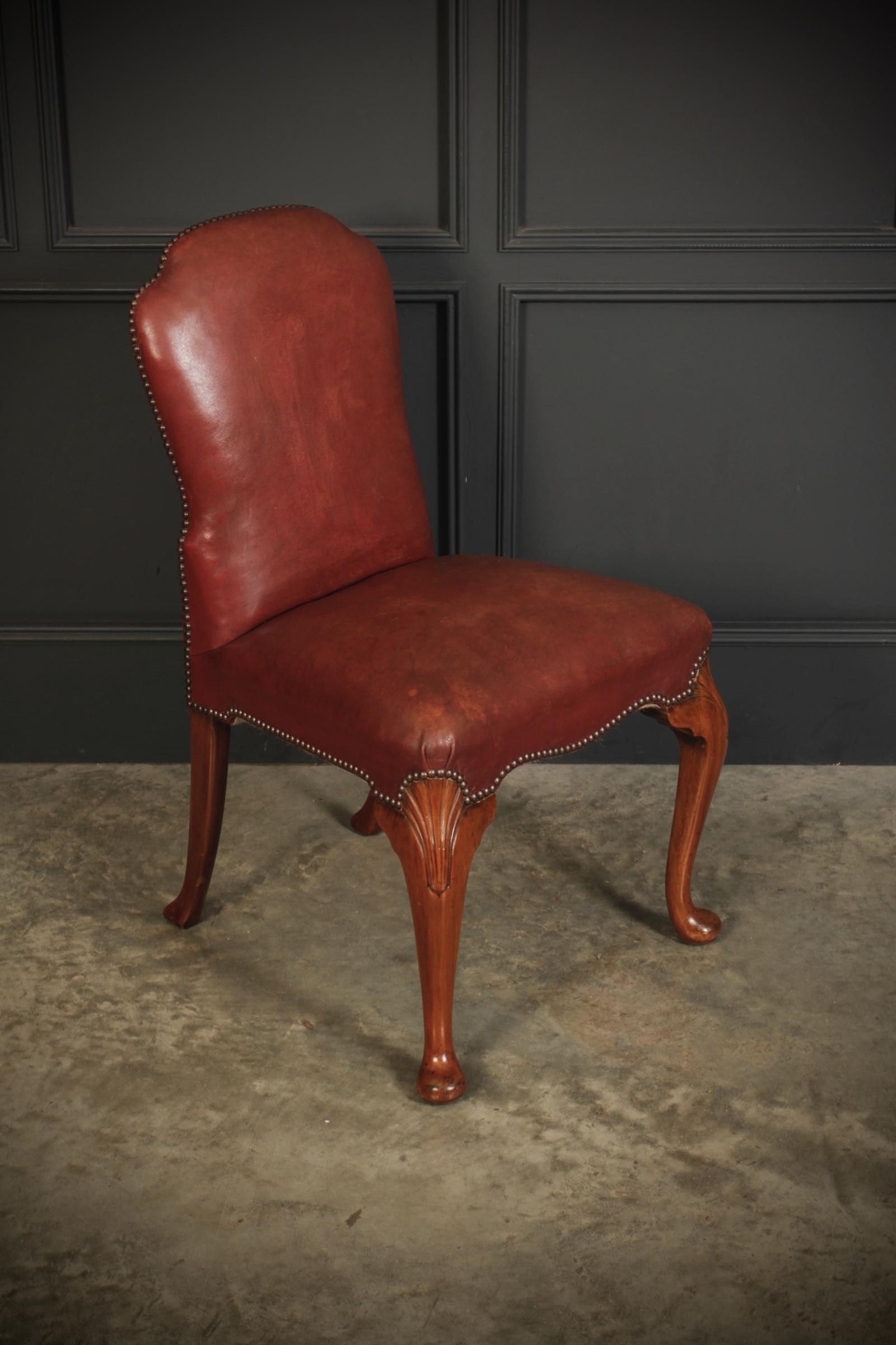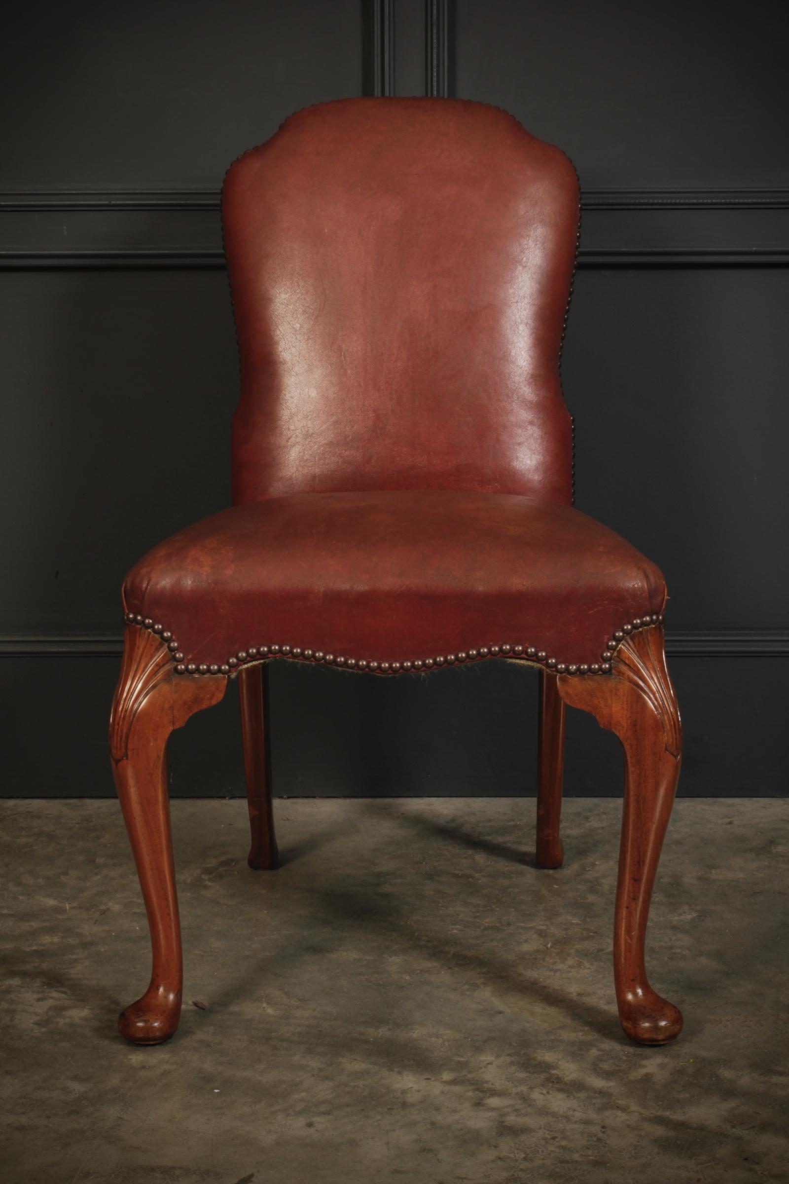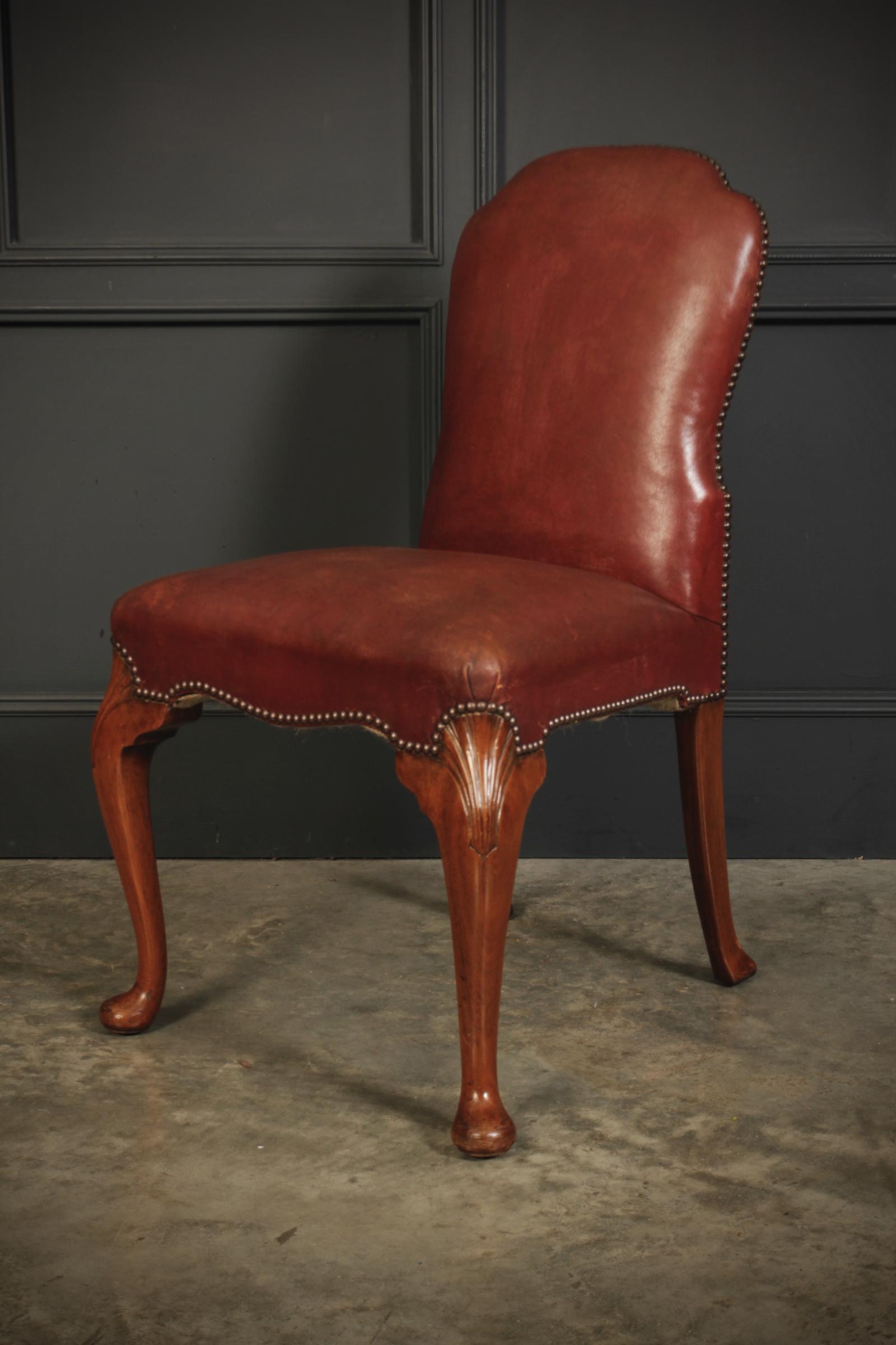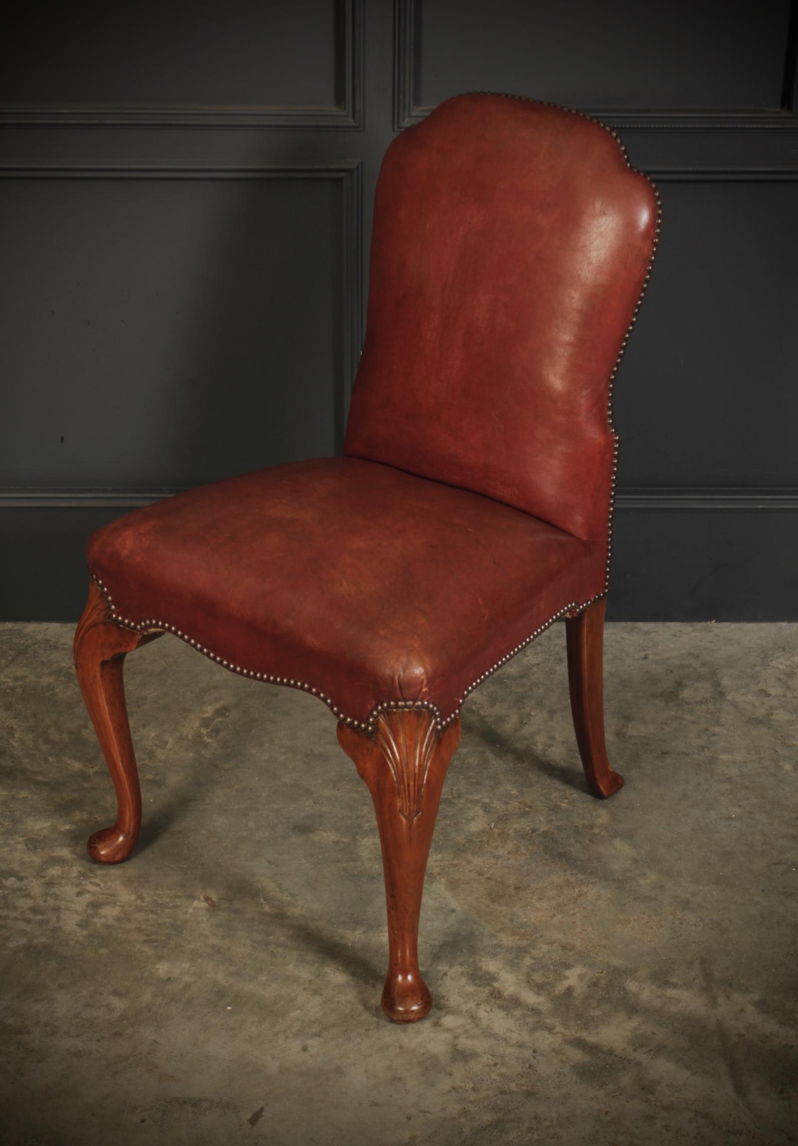 English, Circa 1920. A matching pair of chairs, with original leather upholstery and brass studded trim.nnGenerous sized seats and good back support. On lovely walnut cabriole shaped legs with carved shell knees.nnIn good condition and comfortable to sit on.