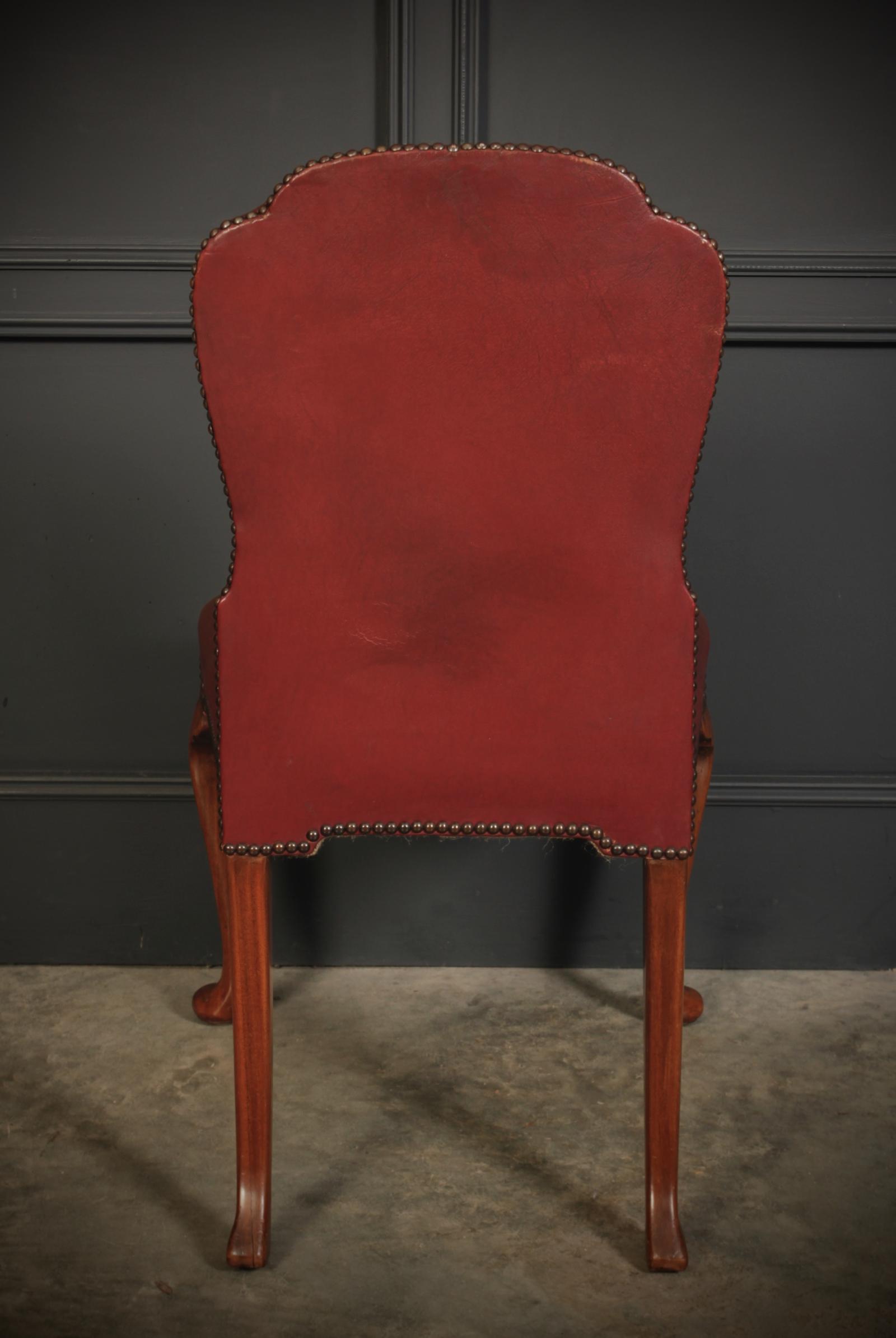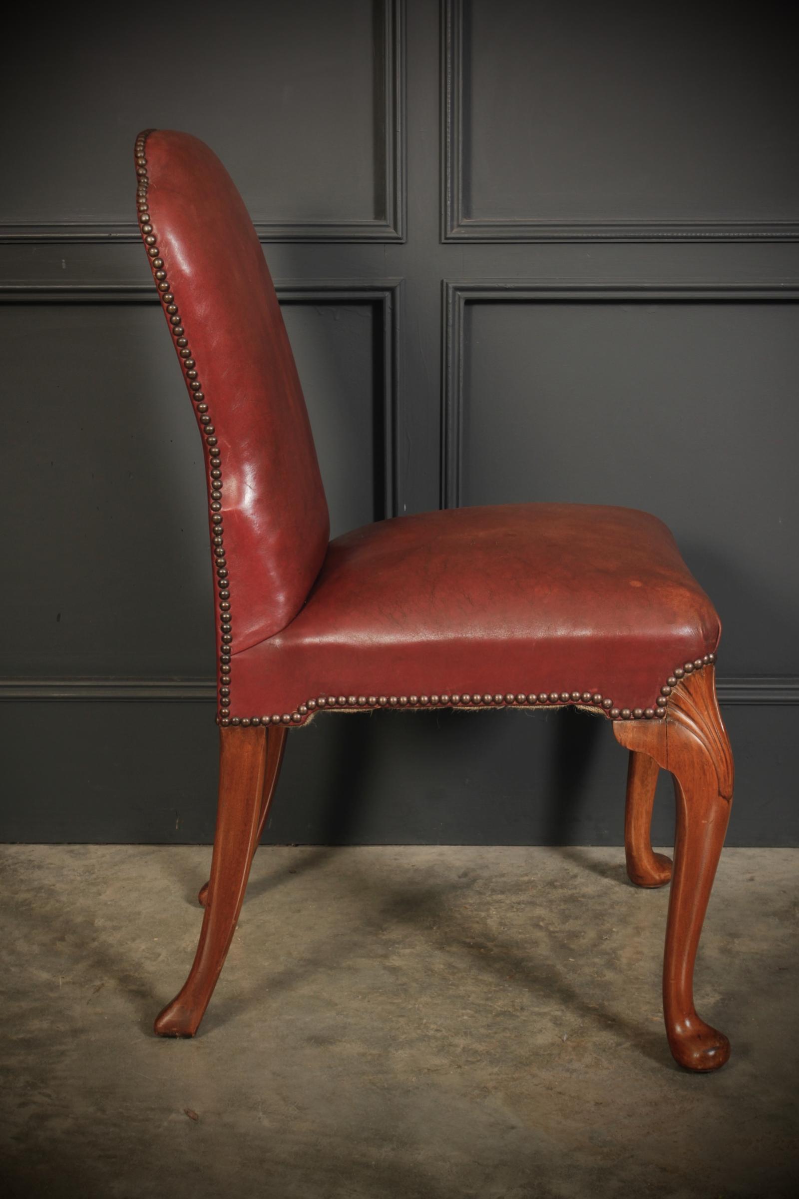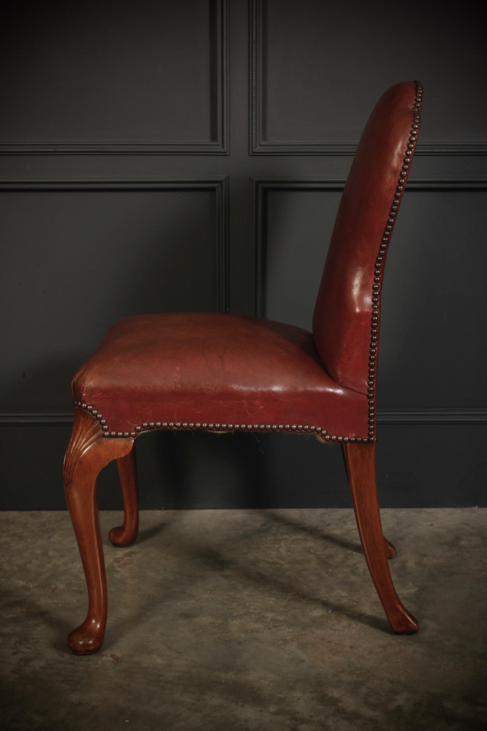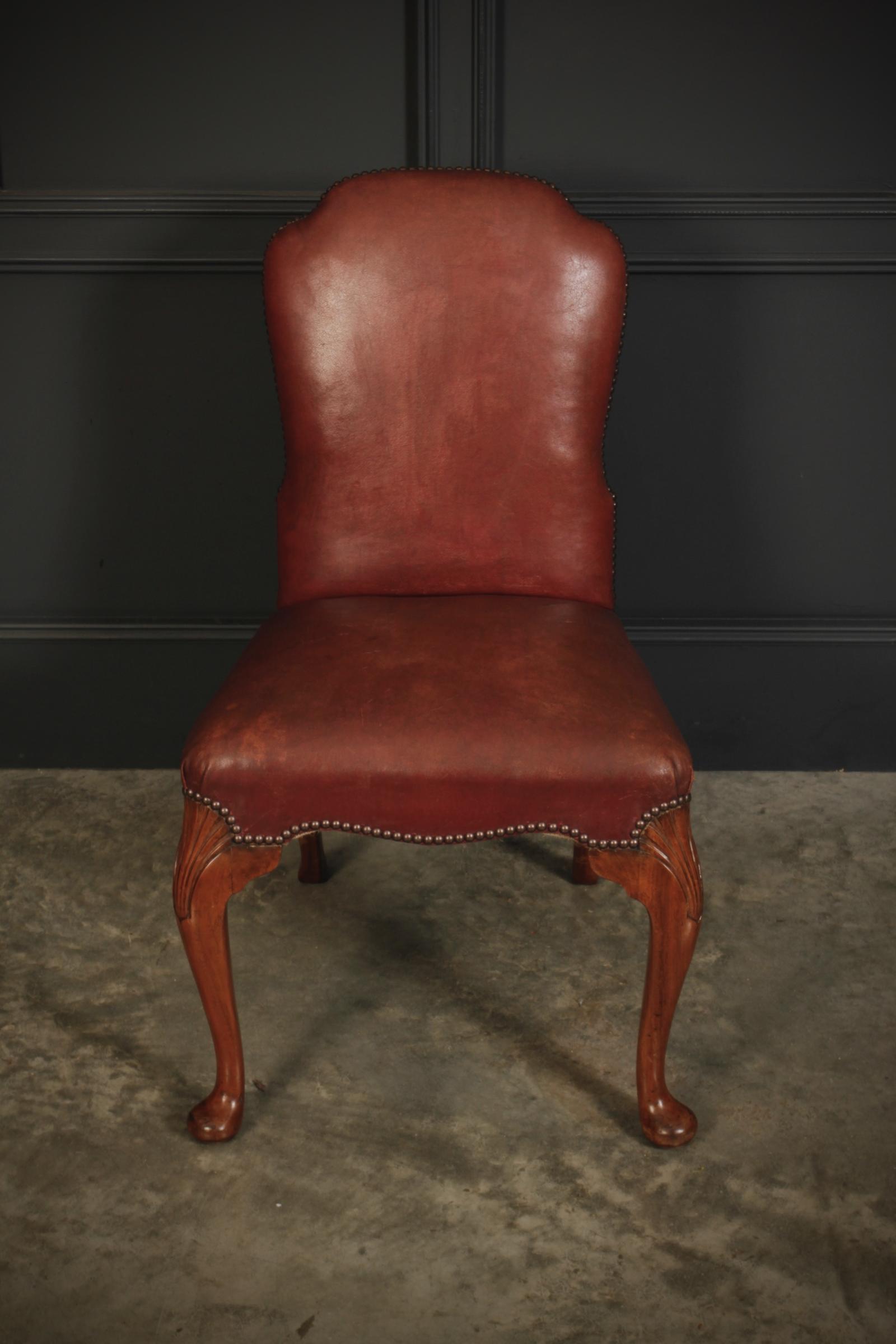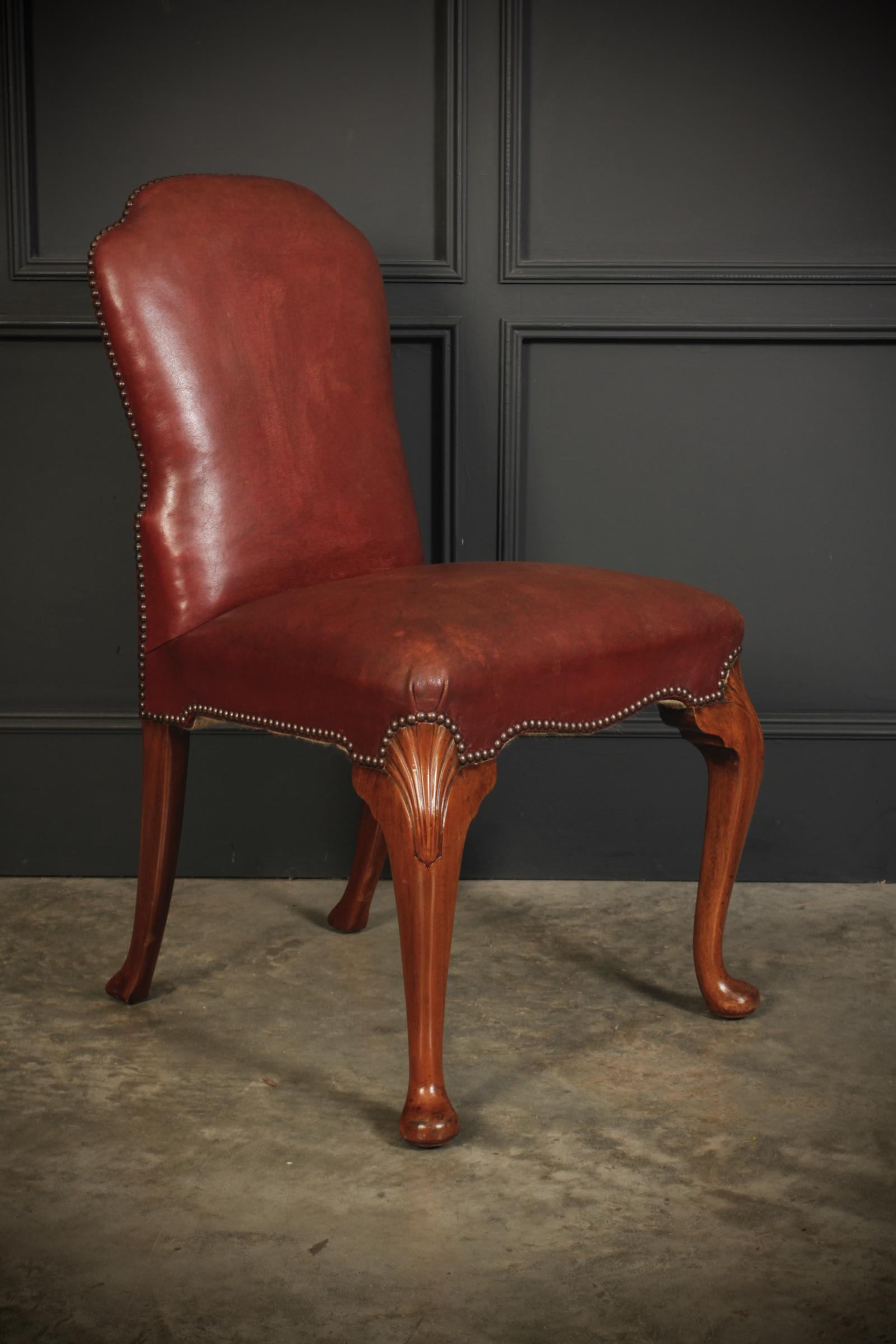 English, Circa 1920. A matching pair of chairs, with original leather upholstery and brass studded trim.nnGenerous sized seats and good back support. On lovely walnut cabriole shaped legs with carved shell knees.nnIn good condition and comfortable to sit on.