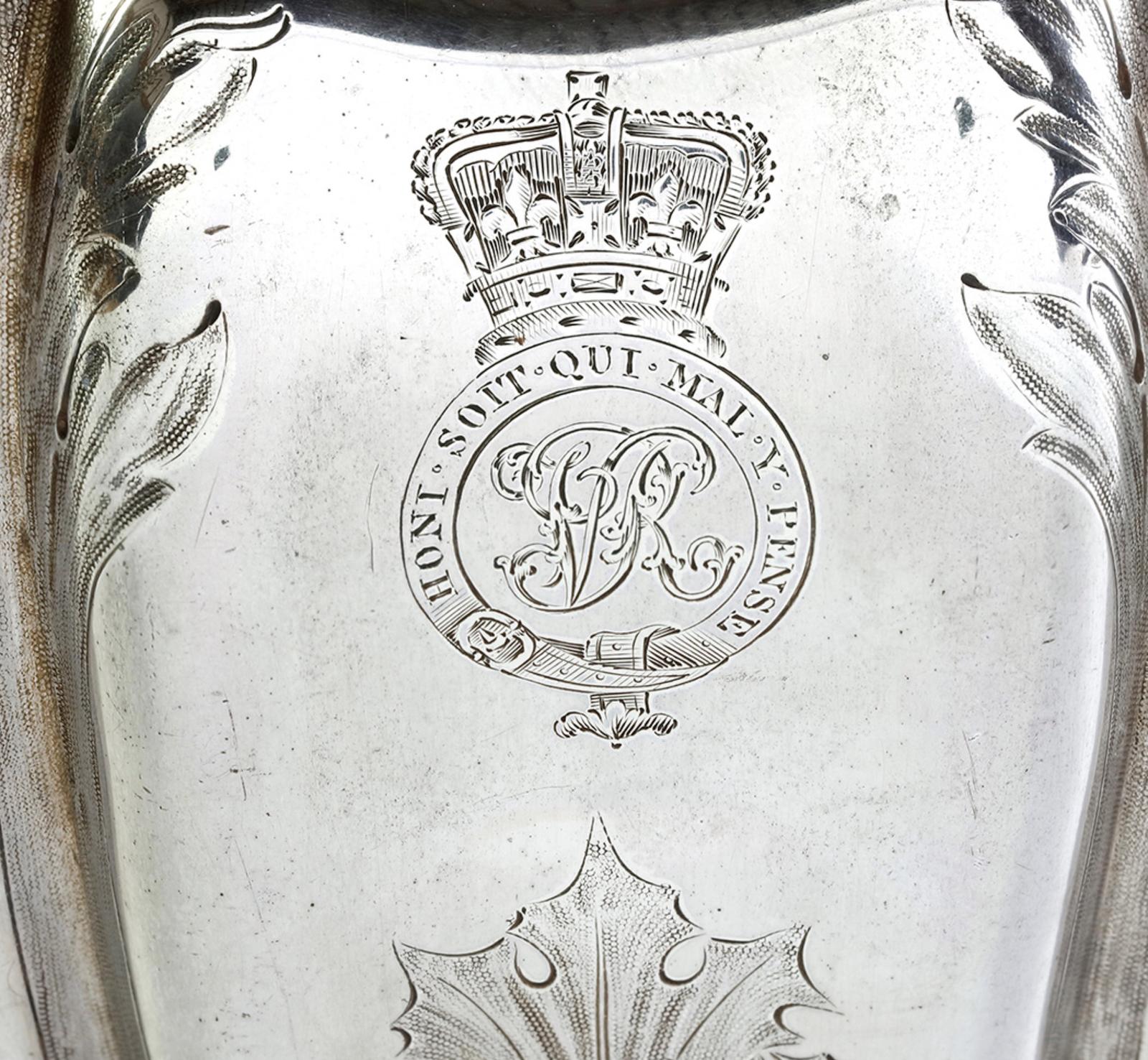 Queen Victoria’s silver coffee service, by William Bateman & Daniel Ball, comprising a coffee pot and burner, a cream jug and a sugar basin, each of lobed hexagonal form, with delicate floral engraving, the interior of the sugar basin gilded, the coffee pot, burner and cream jug engraved with the personal cypher of Queen Victoria within the motto of the Order of the Garter and surmounted by a crown, all contained in the original fitted wooden case by the royal goldsmiths Rundell, Bridge & Company.English, 1839.nnProvenance:Margaret Julia Davys 1839.nnFootnote: William Bateman and Daniel Ball were suppliers to Rundell, Bridge & Co. This silver coffee service was made for Queen Victoria early her reign.A similar silver tea service by the same makers engraved with the royal cypher is in the Royal Collection [see Royal Collections Trust, Rcin 47102].Queen Victoria gifted the service to Margaret Julia Davys, daughter of the queen’s former tutor Rev. George Davys, on her marriage in November 1839.
