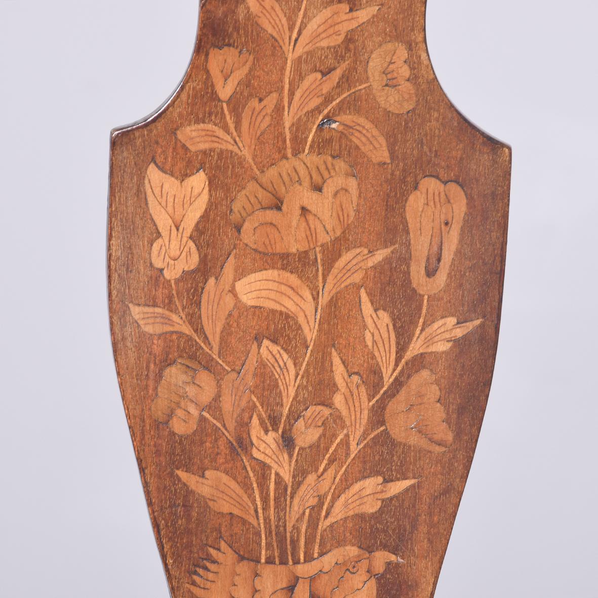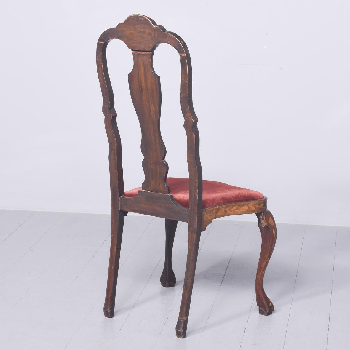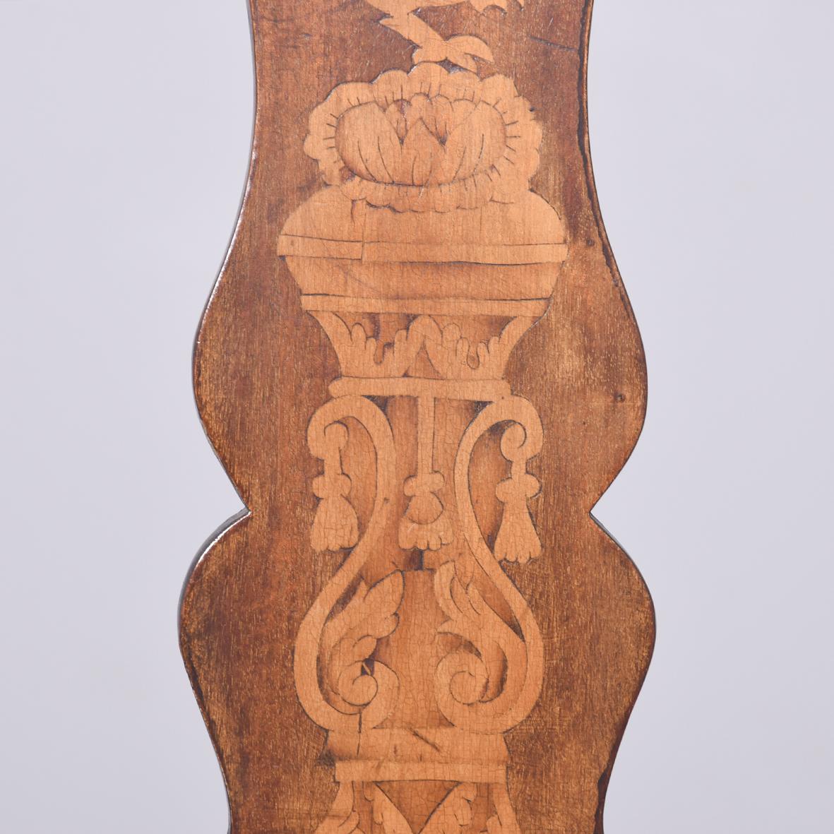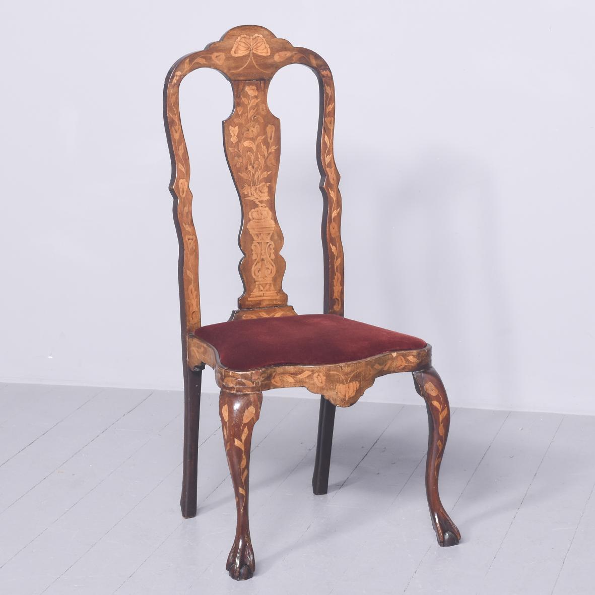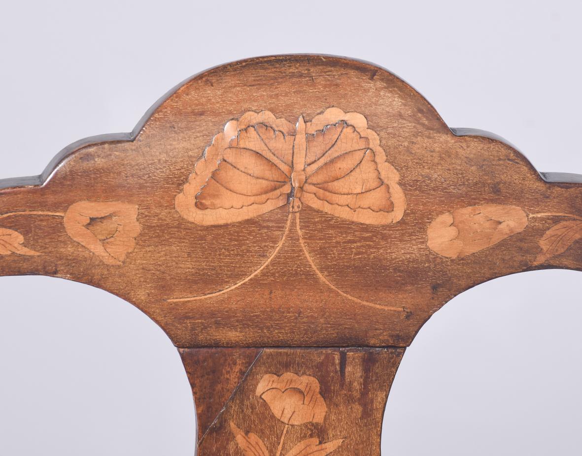 Quality set of four high back walnut Dutch marquetry chairs, with a shaped cresting rail with a large butterfly inlay on the back, the shaped and inlaid splat smothered in marquetry, the shaped uprights with marquetry on the facing, with drop in serpentine seat, a shaped frieze and side rail all smothered in marquetry. The back legs are turned and slightly out swept, the elegant cabriole legs at the front with marquetry on the facings finishing on a ball and claw foot.