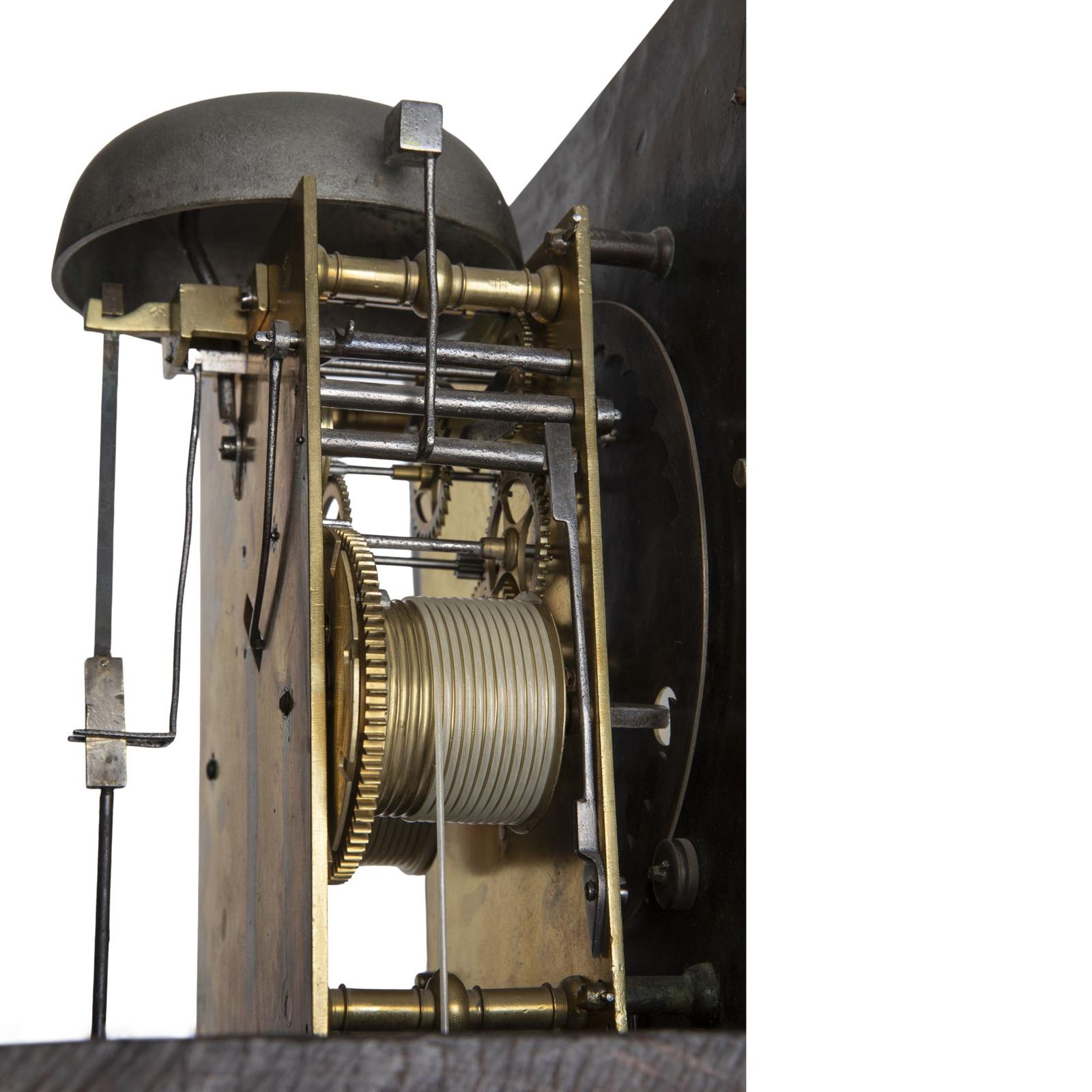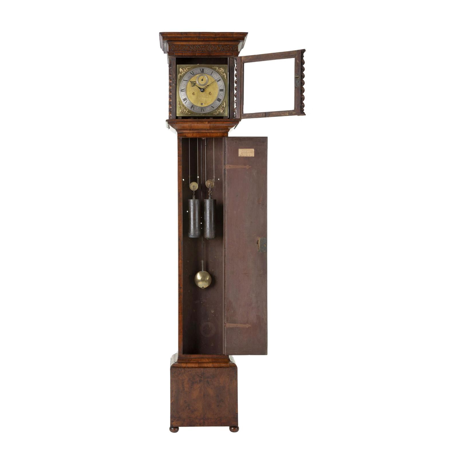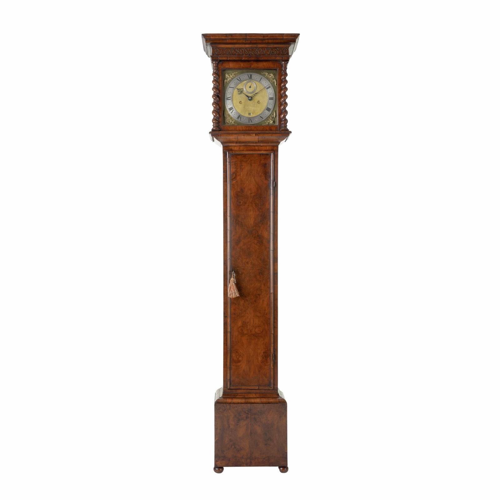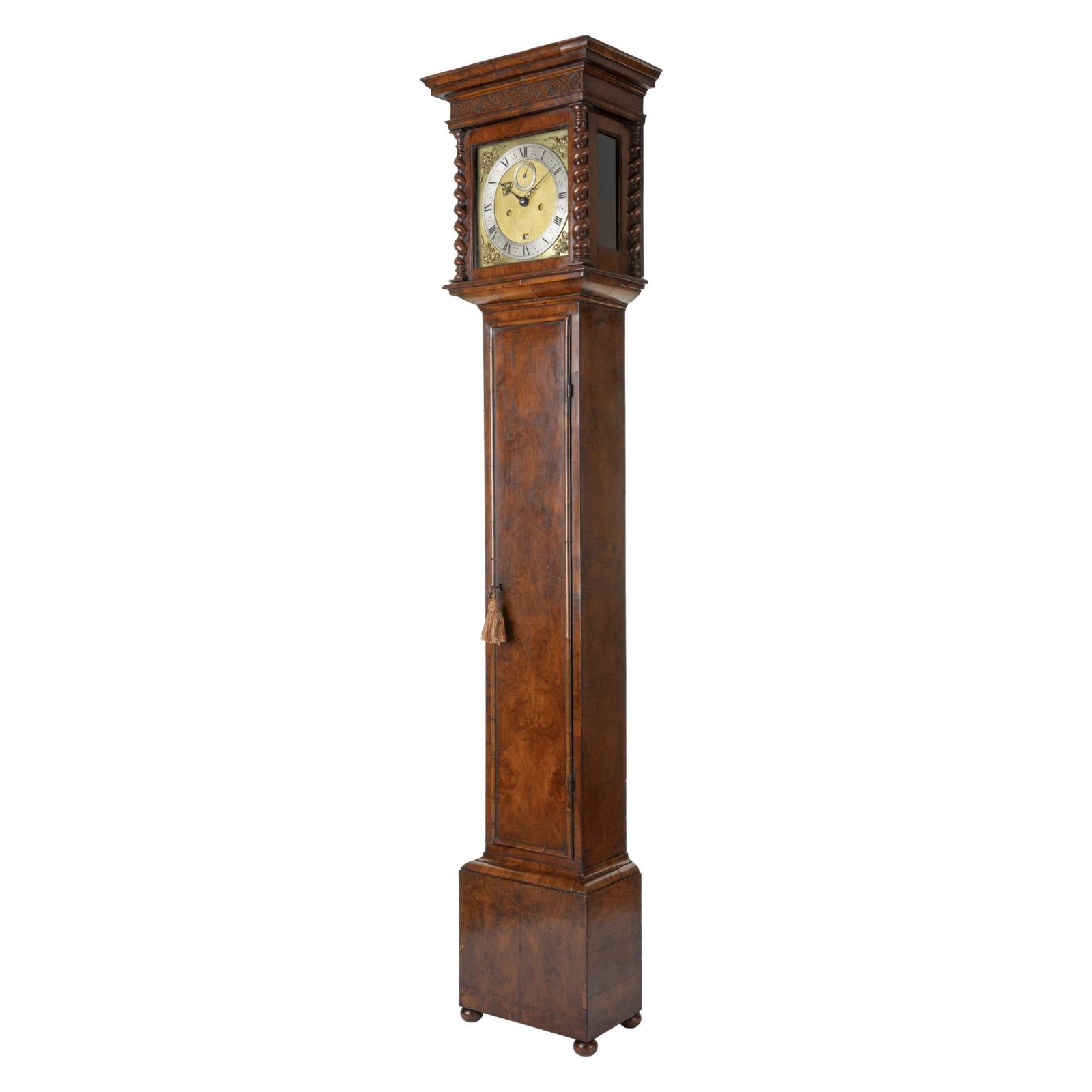 This exceptional longcase clock by Edward East features a beautifully designed walnut veneered case with a sliding hood and an overhanging cornice. The hood is supported by three-quarter and quarter barley twist columns, adorned with gilt-brass Corinthian capitals and bases. Beneath the hood is a long trunk door crafted from ‘bookmatched’ walnut veneers, framed with a half-round moulded edge. The base of the case is designed with three upright veneered panels, all resting on a plinth, combining classic elegance with striking visual appeal.nnThe clock’s 10-inch square brass dial is signed “Eduardus East Londini” in cursive script along the lower edge, flanked by small winged cherub head spandrels. The dial features a narrow silvered Roman chapter ring with an outer Arabic minute track and trident half-hour markers. The finely matted centre includes large subsidiary seconds dial, and the entire dial is securely mounted to the front plate by four latched dial feet.nnInside, the movement is supported by five knopped and finned pillars latched to the front plate. The clock operates with an anchor escapement, with bolt-and-shutter, maintaining power. The external countwheel strike mechanism chimes the hours on a bell, completing this elegant timepiece’s functionality.nnEdward East was one of the founding members of the Clockmakers’ Company and served as Master in 1645 and again in 1652. He was appointed Clockmaker to both King Charles I and Charles II and was known for crafting high-quality watches and clocks. His timepieces were often used by the King as prizes in tennis matches, a testament to their esteemed quality. East also created night clocks, featuring revolving chapter rings with perforated numerals illuminated by a lamp to display the time. His craftsmanship was highly regarded, and he continued to influence English clockmaking throughout his life.nnServiced and guaranteed for 3 years.nnProvenance: Private collection, UKnnWould you like to view this clock in your own home?nContact us to arrange a viewing with our Homeview service.n(T&C’s apply.)