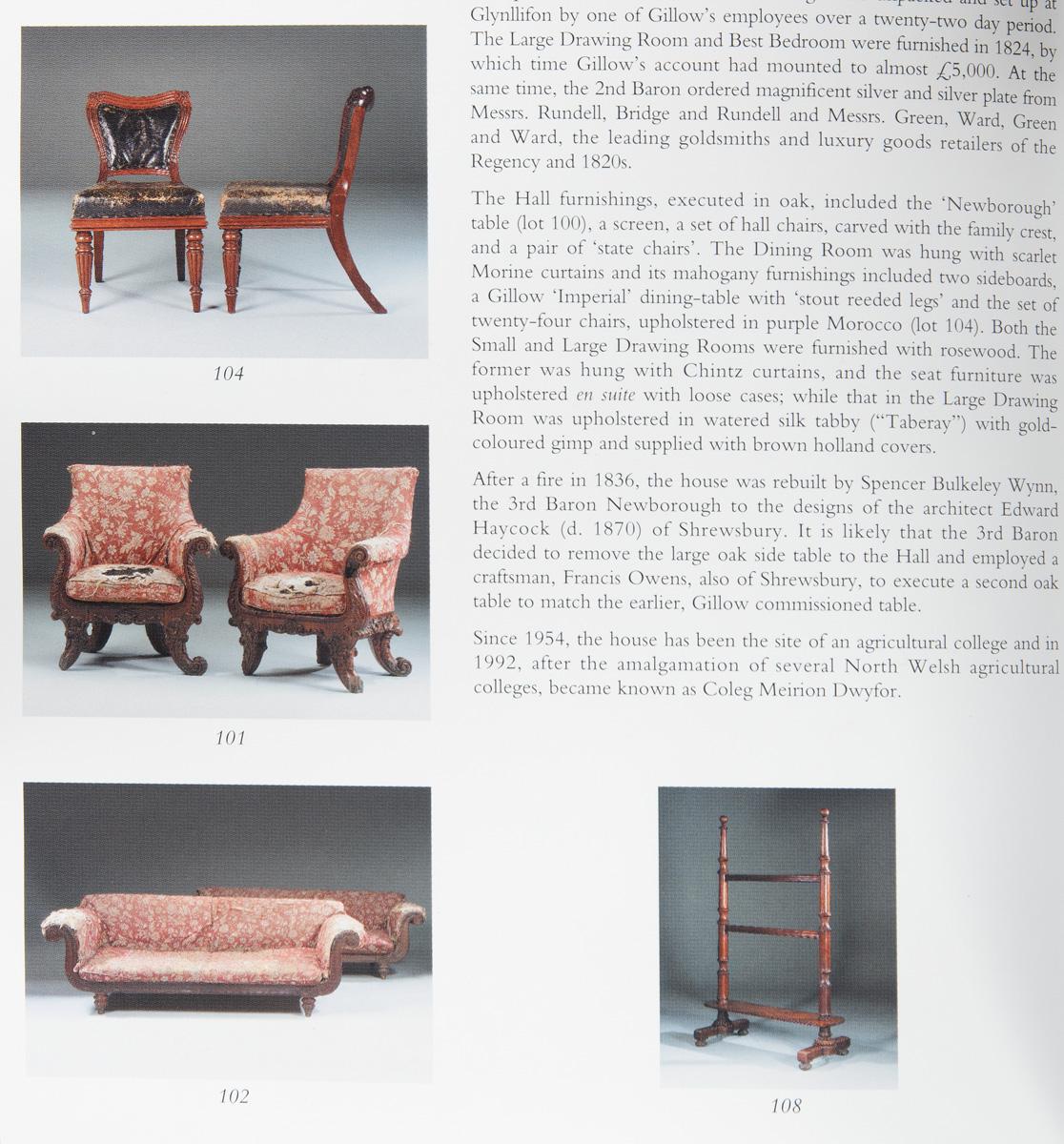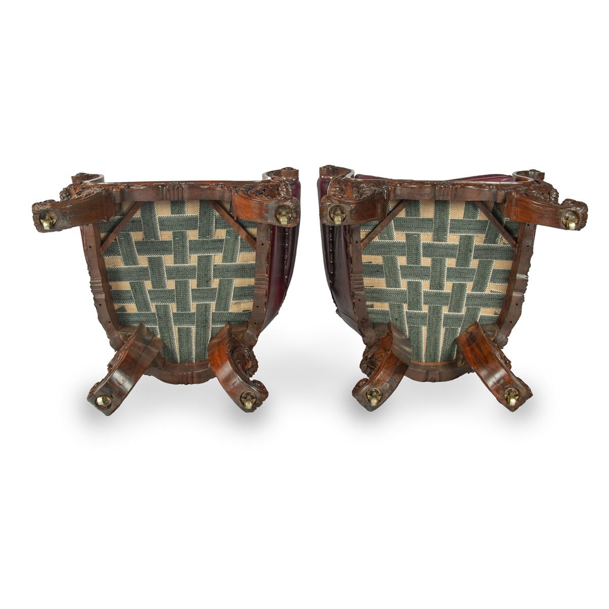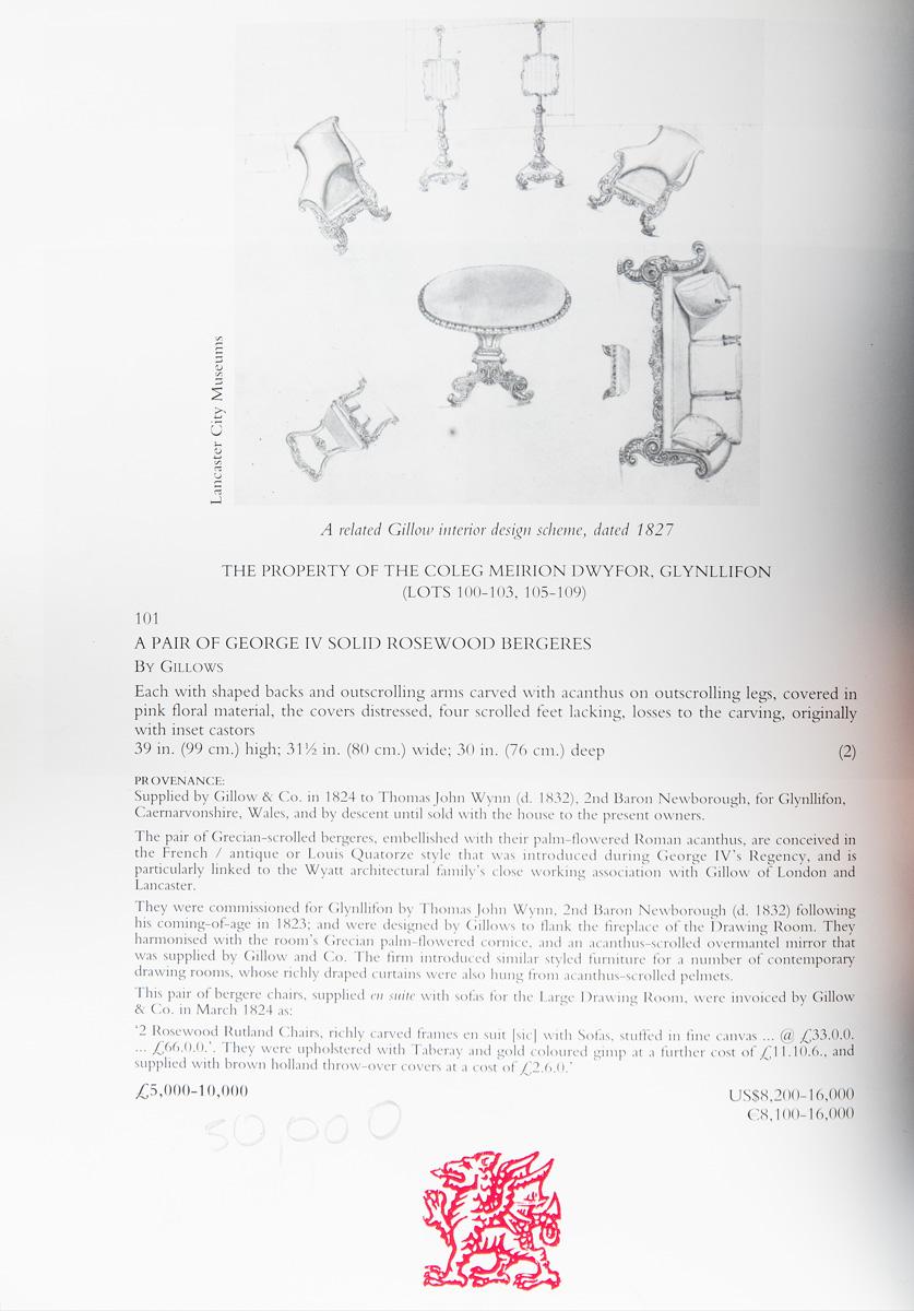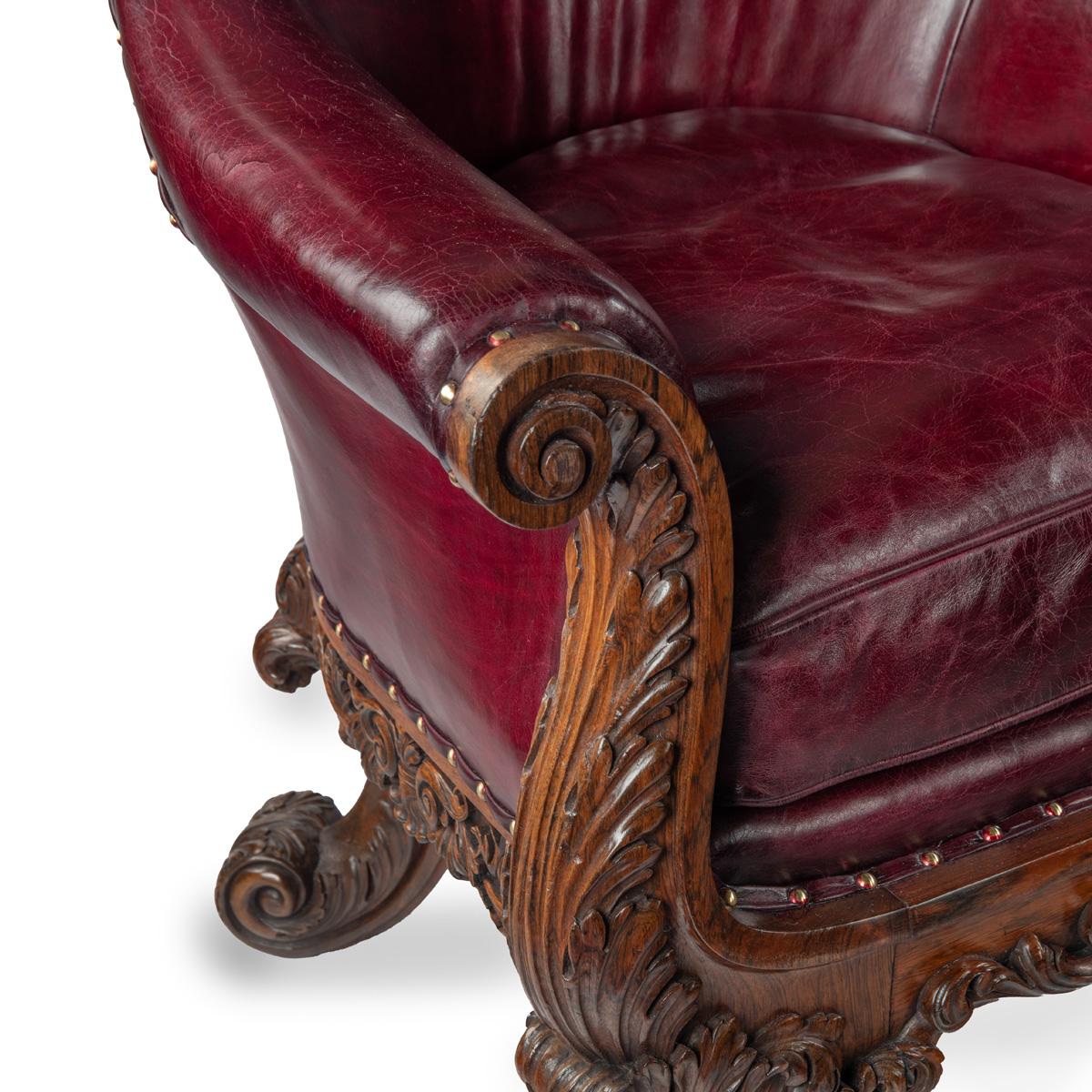 The Glynllifon “Rutland” Chairs Supplied by Gillows in 1823 to Thomas John Wynn, Second Baron Newborough, each of this pair of solid rosewood chairs with a lyre shaped back and rolled arms, the arms continuous with the shaped seat rail and four outswept scroll legs, carved throughout with fleshy acanthus leaves, with hidden castors, reupholstered in burgundy leather.English, circa 1823.nnProvenance:Supplied to Thomas John Wynn, 2nd Baron Newborough, Glynllifon, WalesnnChristies London 9 March 2000 Lot 101.nnKentshire Galleries, New YorknnA private Us CollectionnnThese fine chairs, executed in solid, carved rosewood, are highly important and documented examples of Gillows furniture.This model of chair was known in the Gillows workshop as the ‘Rutland’ and the invoice for this pair survives in the Glynllifon records in Gwynedd Record Office.This invoice was reproduced in the 2000 Christie’s sale catalogue mentioned above and is illustrated below.The bill reads ‘2 rosewood Rutland chairs, richly carved frames en suit (sic) with sofas, stuffed in fine canvas £33.0.0’.The upholstery in ‘Taberay and gold coloured gimp’ cost a further £11.10.6 and brown throw-over covers cost an additional £2.6.0nnUpon his return from his Grand Tour in Europe in 1823, Thomas John Wynn began the modernisation and refurnishing of his home at Glynllifon.The furniture side of this commission was supplied almost entirely by the Oxford Street branch of Gillows, hence the remarkably up to date and fashionable nature of the furnishings.In total the price of the work came to over £3000 and the furniture required 72 cases for its transport to its final destination, the installation process alone taking some 22 days.When the house was sold in the 1950s these chairs, along with several other important pieces of furniture, were retained by the family until their sale on the 9th of March 2000.nnFully documented pieces of furniture supplied by the Oxford Street branch of Gillows are very rarely encountered and these chairs are extremely important in furniture history terms as well as being aesthetically beautiful and highly decorative.