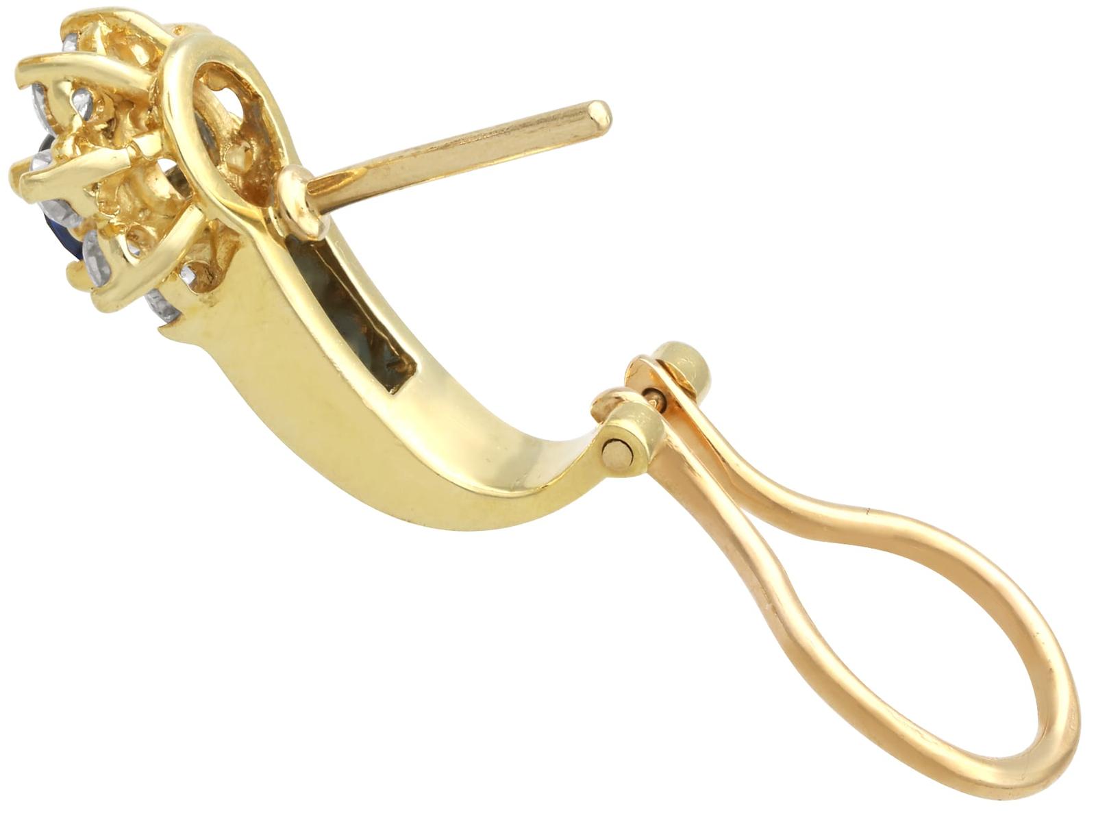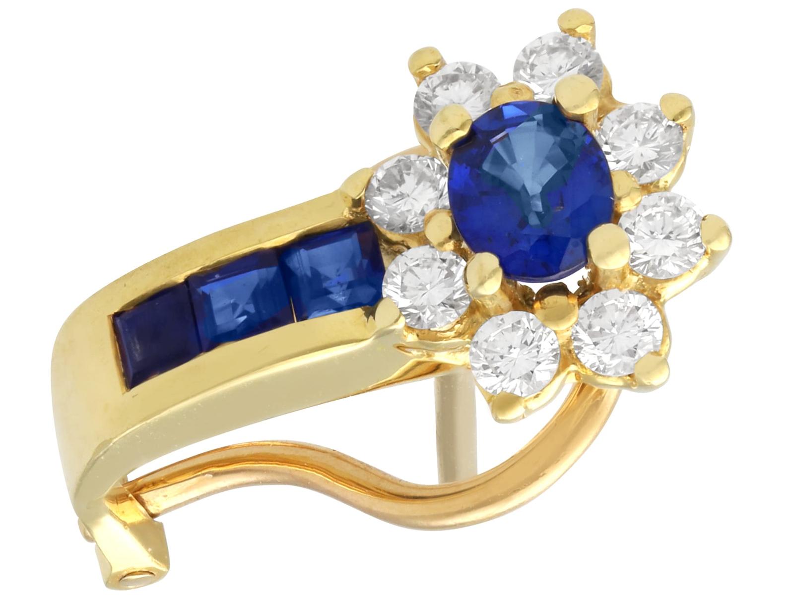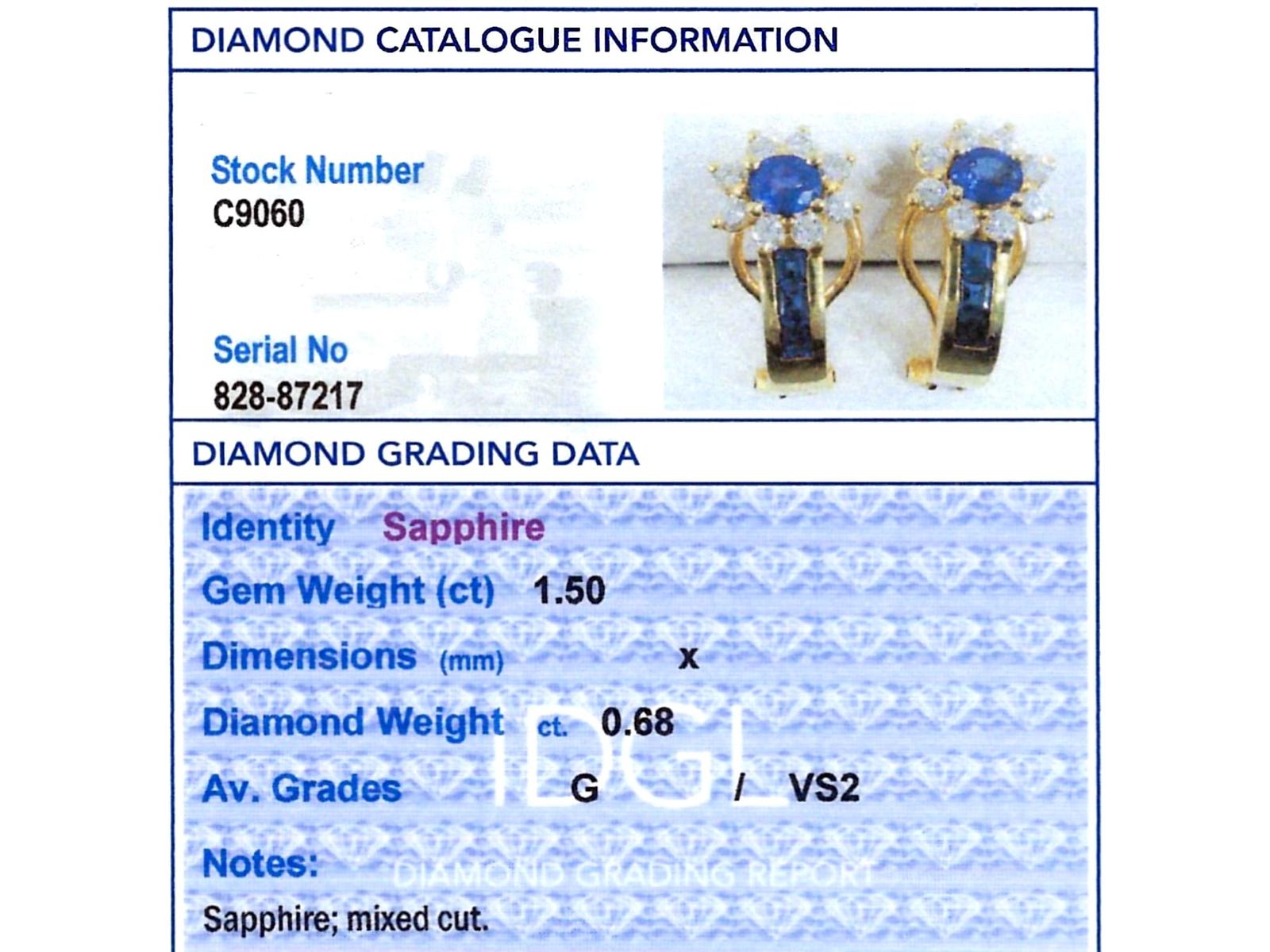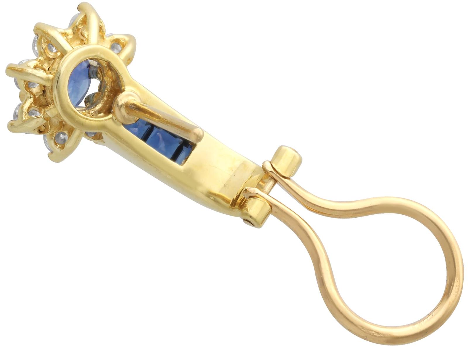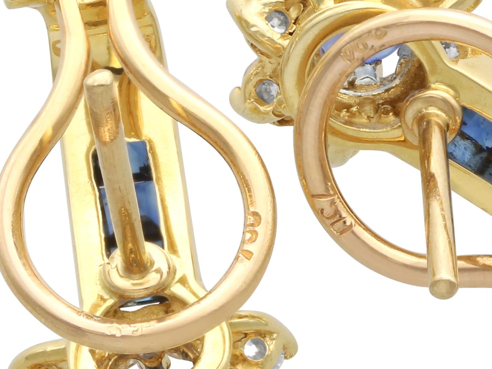 Fine and impressive pair of vintage 1.50 carat sapphire and 0.68 carat diamond, 18 carat yellow gold earrings; part of our diverse collection of vintage sapphire jewellery.nnThese fine and impressive vintage drop earrings have been crafted in 18ct yellow gold.nnThe upper portion of each earring is embellished with a central oval-shaped mixed cut sapphire, claw set in a horizontal formation in subtle relief.nnEach feature sapphire is encompassed with eight claw set modern brilliant round cut diamonds.nnThe tapering drop of each earring is ornamented with a linear array of channel set mixed cut sapphires, completing the design.nnThese vintage earrings, for pierced ears, secure to the reverse with a pin and hinged fastening.nnEach earring is hallmarked to the hinged latch the 18ct gold mark (750) and have been independently tested using state of the art technology (Niton Xl2 Analyzer) and verified as 18 carat gold.nnThe sapphire and diamond earrings in yellow gold are supplied with an Idgl diamond and gemstone grading report card.nnImages do not always reflect the true colour and brilliance of gemstones and diamonds. The video however provides a truer representation of the actual colour and showcases each stone.nnSapphire QualitynColour BluenCut MixednContent 1.50 caratsnnDiamond QualitynColour (average grades) GnClarity (average grades) Vs2nCut Modern Brilliant RoundnContent 0.68 caratnnNumber of Diamondsn16nnFastening: Hinged Latch Clasp