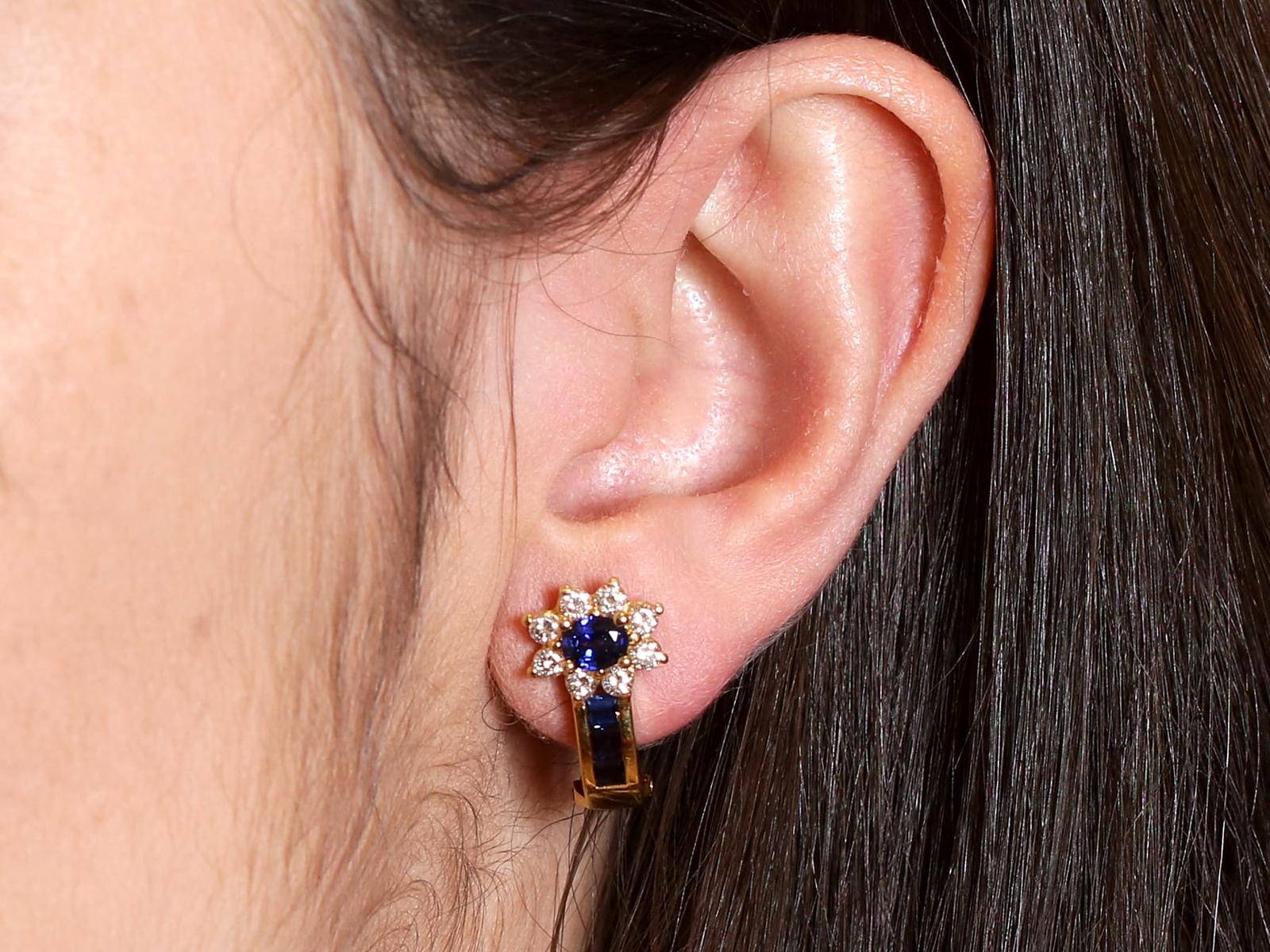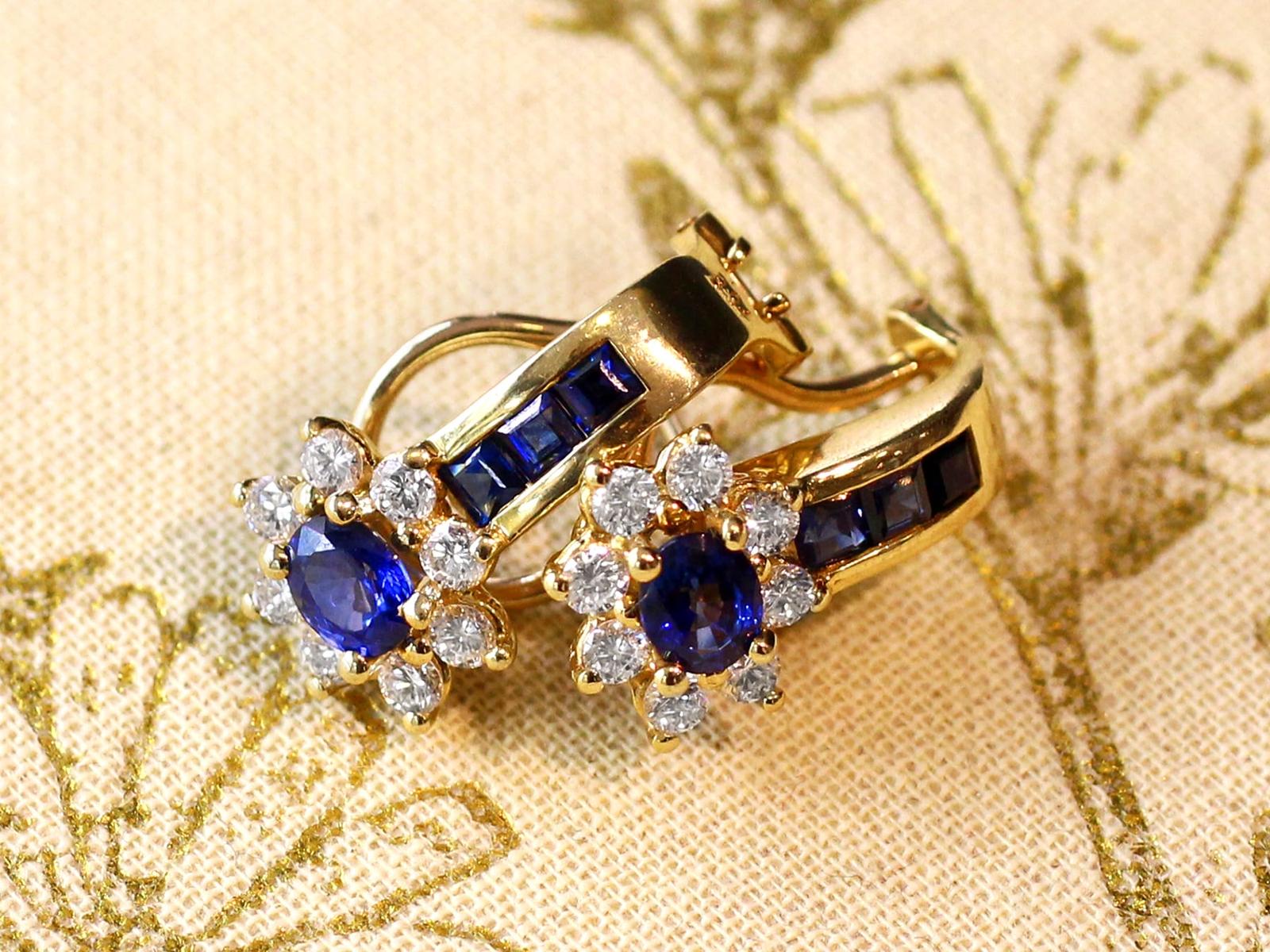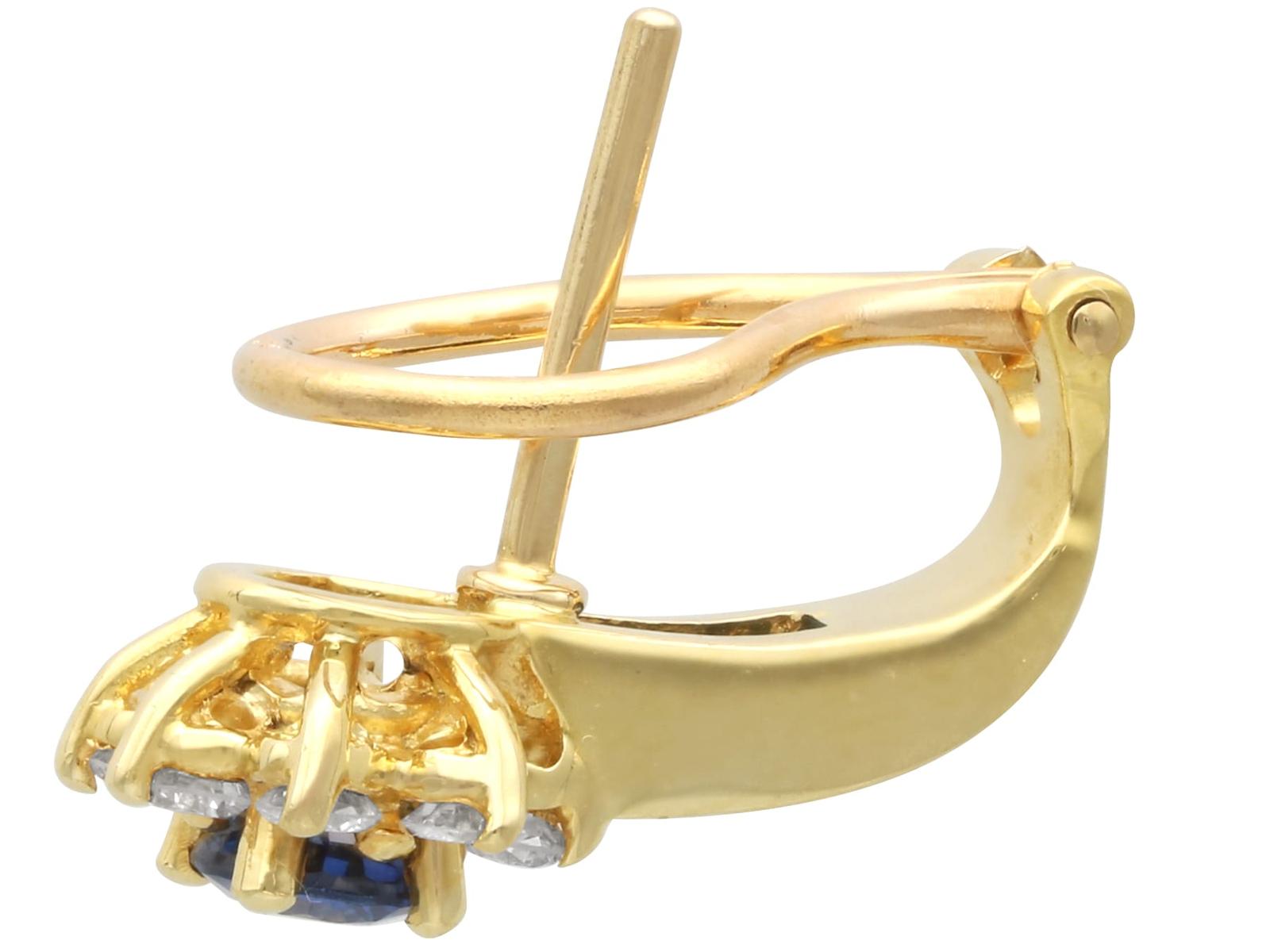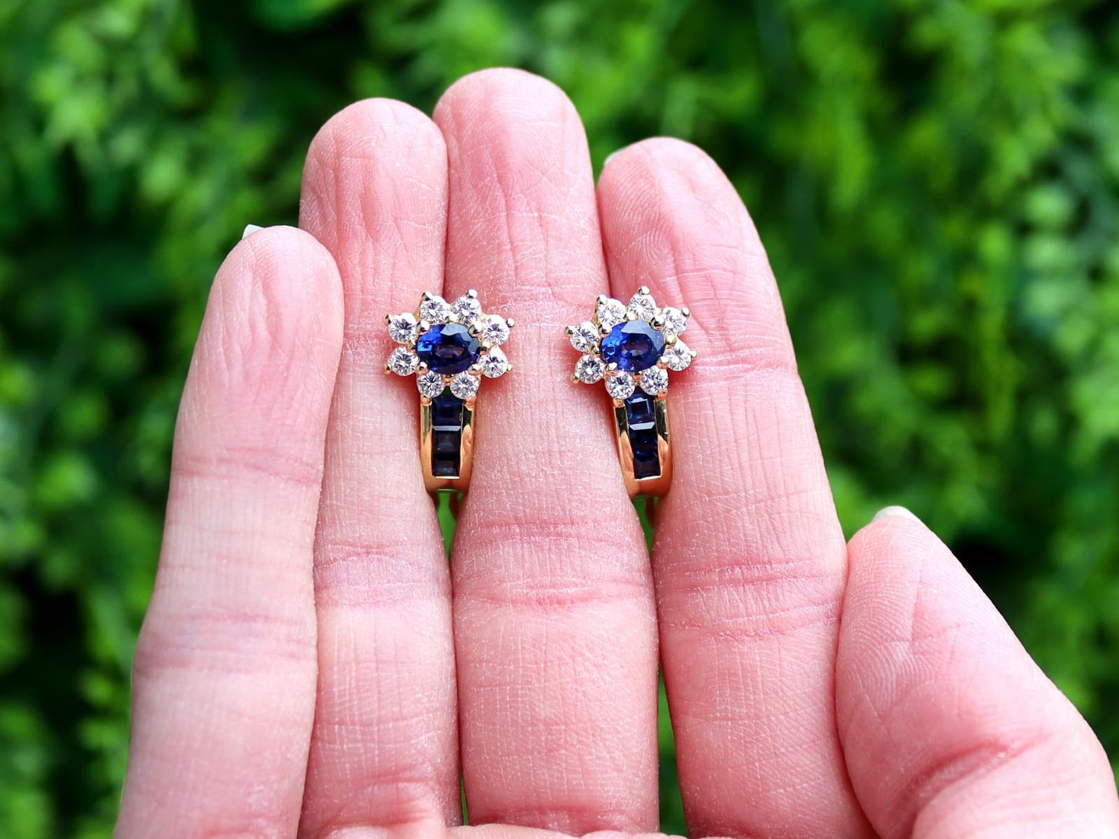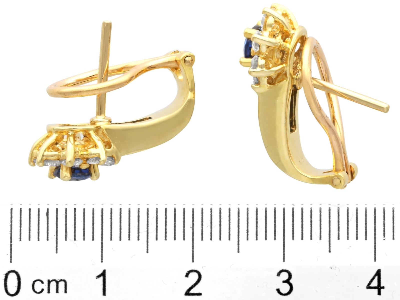 Fine and impressive pair of vintage 1.50 carat sapphire and 0.68 carat diamond, 18 carat yellow gold earrings; part of our diverse collection of vintage sapphire jewellery.nnThese fine and impressive vintage drop earrings have been crafted in 18ct yellow gold.nnThe upper portion of each earring is embellished with a central oval-shaped mixed cut sapphire, claw set in a horizontal formation in subtle relief.nnEach feature sapphire is encompassed with eight claw set modern brilliant round cut diamonds.nnThe tapering drop of each earring is ornamented with a linear array of channel set mixed cut sapphires, completing the design.nnThese vintage earrings, for pierced ears, secure to the reverse with a pin and hinged fastening.nnEach earring is hallmarked to the hinged latch the 18ct gold mark (750) and have been independently tested using state of the art technology (Niton Xl2 Analyzer) and verified as 18 carat gold.nnThe sapphire and diamond earrings in yellow gold are supplied with an Idgl diamond and gemstone grading report card.nnImages do not always reflect the true colour and brilliance of gemstones and diamonds. The video however provides a truer representation of the actual colour and showcases each stone.nnSapphire QualitynColour BluenCut MixednContent 1.50 caratsnnDiamond QualitynColour (average grades) GnClarity (average grades) Vs2nCut Modern Brilliant RoundnContent 0.68 caratnnNumber of Diamondsn16nnFastening: Hinged Latch Clasp