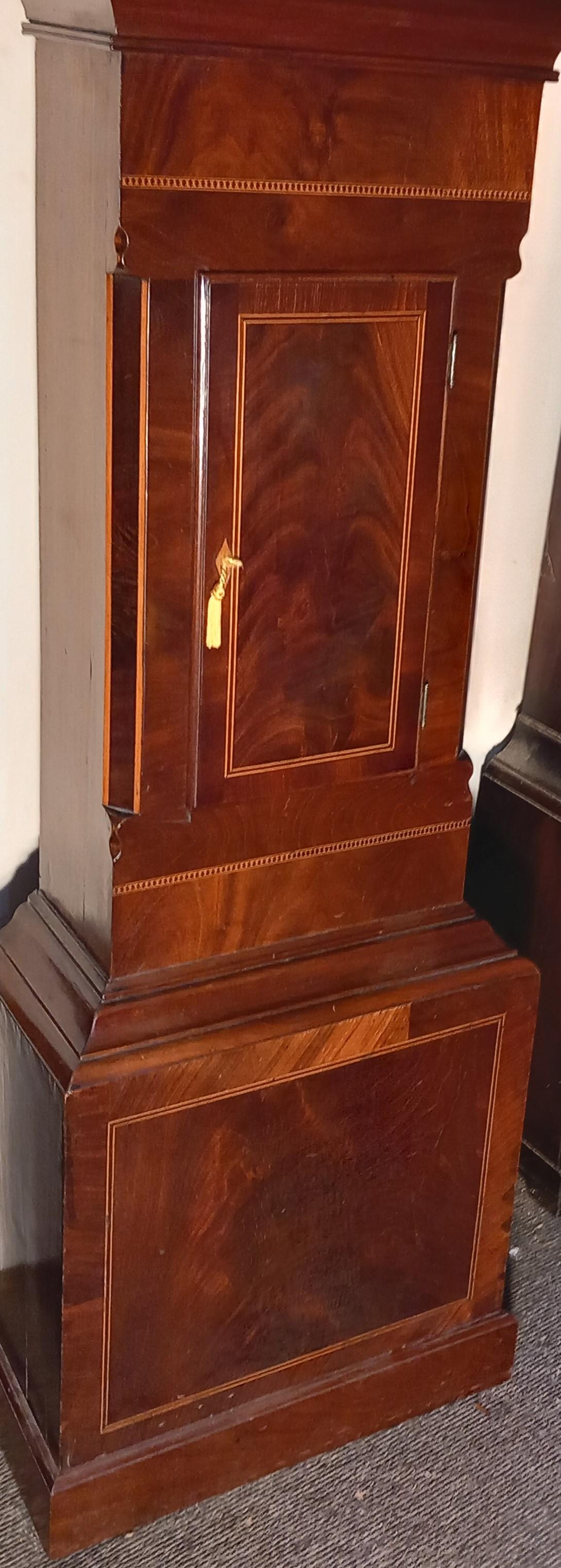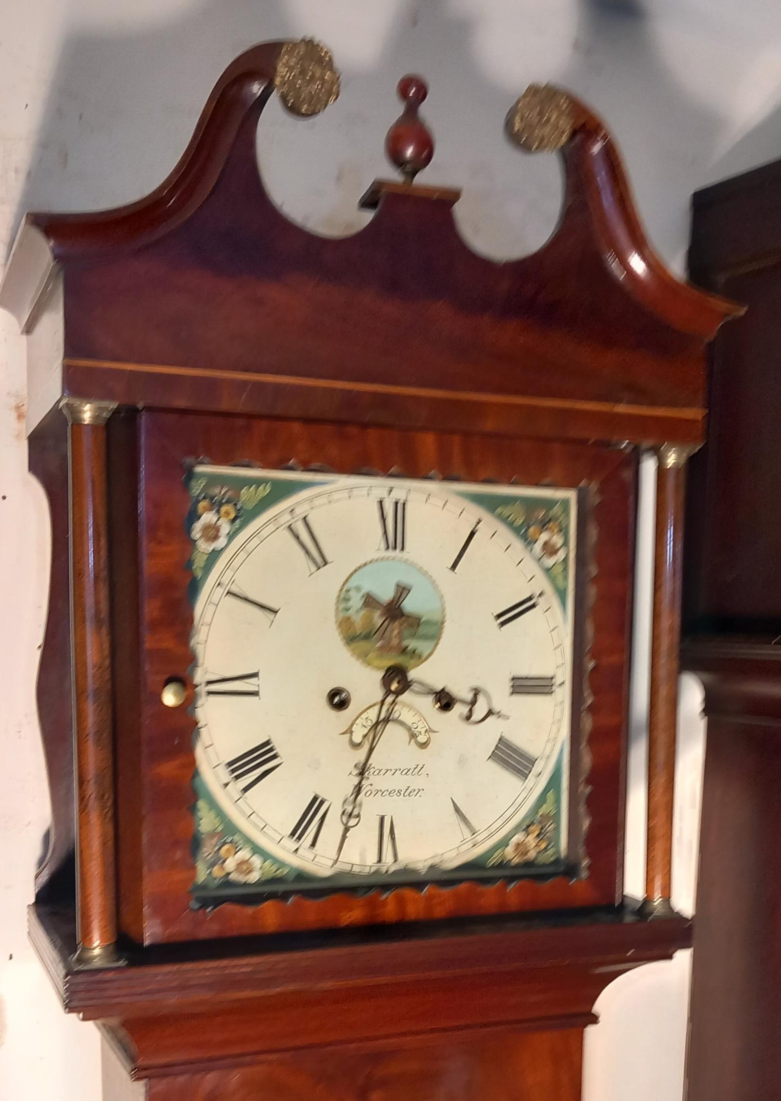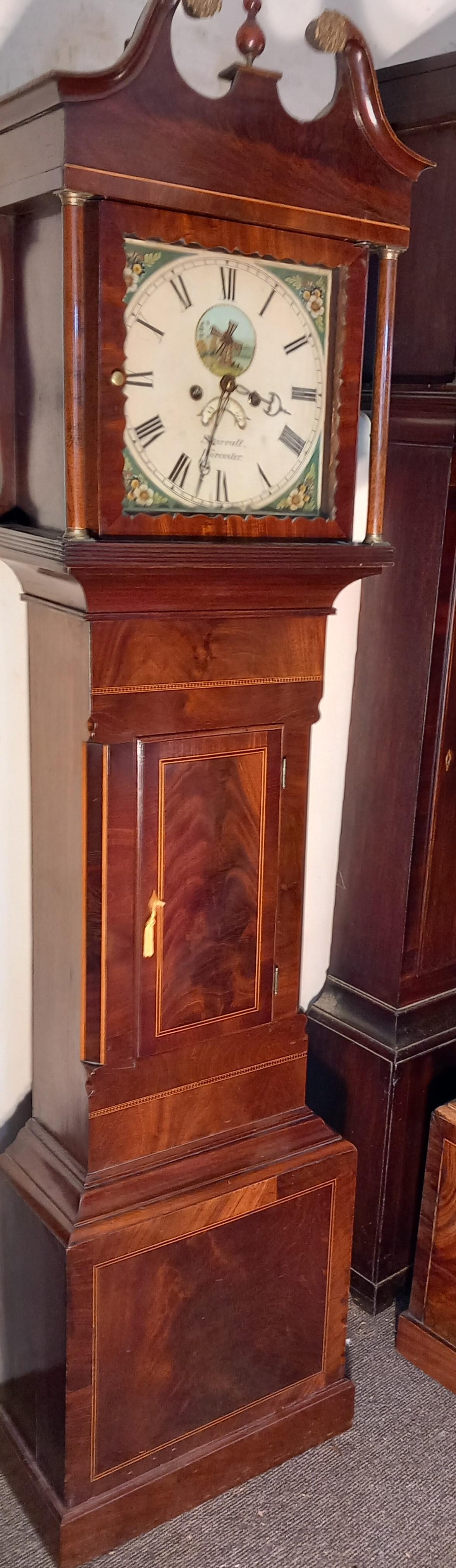 The Antique Mahogany Grandfather Clock nnThe Superb Case With An Attractive Lightwood Inlay nnThe Swan Neck Hood With Brass Capitals To The Pillarsn nThe 8 Day Striking Movement nnThe Painted Square Dial With The Automation Of Windmill Sails nnSigned